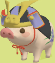 | 3D | 端午の節句にオス子豚の健やかな 成長を願う豚。被っている兜は 飾っていたものを拝借してきたら しい。5月の豚。 |