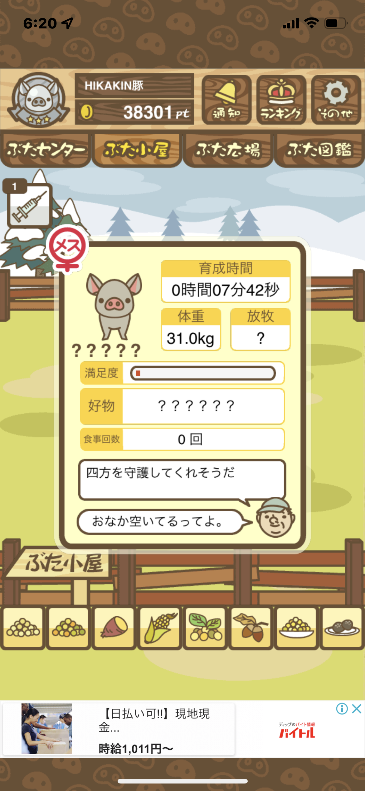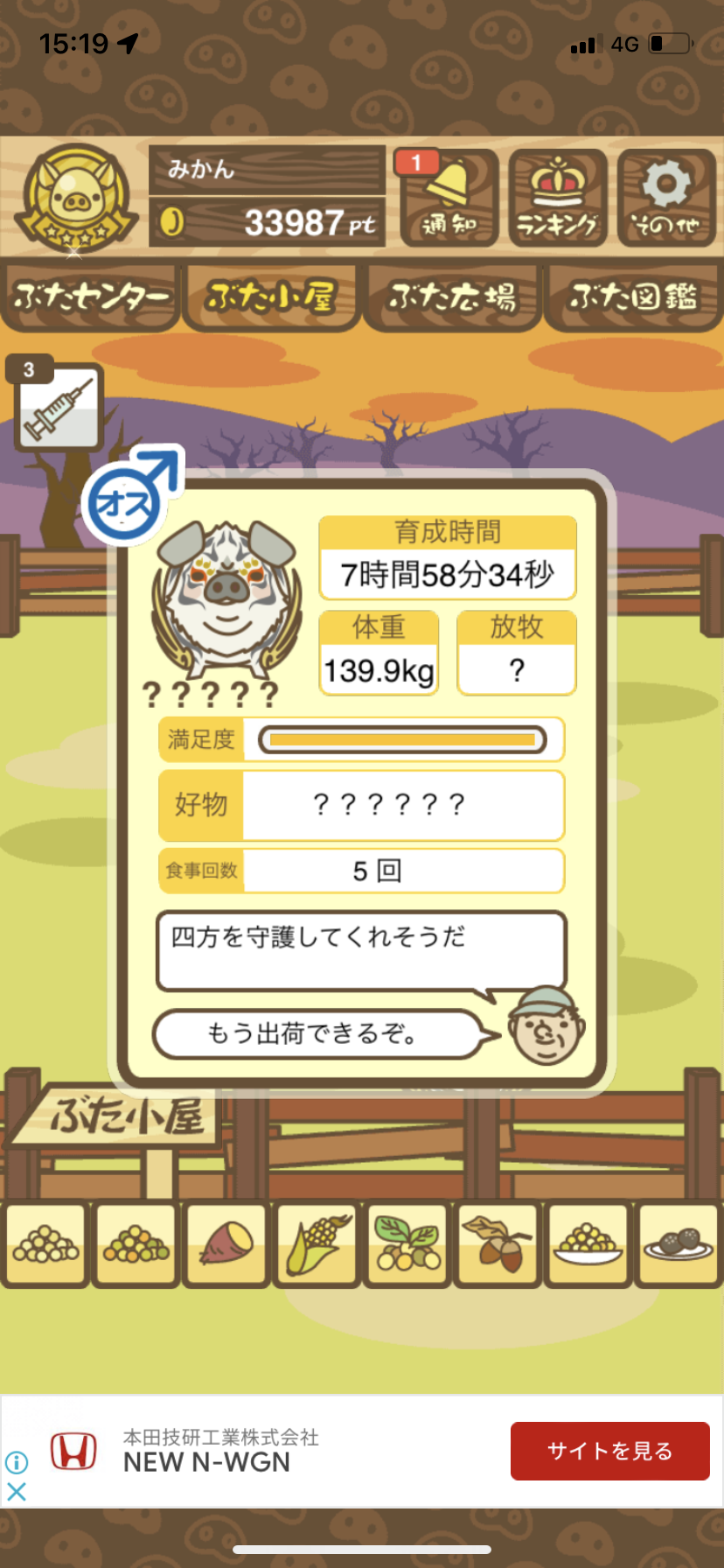 成豚する時刻が 15:00~20:59 の範囲から外れていると育成失敗する。