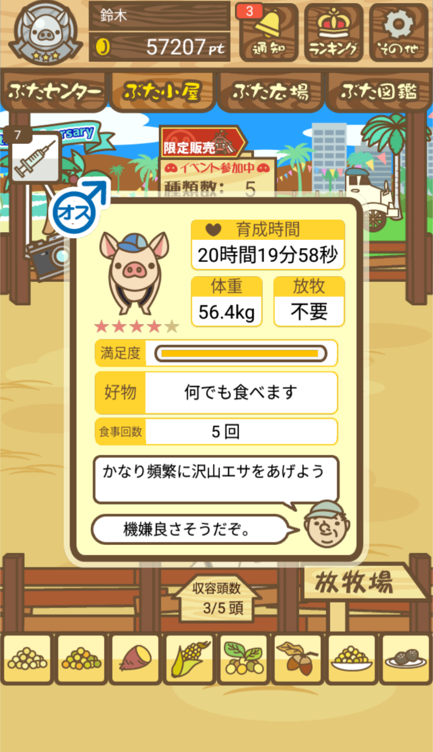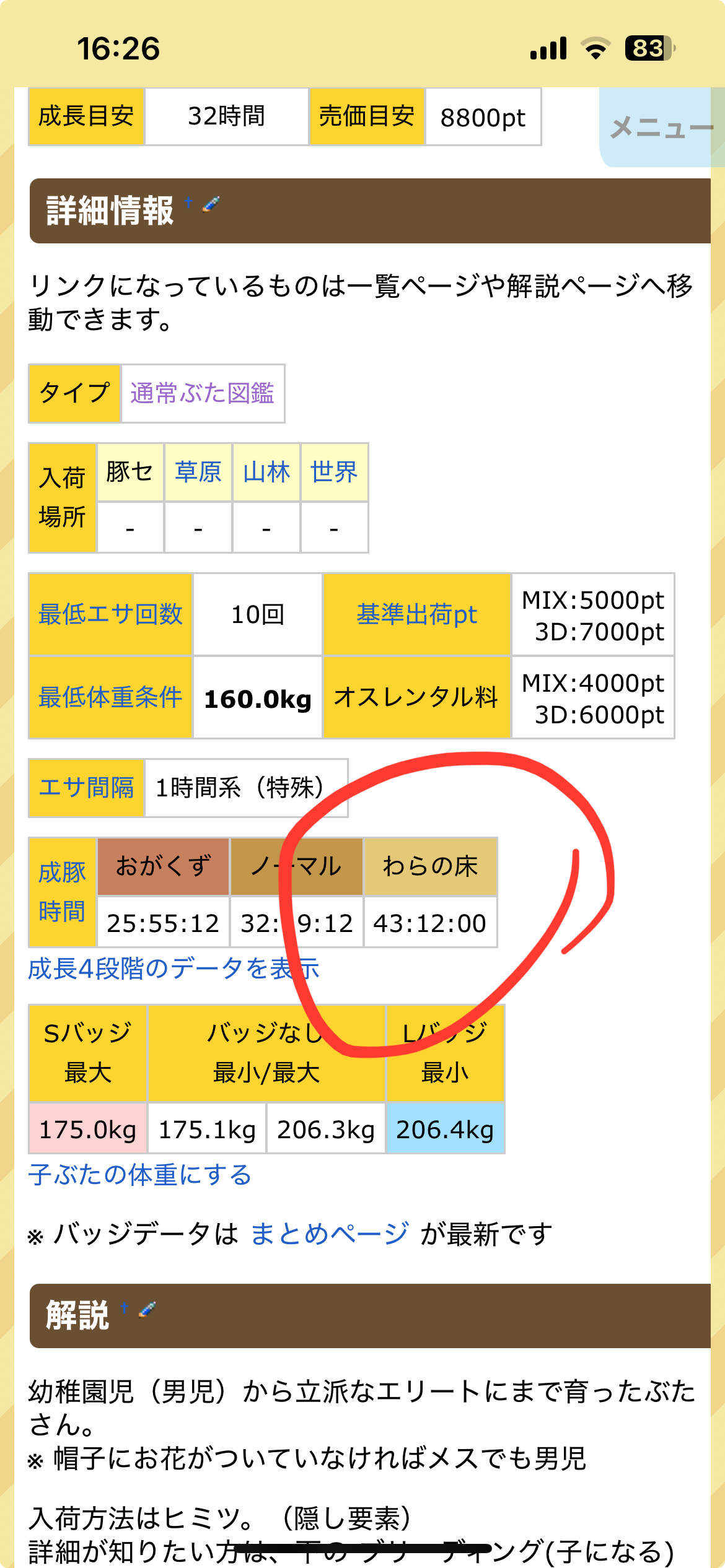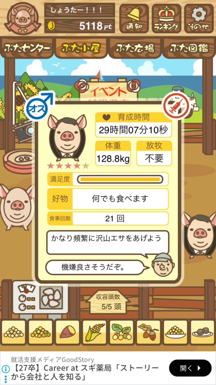 最低体重条件があり、成豚の際に体重が一定値を下回っていると 社畜豚 にランクダウンしてしまう。