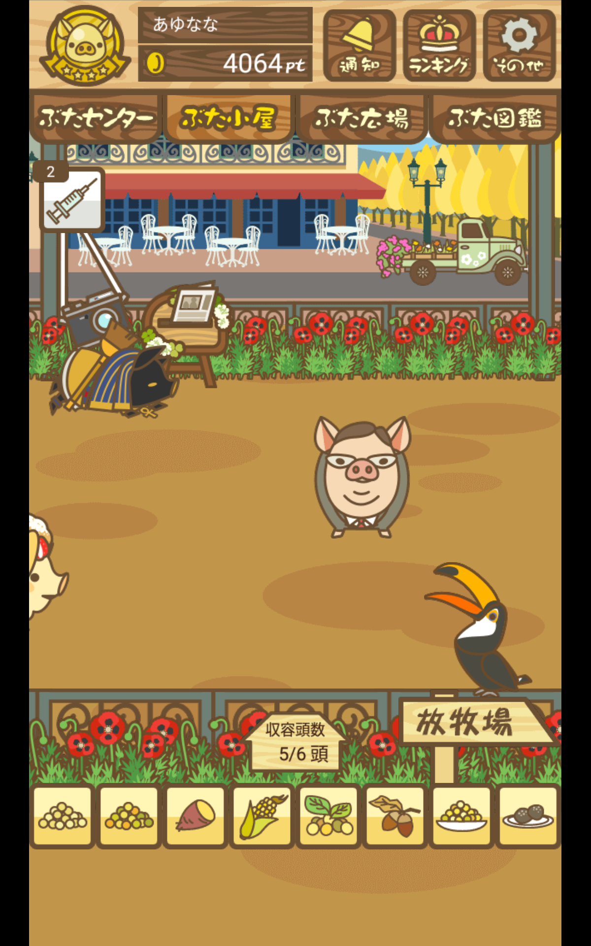 エサをぶたの左側に置くと図鑑の正面向きの見た目になる。