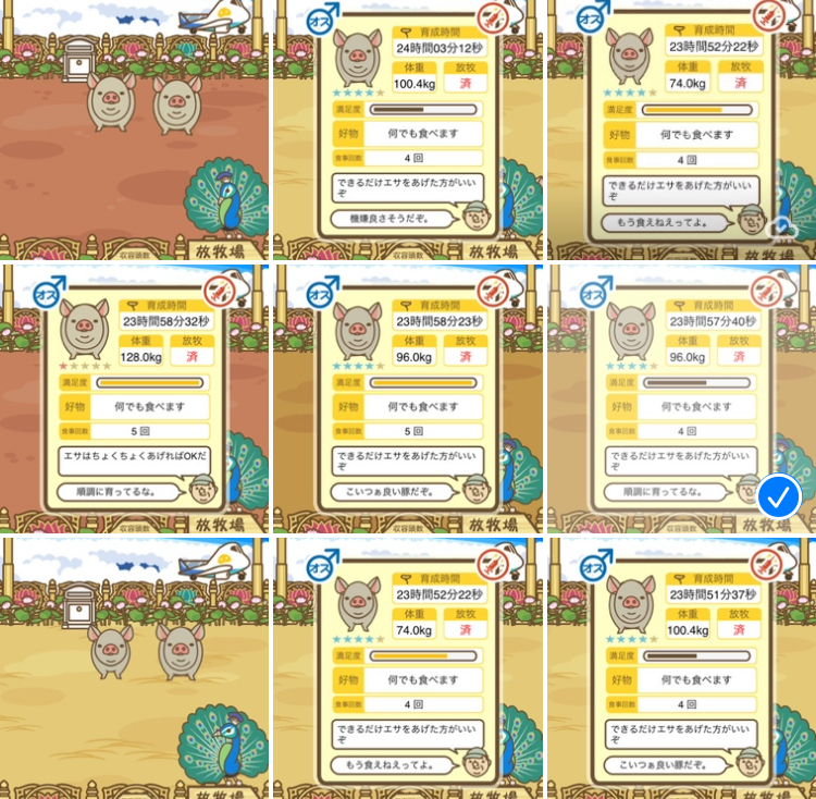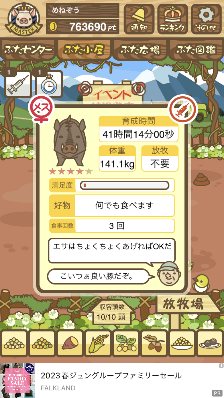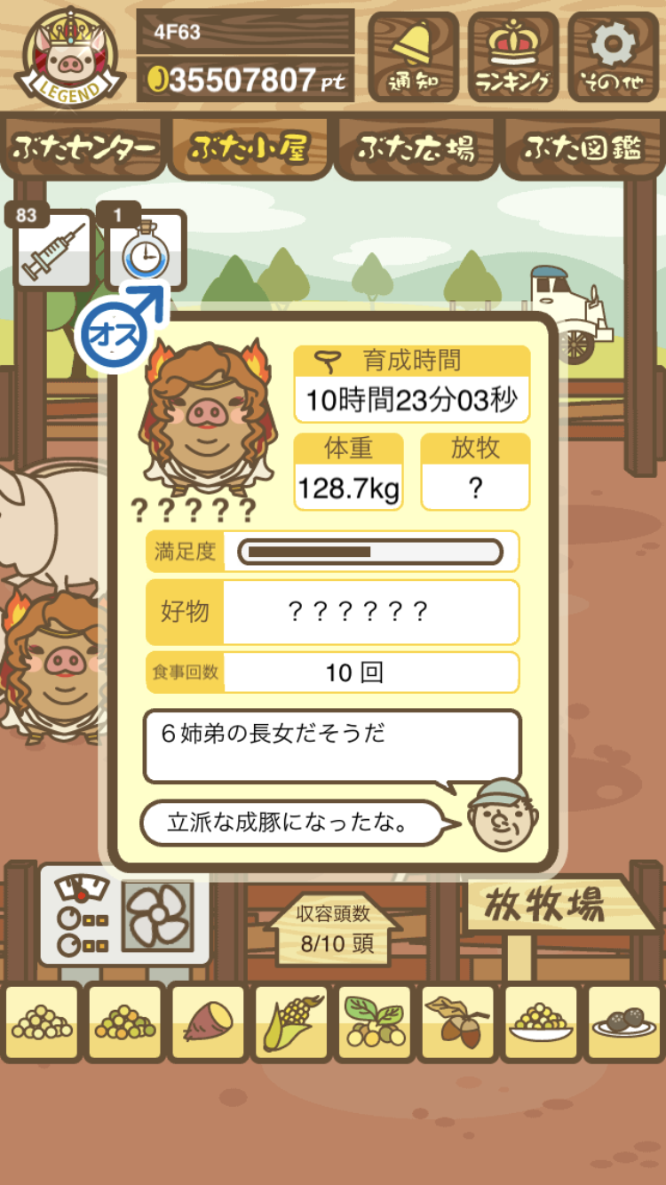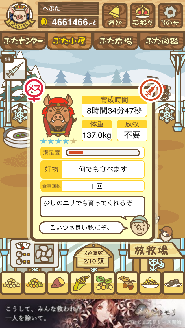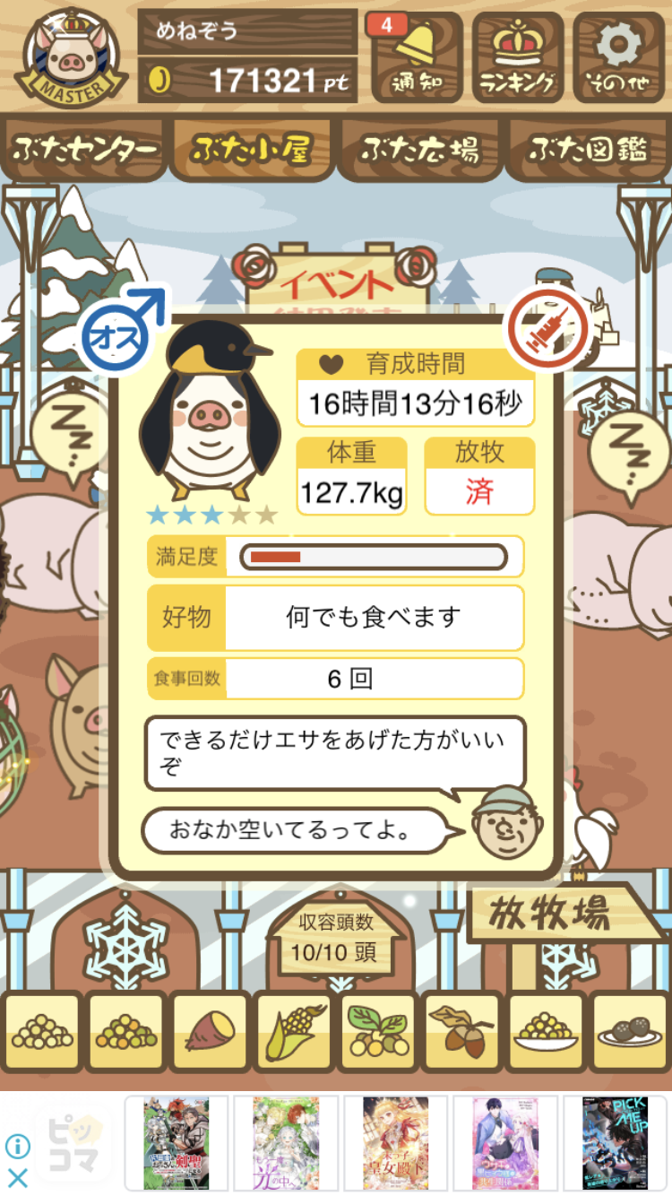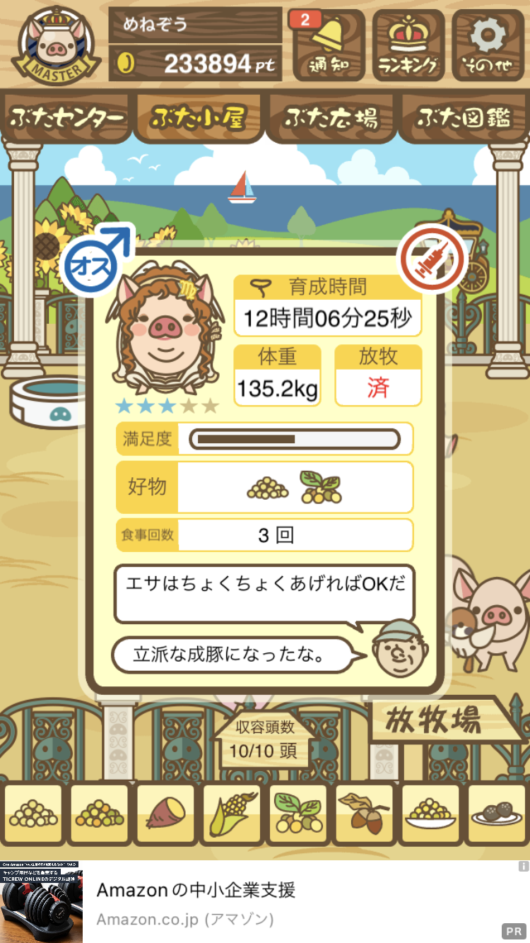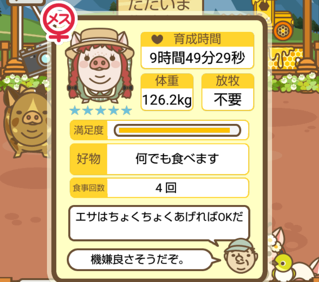 - また、エイブゥ....エサ雑穀16回、エサやりの度に放牧場行き来、16回エサやり後他の豚を放牧場へ....下の成功例の通り育成したつもりですが、何がダメだったんでしょう?掃除豚も排除しないといけないのでしょうか?
