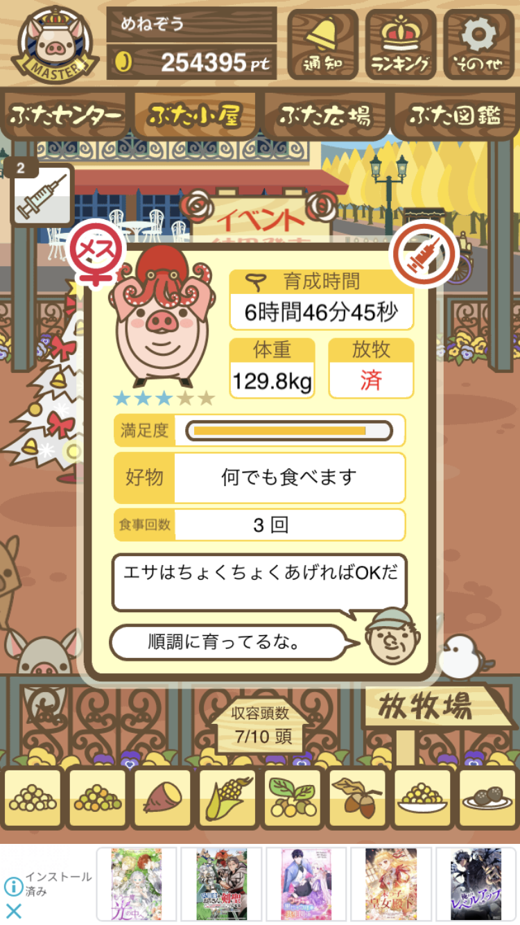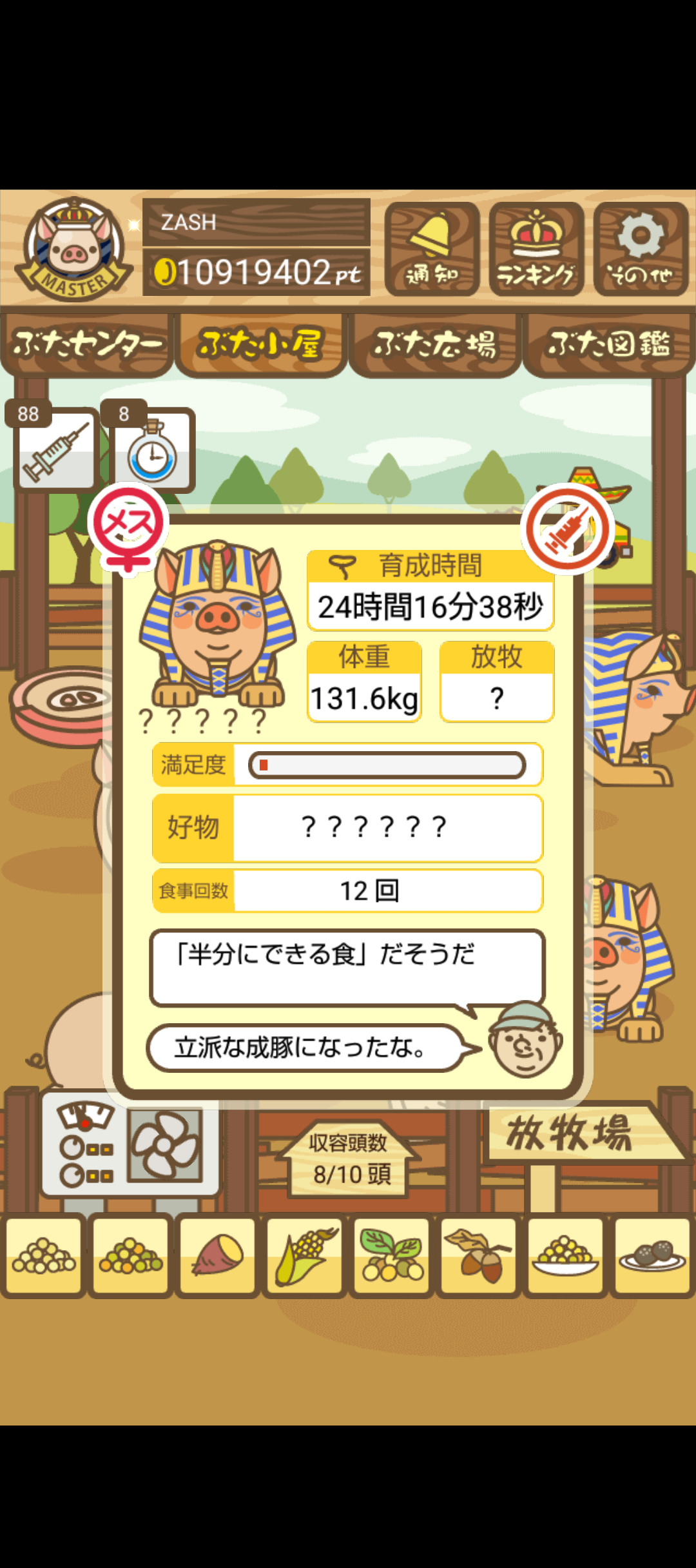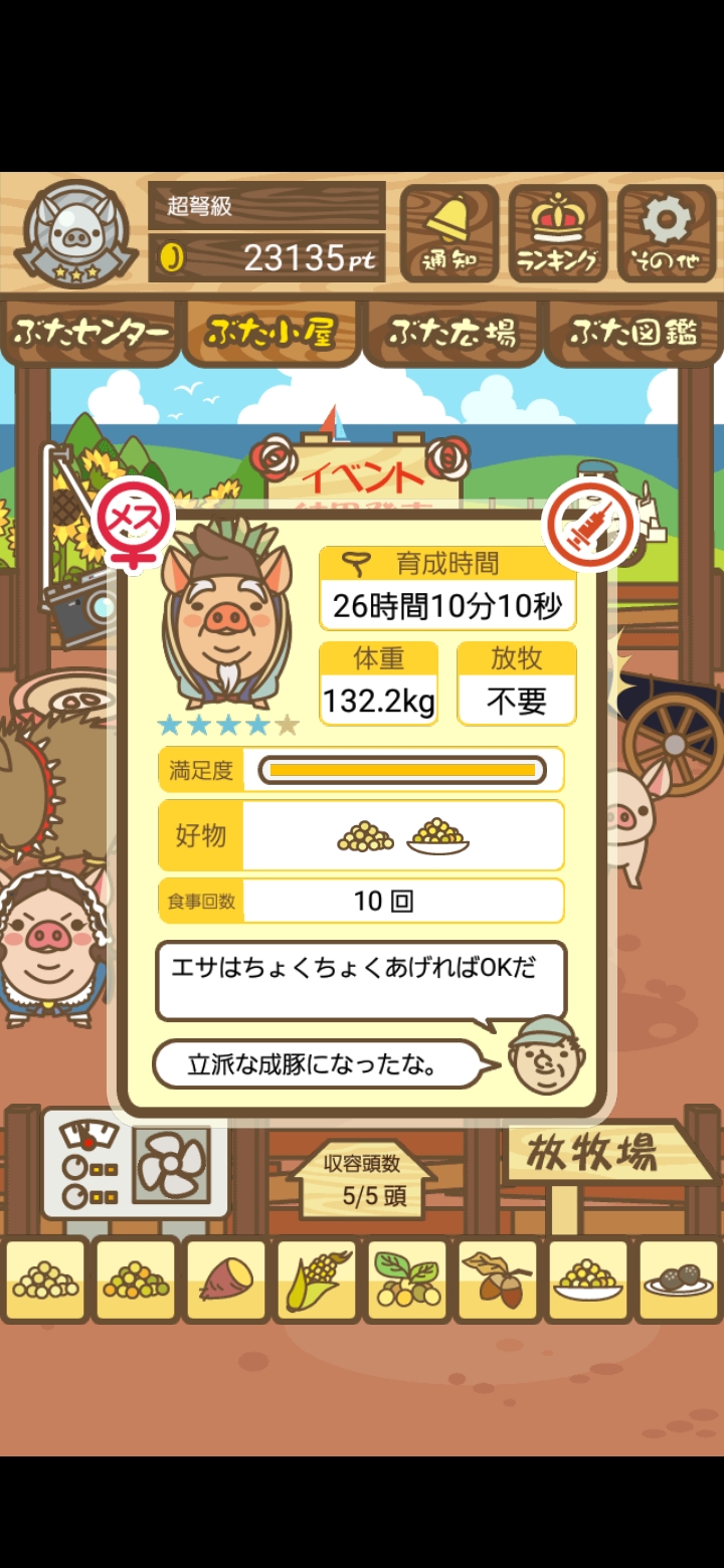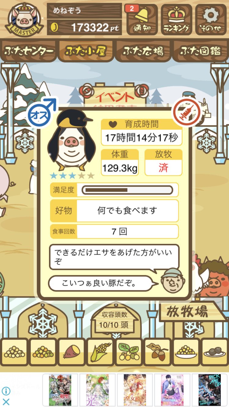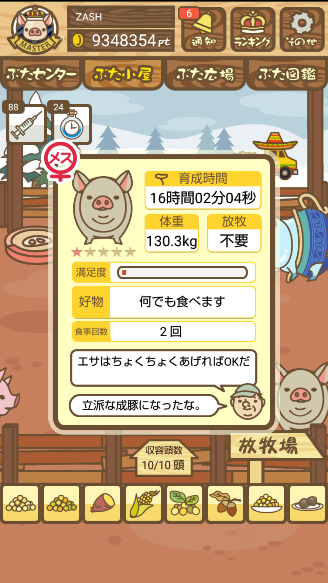 - また、エイブゥ....エサ雑穀16回、エサやりの度に放牧場行き来、16回エサやり後他の豚を放牧場へ....下の成功例の通り育成したつもりですが、何がダメだったんでしょう?掃除豚も排除しないといけないのでしょうか?