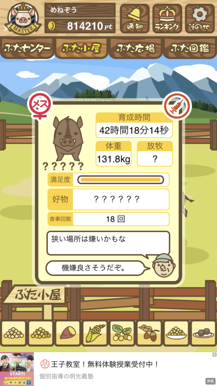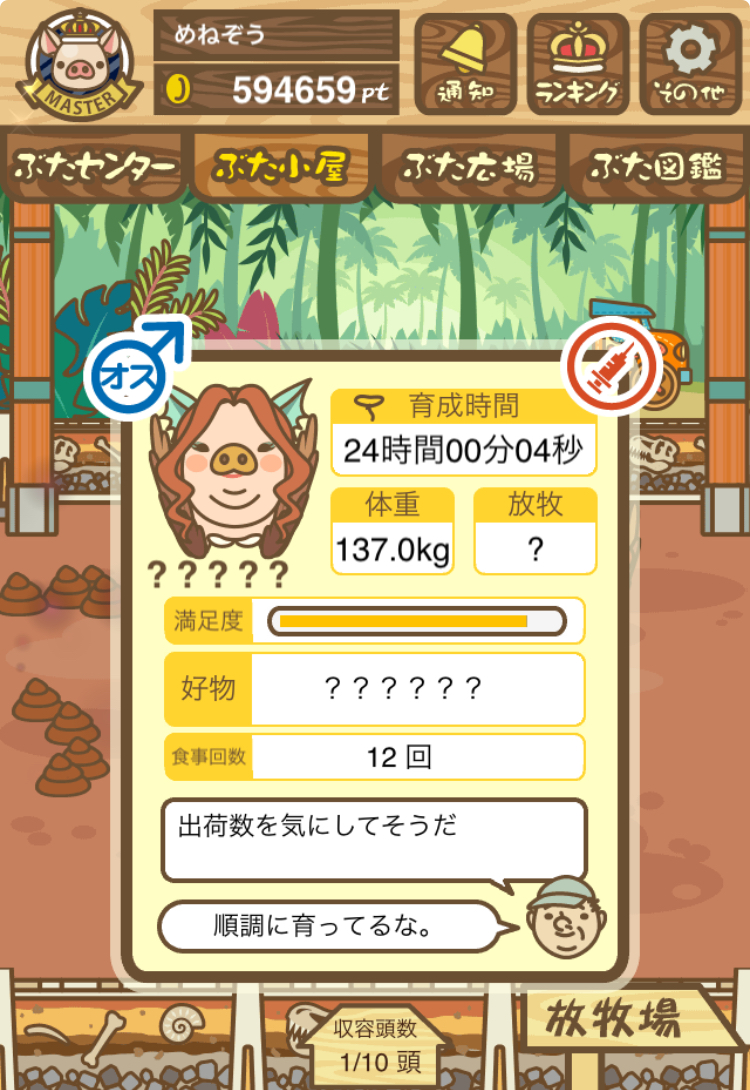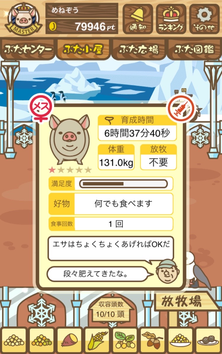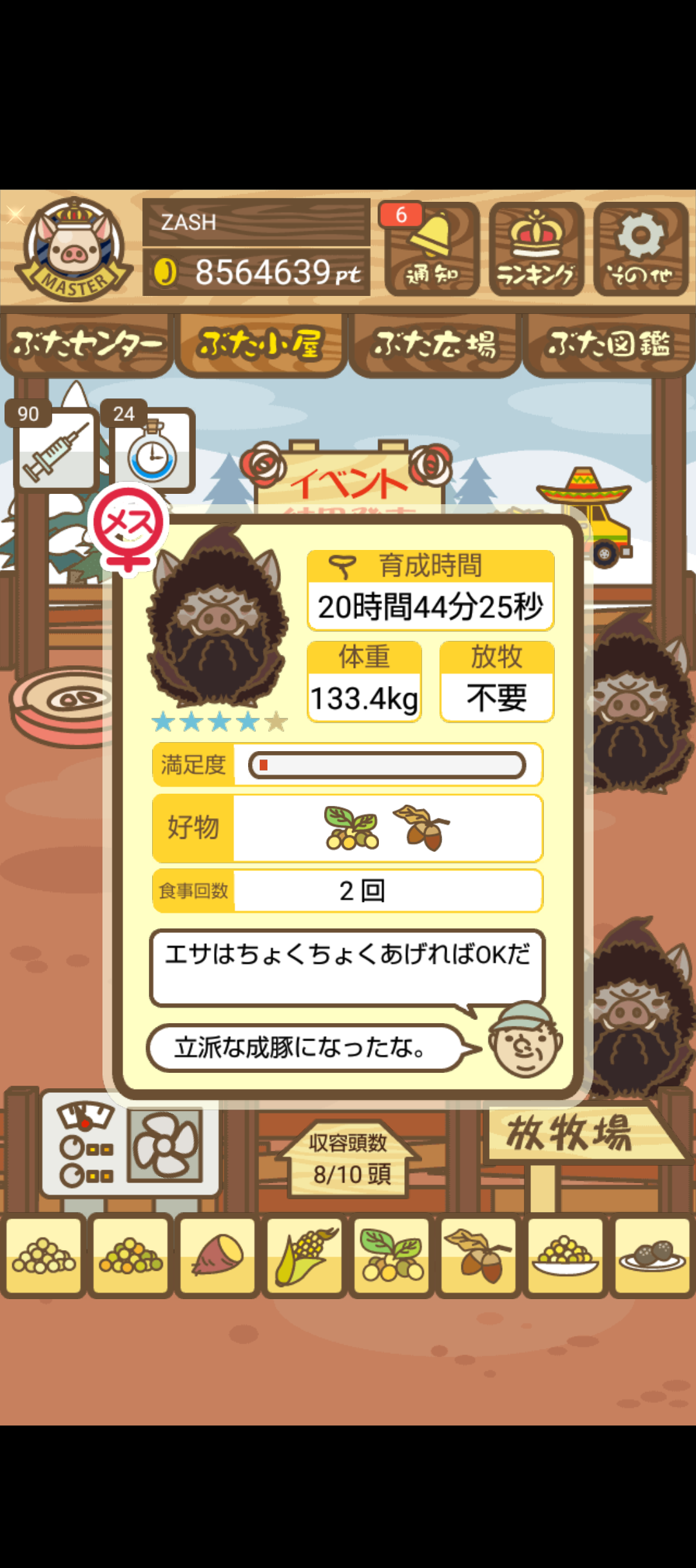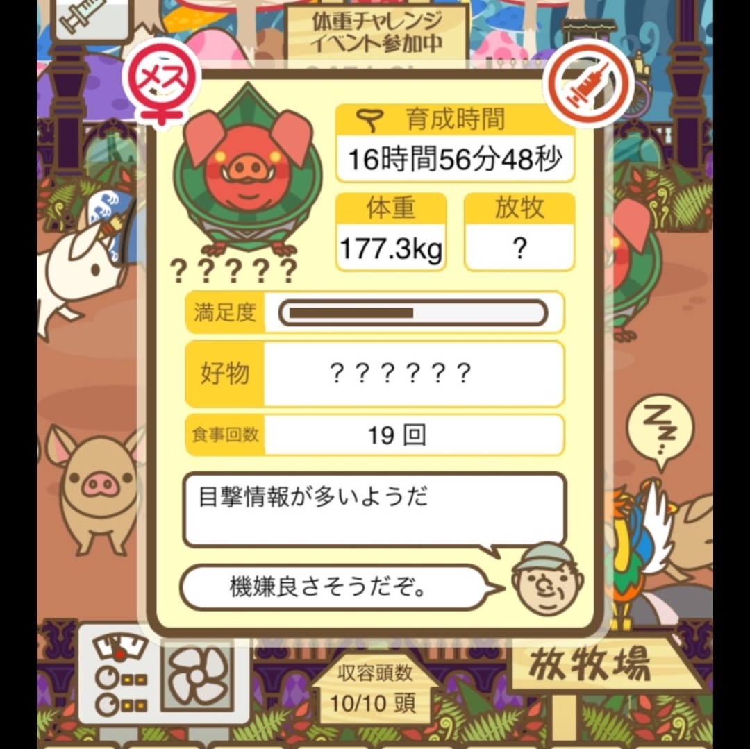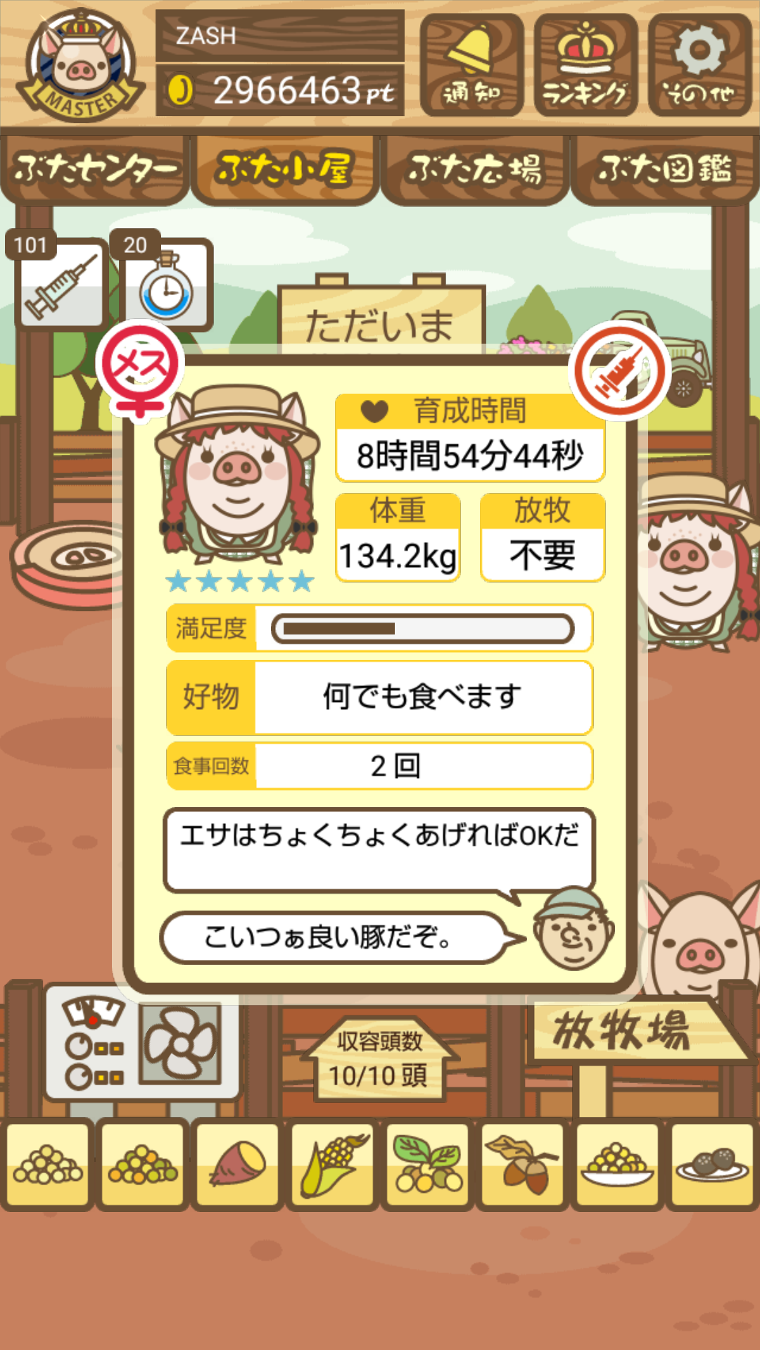 - また、エイブゥ....エサ雑穀16回、エサやりの度に放牧場行き来、16回エサやり後他の豚を放牧場へ....下の成功例の通り育成したつもりですが、何がダメだったんでしょう?掃除豚も排除しないといけないのでしょうか?