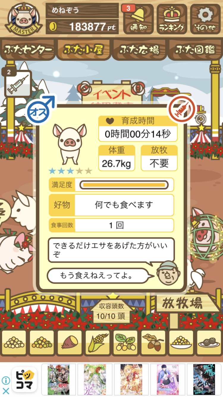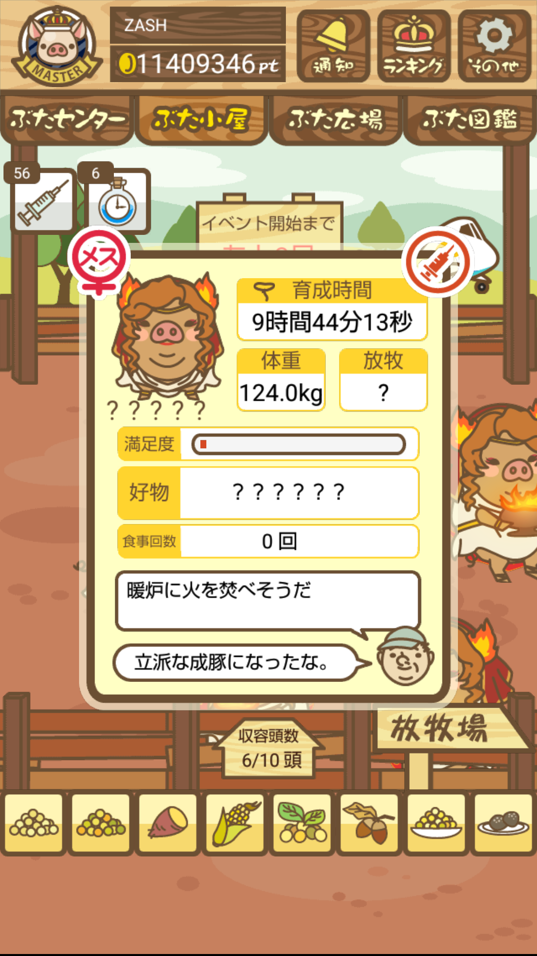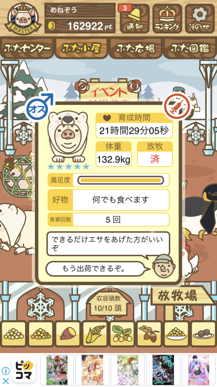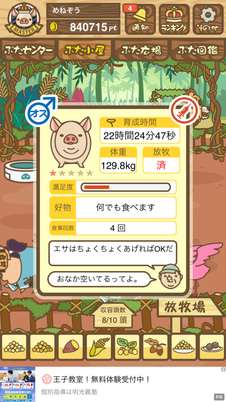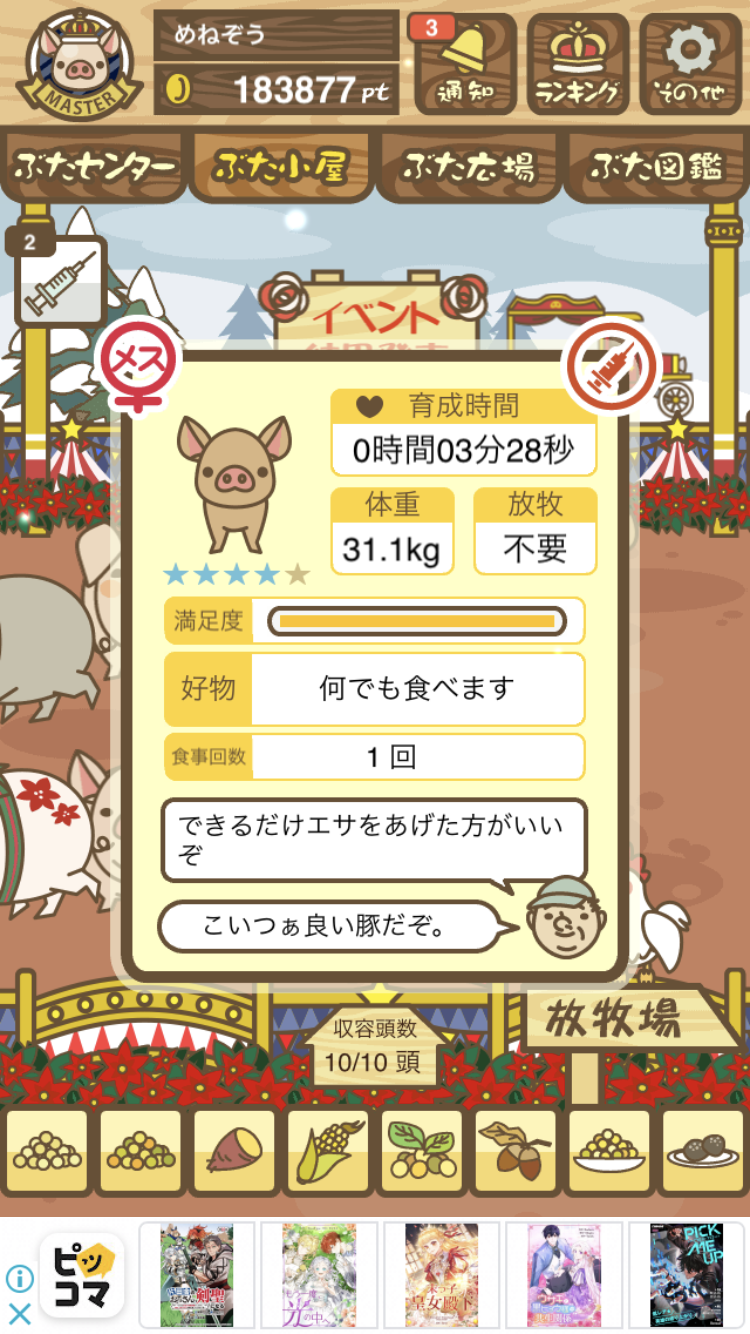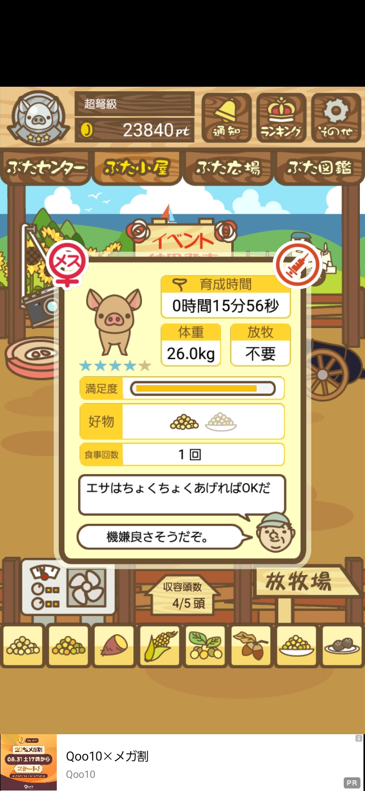 - また、エイブゥ....エサ雑穀16回、エサやりの度に放牧場行き来、16回エサやり後他の豚を放牧場へ....下の成功例の通り育成したつもりですが、何がダメだったんでしょう?掃除豚も排除しないといけないのでしょうか?