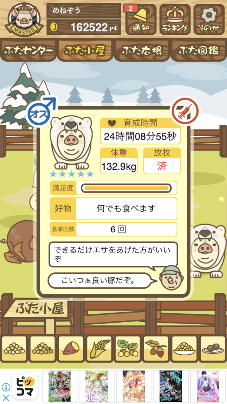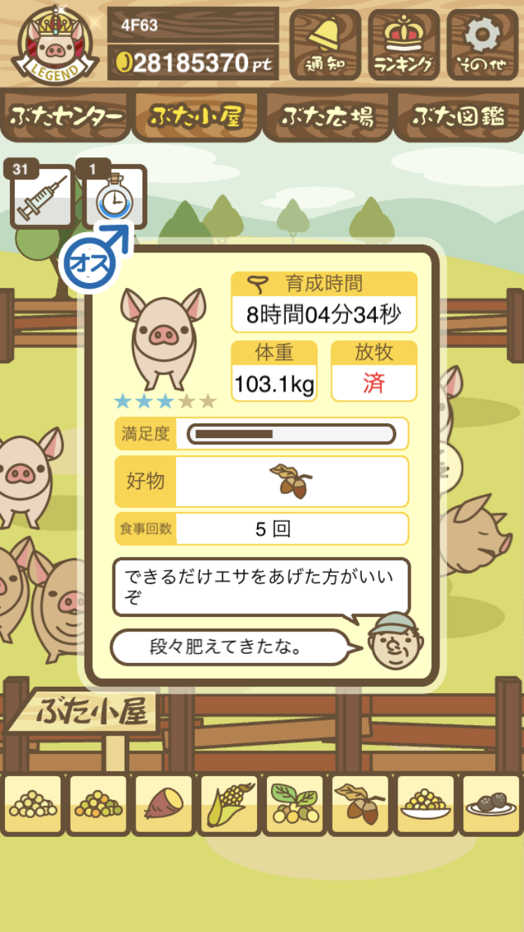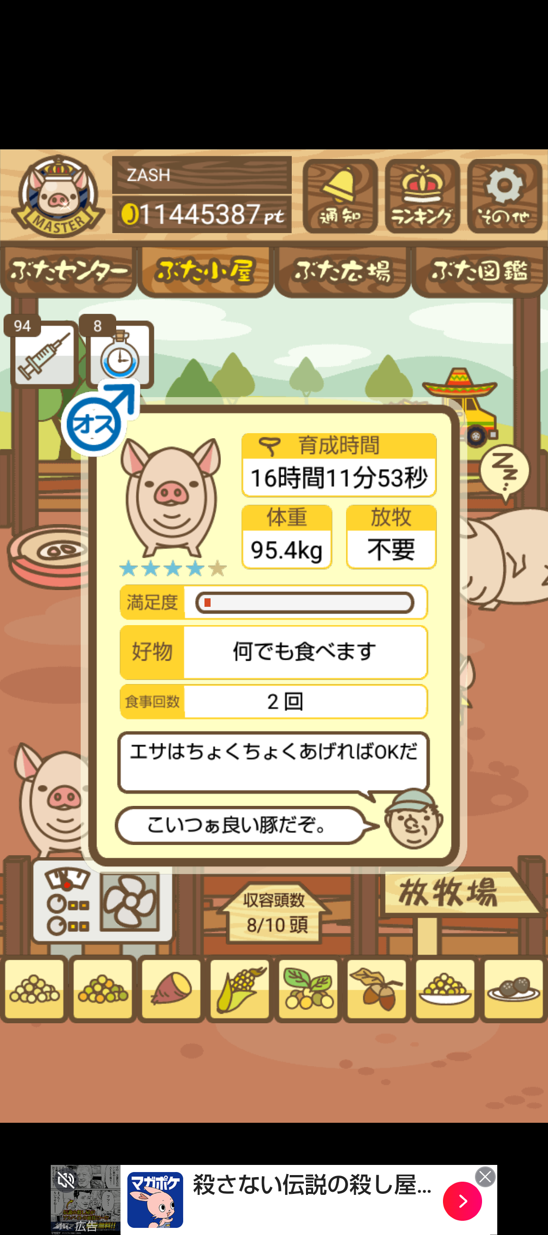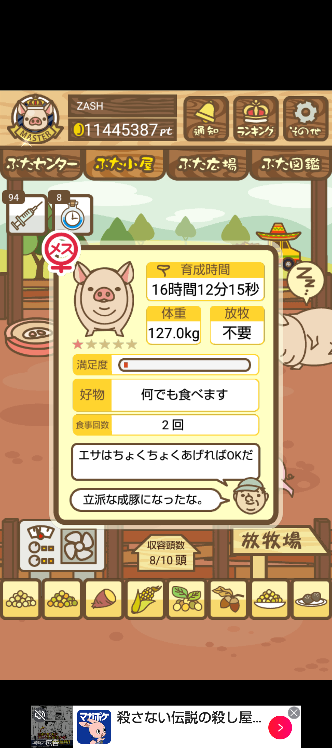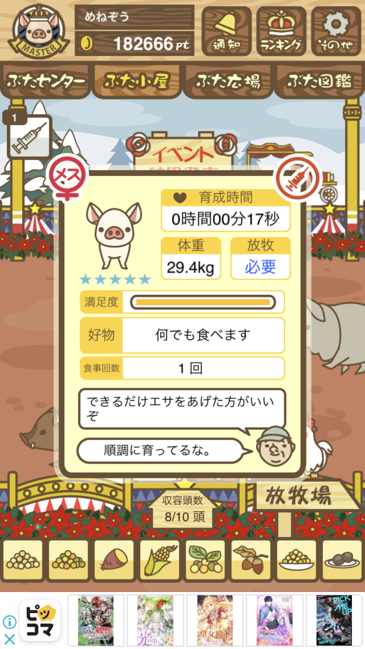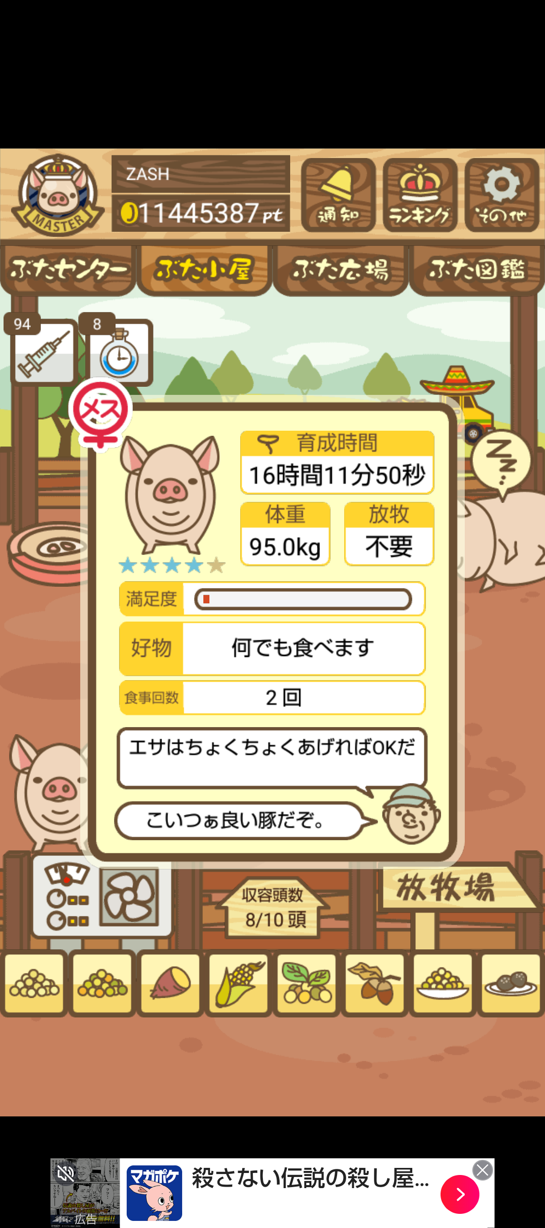 - また、エイブゥ....エサ雑穀16回、エサやりの度に放牧場行き来、16回エサやり後他の豚を放牧場へ....下の成功例の通り育成したつもりですが、何がダメだったんでしょう?掃除豚も排除しないといけないのでしょうか?