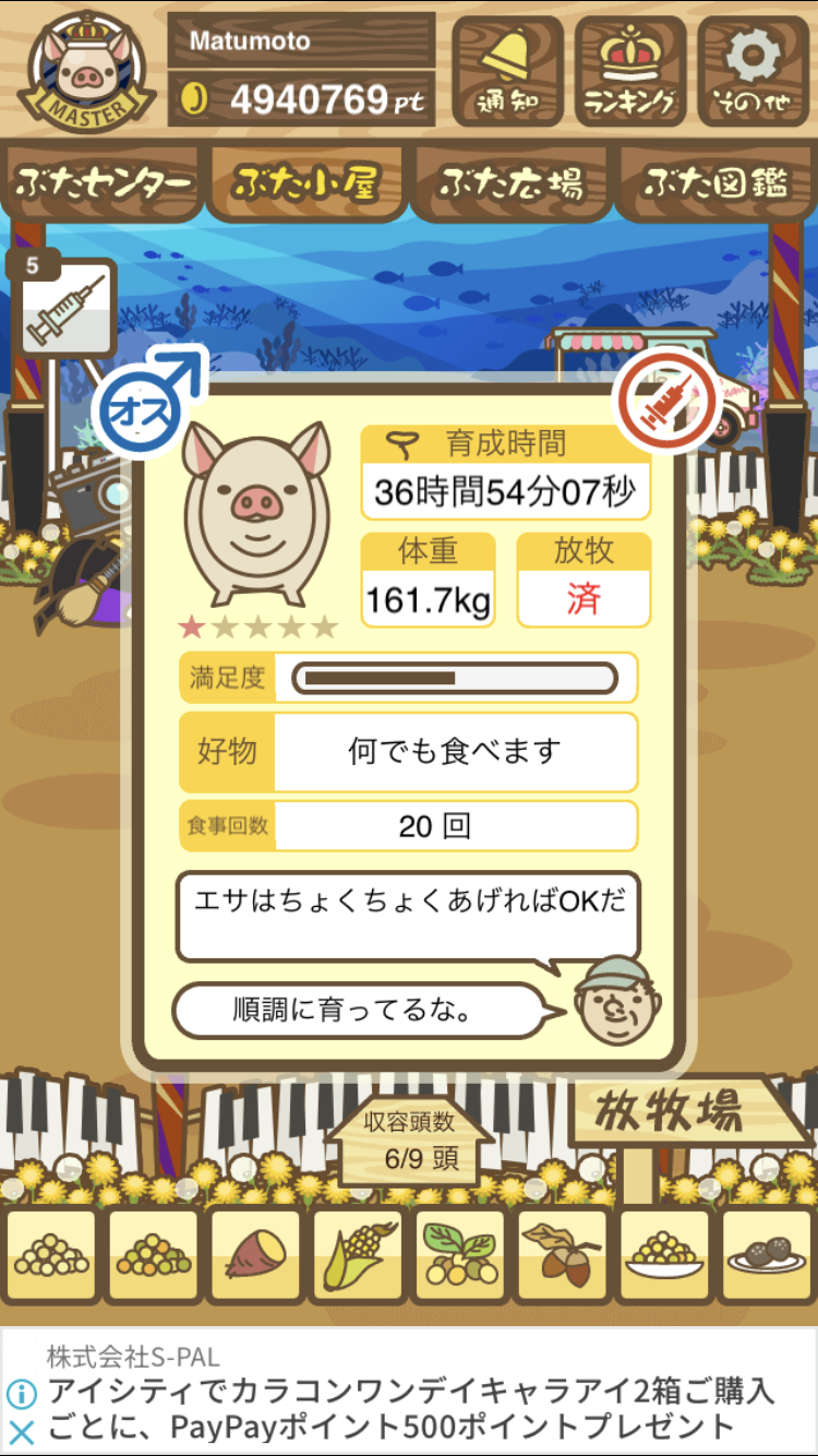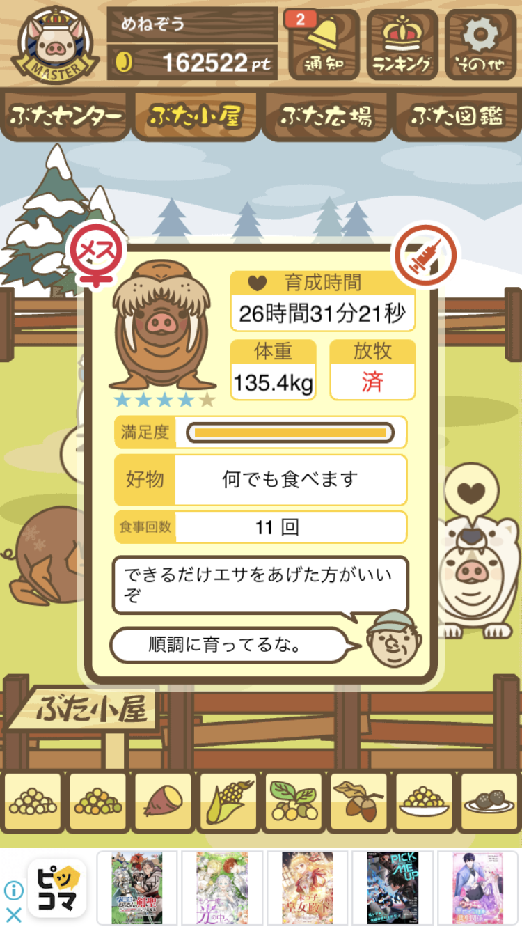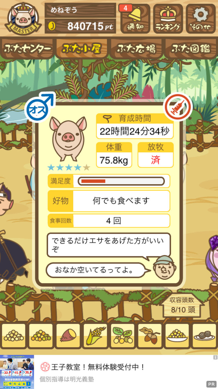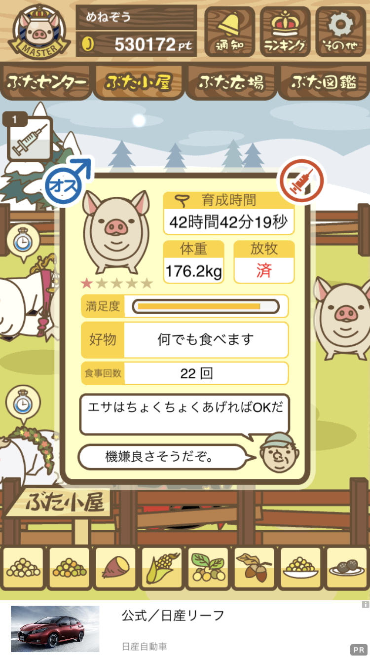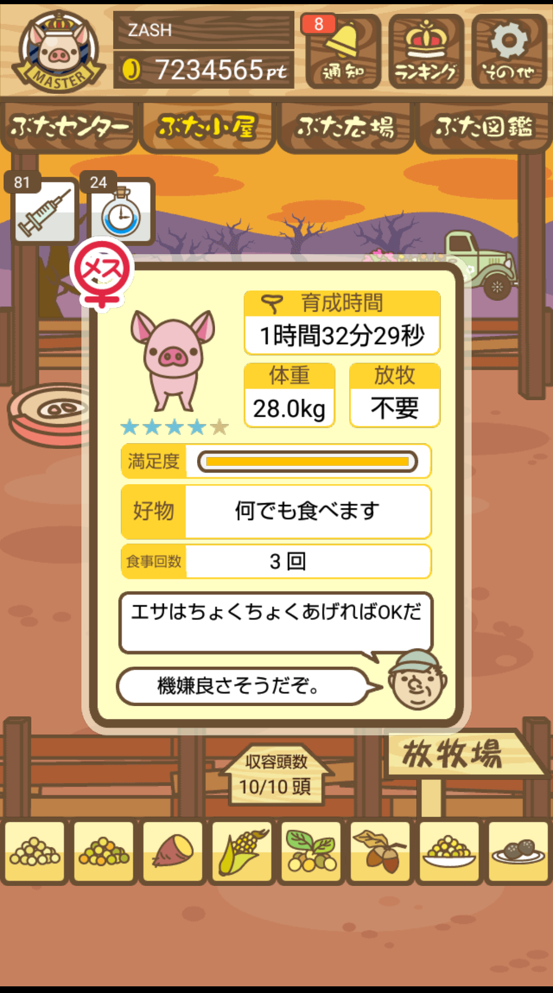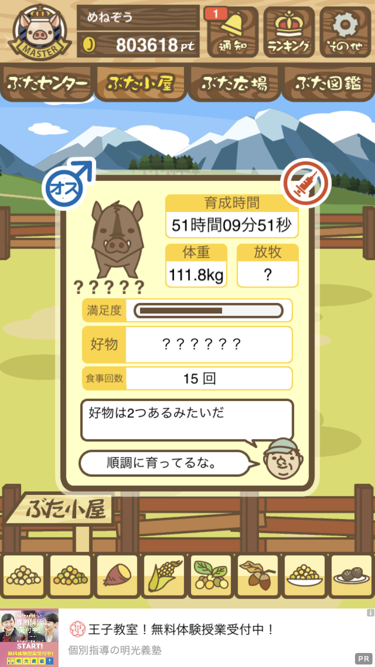 - また、エイブゥ....エサ雑穀16回、エサやりの度に放牧場行き来、16回エサやり後他の豚を放牧場へ....下の成功例の通り育成したつもりですが、何がダメだったんでしょう?掃除豚も排除しないといけないのでしょうか?