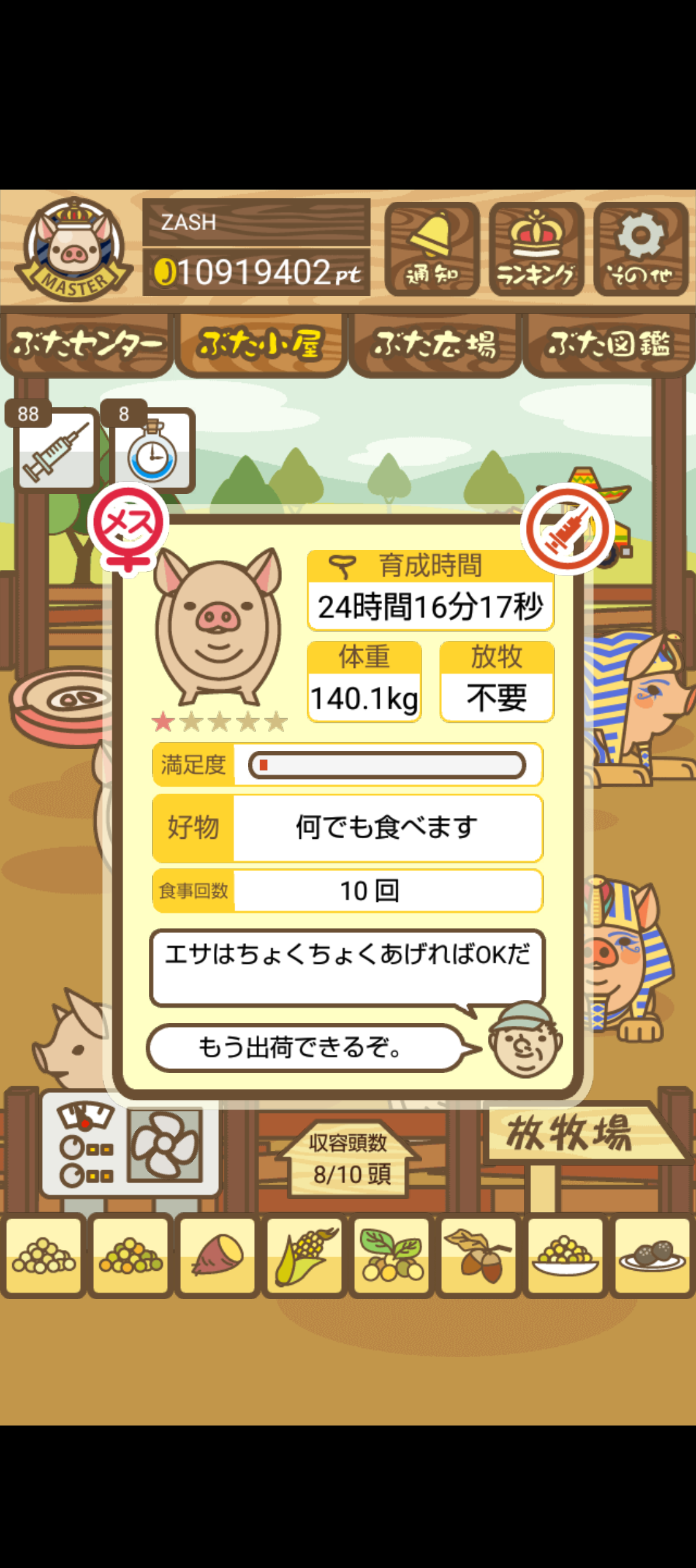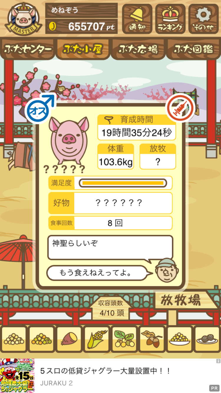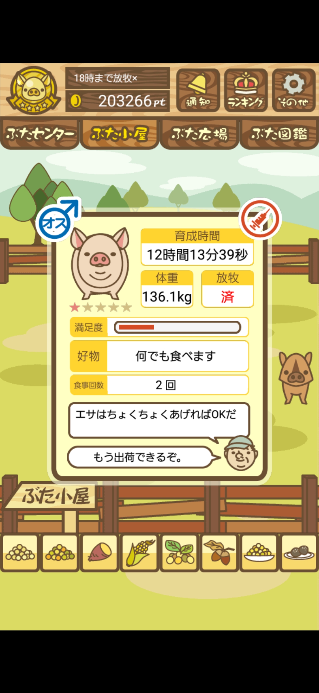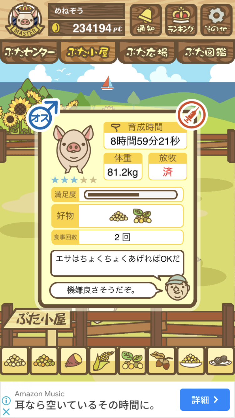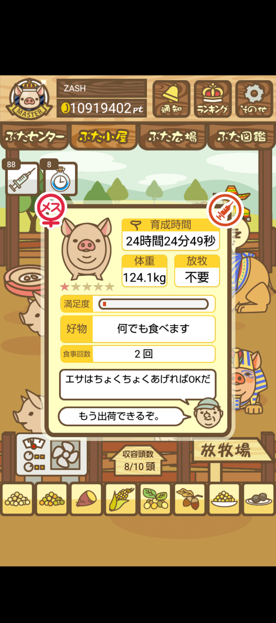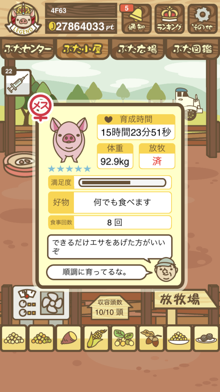 - また、エイブゥ....エサ雑穀16回、エサやりの度に放牧場行き来、16回エサやり後他の豚を放牧場へ....下の成功例の通り育成したつもりですが、何がダメだったんでしょう?掃除豚も排除しないといけないのでしょうか?