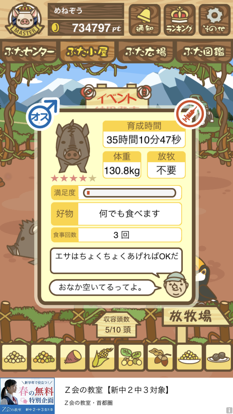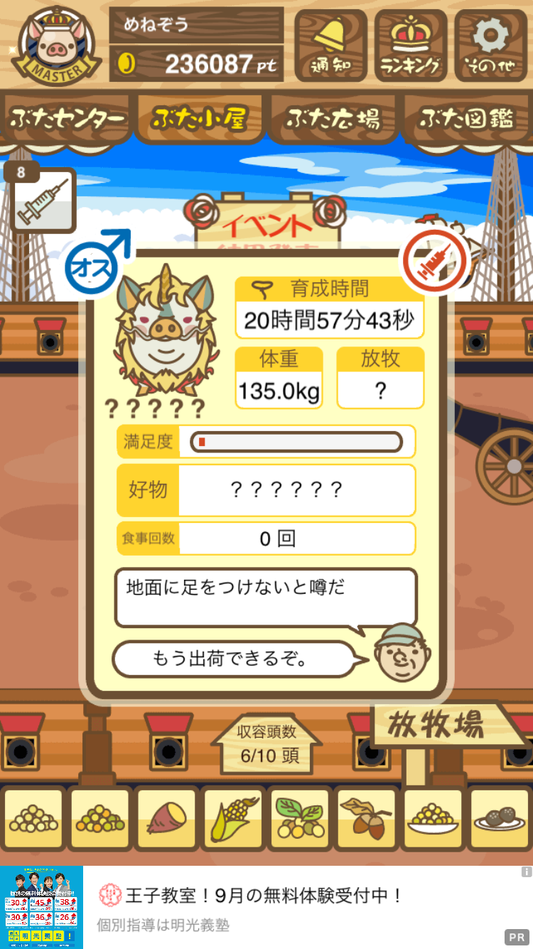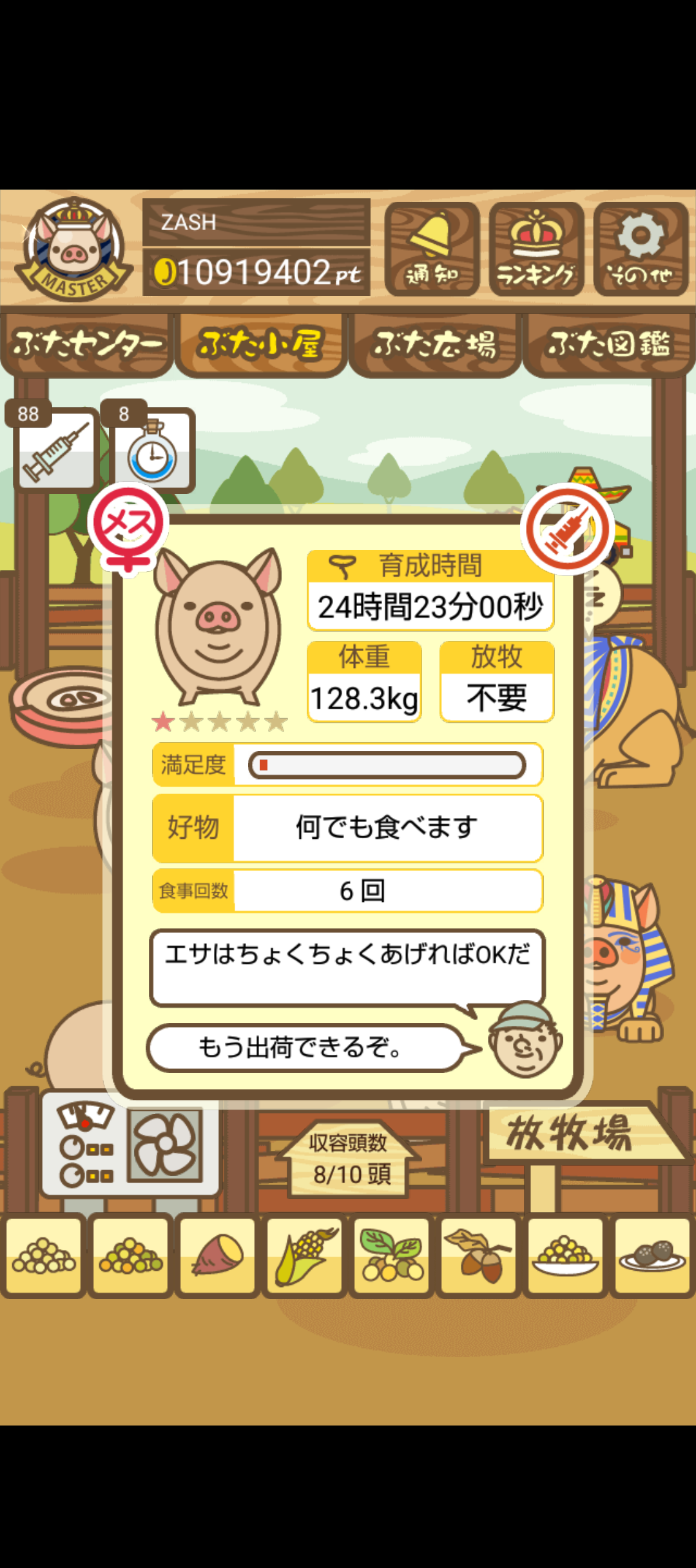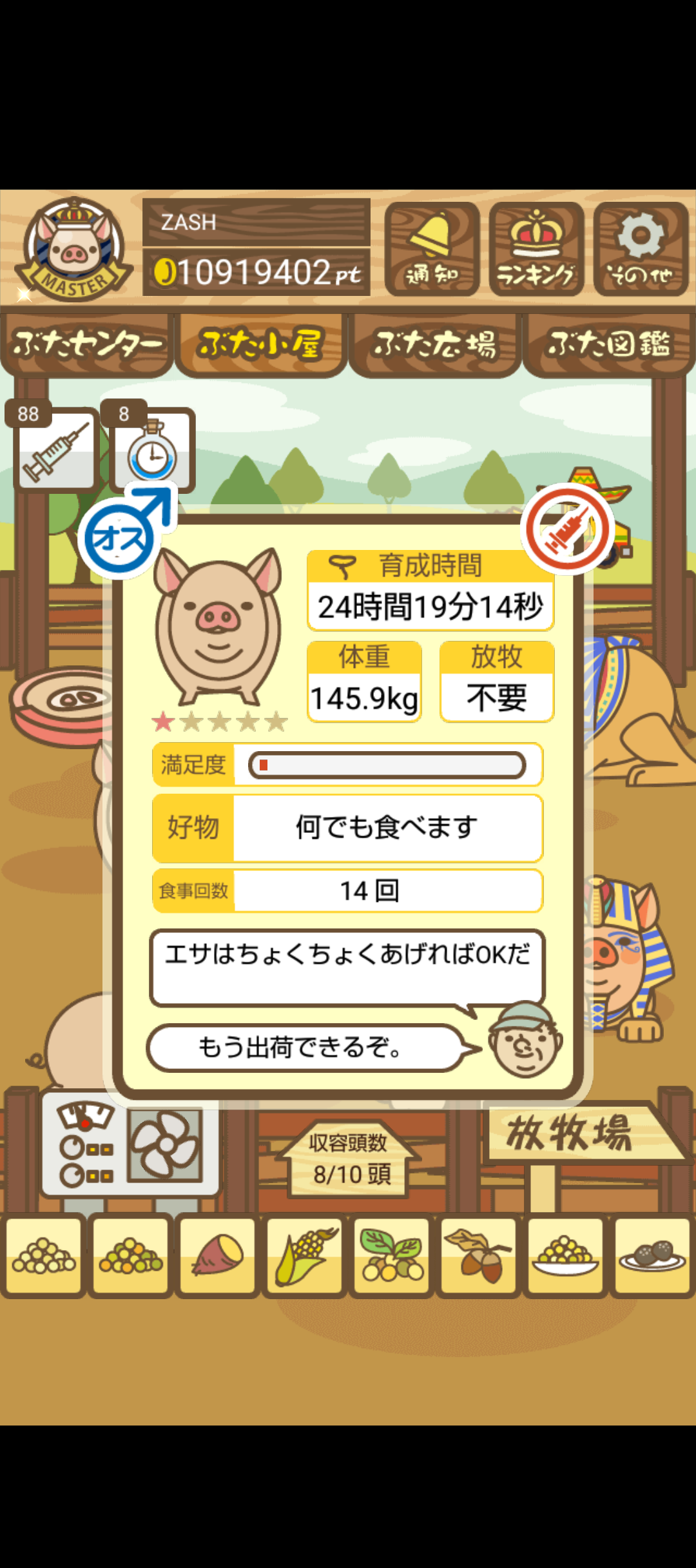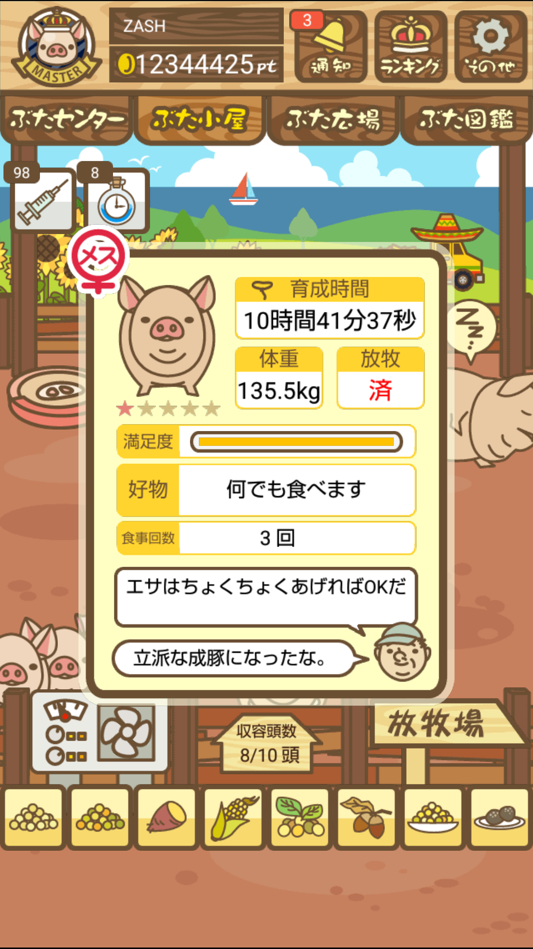 - また、エイブゥ....エサ雑穀16回、エサやりの度に放牧場行き来、16回エサやり後他の豚を放牧場へ....下の成功例の通り育成したつもりですが、何がダメだったんでしょう?掃除豚も排除しないといけないのでしょうか?