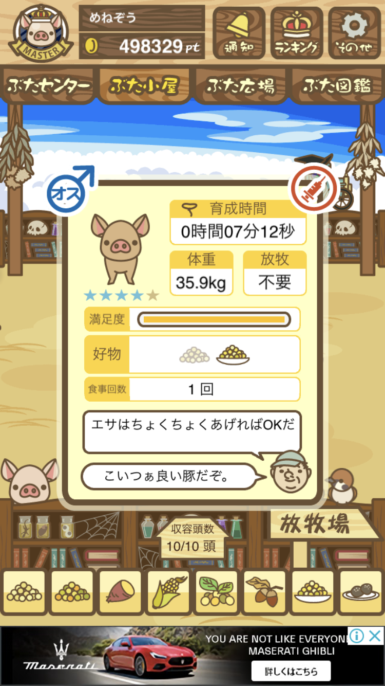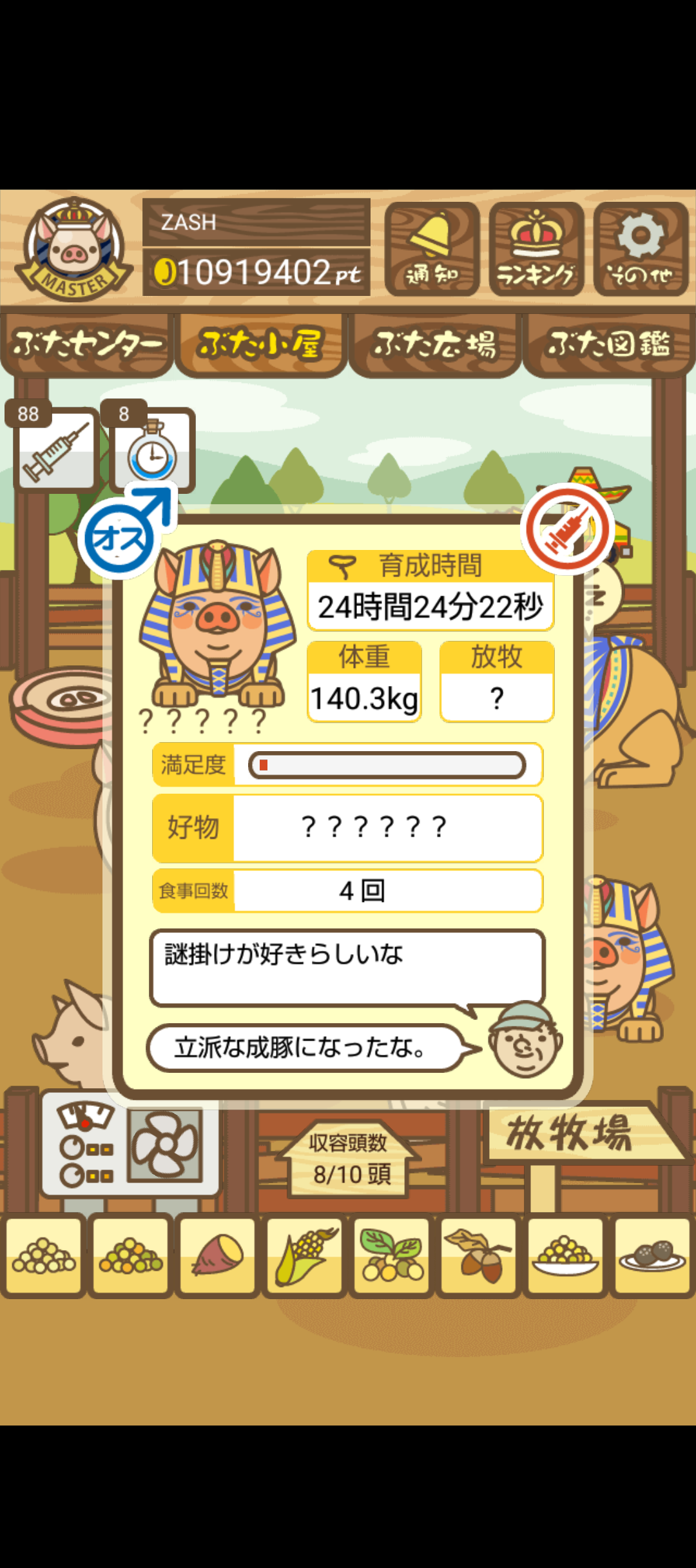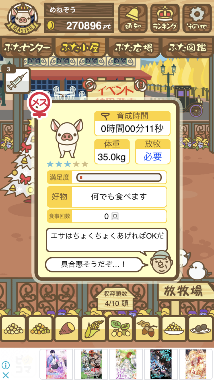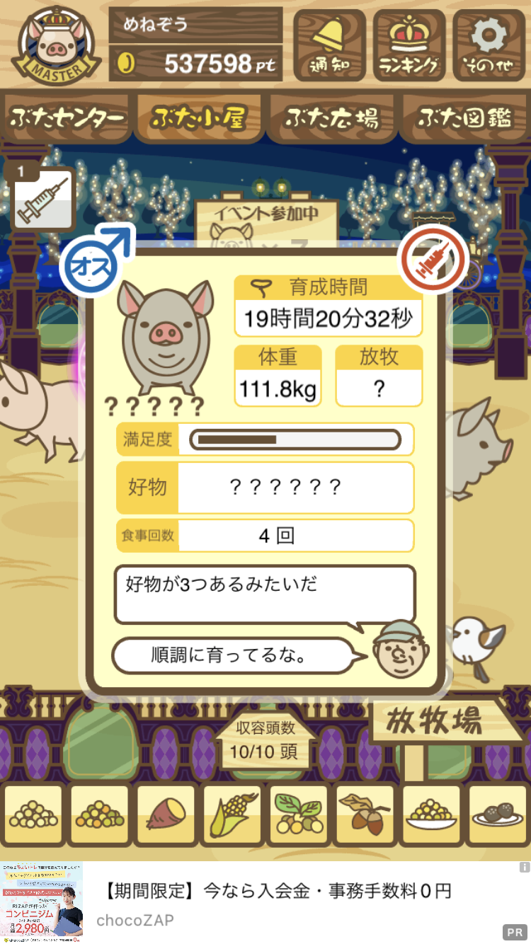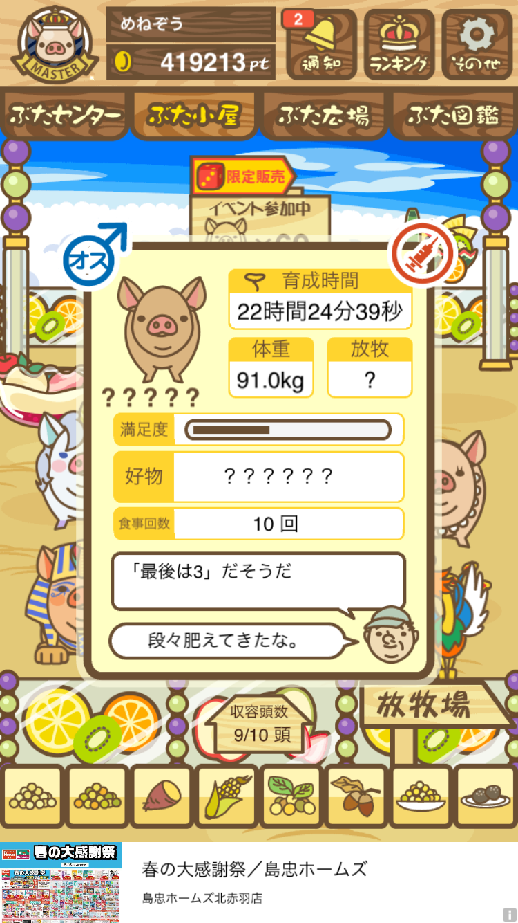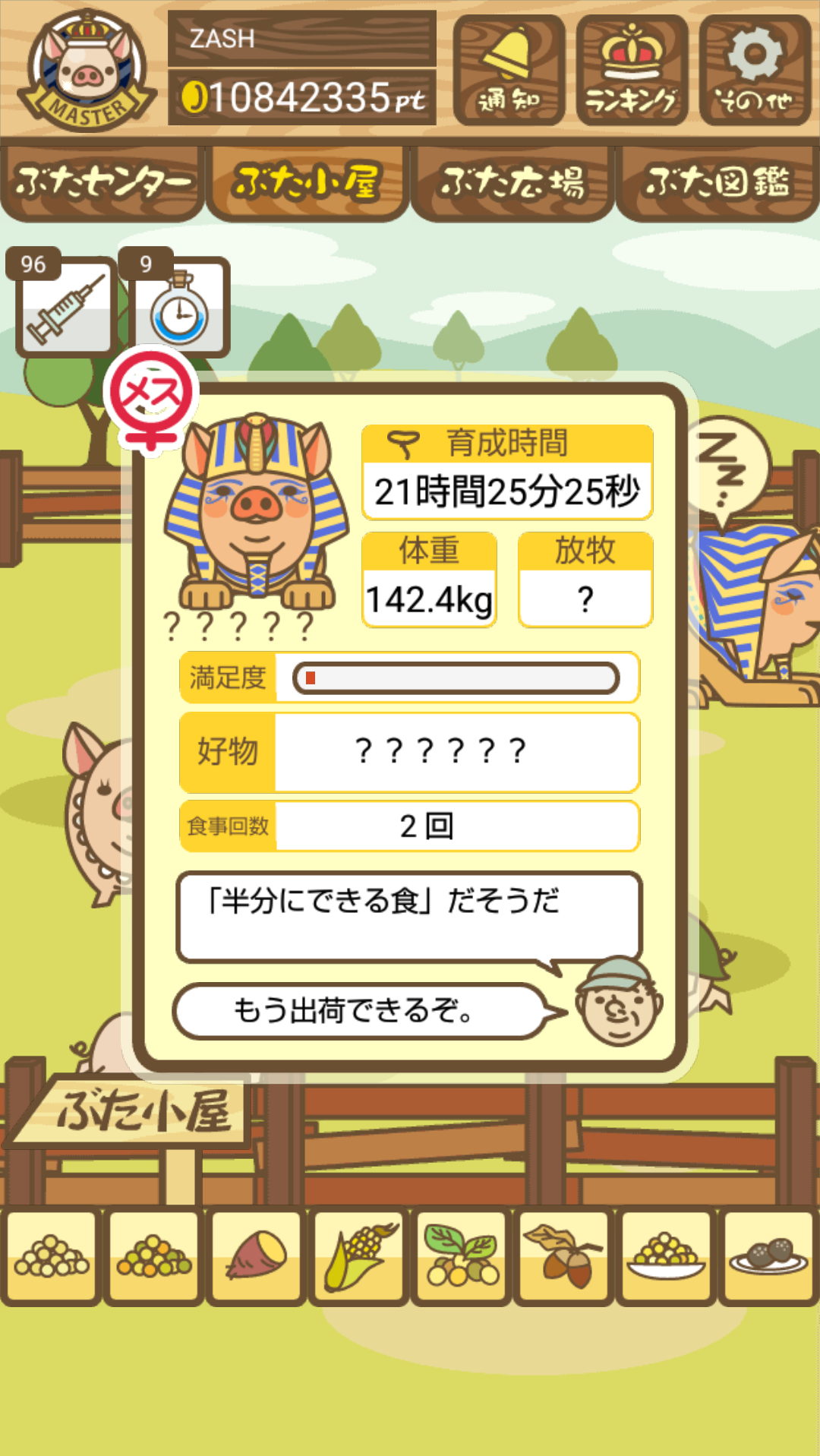 - また、エイブゥ....エサ雑穀16回、エサやりの度に放牧場行き来、16回エサやり後他の豚を放牧場へ....下の成功例の通り育成したつもりですが、何がダメだったんでしょう?掃除豚も排除しないといけないのでしょうか?