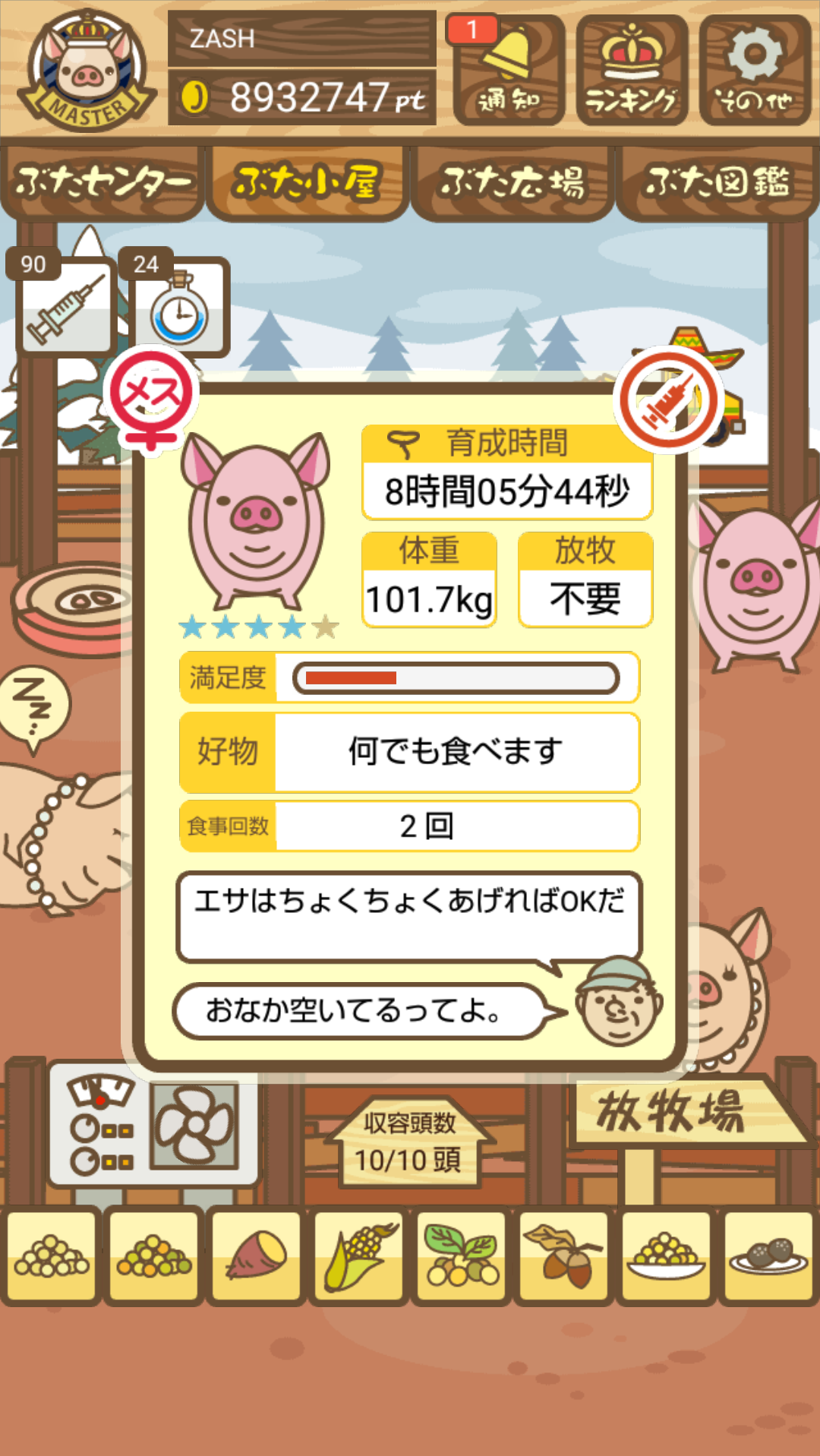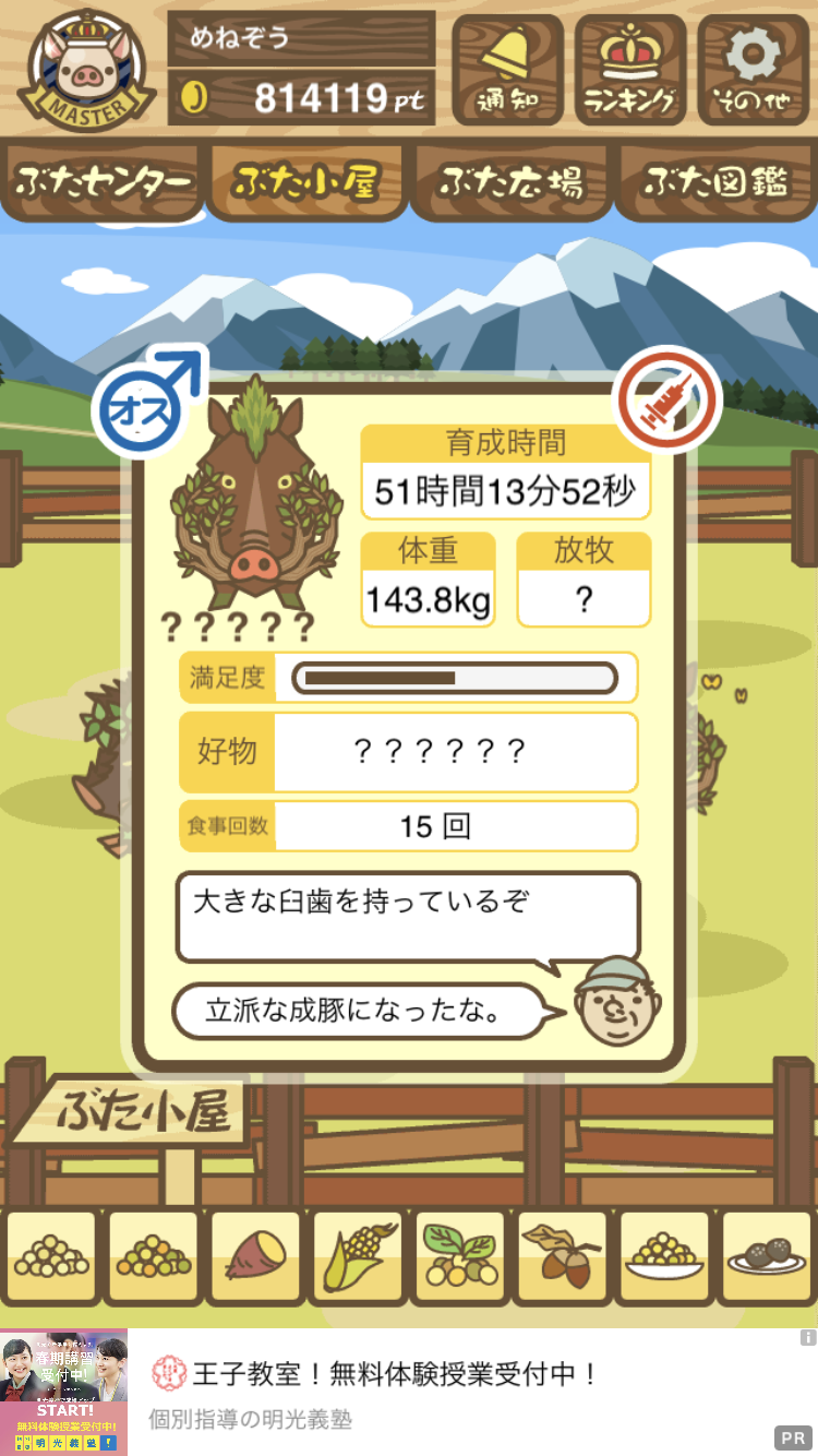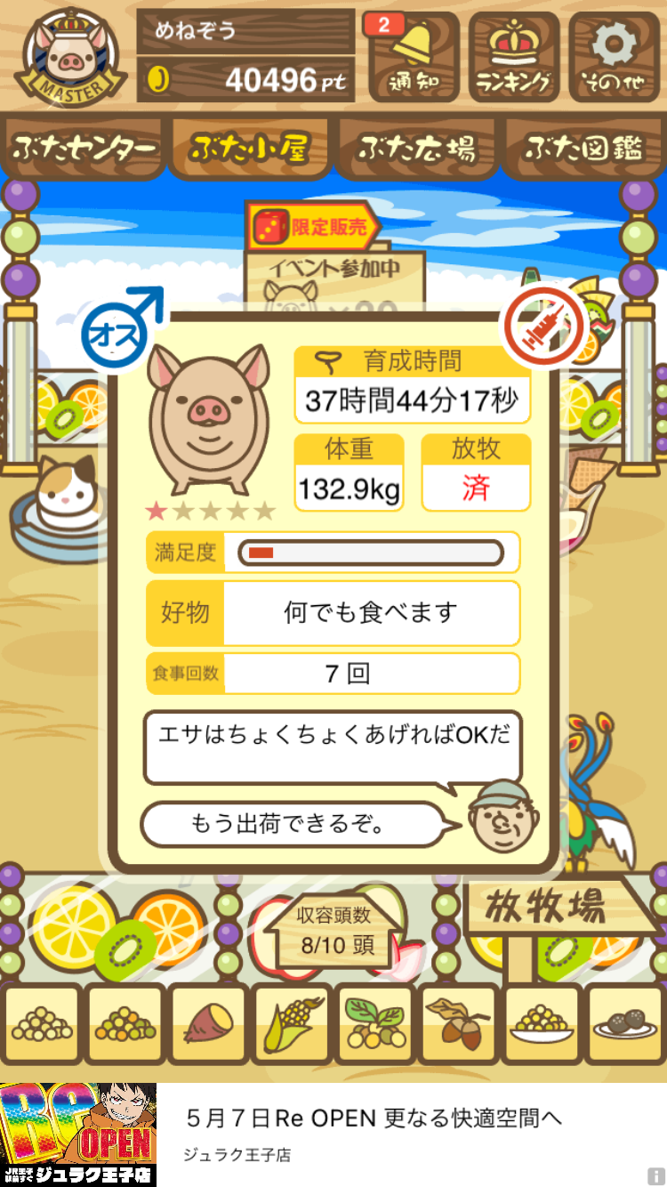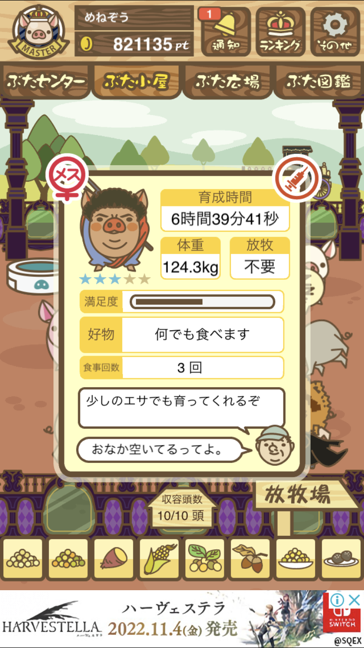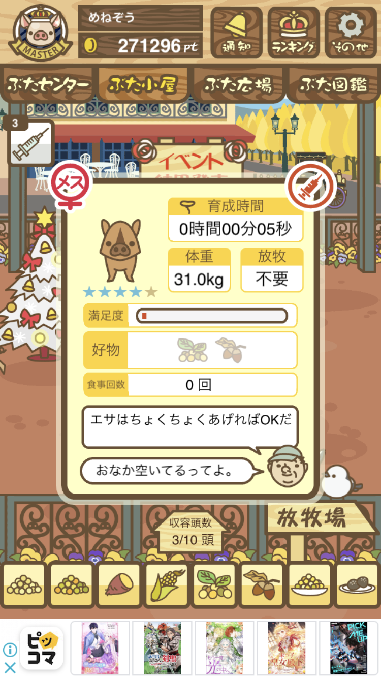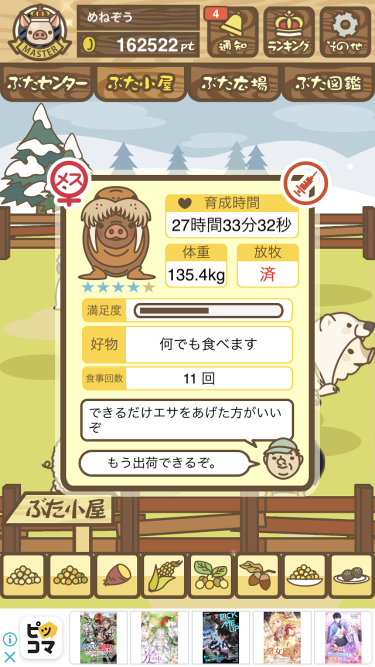 - また、エイブゥ....エサ雑穀16回、エサやりの度に放牧場行き来、16回エサやり後他の豚を放牧場へ....下の成功例の通り育成したつもりですが、何がダメだったんでしょう?掃除豚も排除しないといけないのでしょうか?