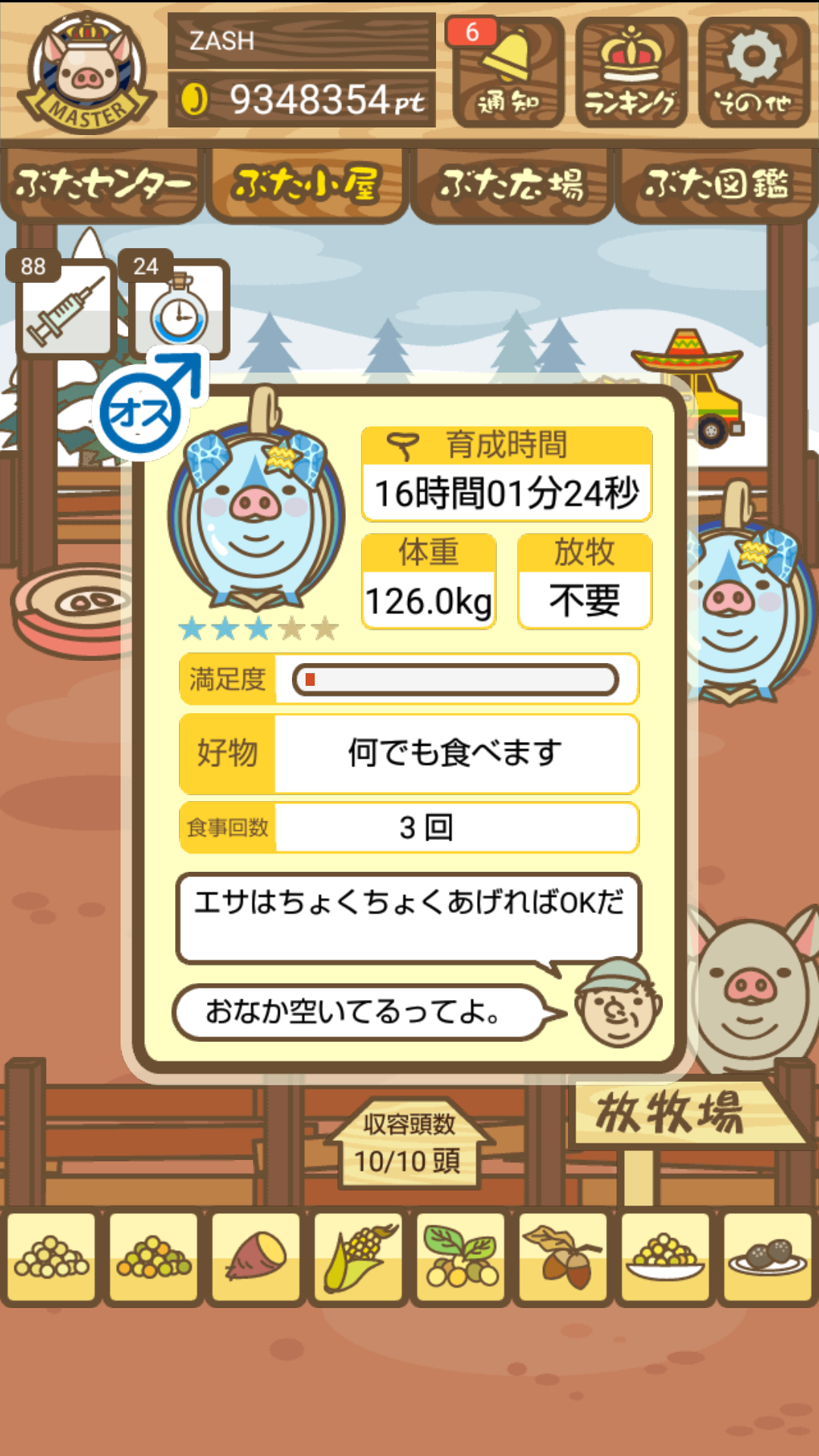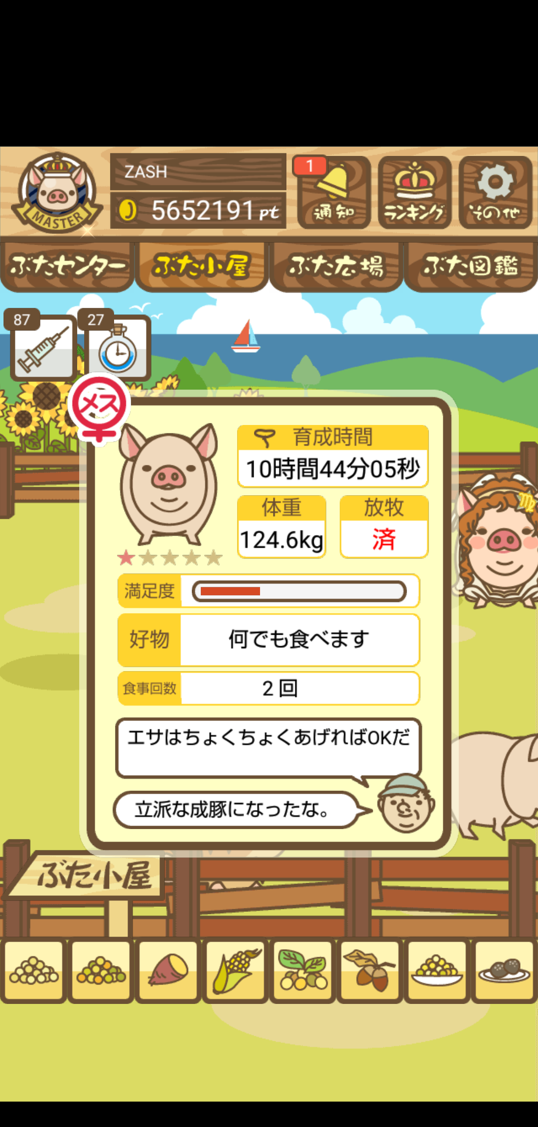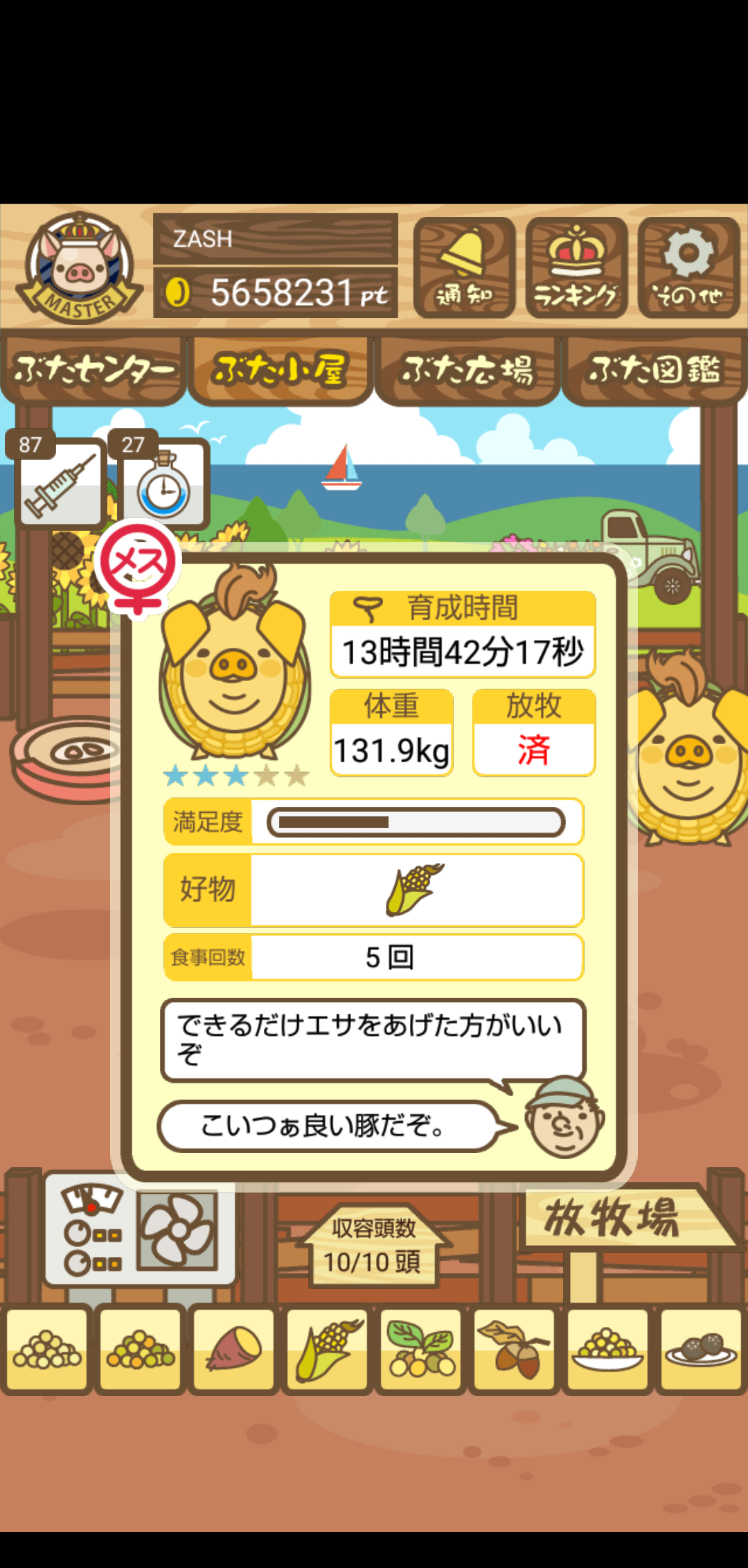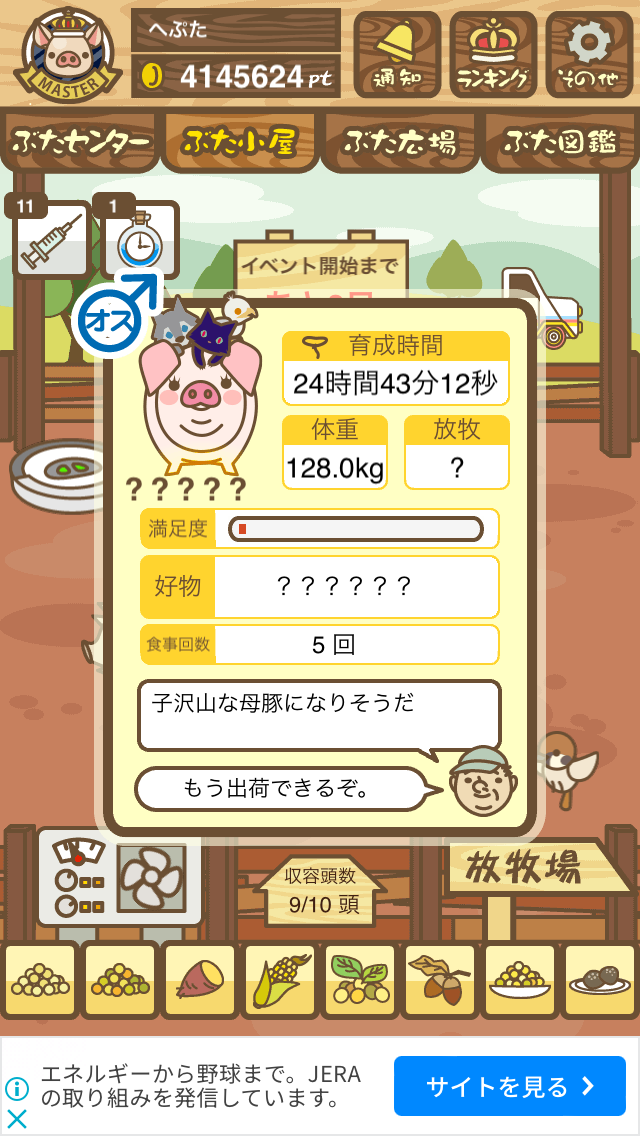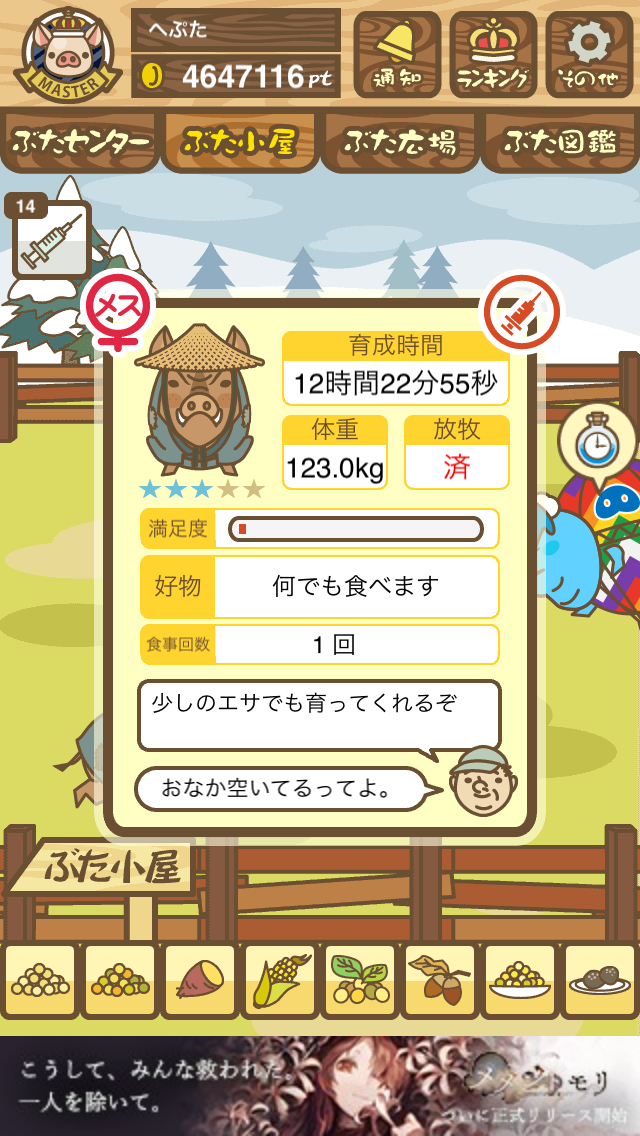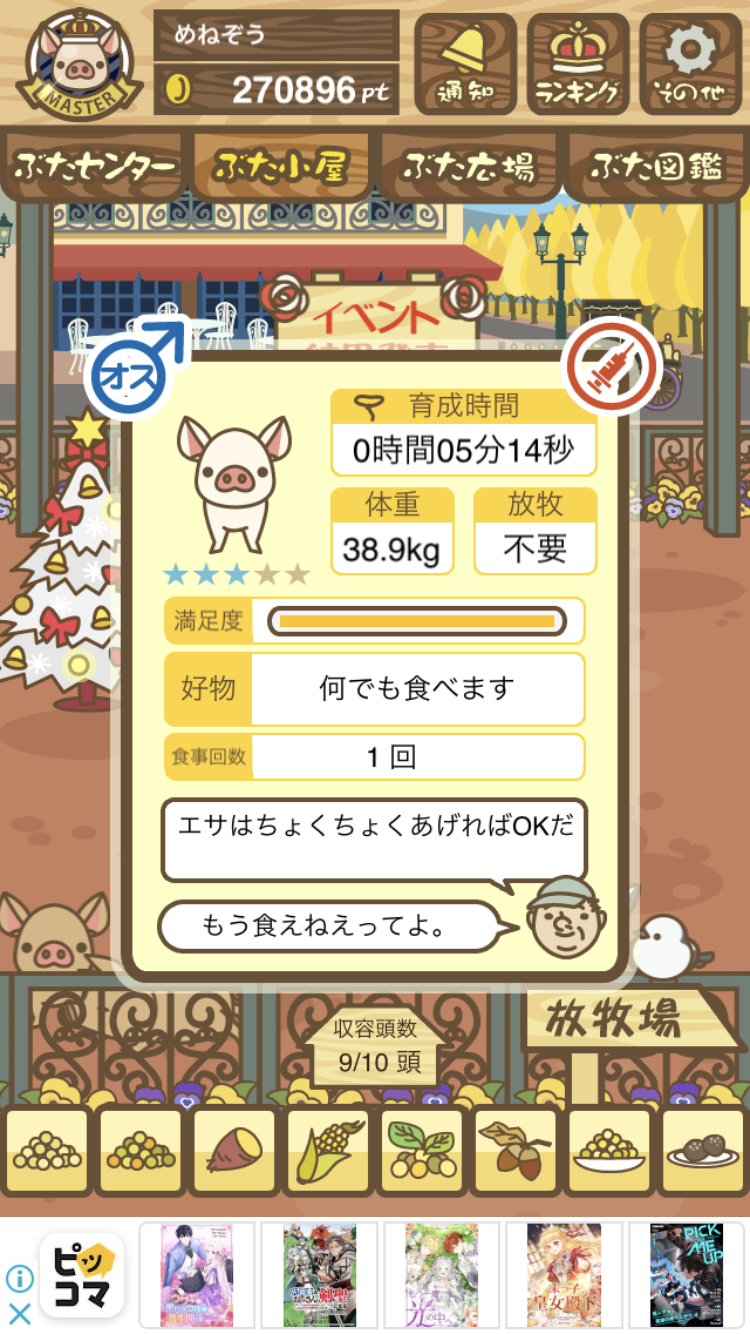 - また、エイブゥ....エサ雑穀16回、エサやりの度に放牧場行き来、16回エサやり後他の豚を放牧場へ....下の成功例の通り育成したつもりですが、何がダメだったんでしょう?掃除豚も排除しないといけないのでしょうか?