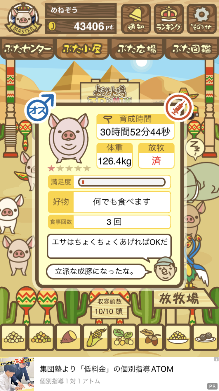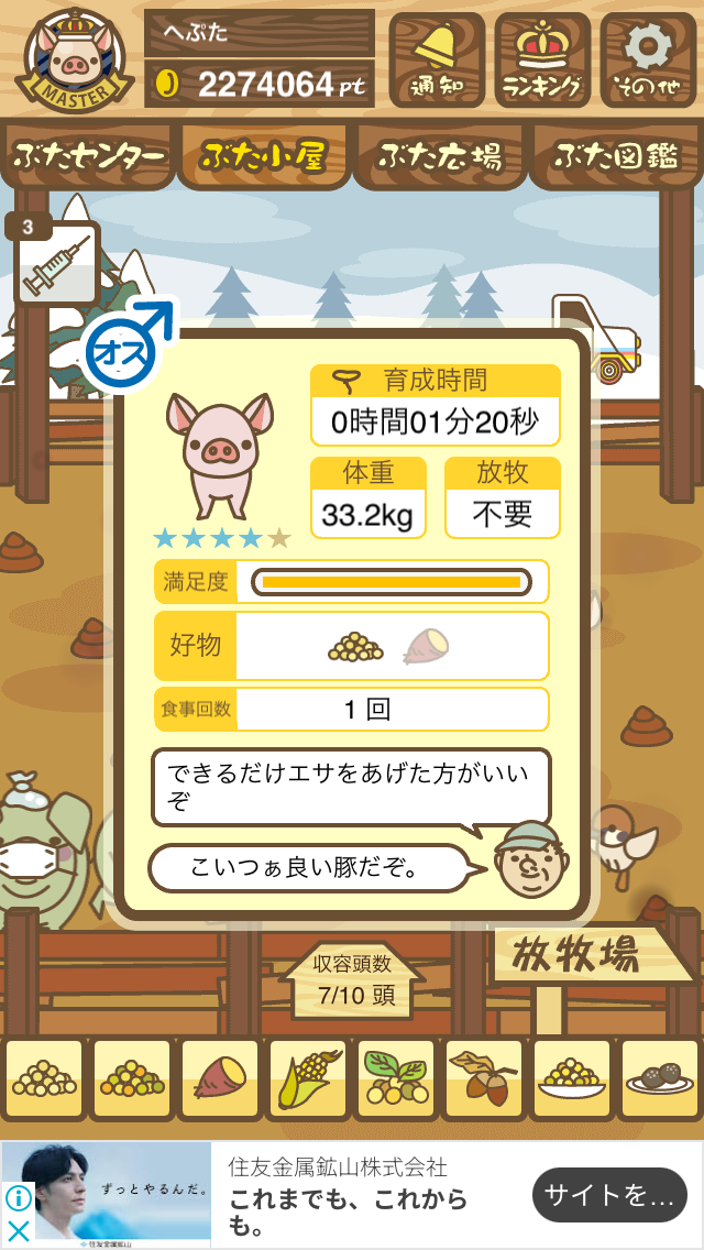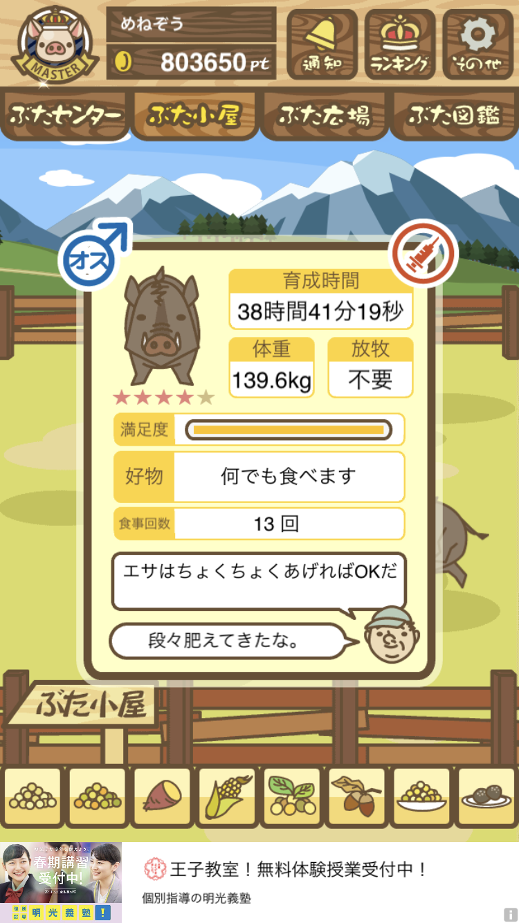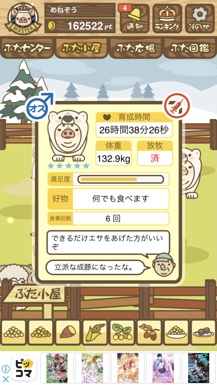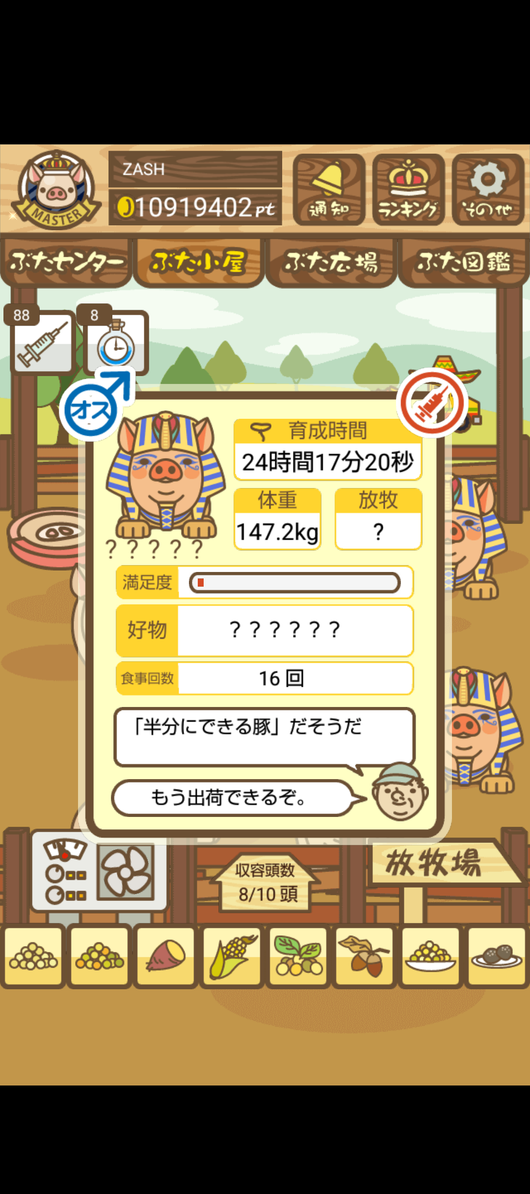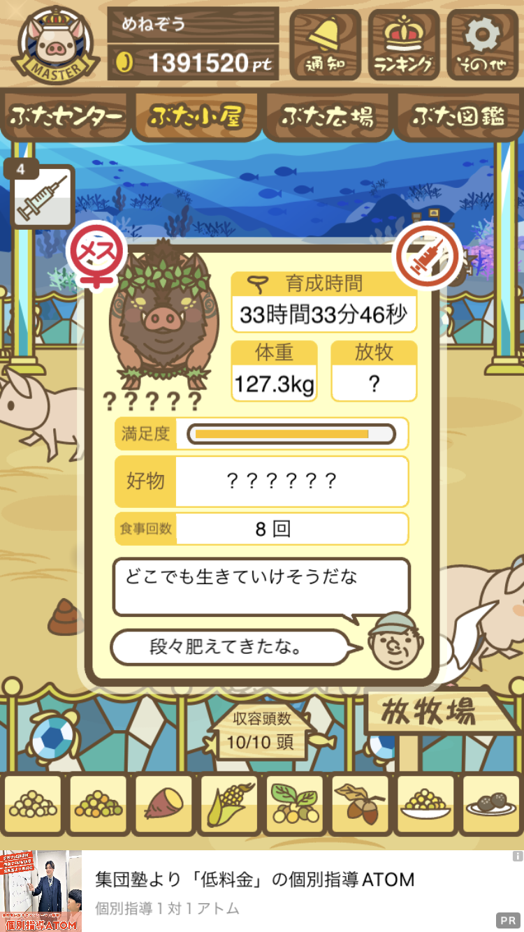 - また、エイブゥ....エサ雑穀16回、エサやりの度に放牧場行き来、16回エサやり後他の豚を放牧場へ....下の成功例の通り育成したつもりですが、何がダメだったんでしょう?掃除豚も排除しないといけないのでしょうか?