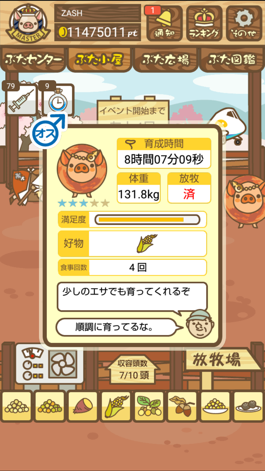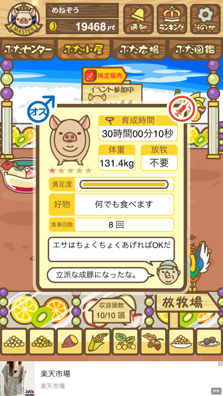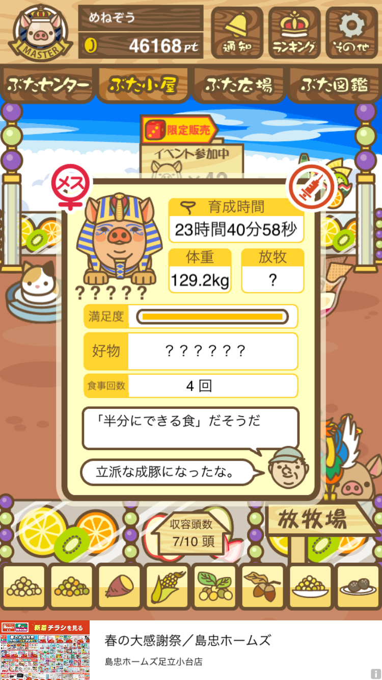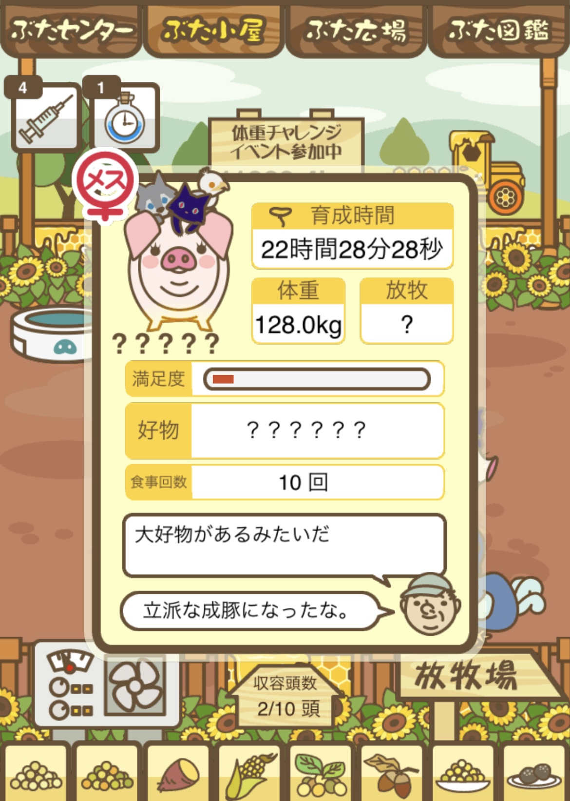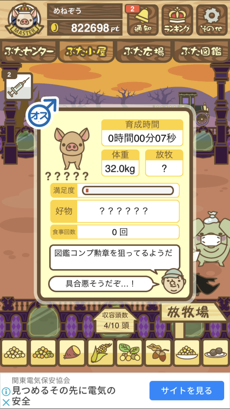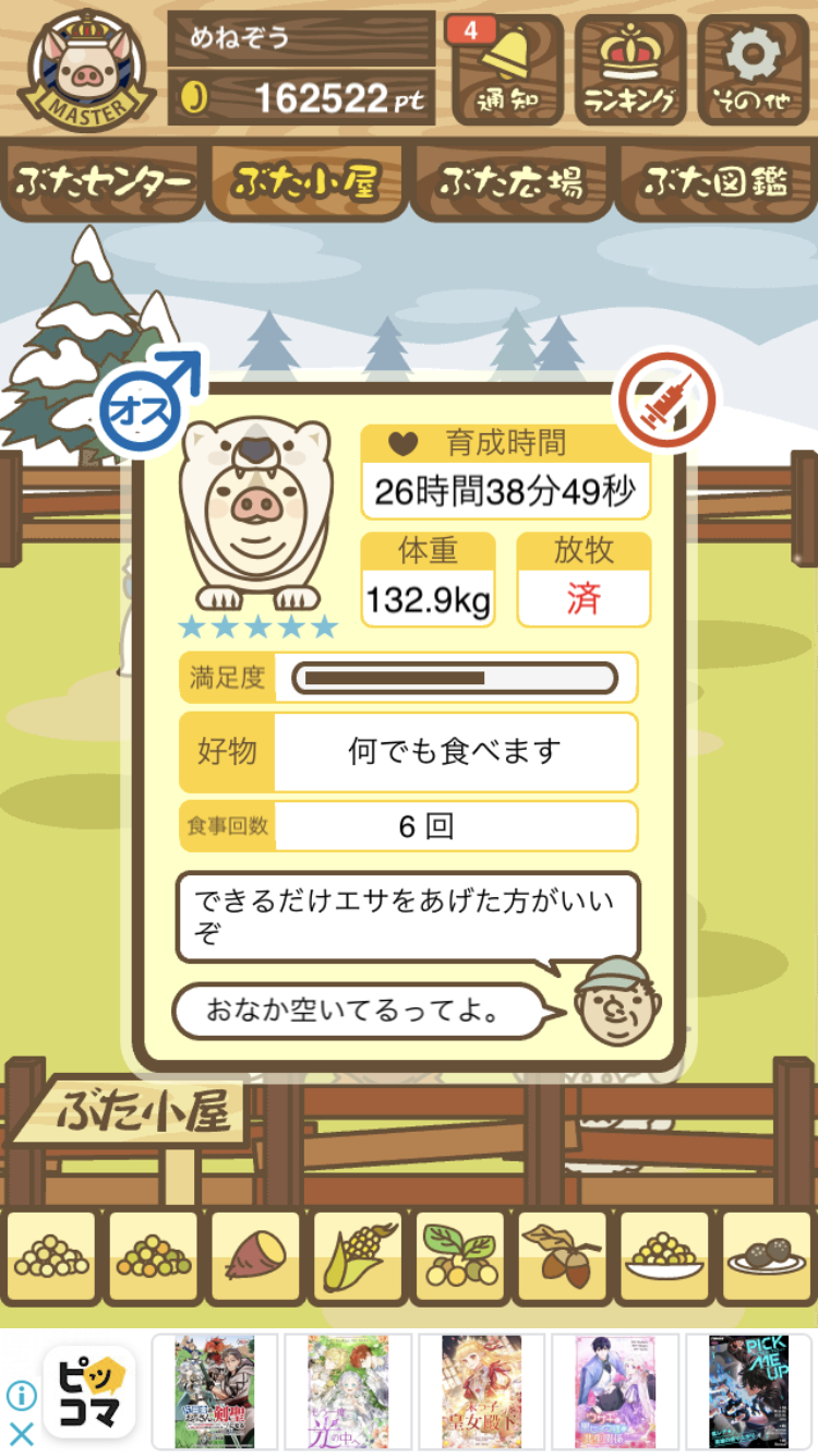 - また、エイブゥ....エサ雑穀16回、エサやりの度に放牧場行き来、16回エサやり後他の豚を放牧場へ....下の成功例の通り育成したつもりですが、何がダメだったんでしょう?掃除豚も排除しないといけないのでしょうか?