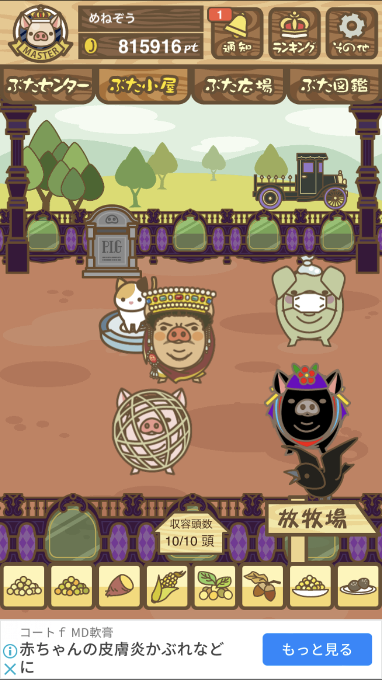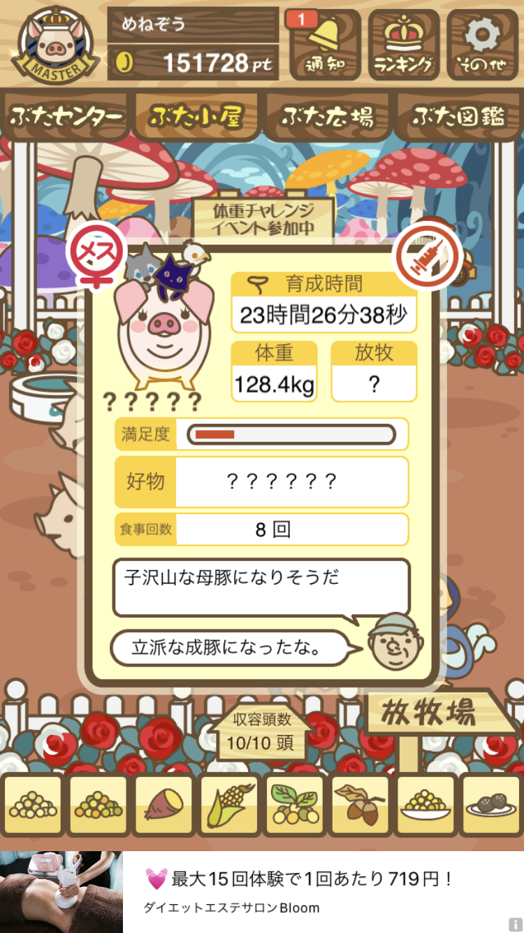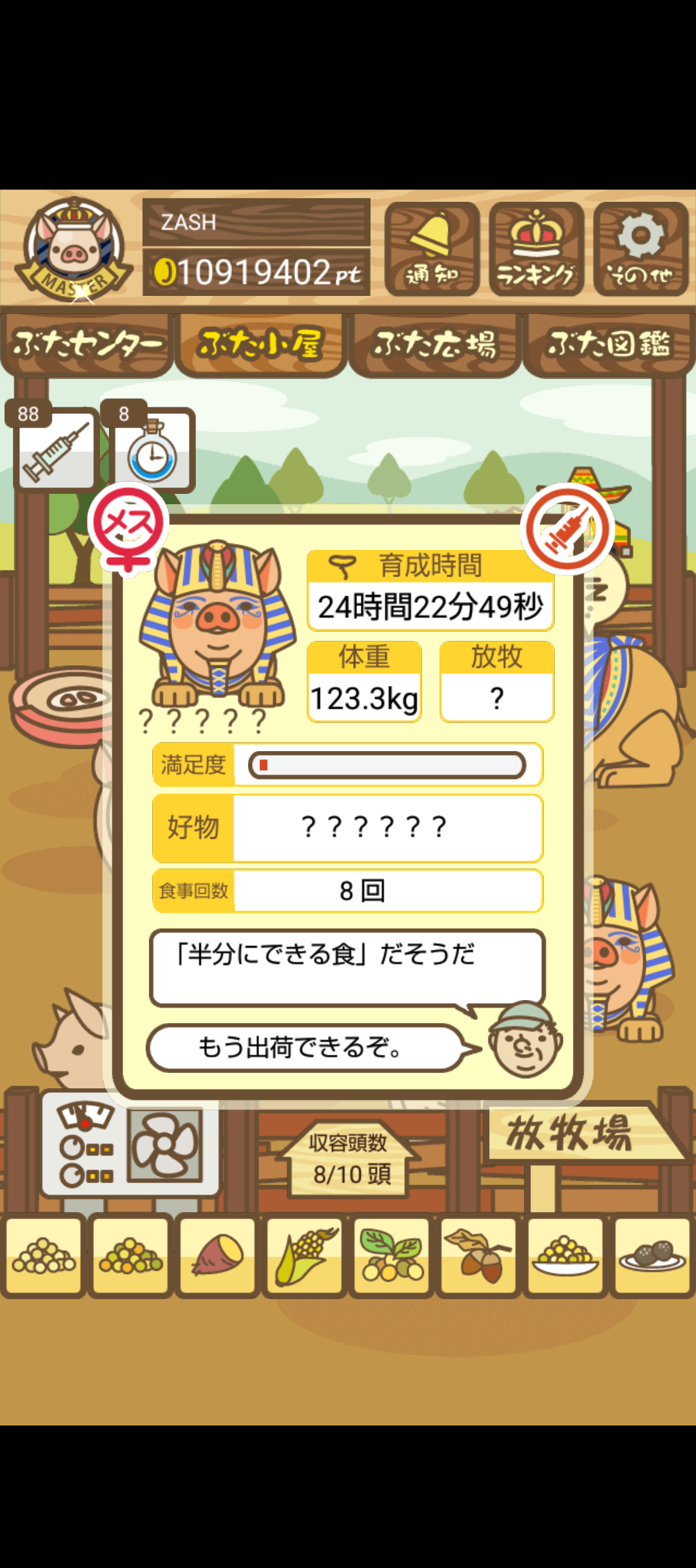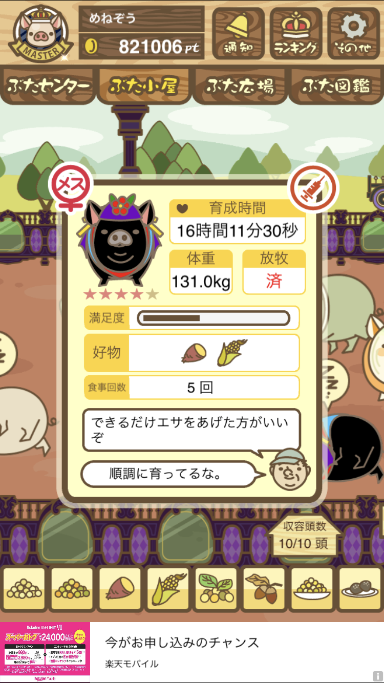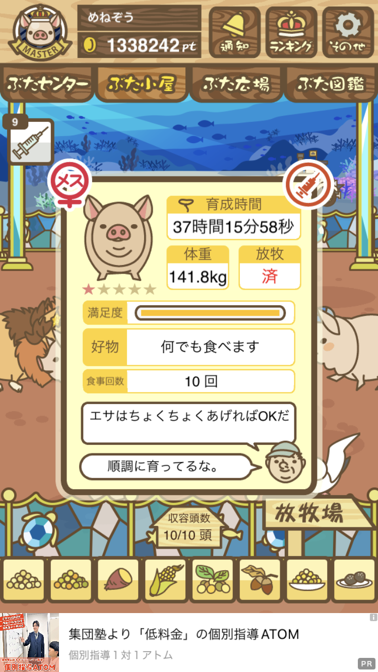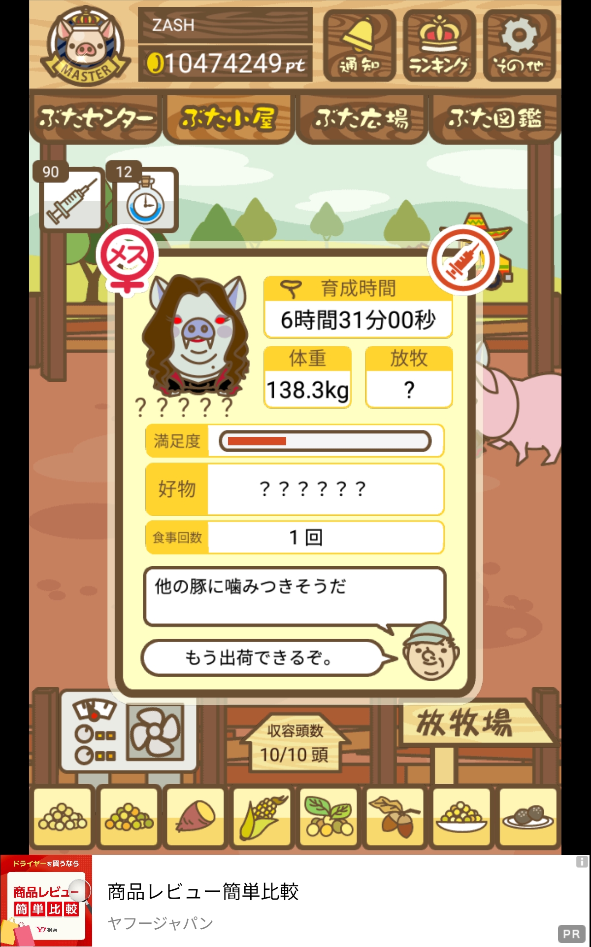 - また、エイブゥ....エサ雑穀16回、エサやりの度に放牧場行き来、16回エサやり後他の豚を放牧場へ....下の成功例の通り育成したつもりですが、何がダメだったんでしょう?掃除豚も排除しないといけないのでしょうか?