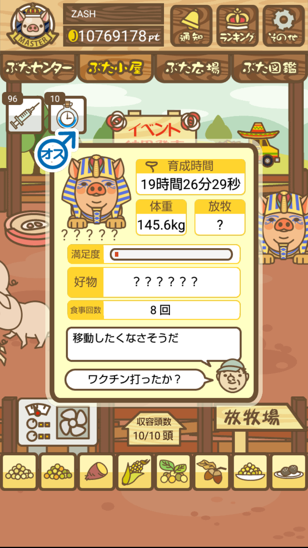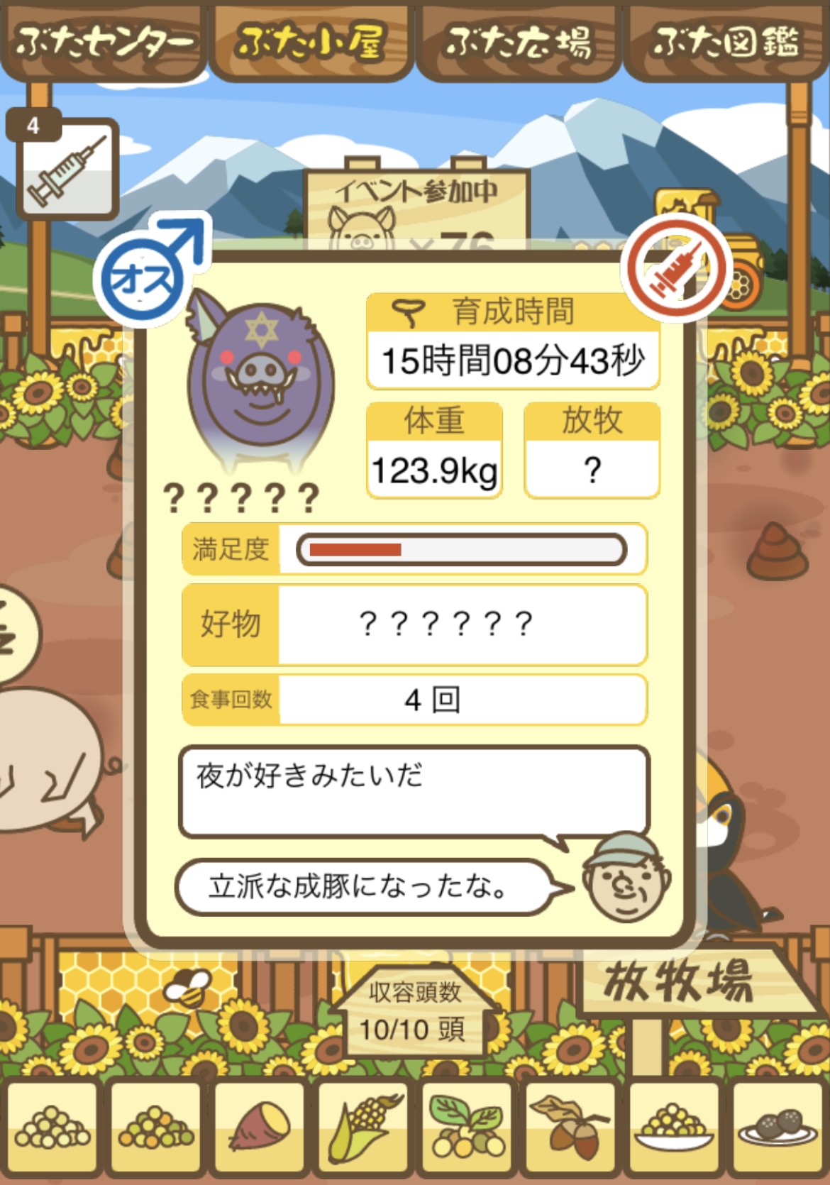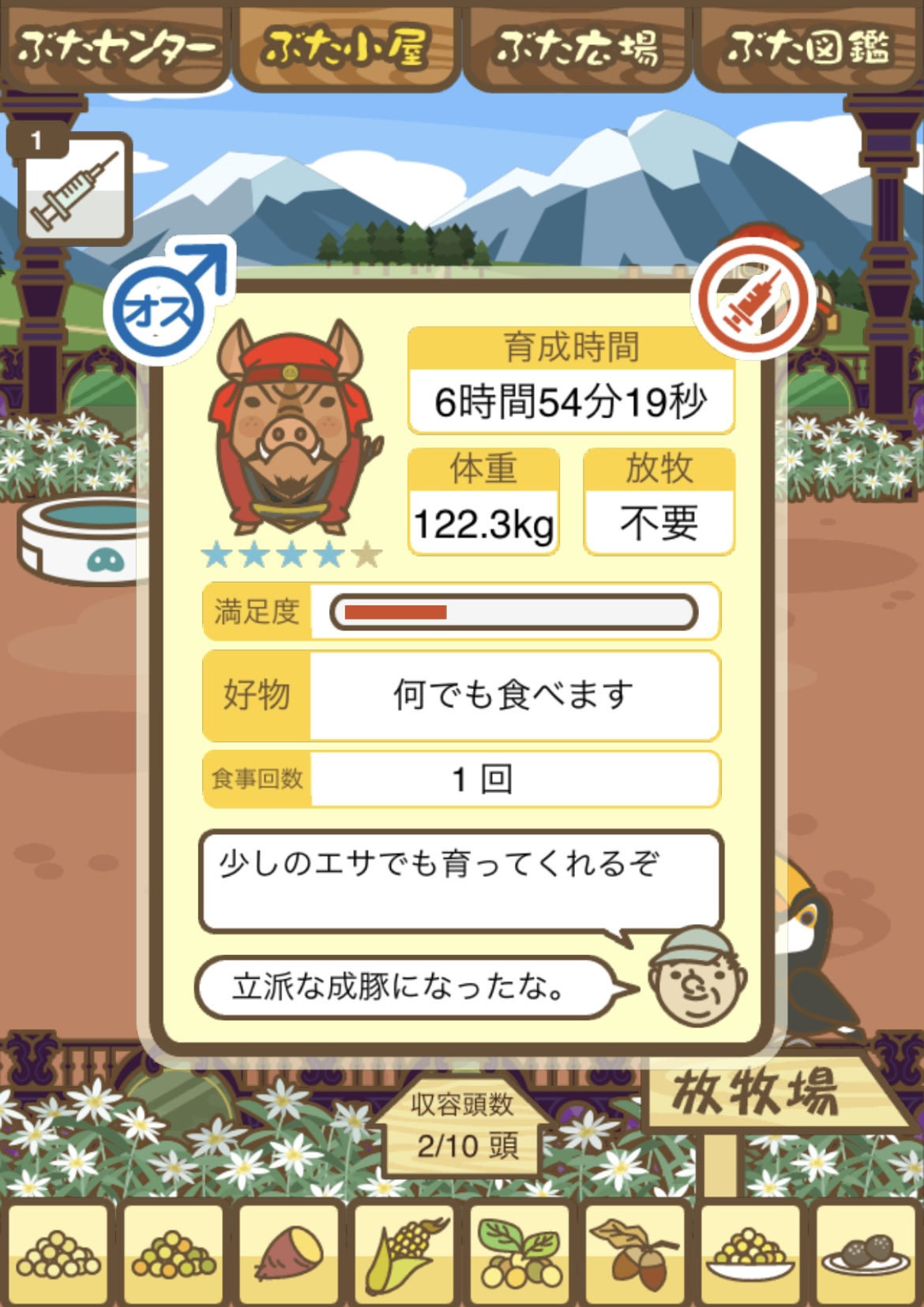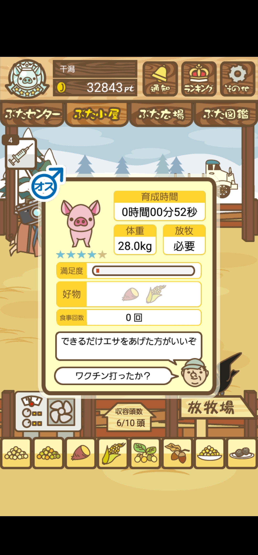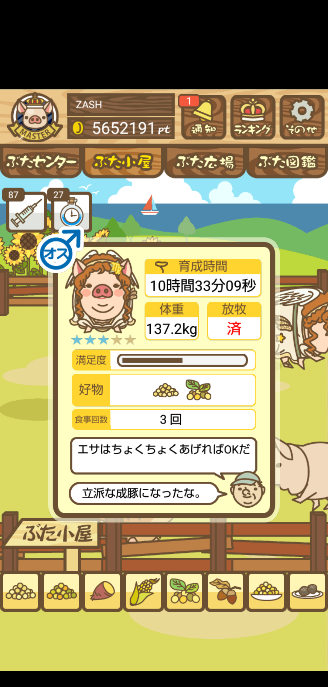- また、エイブゥ....エサ雑穀16回、エサやりの度に放牧場行き来、16回エサやり後他の豚を放牧場へ....下の成功例の通り育成したつもりですが、何がダメだったんでしょう?掃除豚も排除しないといけないのでしょうか?