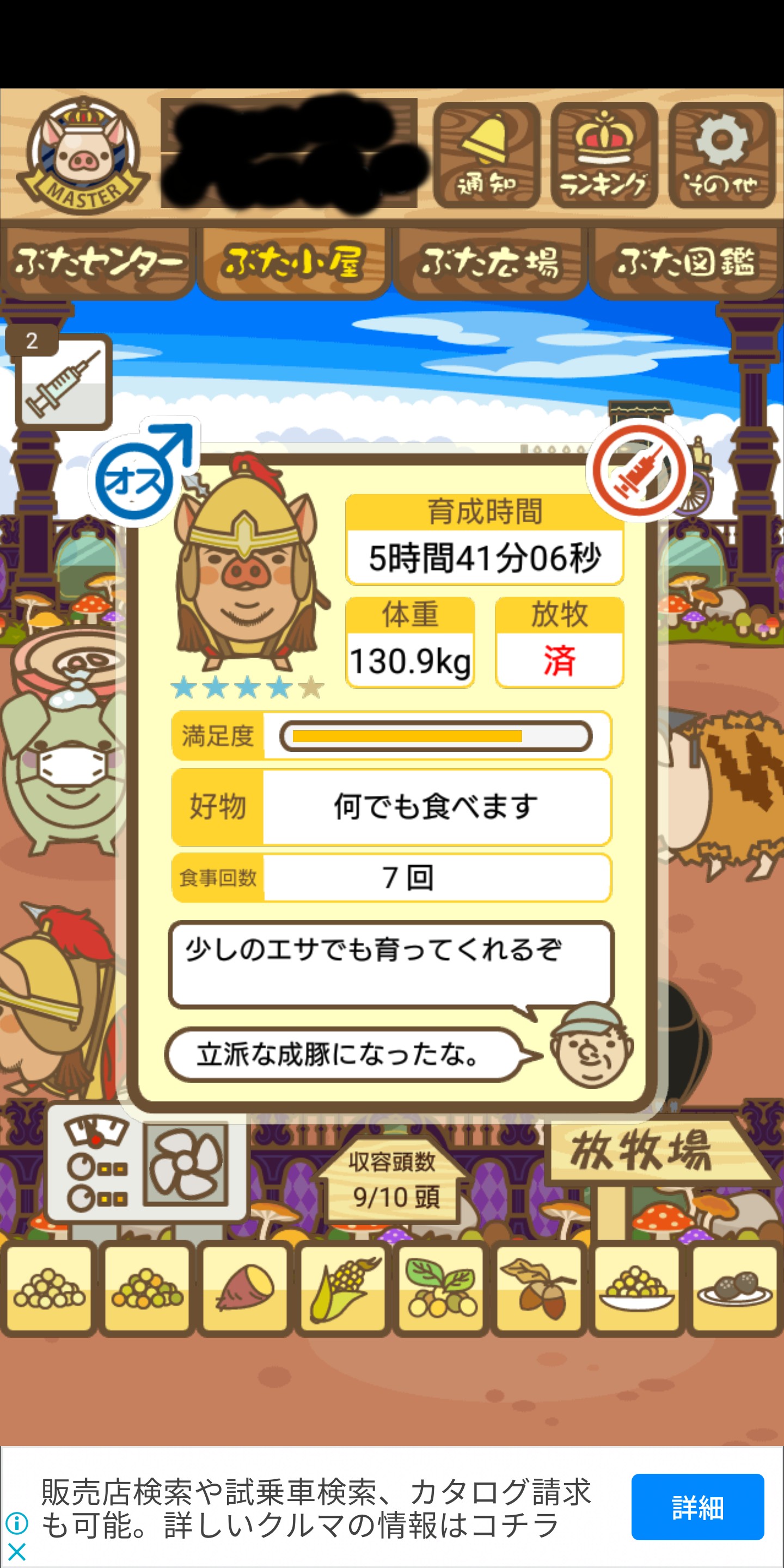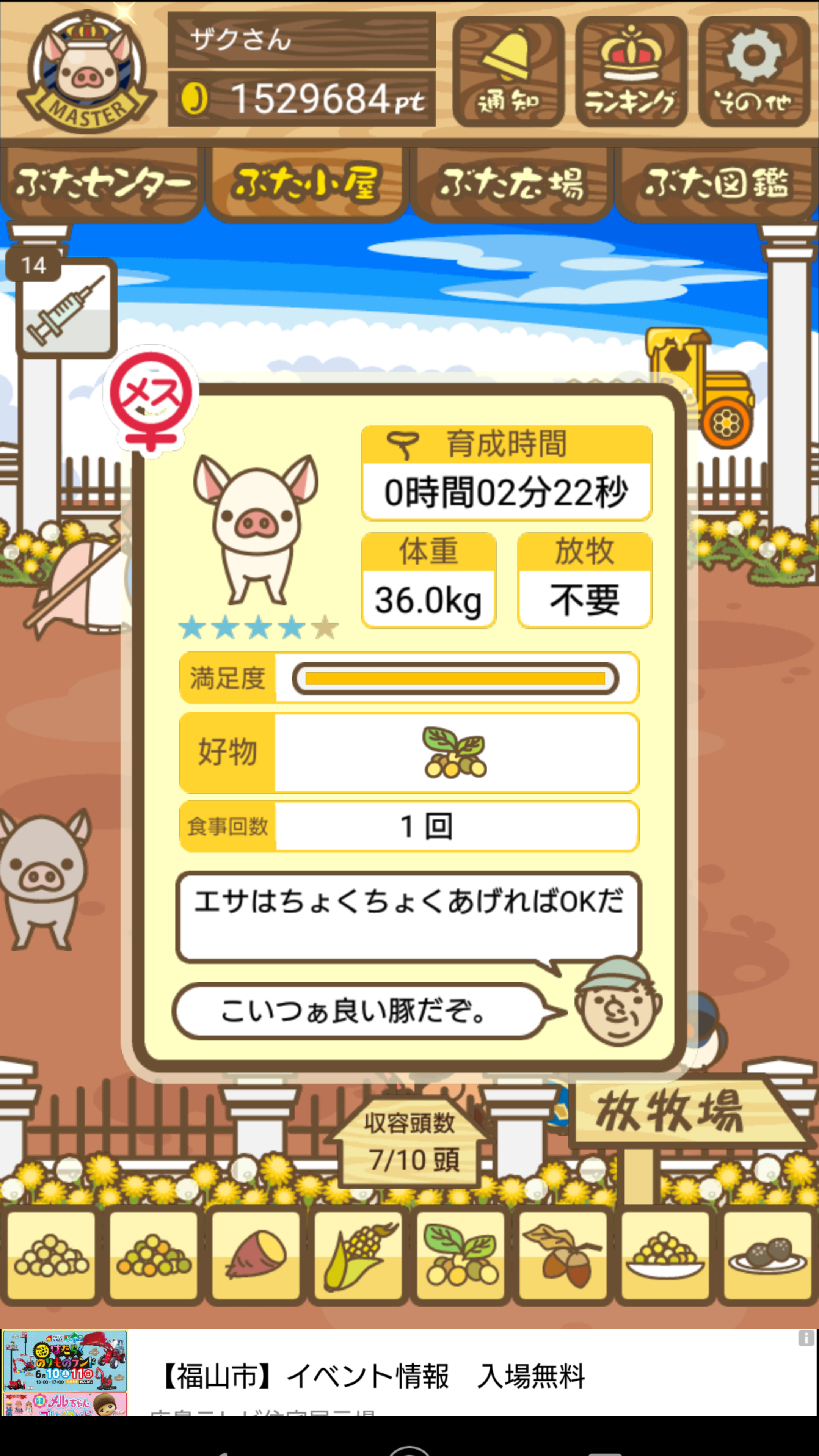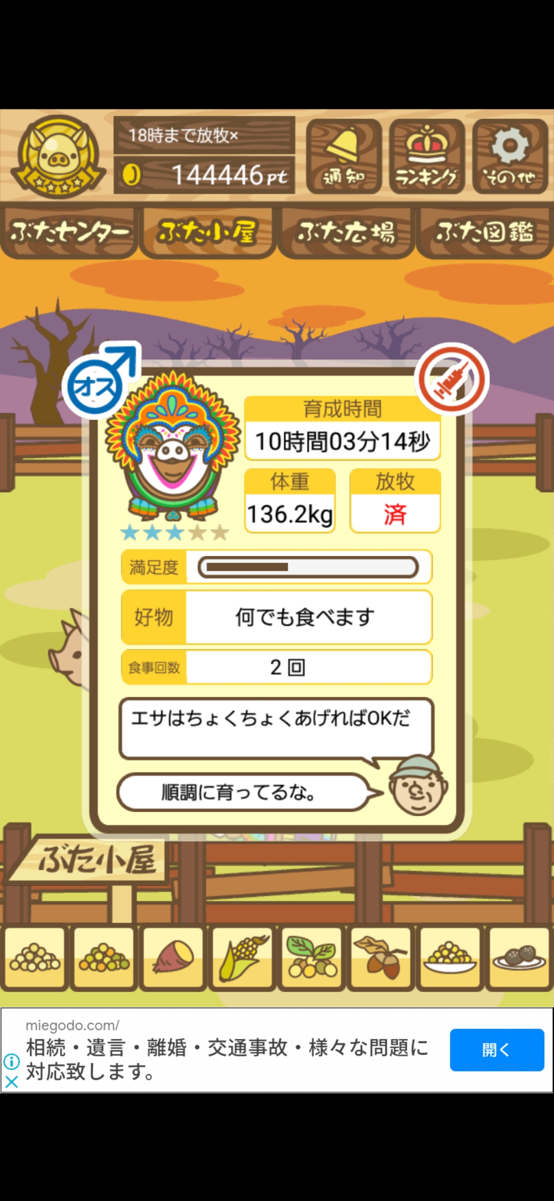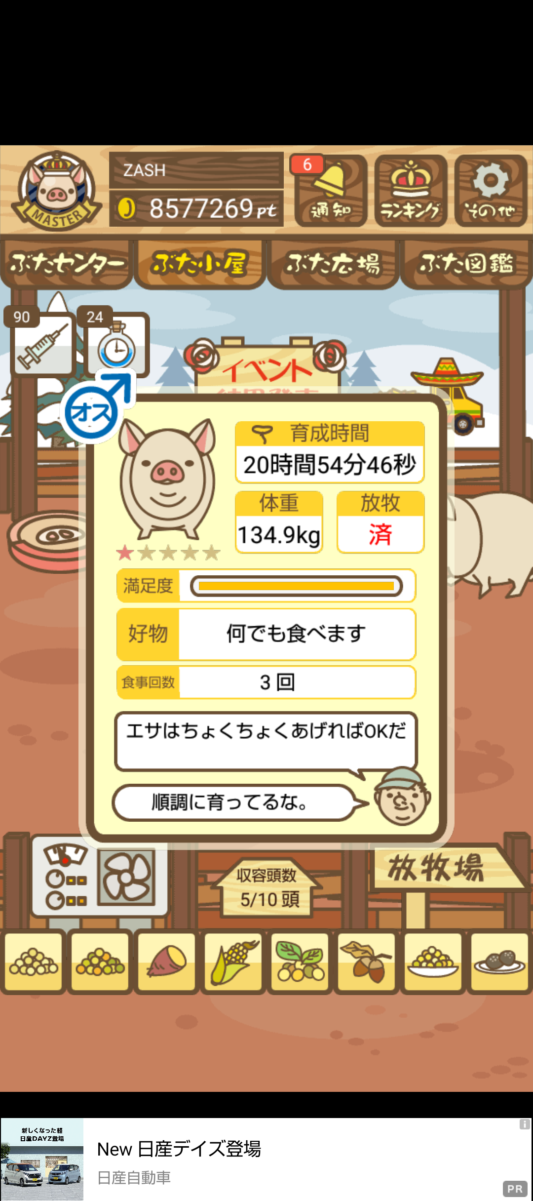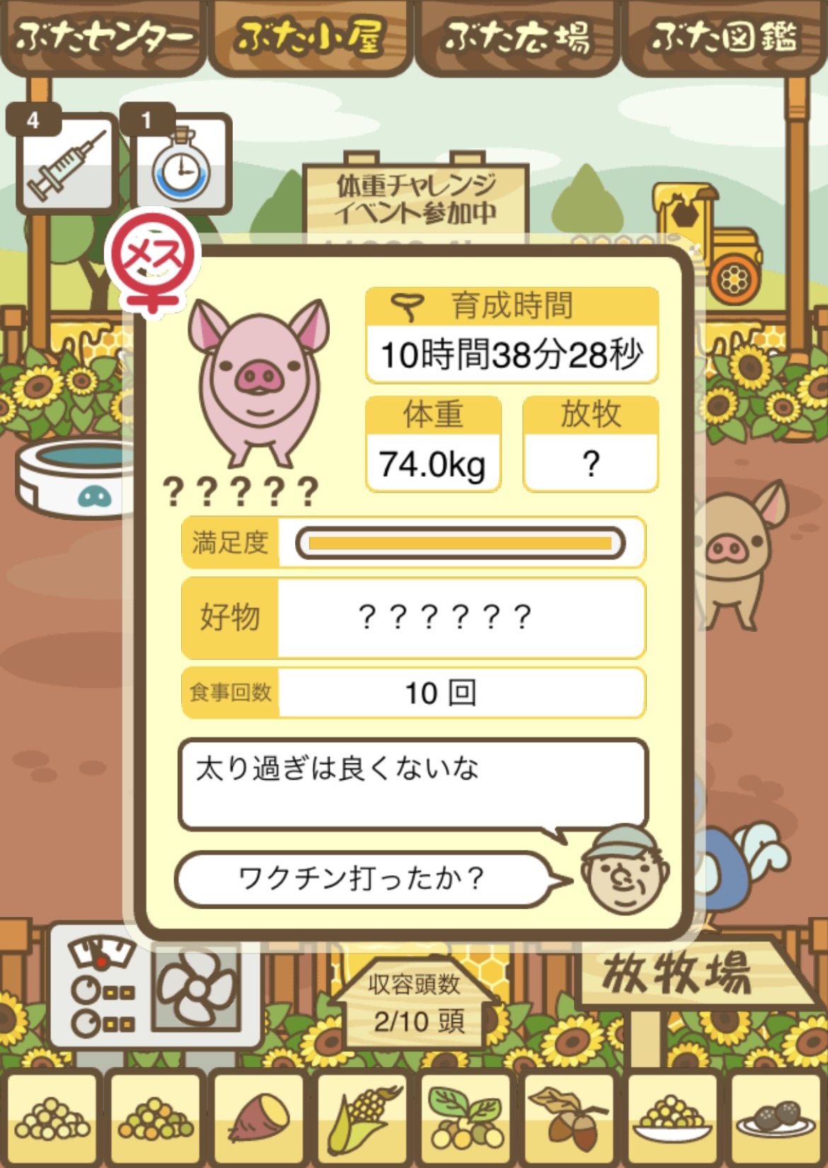 - また、エイブゥ....エサ雑穀16回、エサやりの度に放牧場行き来、16回エサやり後他の豚を放牧場へ....下の成功例の通り育成したつもりですが、何がダメだったんでしょう?掃除豚も排除しないといけないのでしょうか?
