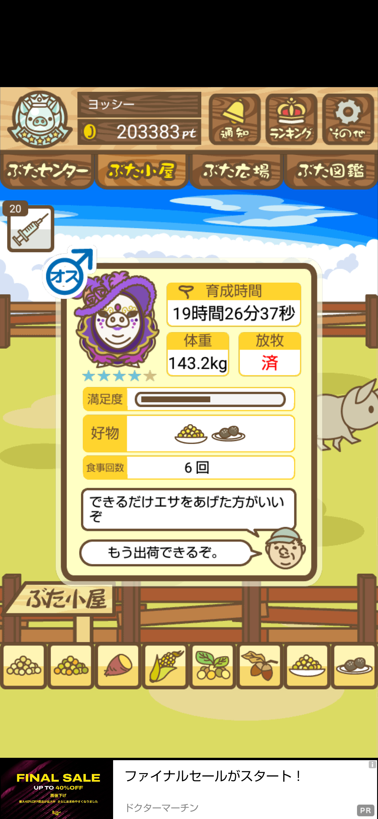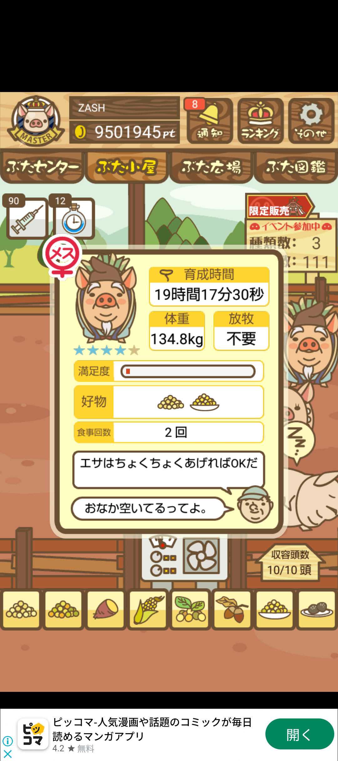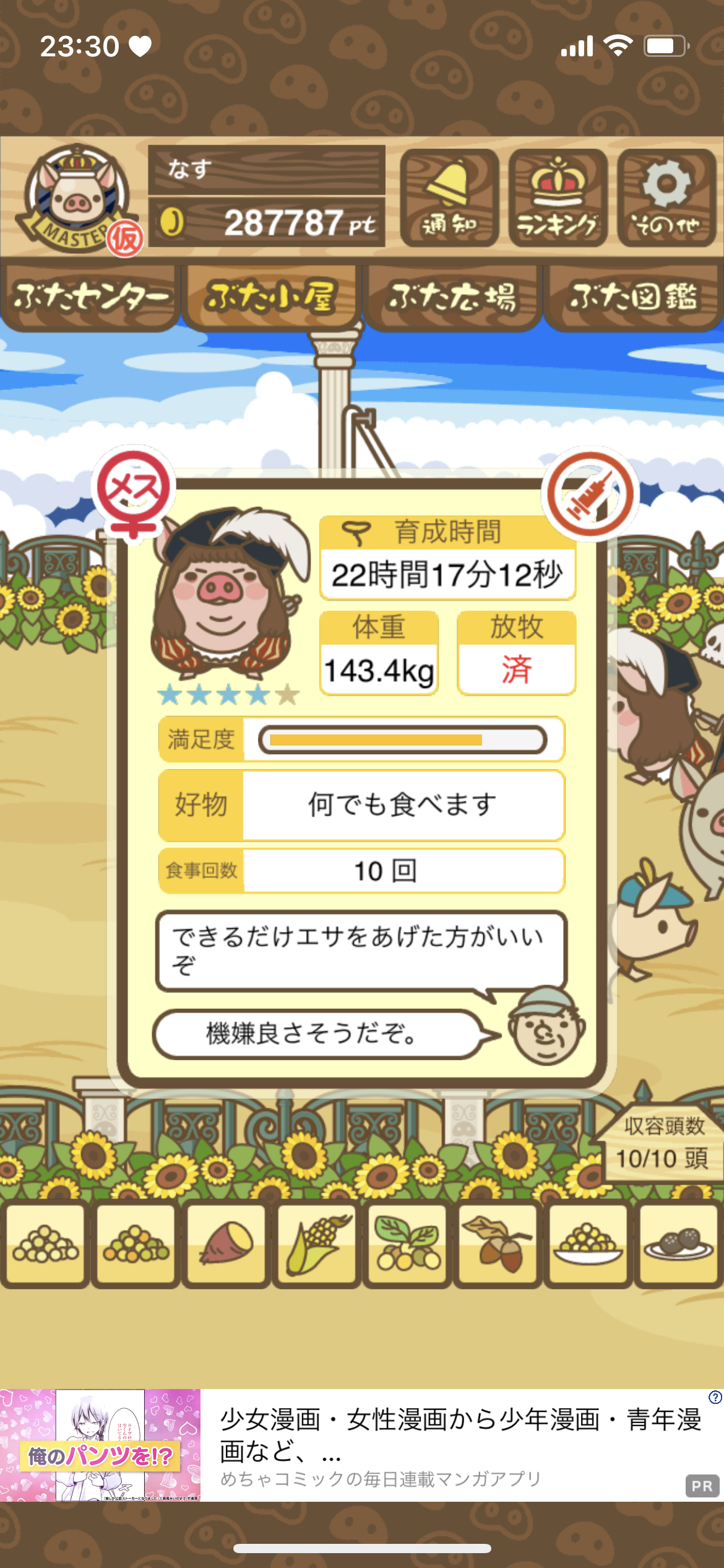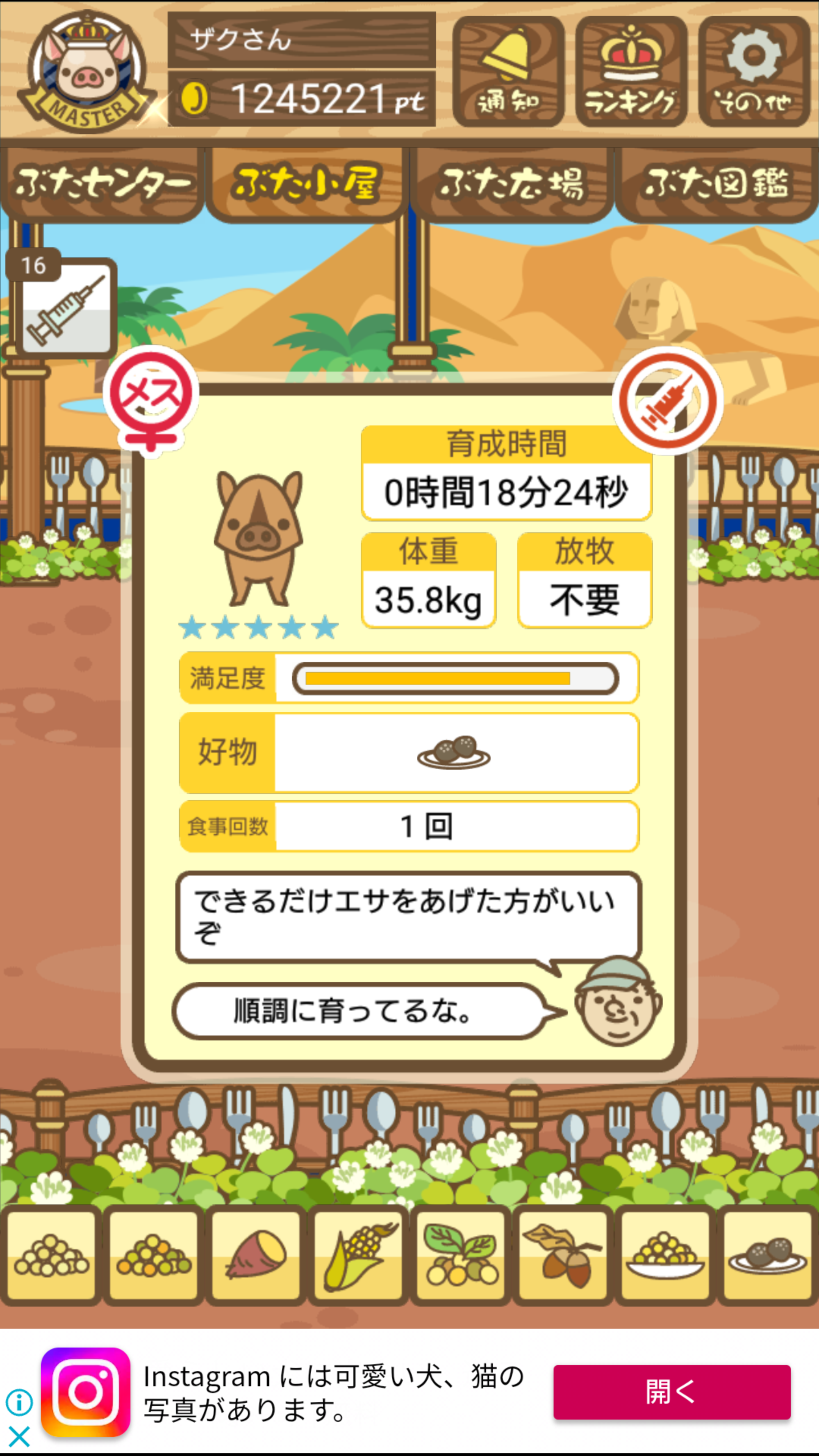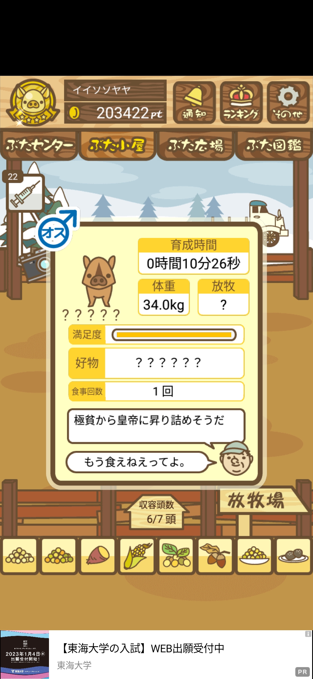 - また、エイブゥ....エサ雑穀16回、エサやりの度に放牧場行き来、16回エサやり後他の豚を放牧場へ....下の成功例の通り育成したつもりですが、何がダメだったんでしょう?掃除豚も排除しないといけないのでしょうか?