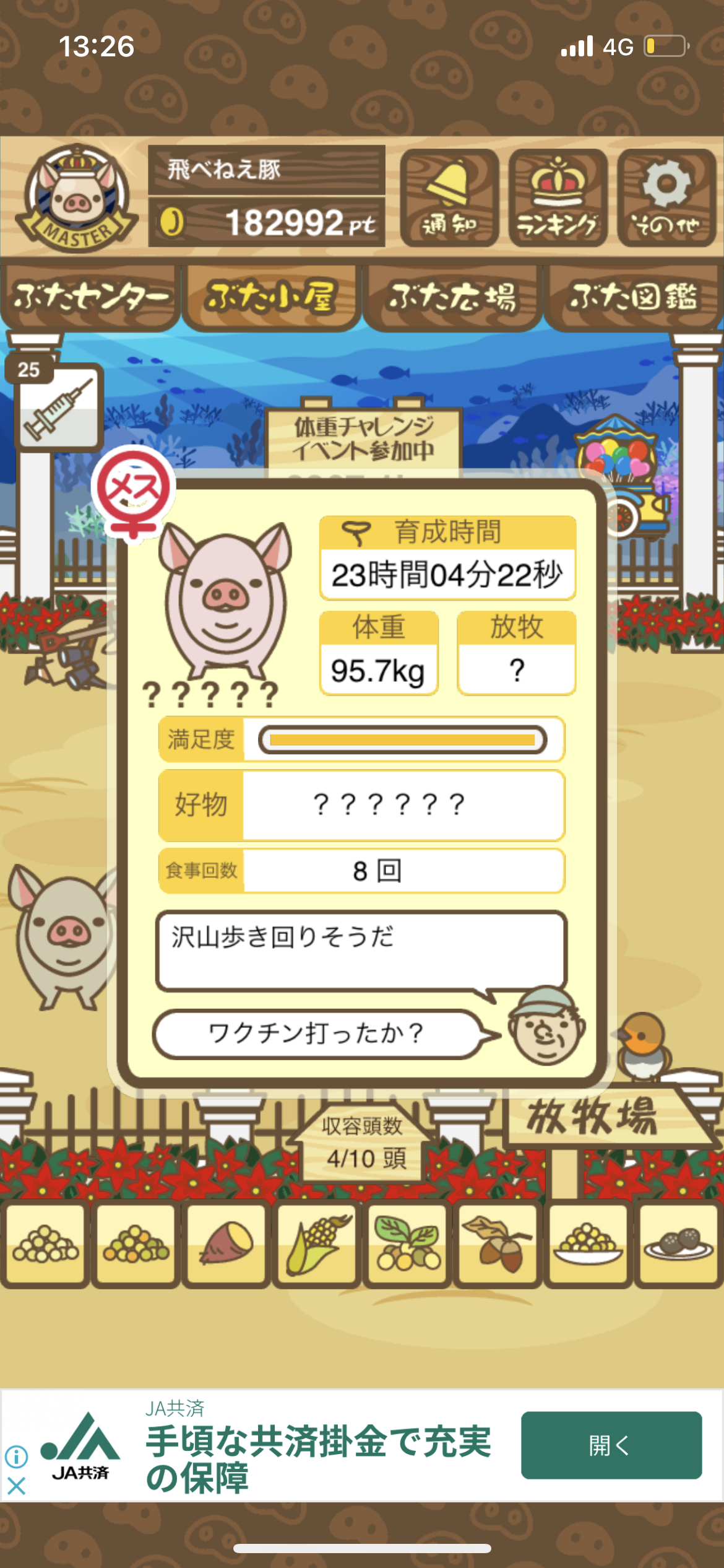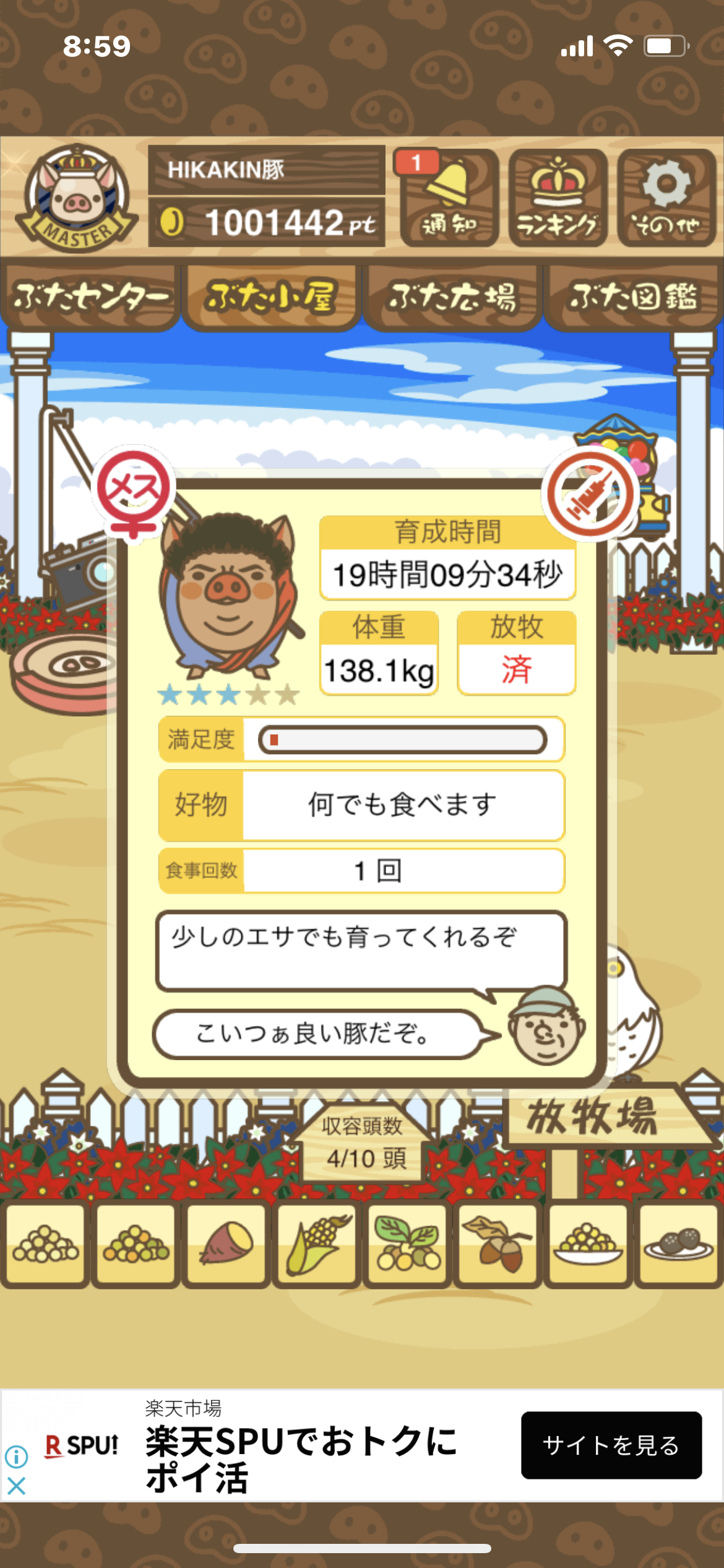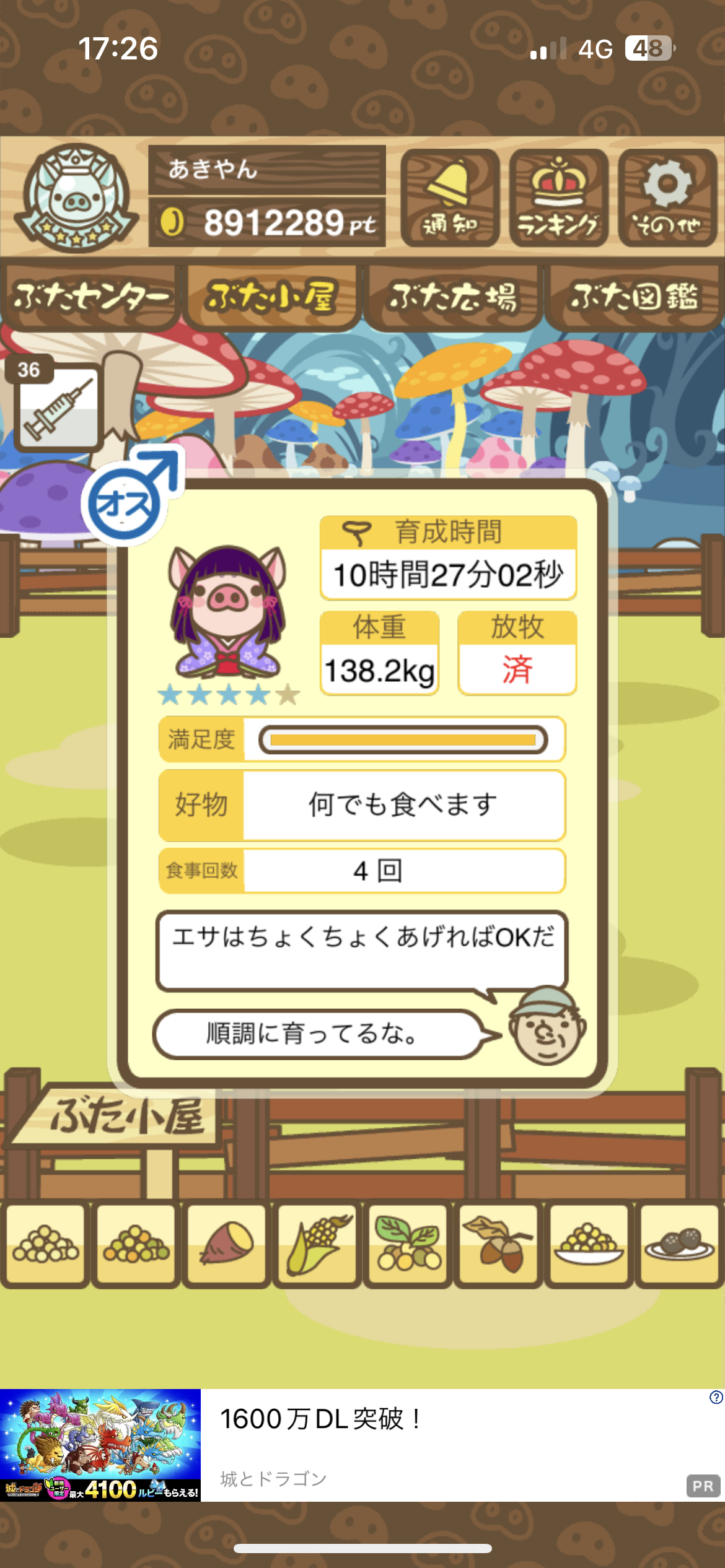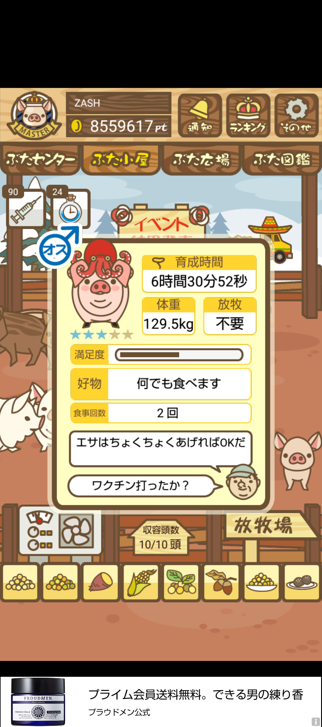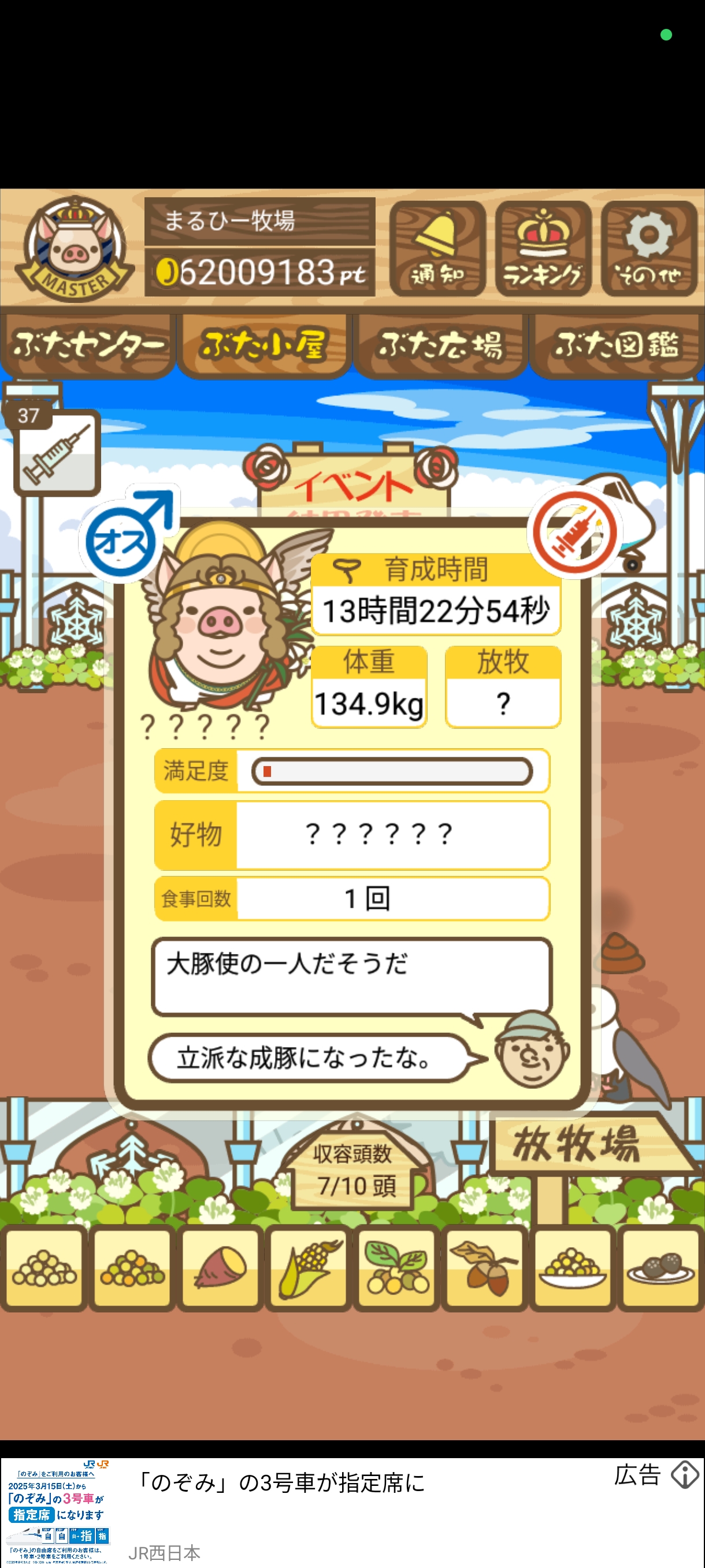 - また、エイブゥ....エサ雑穀16回、エサやりの度に放牧場行き来、16回エサやり後他の豚を放牧場へ....下の成功例の通り育成したつもりですが、何がダメだったんでしょう?掃除豚も排除しないといけないのでしょうか?