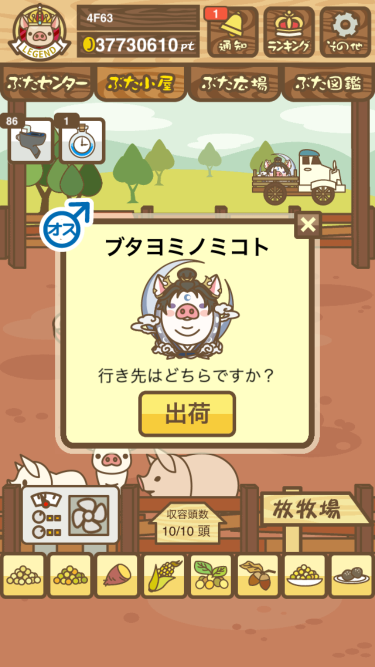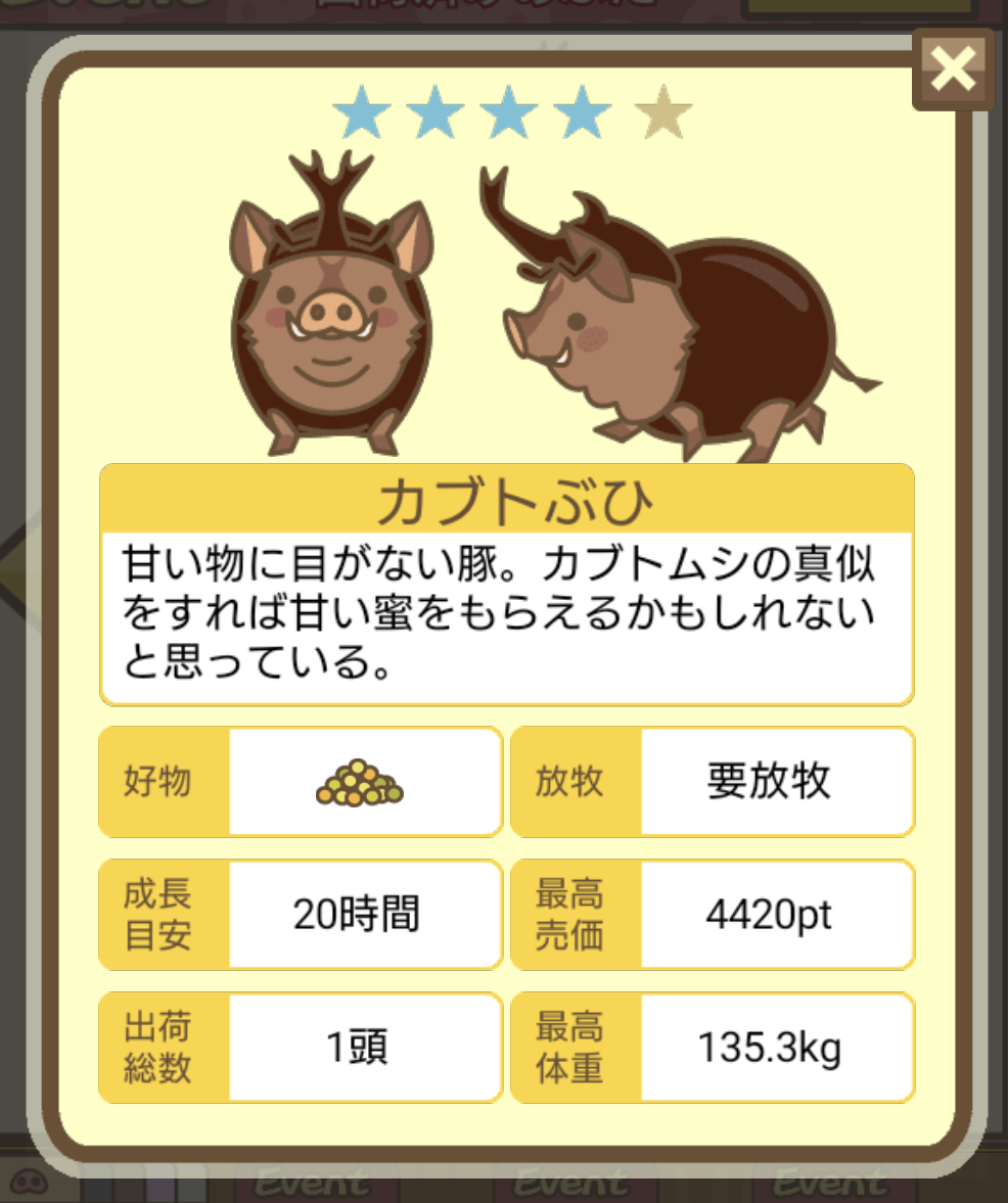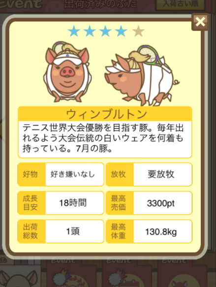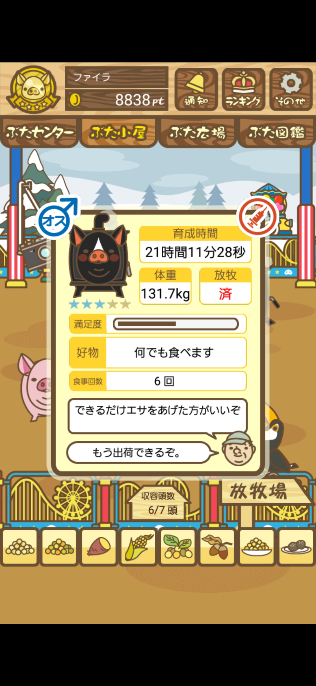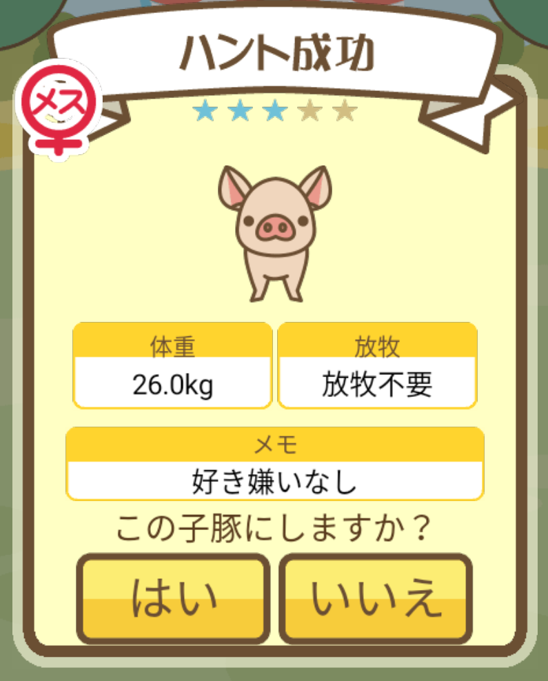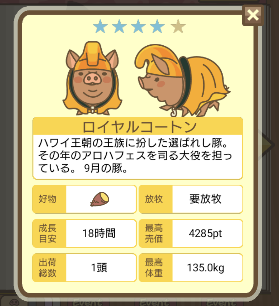 - エサ トリュフ16回、エサをあげるたびに小屋と放牧場移動、成豚時に他の豚(4頭)を放牧場に移動 で成功しました!!2回目の挑戦です!