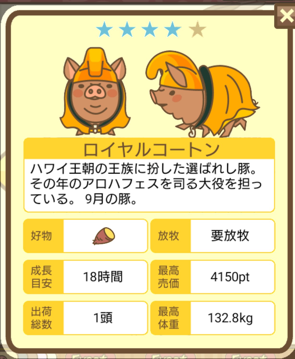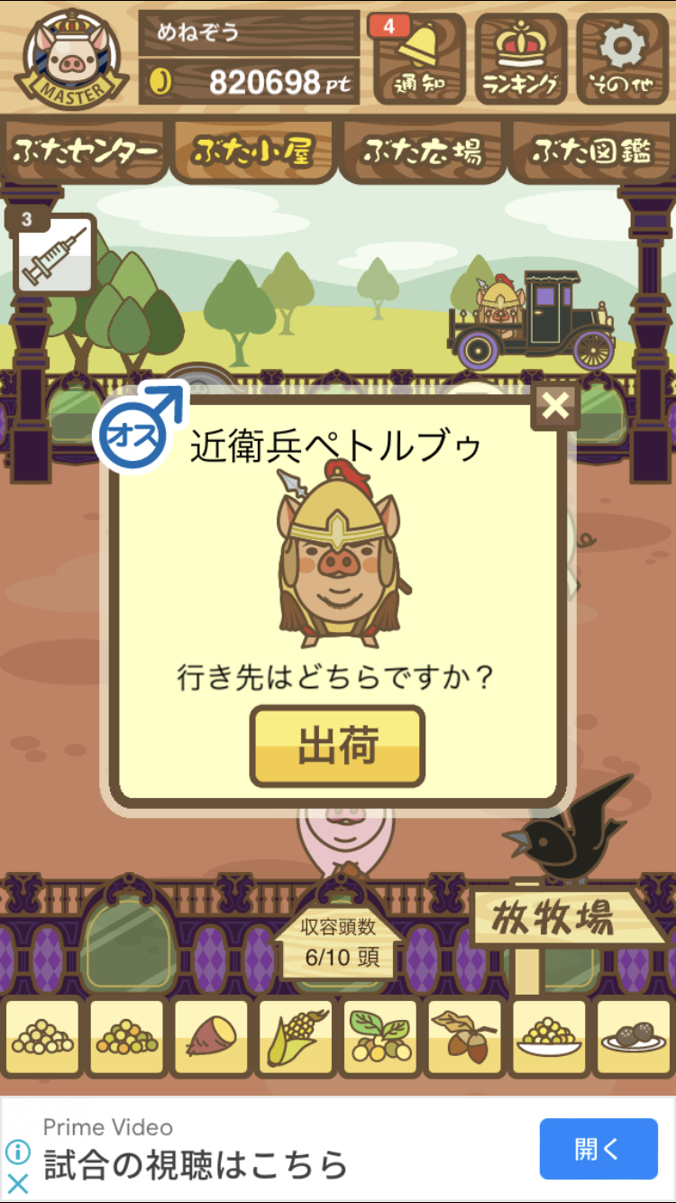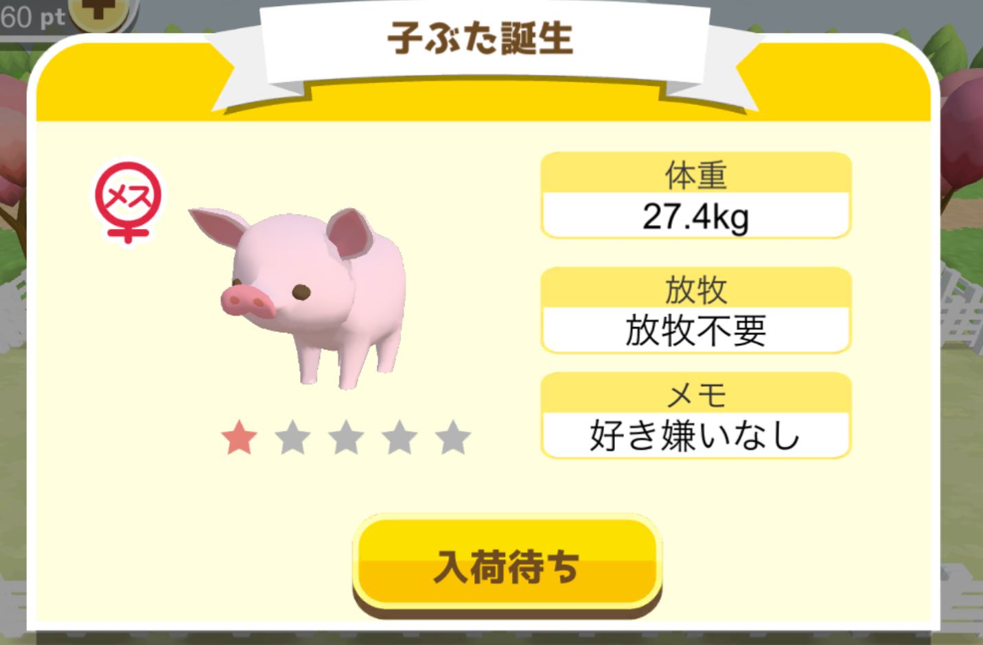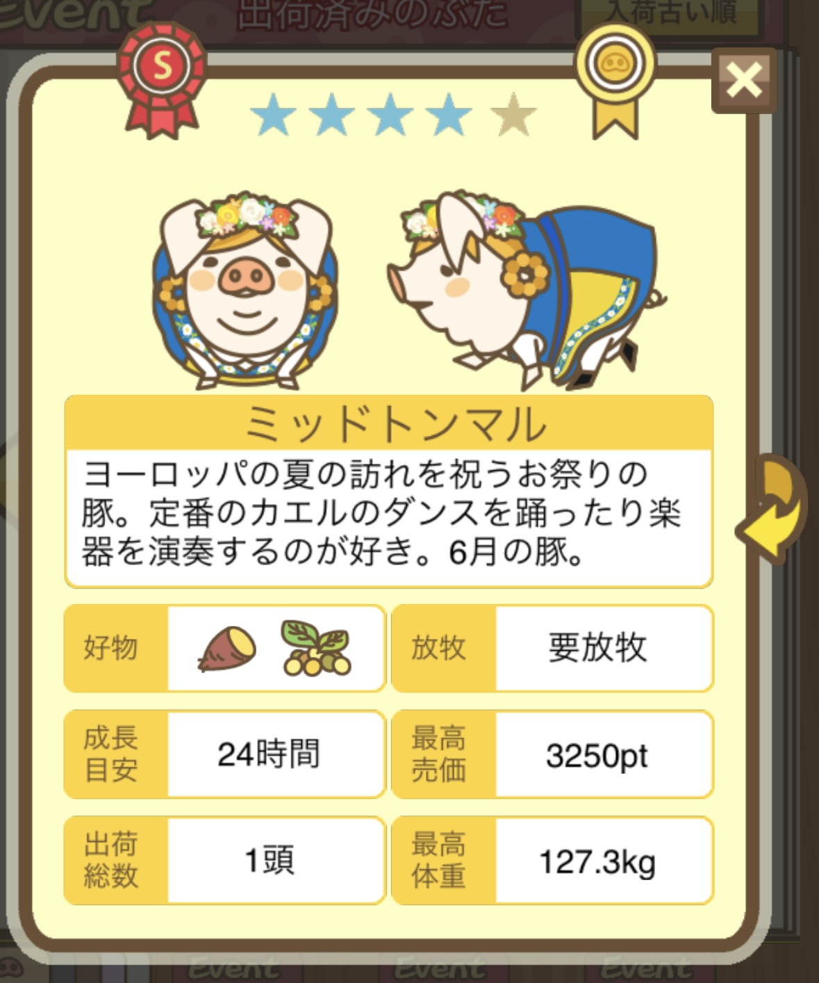 - エサ トリュフ16回、エサをあげるたびに小屋と放牧場移動、成豚時に他の豚(4頭)を放牧場に移動 で成功しました!!2回目の挑戦です!