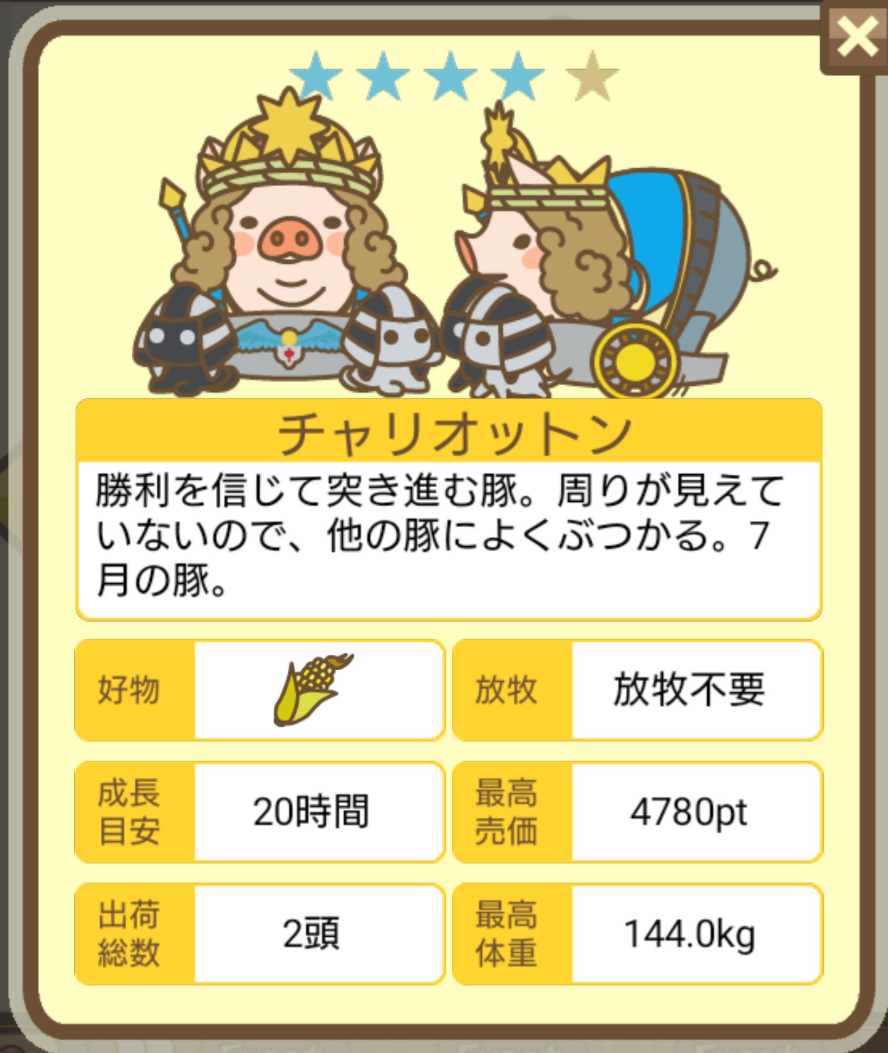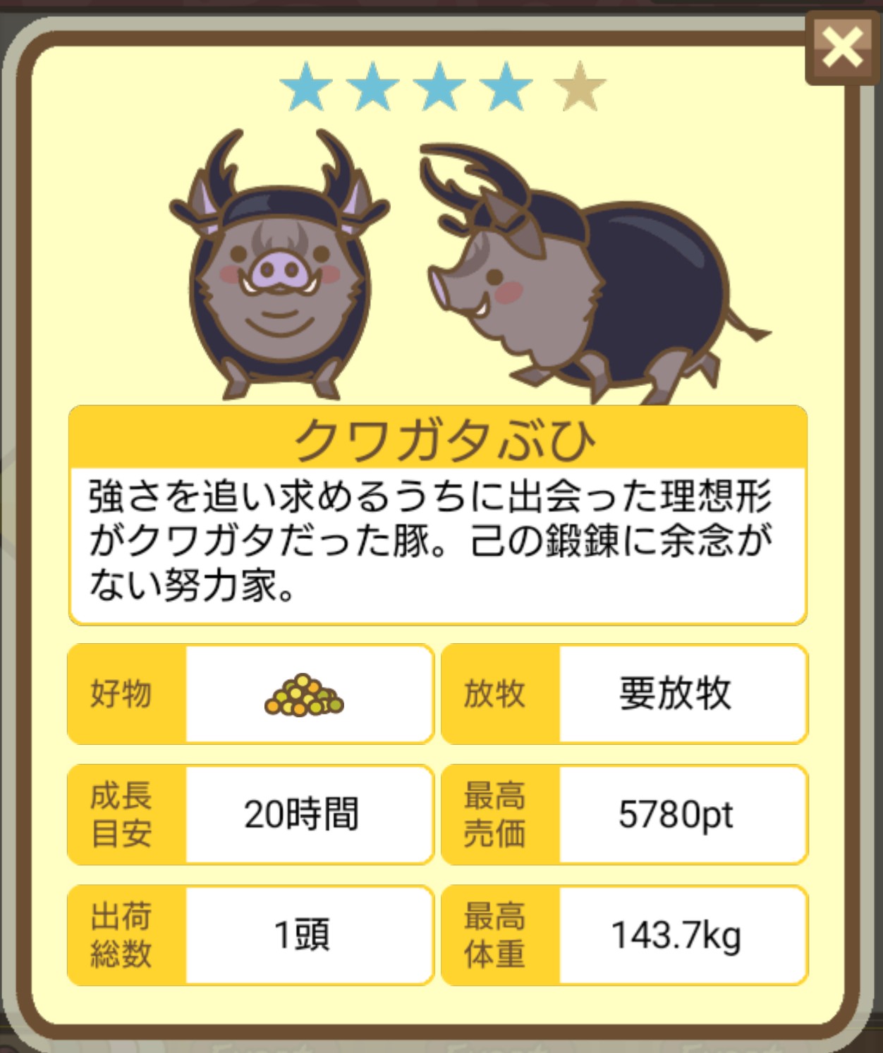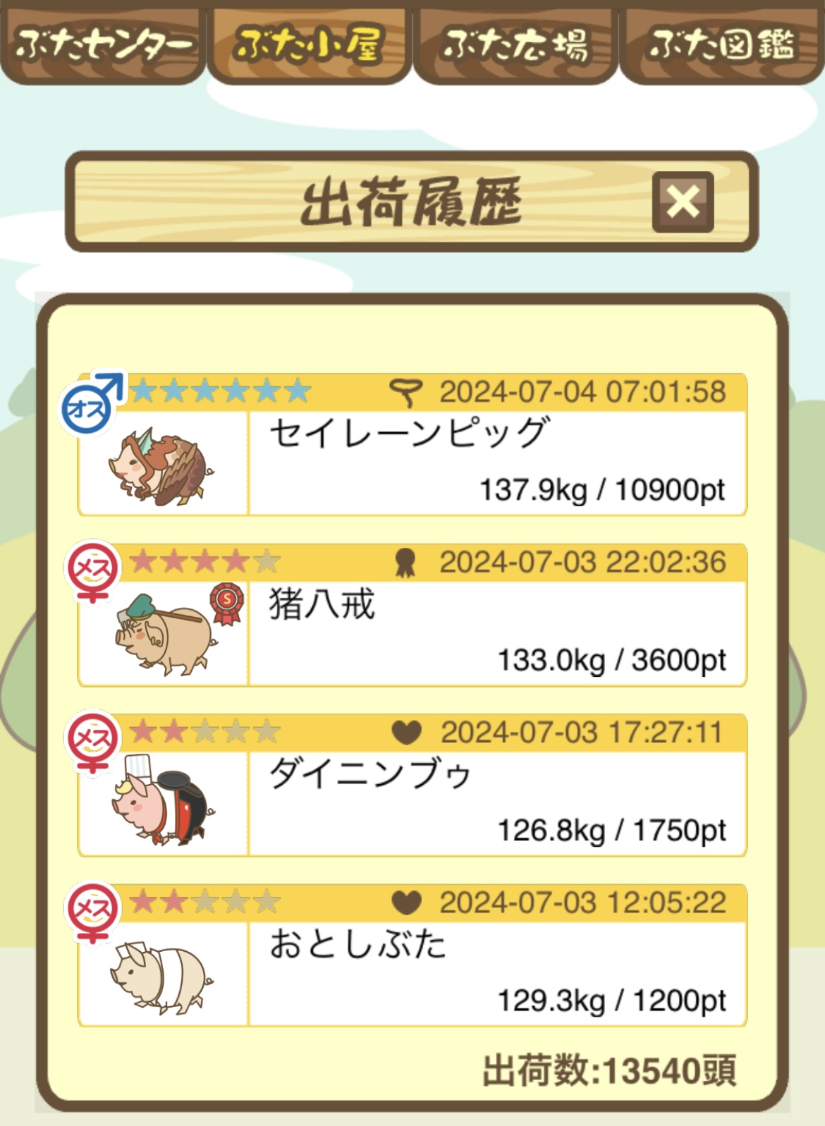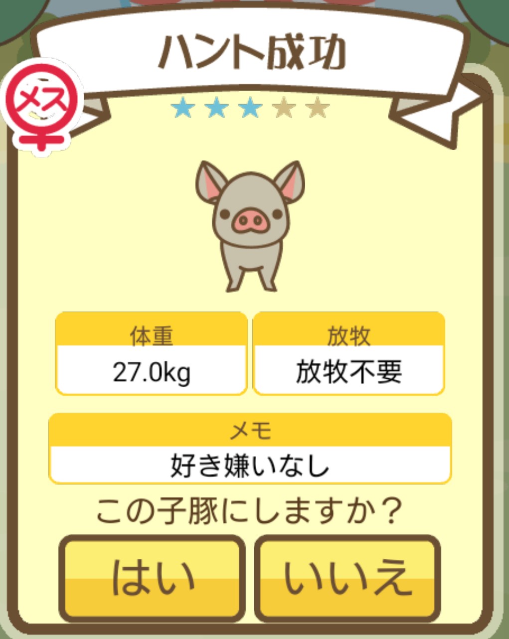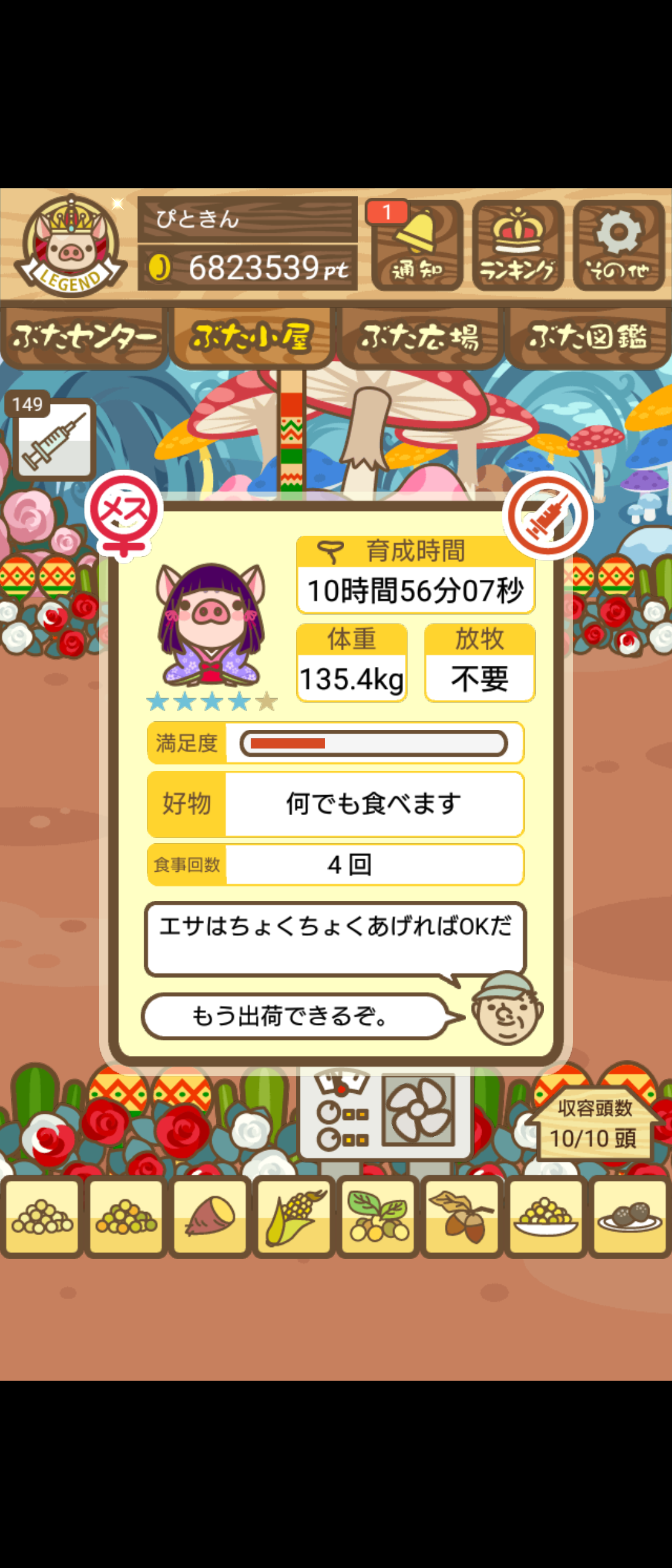 - エサ トリュフ16回、エサをあげるたびに小屋と放牧場移動、成豚時に他の豚(4頭)を放牧場に移動 で成功しました!!2回目の挑戦です!