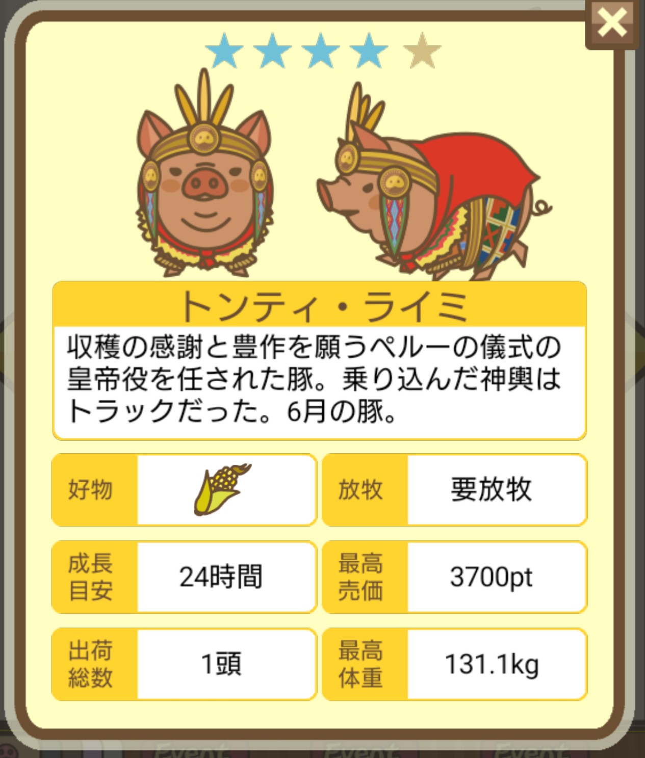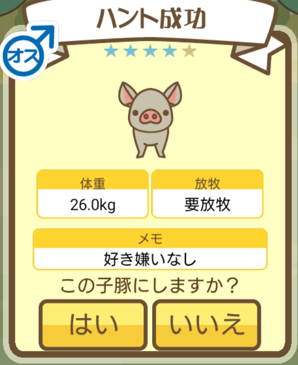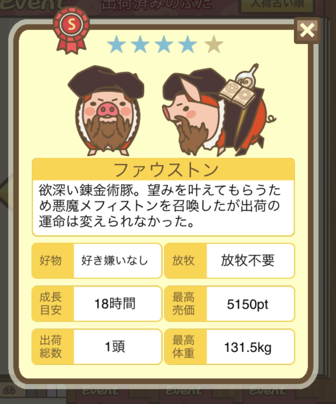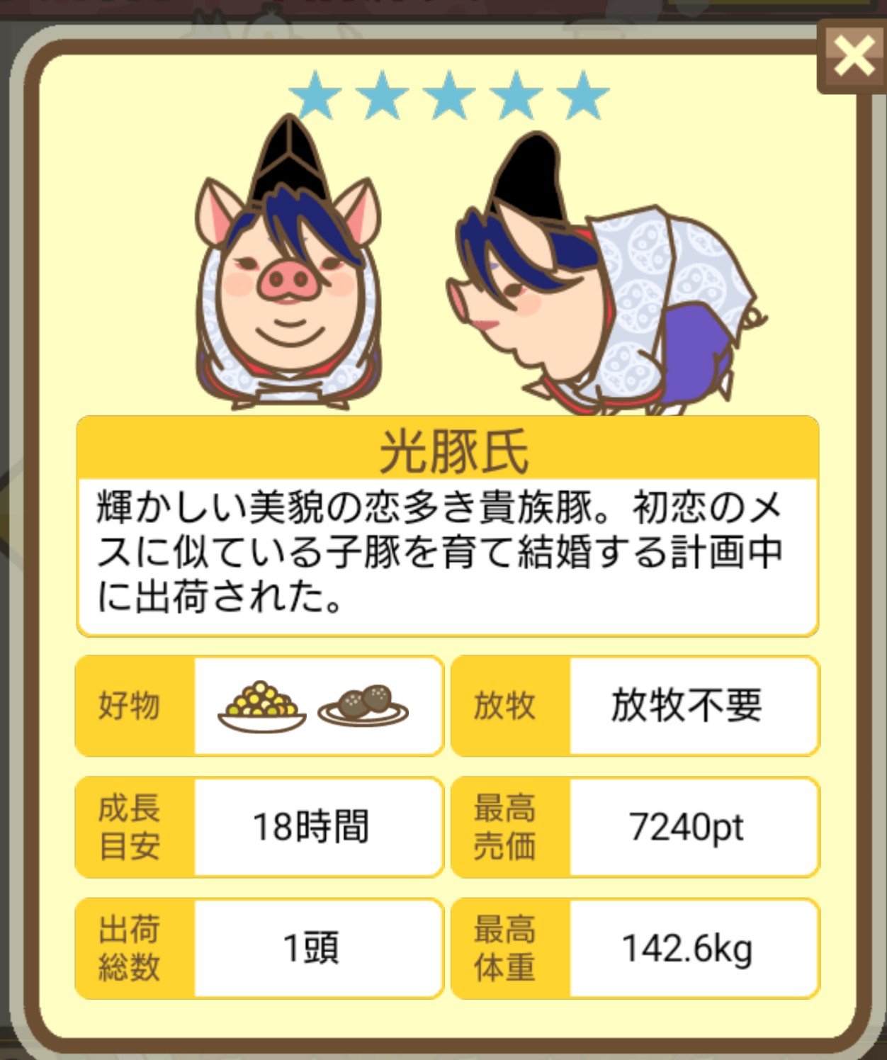 - エサ トリュフ16回、エサをあげるたびに小屋と放牧場移動、成豚時に他の豚(4頭)を放牧場に移動 で成功しました!!2回目の挑戦です!