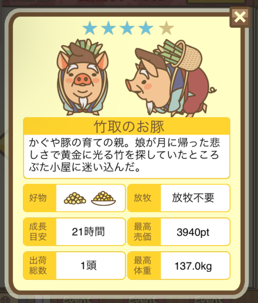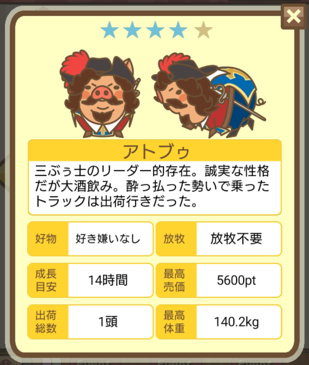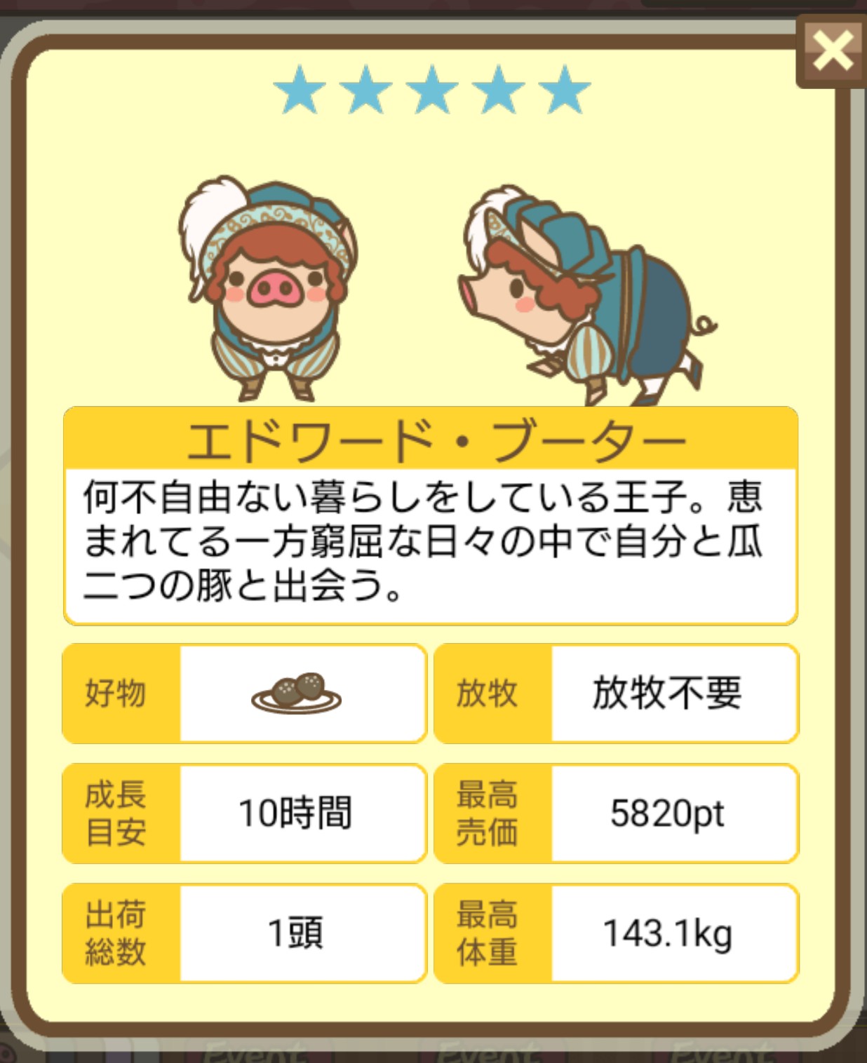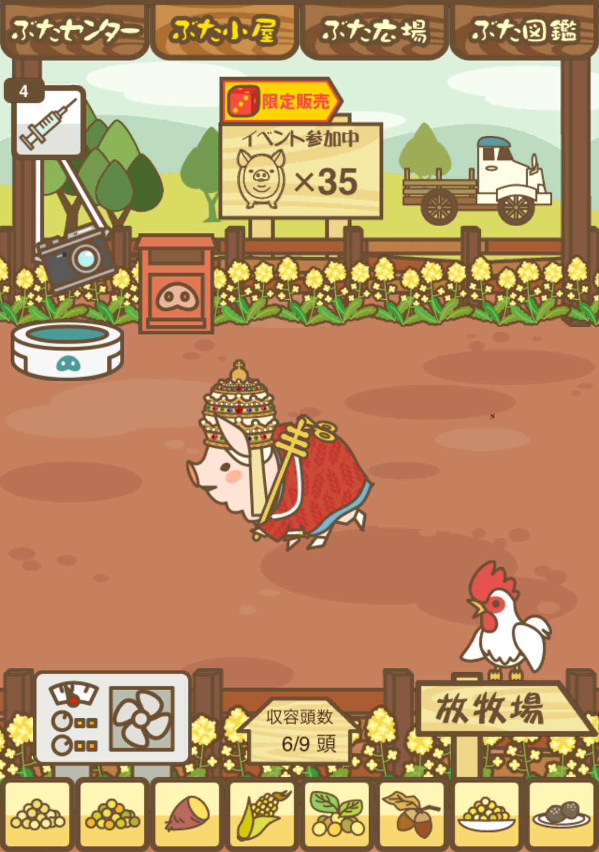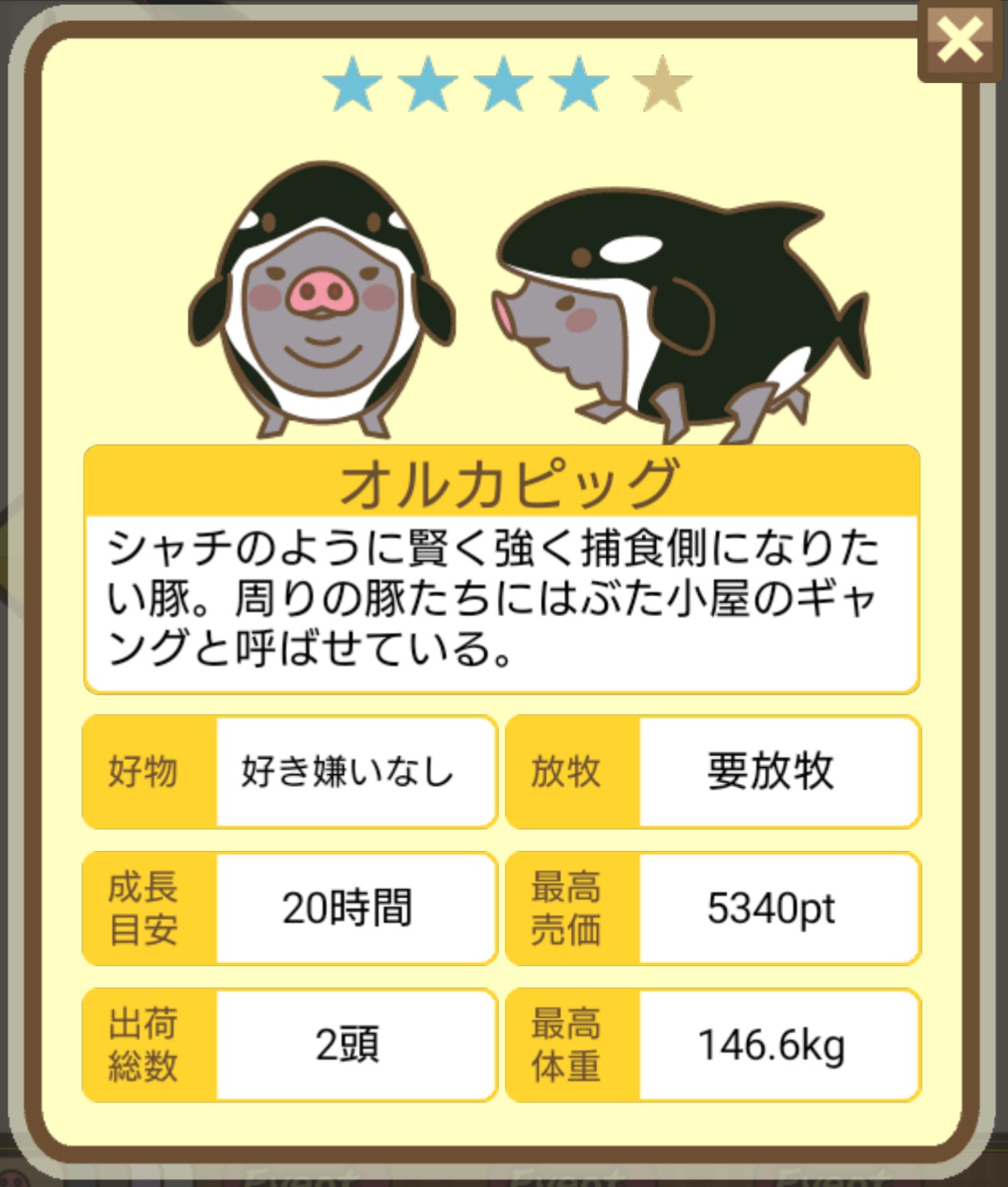 - エサ トリュフ16回、エサをあげるたびに小屋と放牧場移動、成豚時に他の豚(4頭)を放牧場に移動 で成功しました!!2回目の挑戦です!