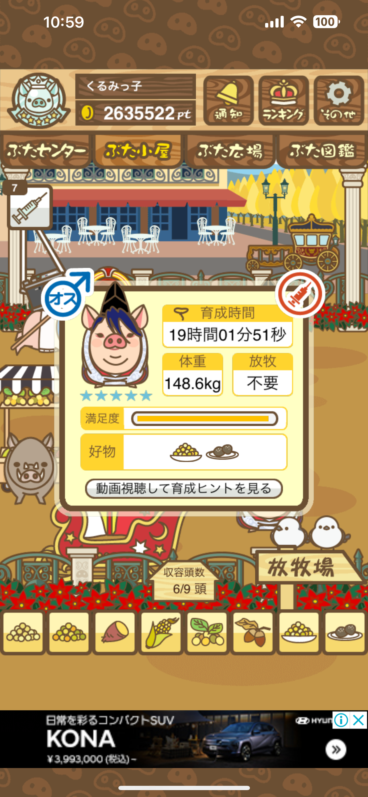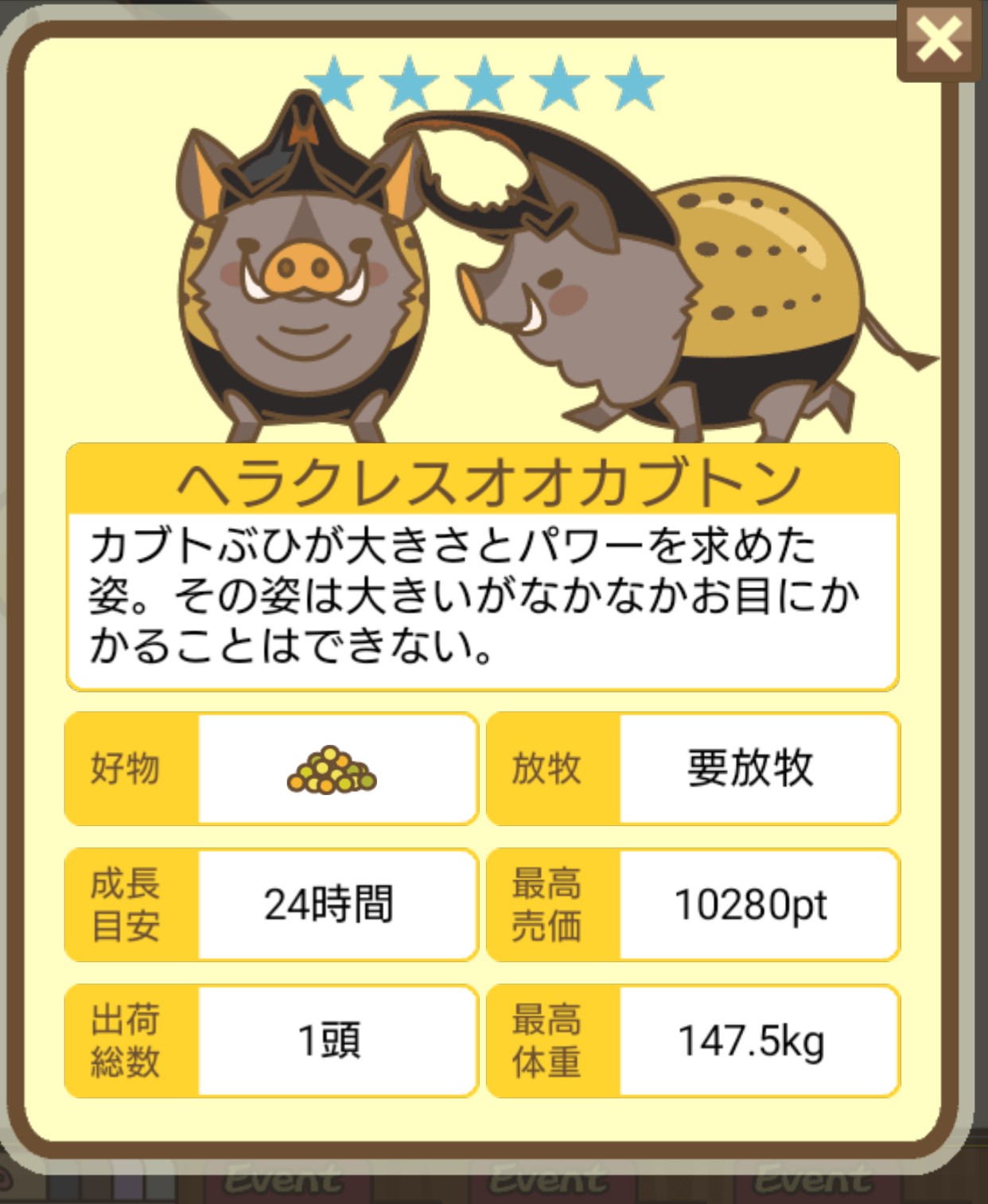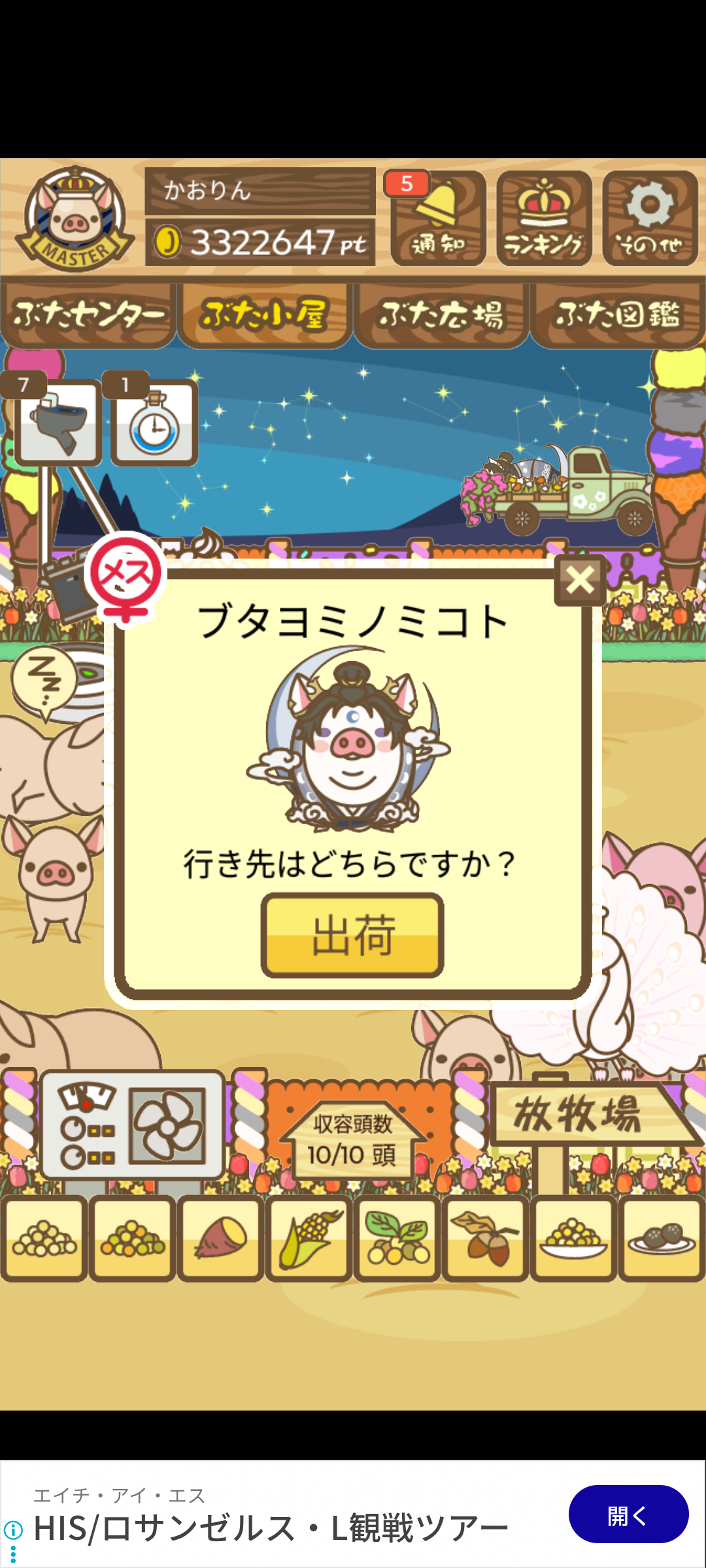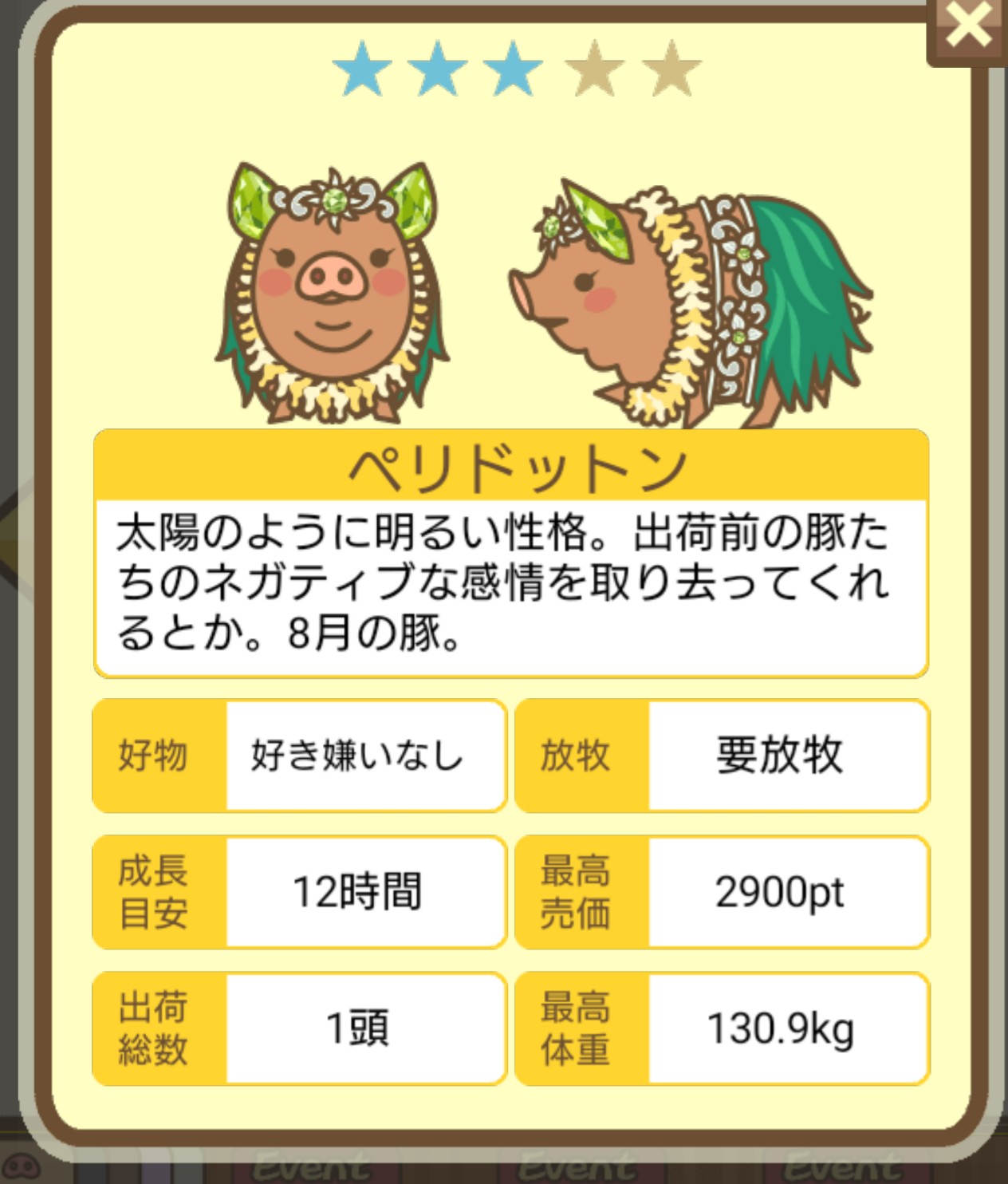 - エサ トリュフ16回、エサをあげるたびに小屋と放牧場移動、成豚時に他の豚(4頭)を放牧場に移動 で成功しました!!2回目の挑戦です!