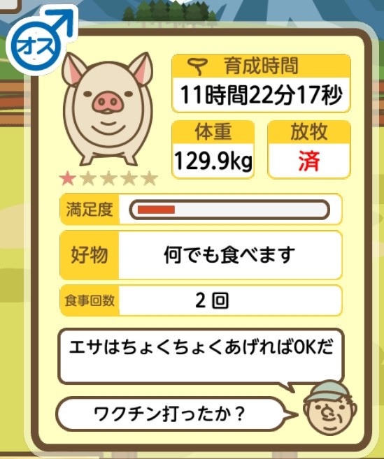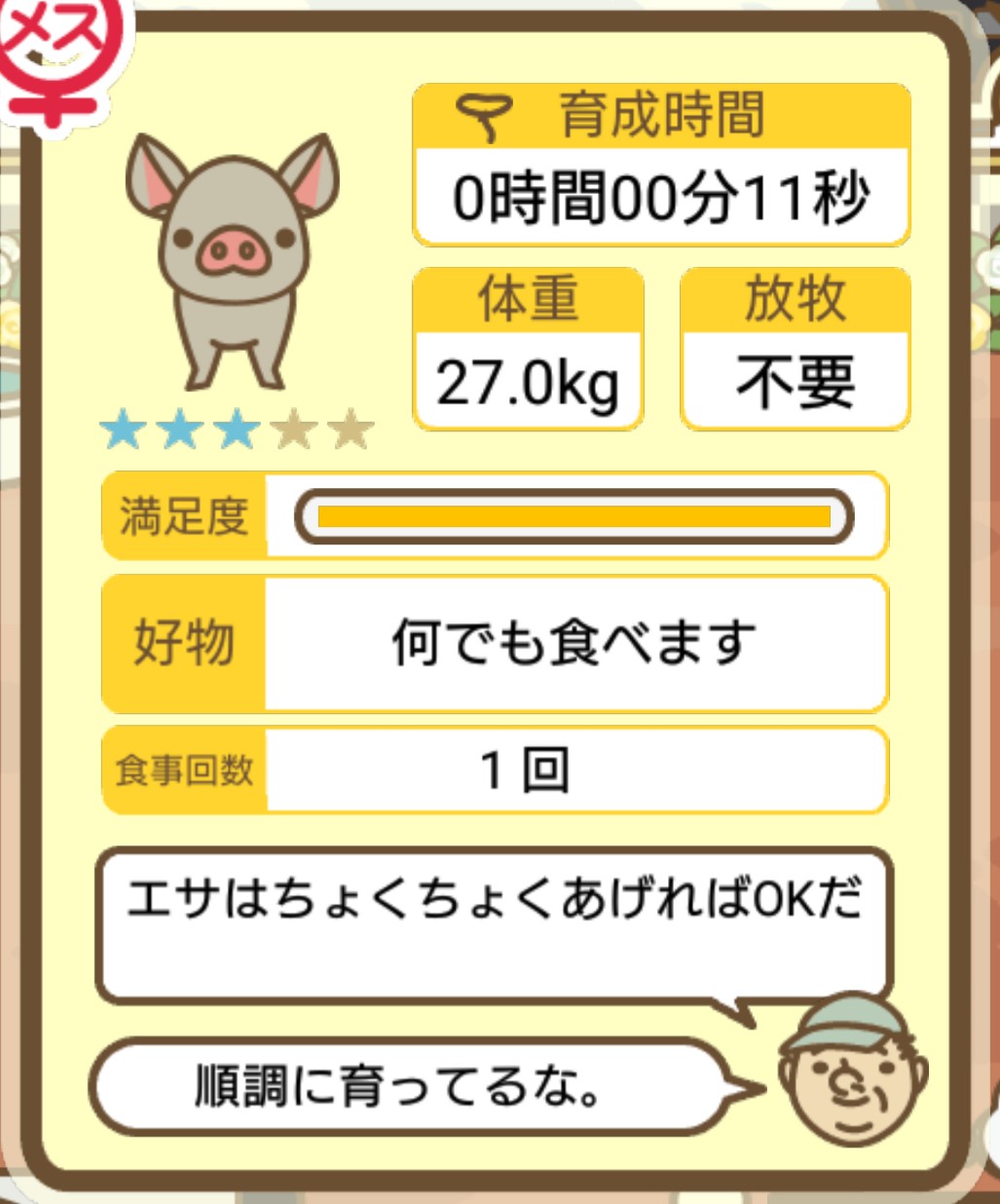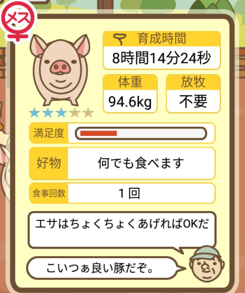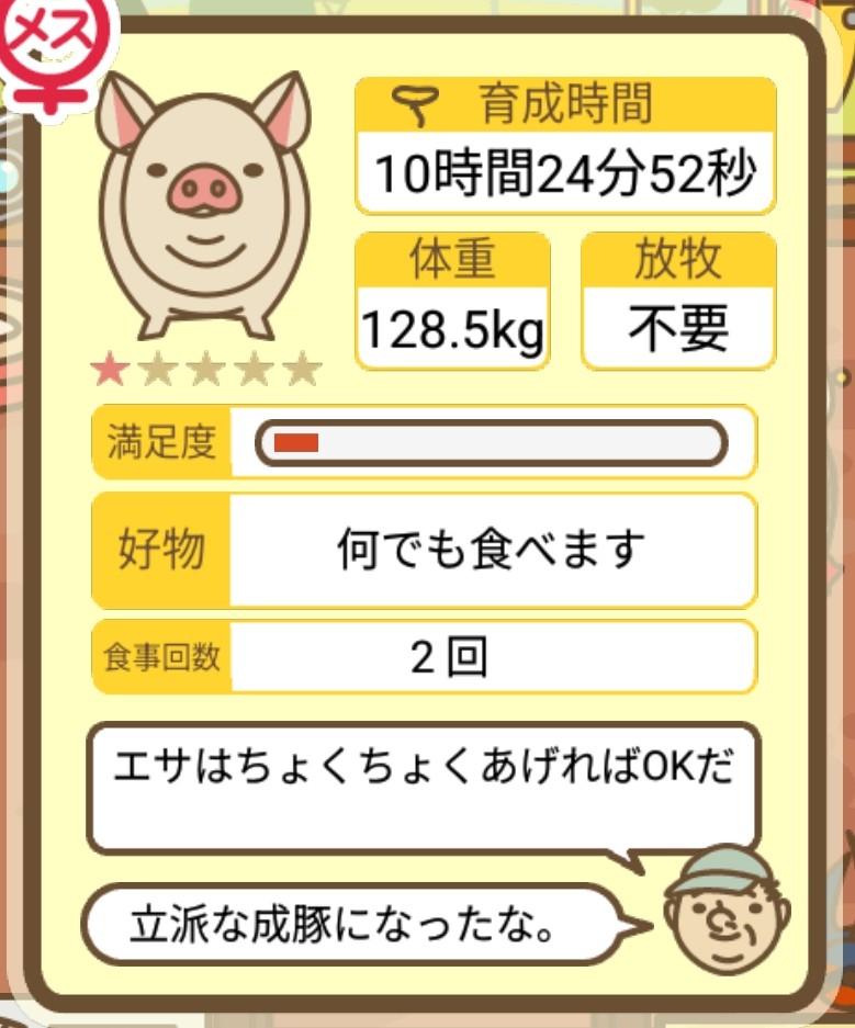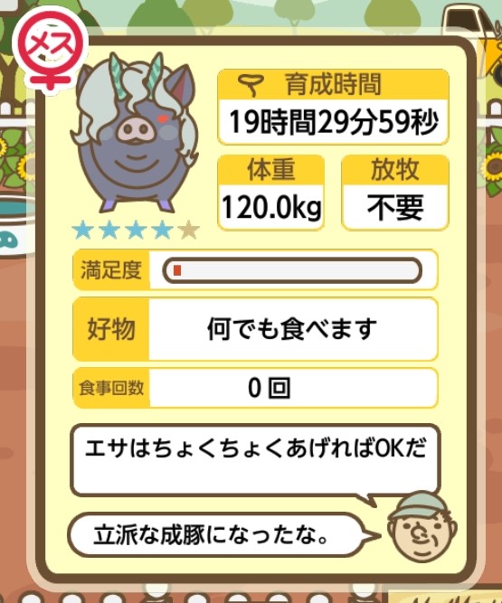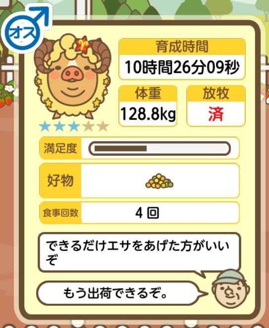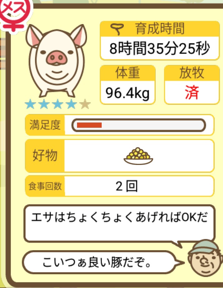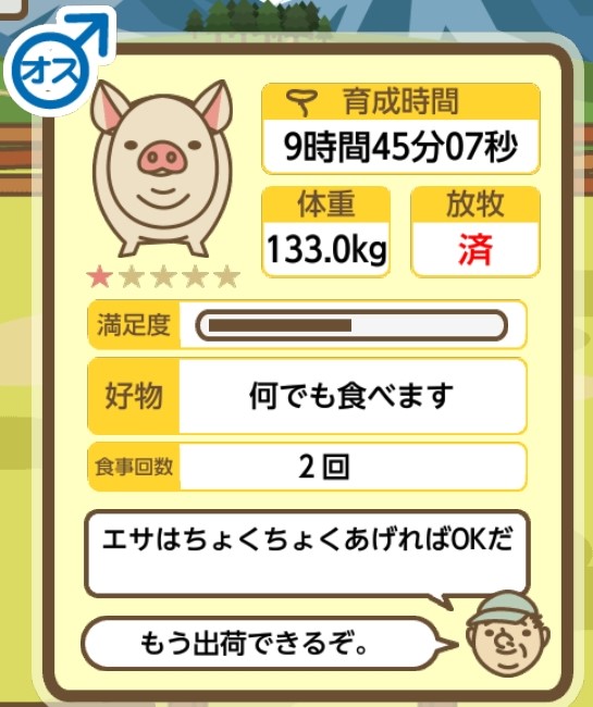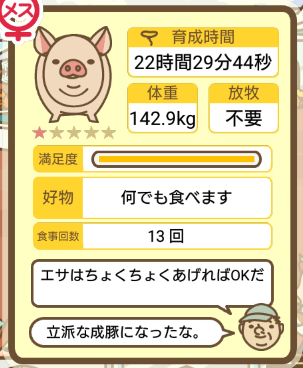 スクショないですが、放牧済、放牧場成豚、エサ3回では成功してます。(00:01成豚) -- 名無し[Ea6iFKq0LBo] 2025/11/07 (金) 21:15:25