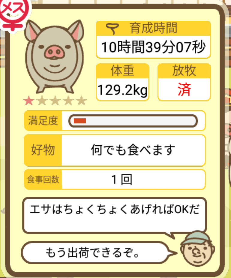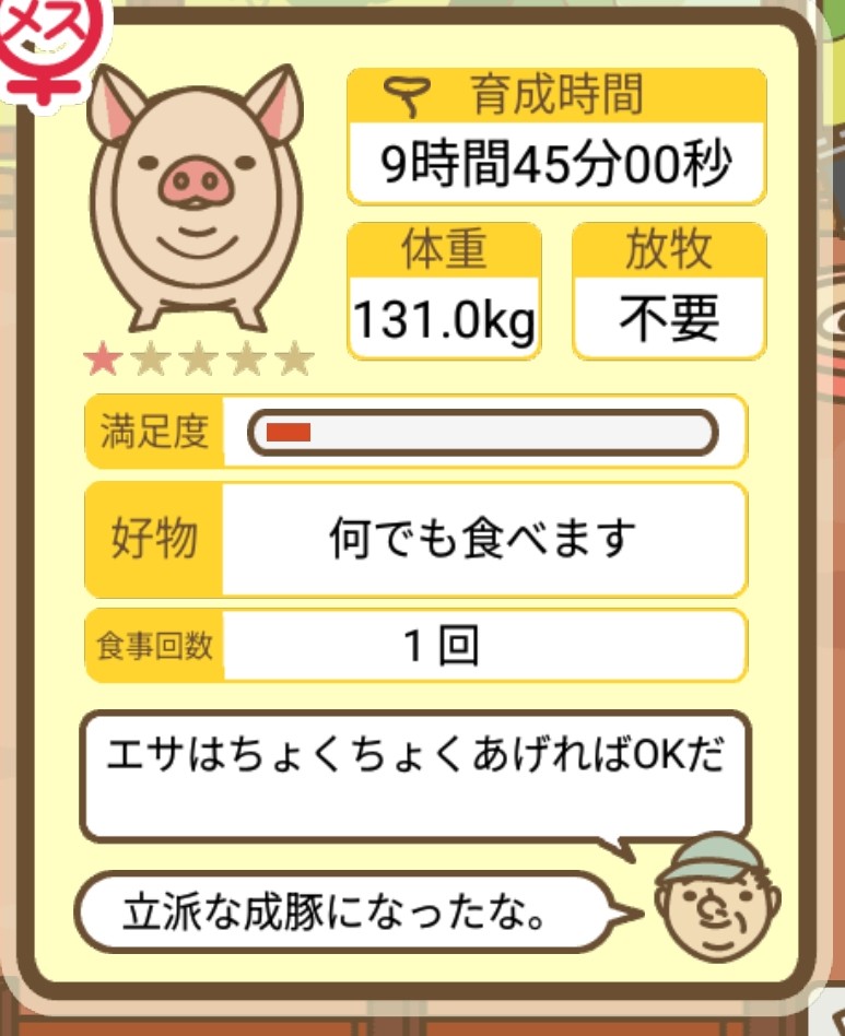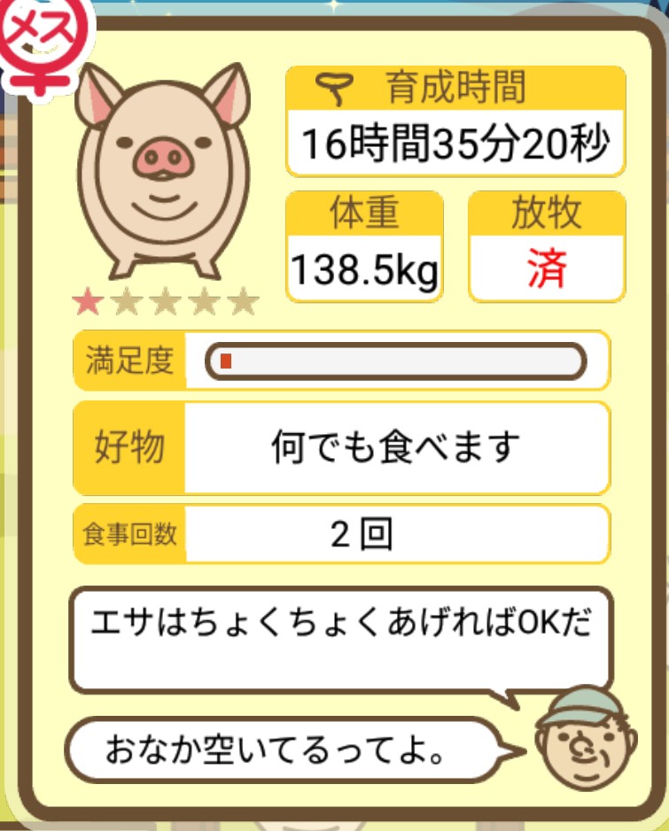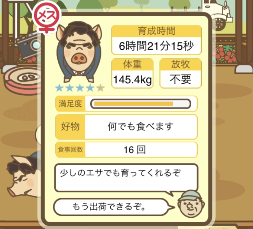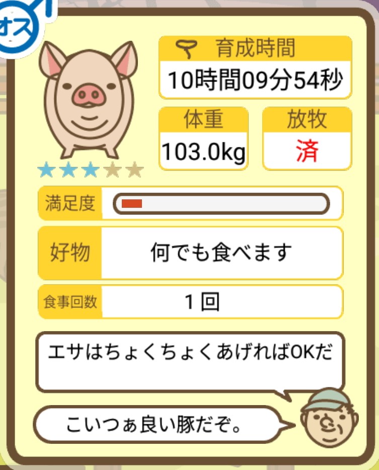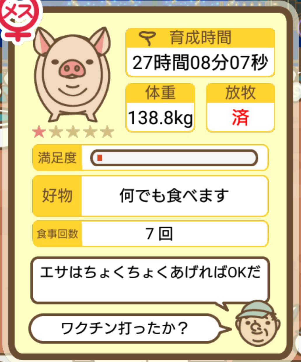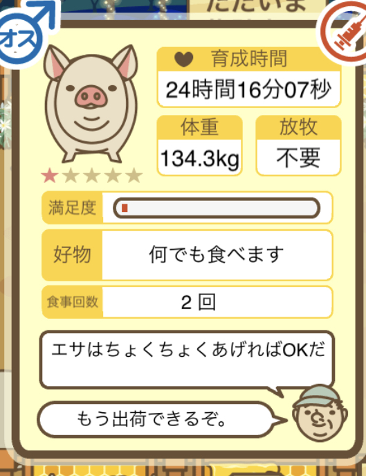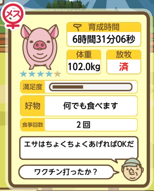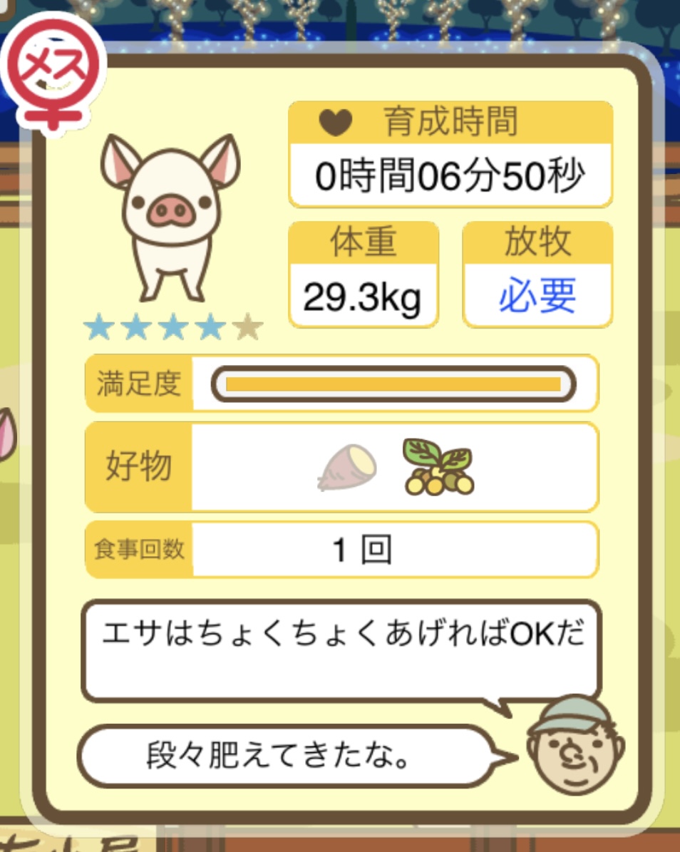 スクショないですが、放牧済、放牧場成豚、エサ3回では成功してます。(00:01成豚) -- 名無し[Ea6iFKq0LBo] 2025/11/07 (金) 21:15:25