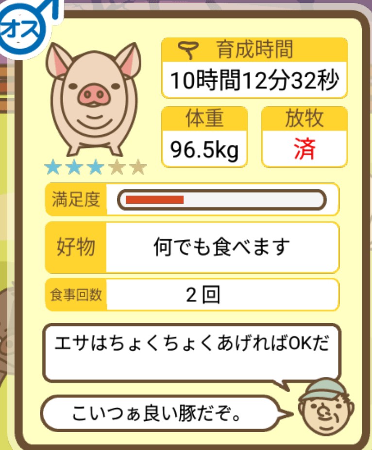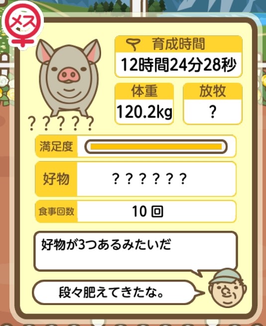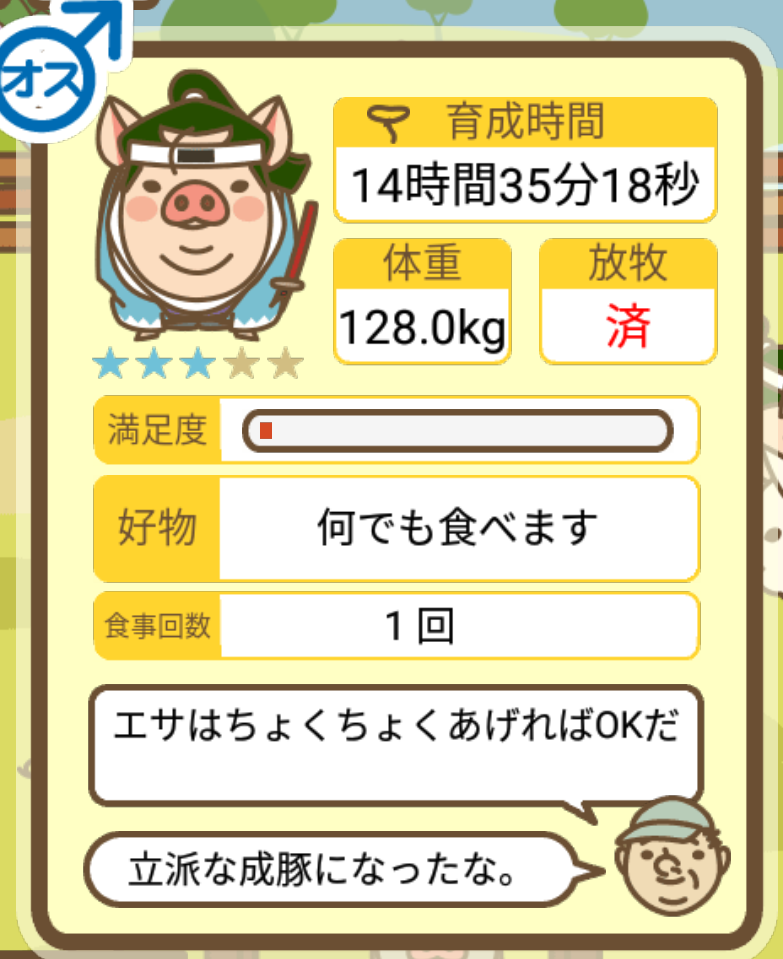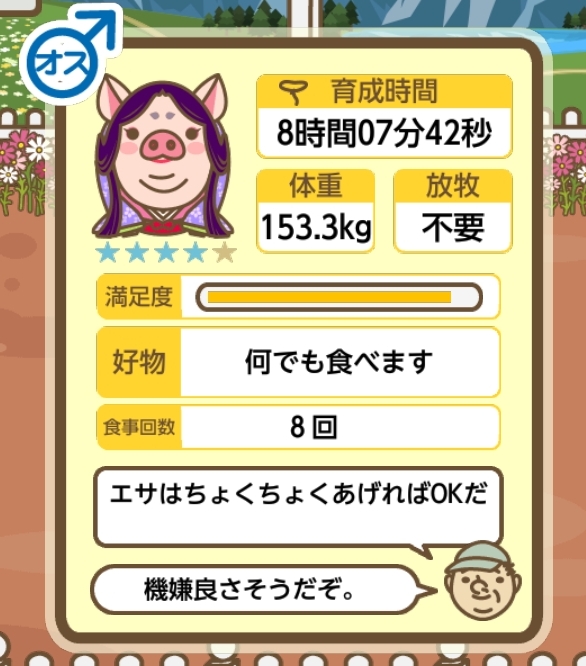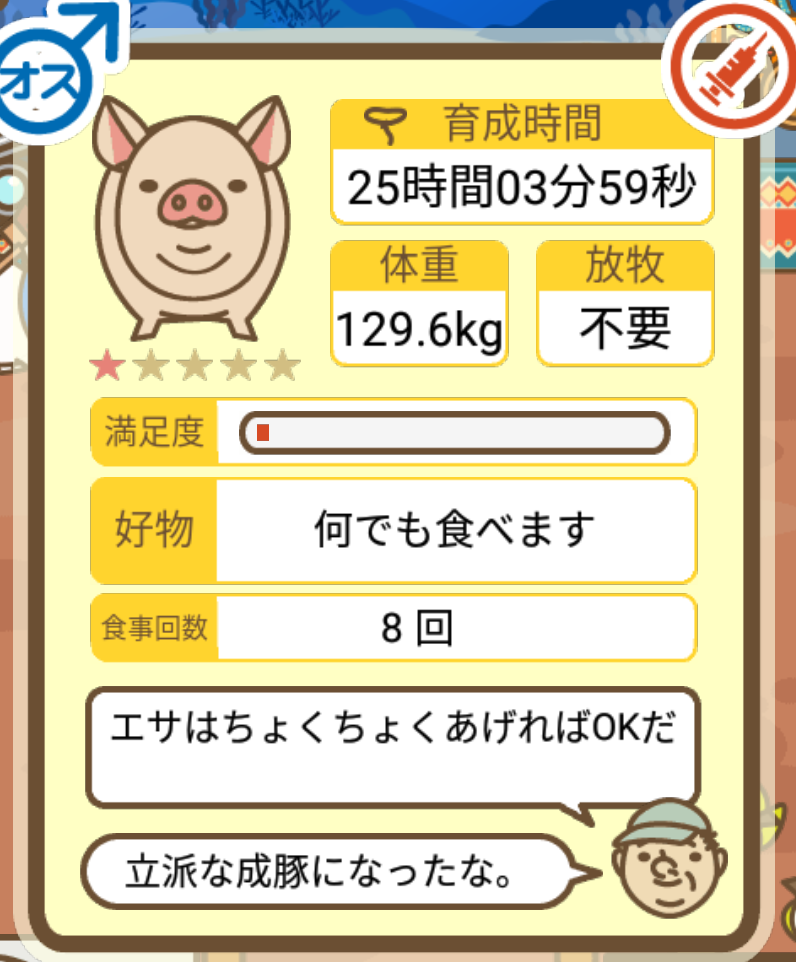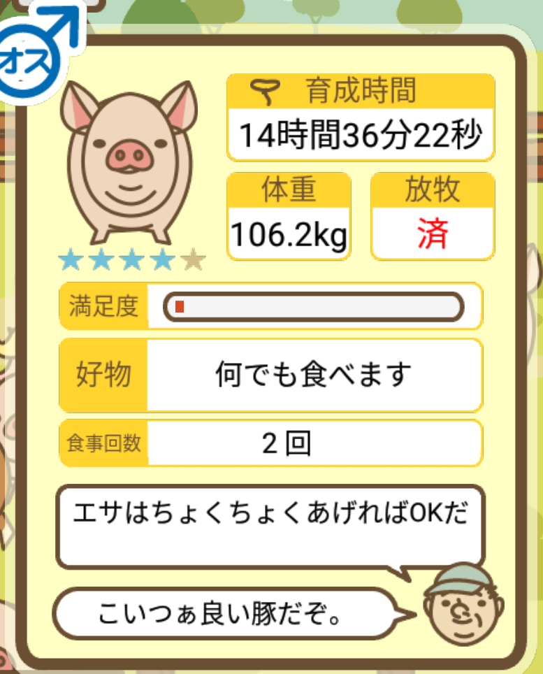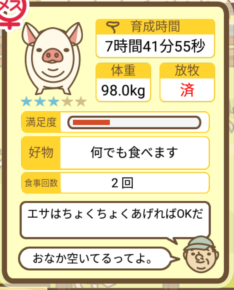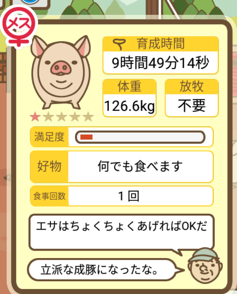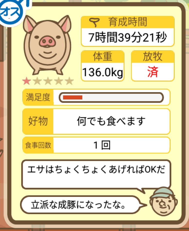 スクショないですが、放牧済、放牧場成豚、エサ3回では成功してます。(00:01成豚) -- 名無し[Ea6iFKq0LBo] 2025/11/07 (金) 21:15:25