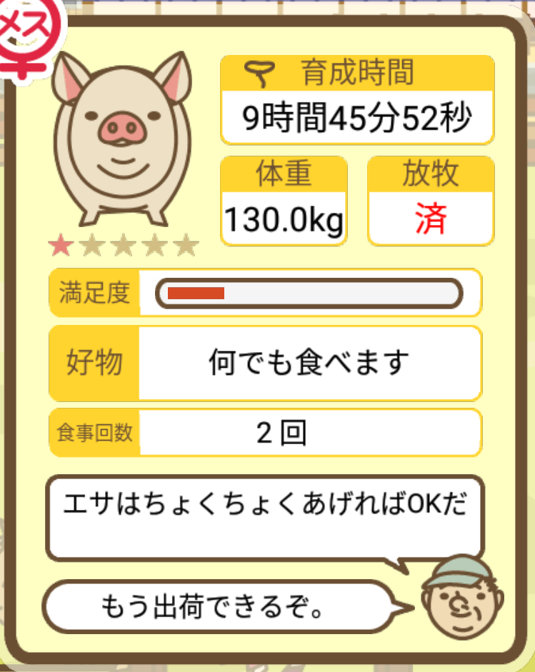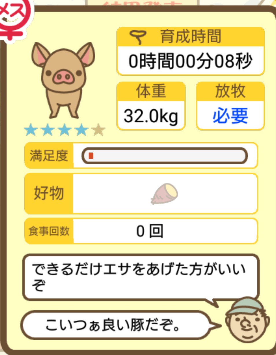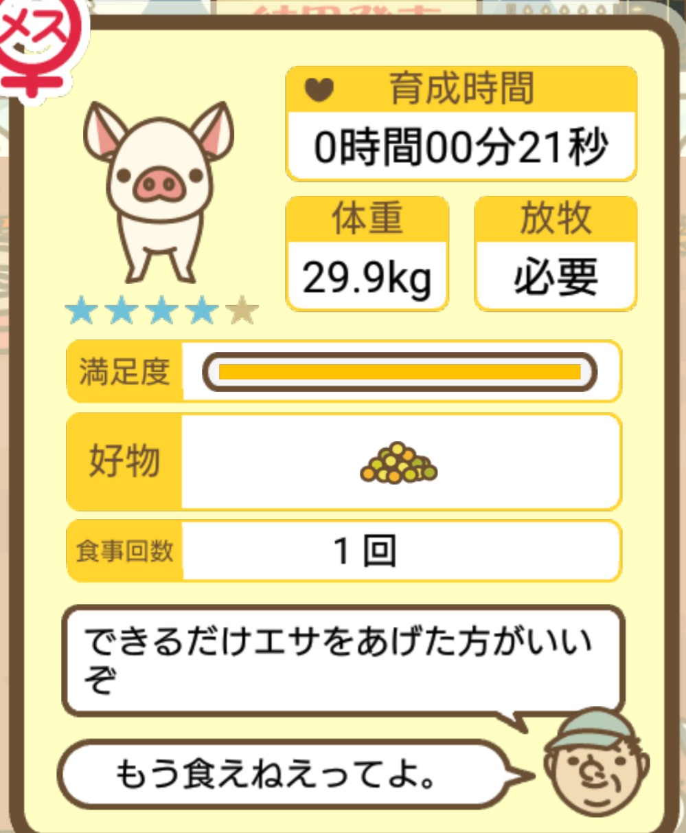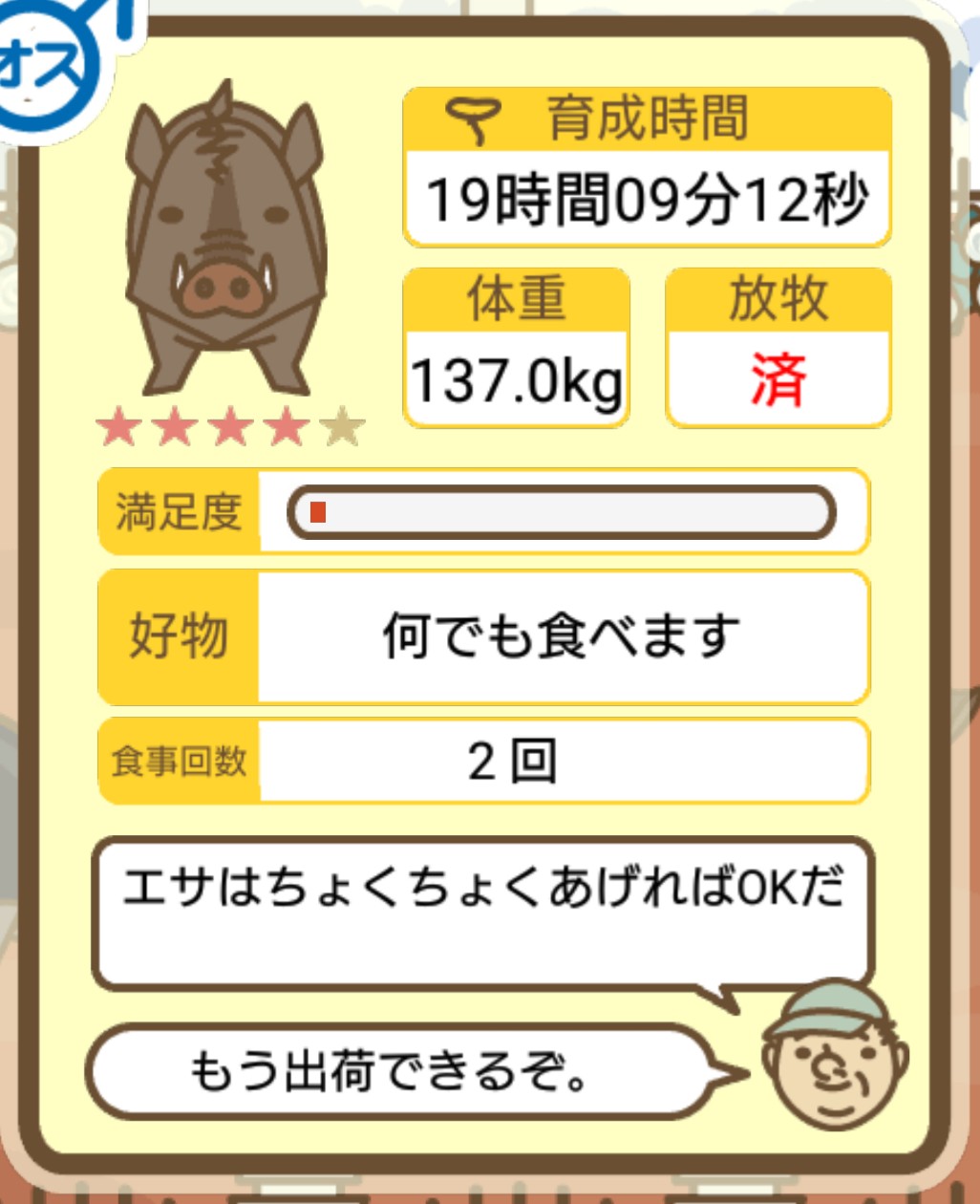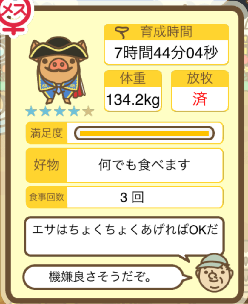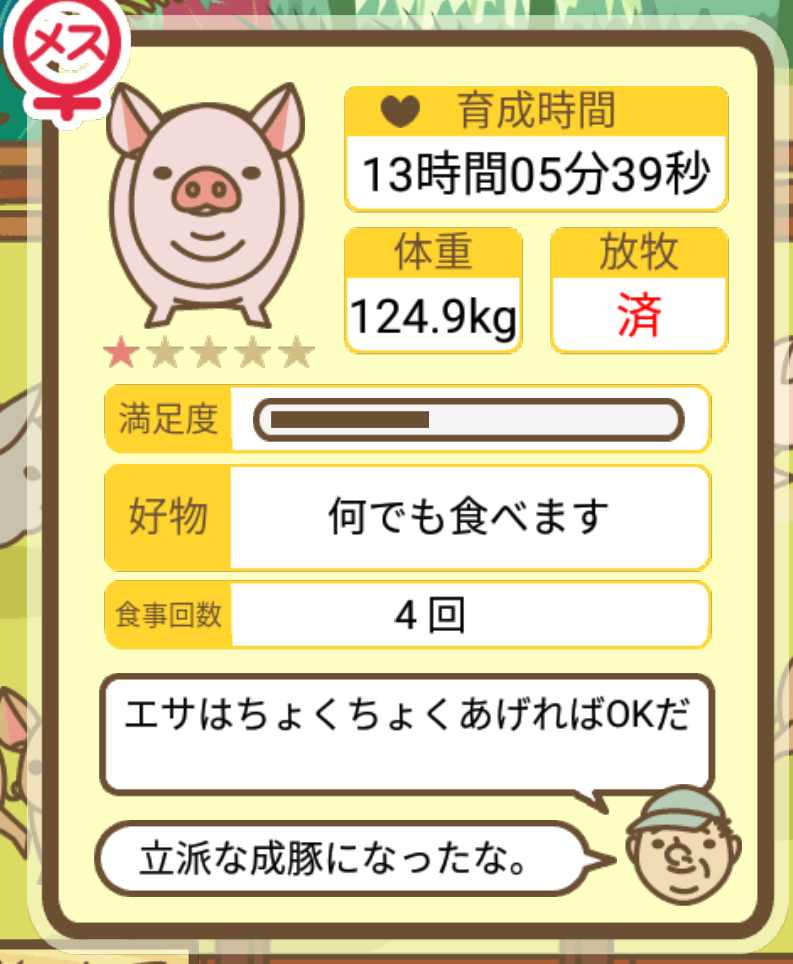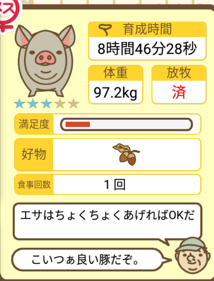スクショないですが、放牧済、放牧場成豚、エサ3回では成功してます。(00:01成豚) -- 名無し[Ea6iFKq0LBo] 2025/11/07 (金) 21:15:25