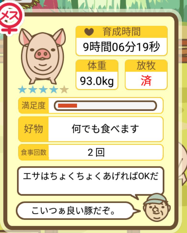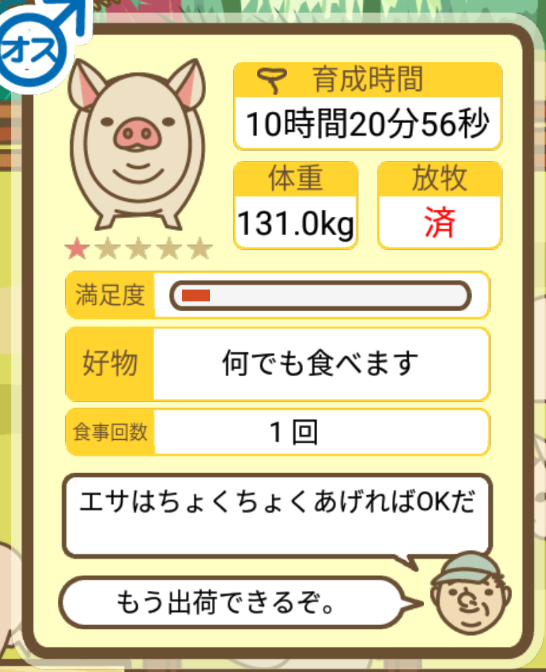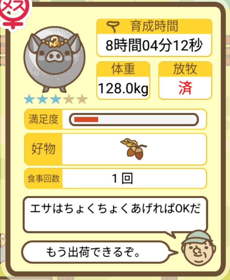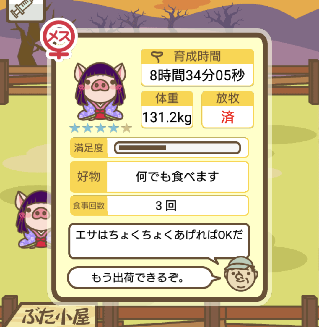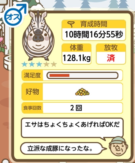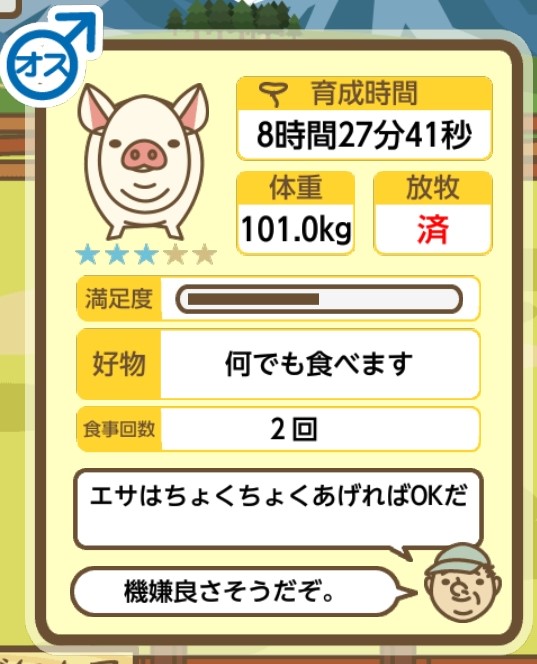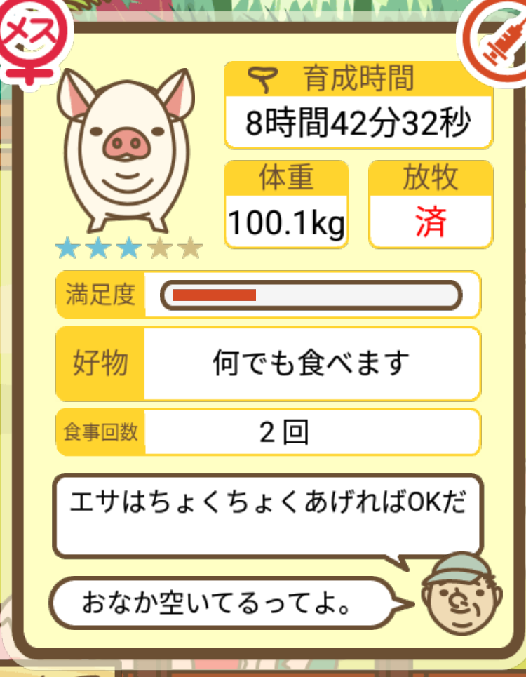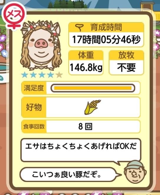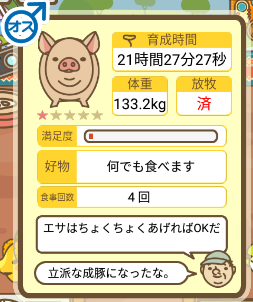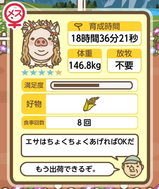 スクショないですが、放牧済、放牧場成豚、エサ3回では成功してます。(00:01成豚) -- 名無し[Ea6iFKq0LBo] 2025/11/07 (金) 21:15:25