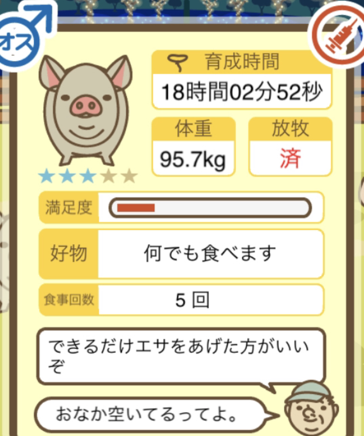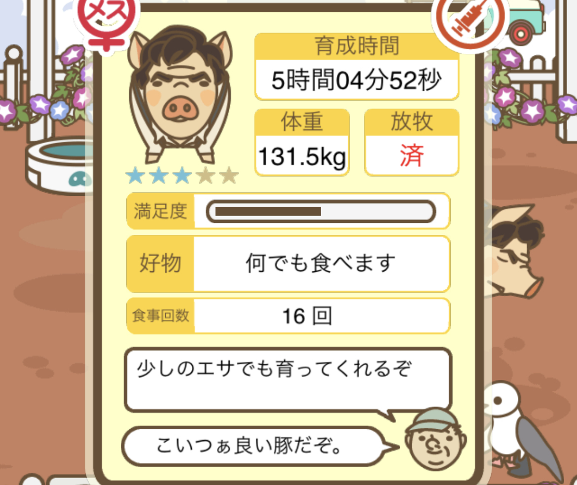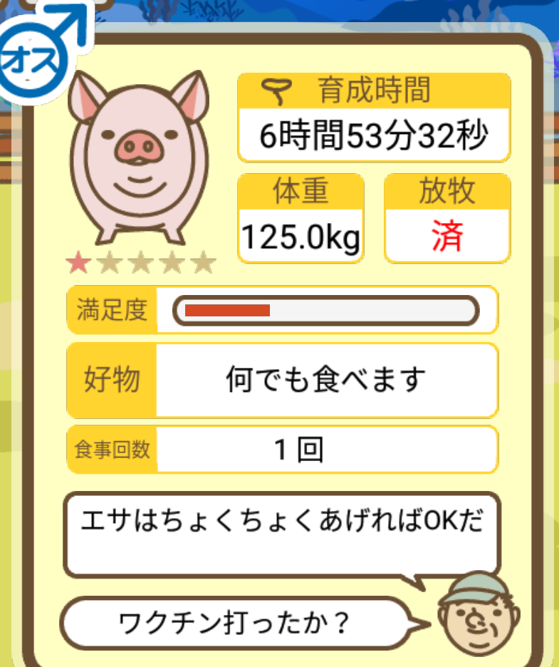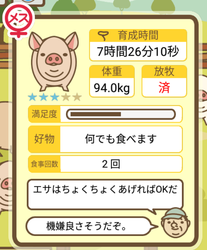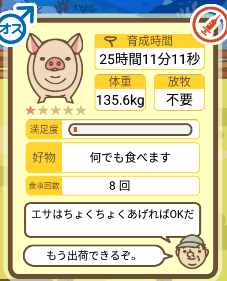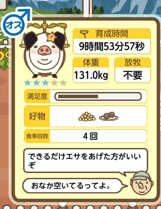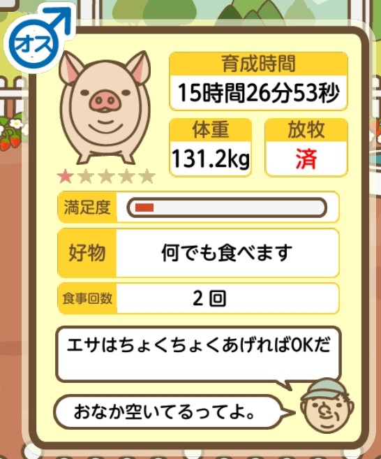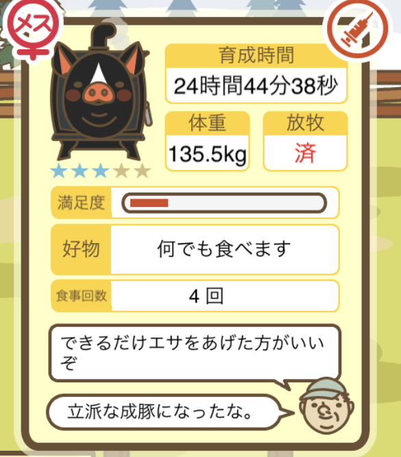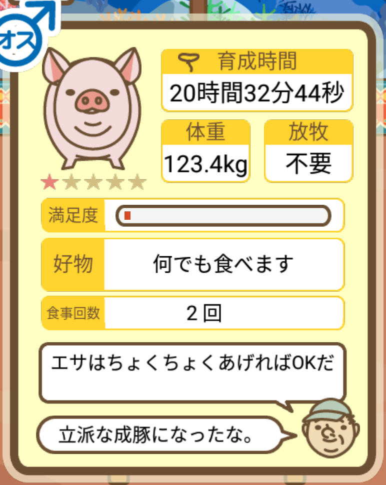 スクショないですが、放牧済、放牧場成豚、エサ3回では成功してます。(00:01成豚) -- 名無し[Ea6iFKq0LBo] 2025/11/07 (金) 21:15:25