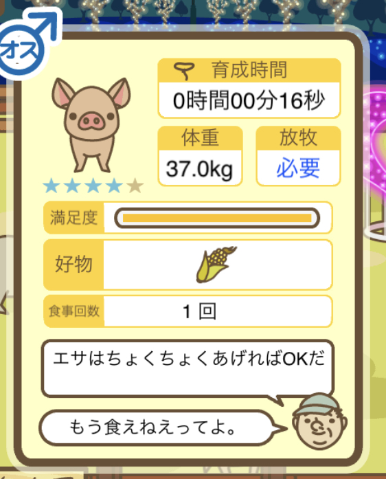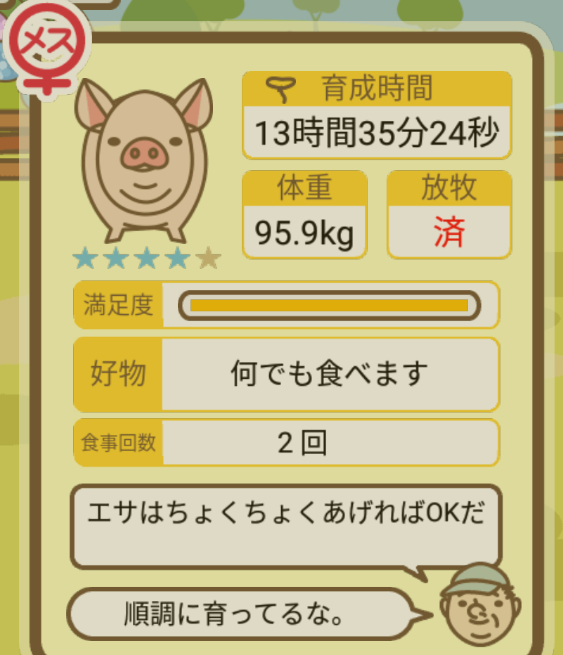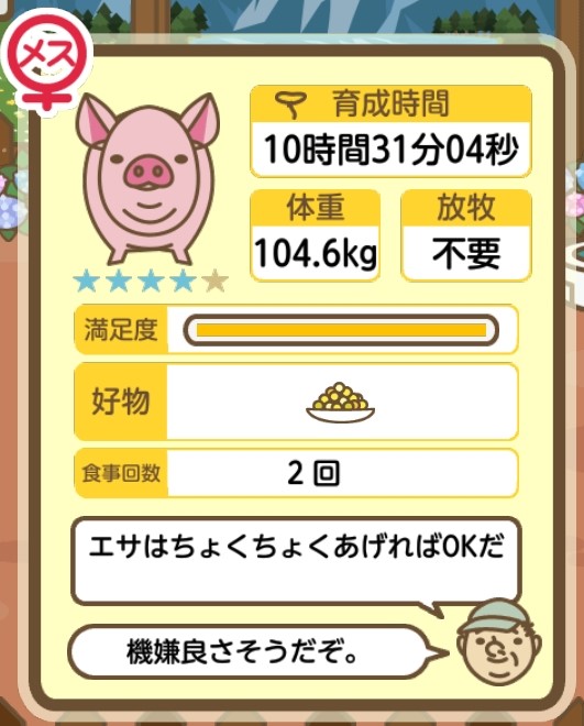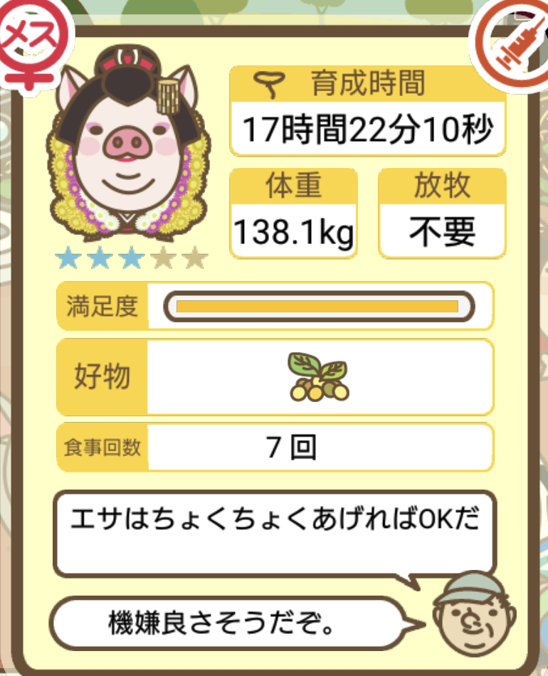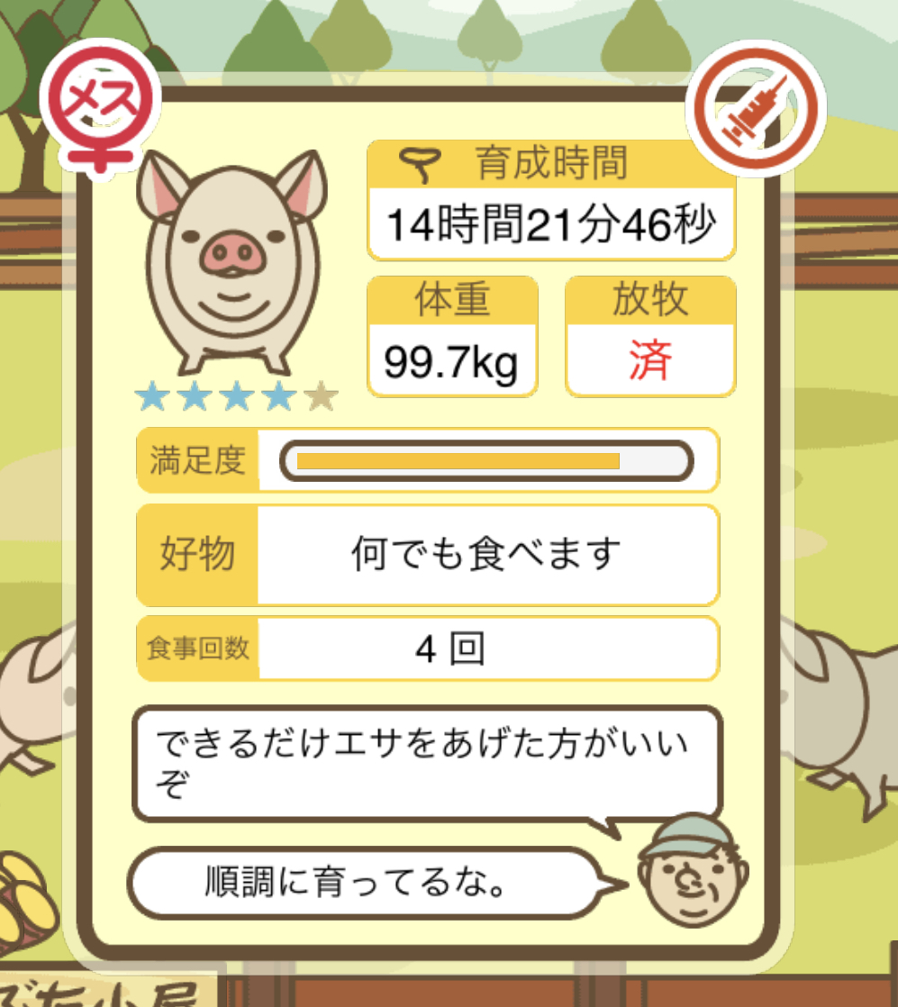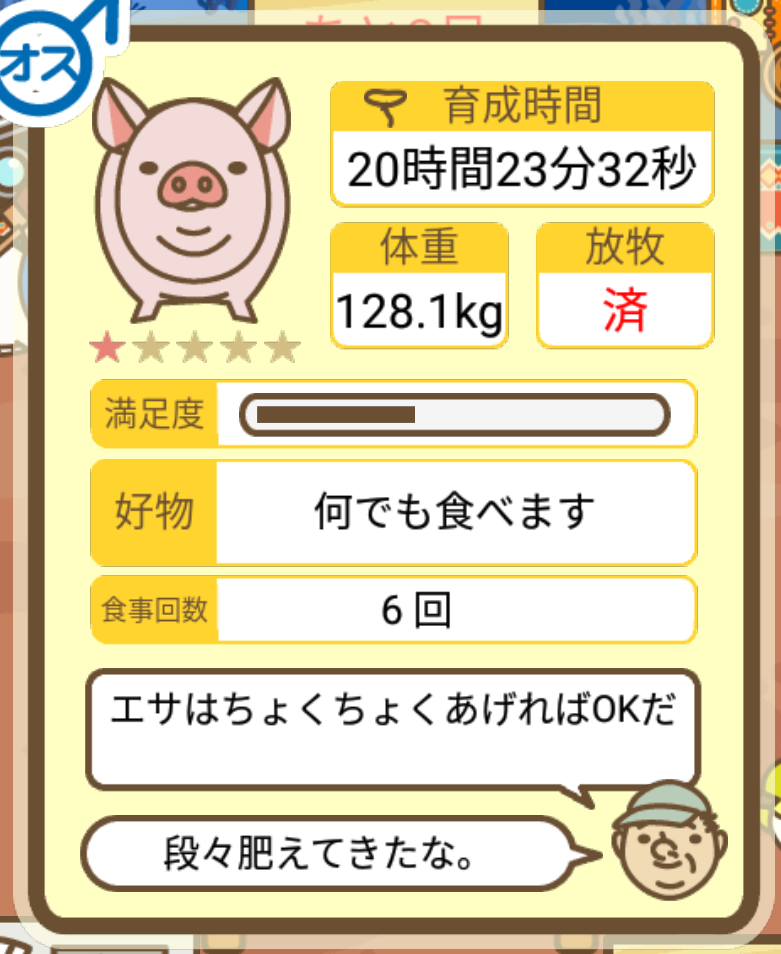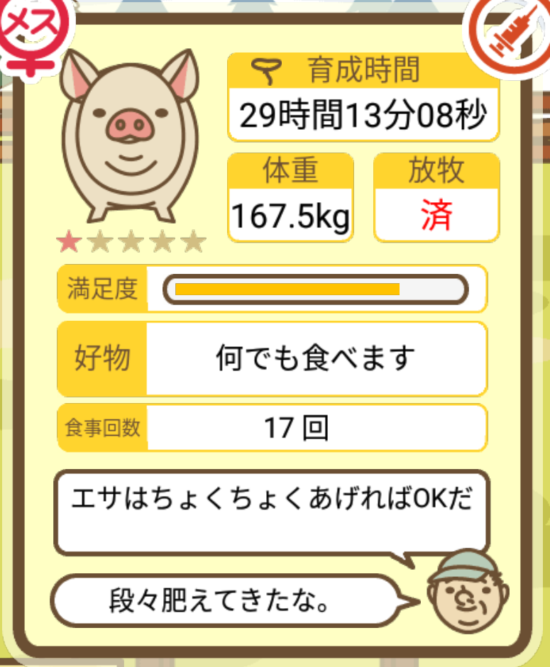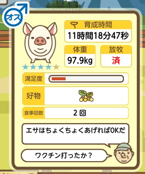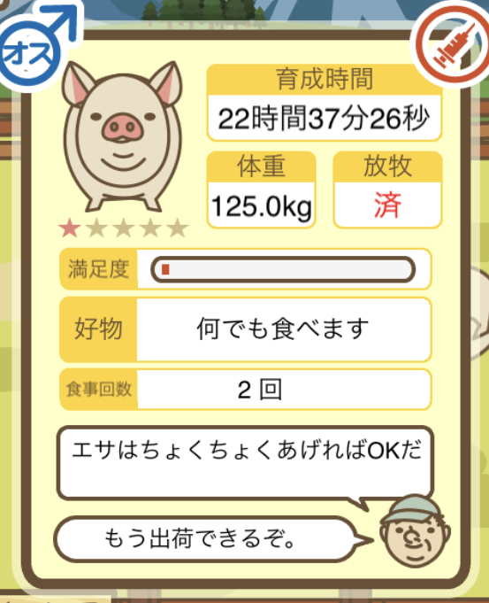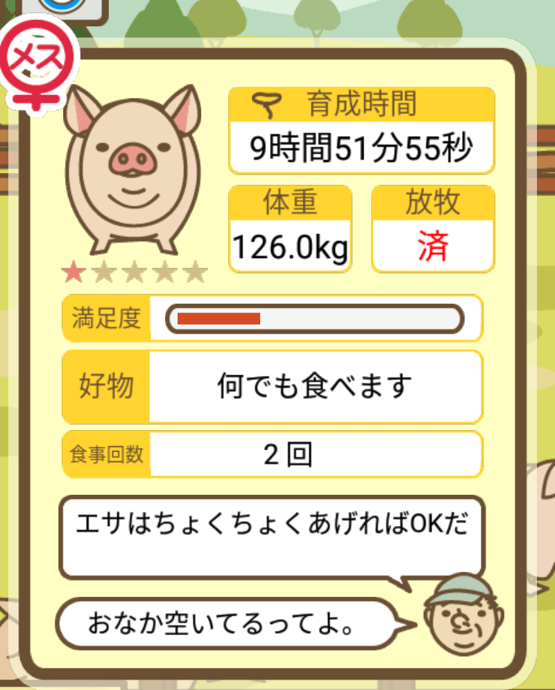スクショないですが、放牧済、放牧場成豚、エサ3回では成功してます。(00:01成豚) -- 名無し[Ea6iFKq0LBo] 2025/11/07 (金) 21:15:25