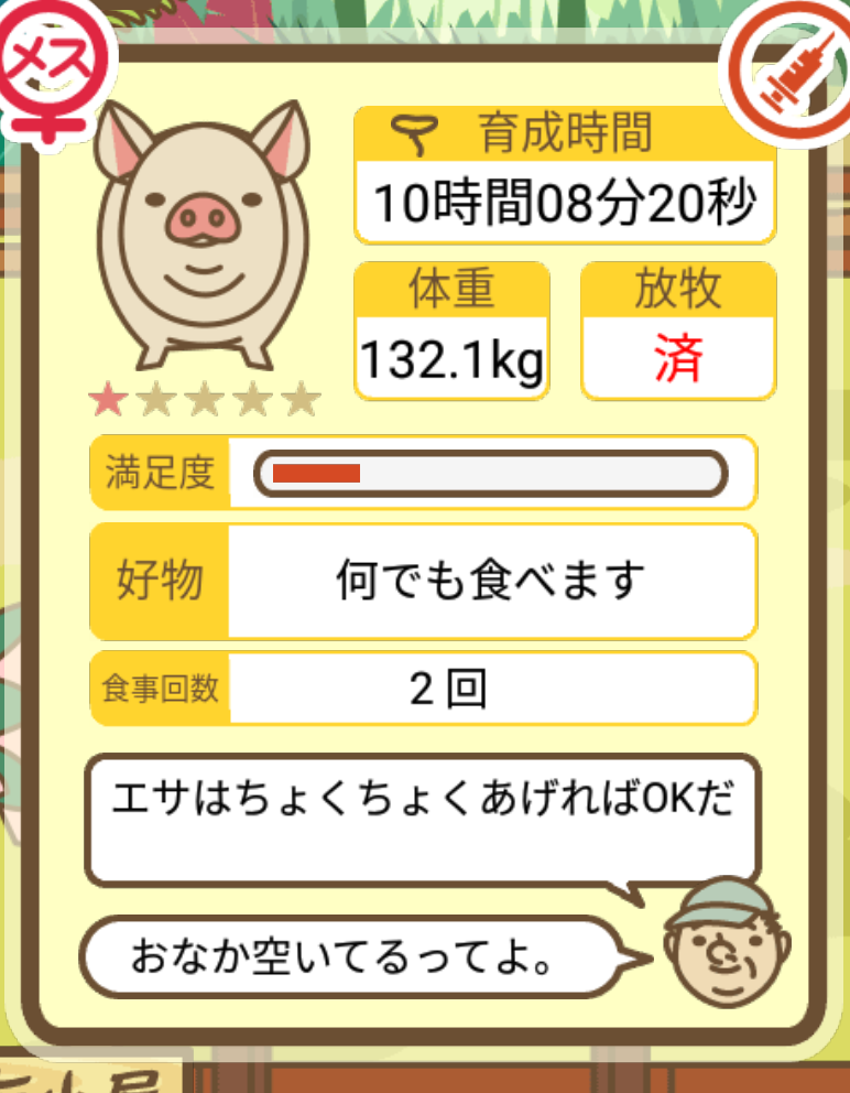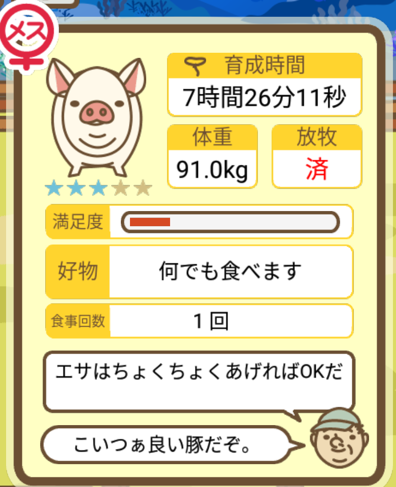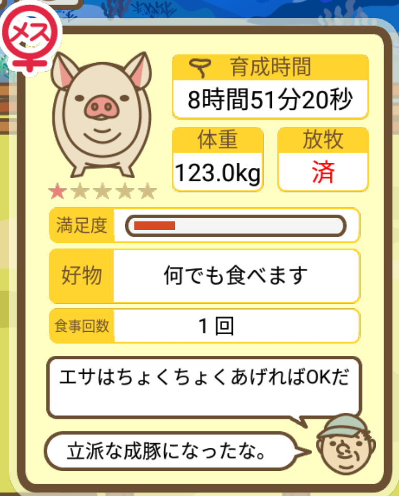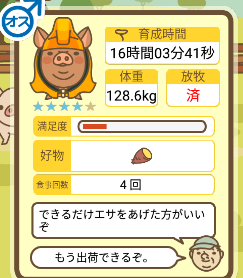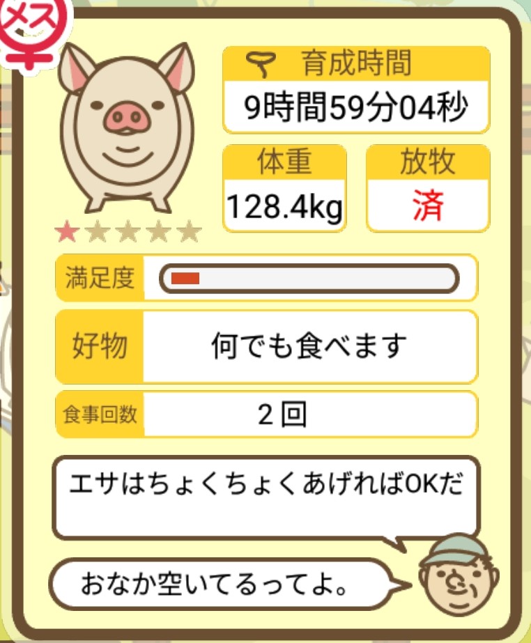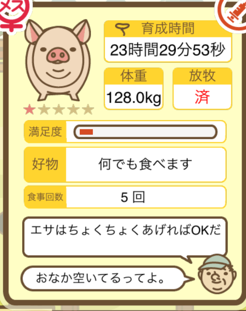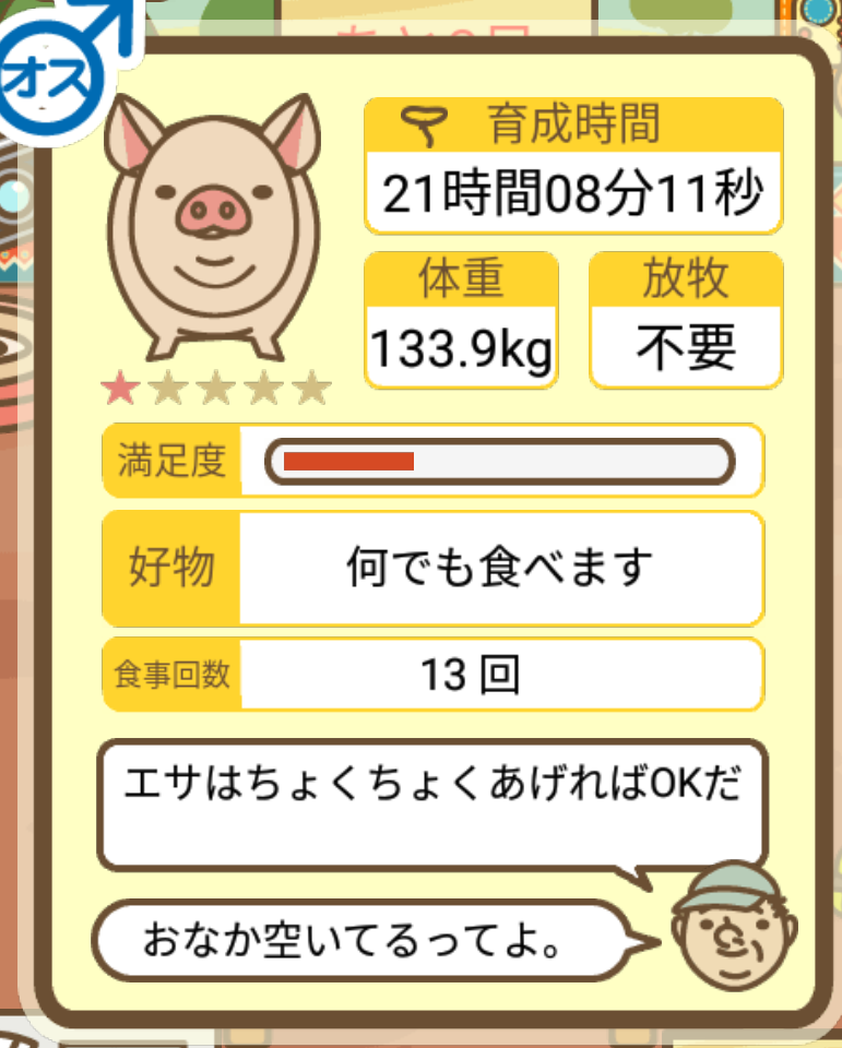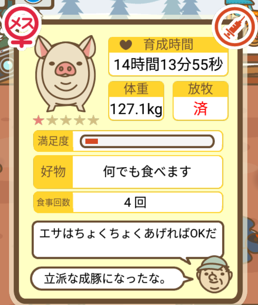 スクショないですが、放牧済、放牧場成豚、エサ3回では成功してます。(00:01成豚) -- 名無し[Ea6iFKq0LBo] 2025/11/07 (金) 21:15:25