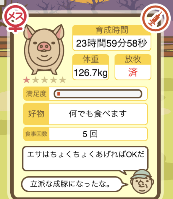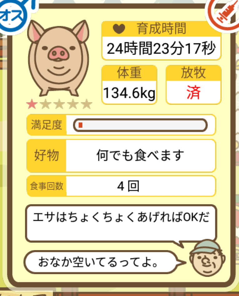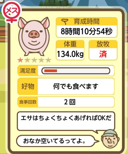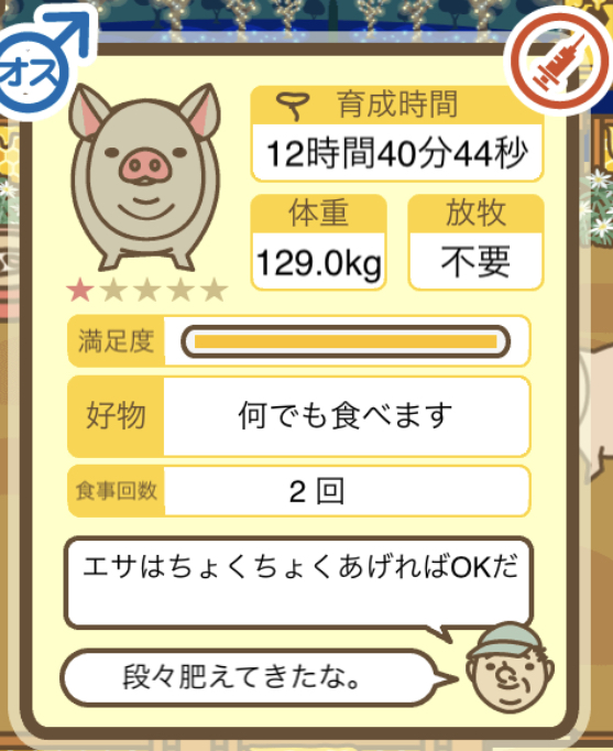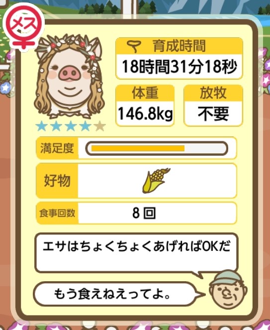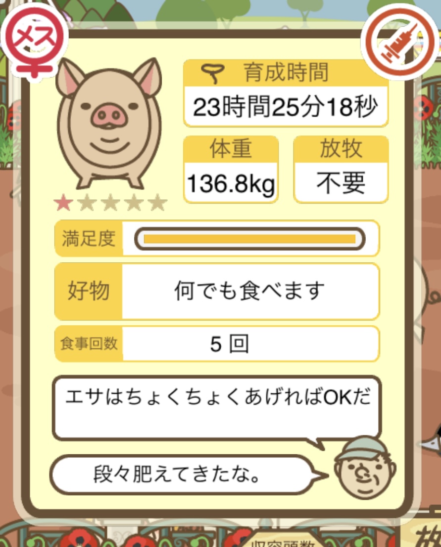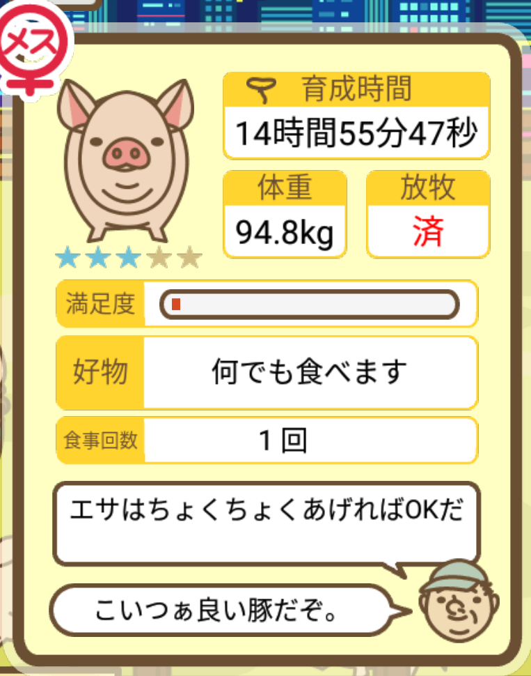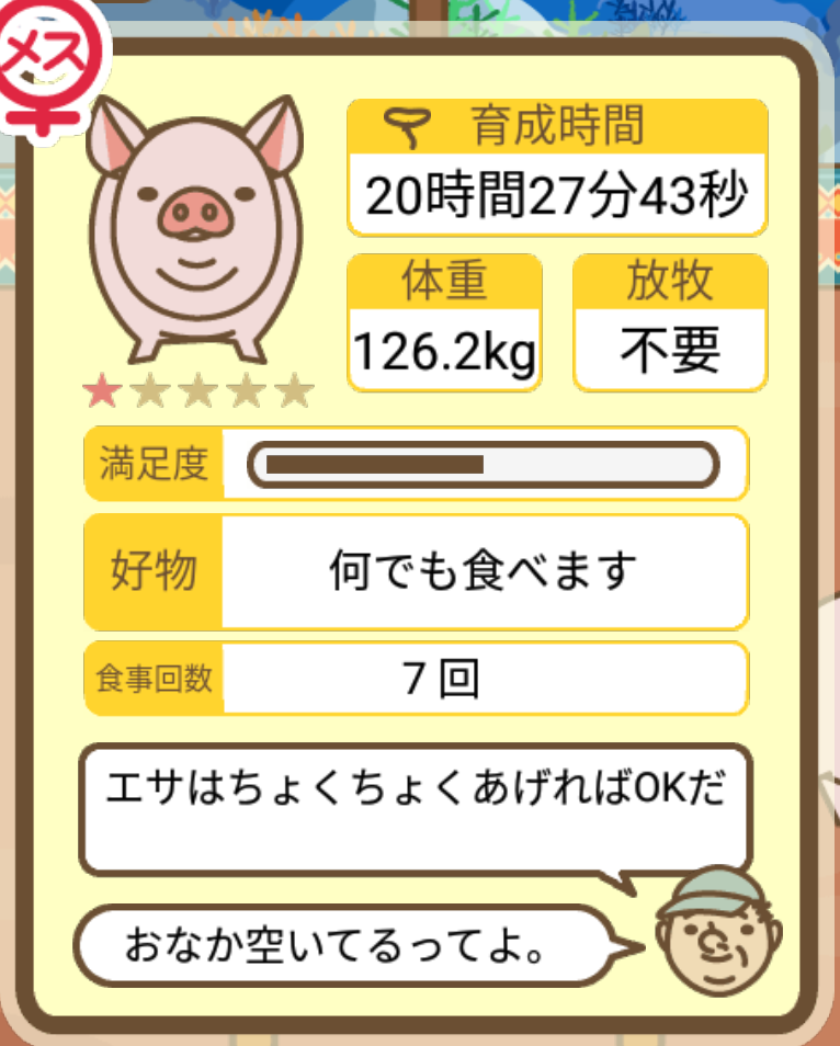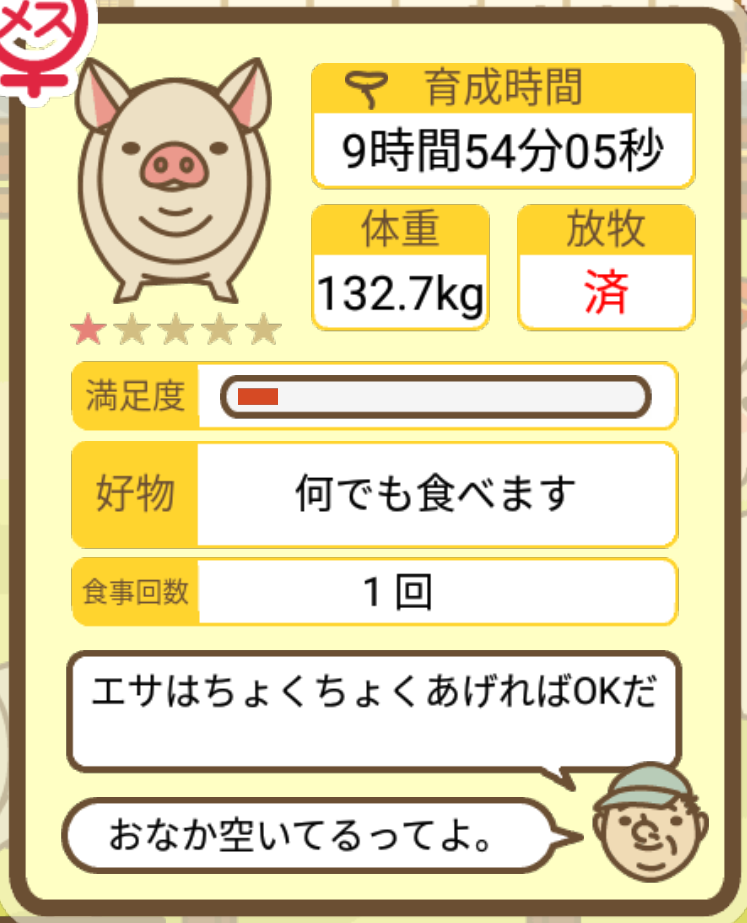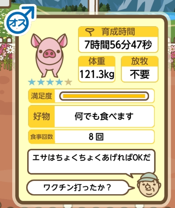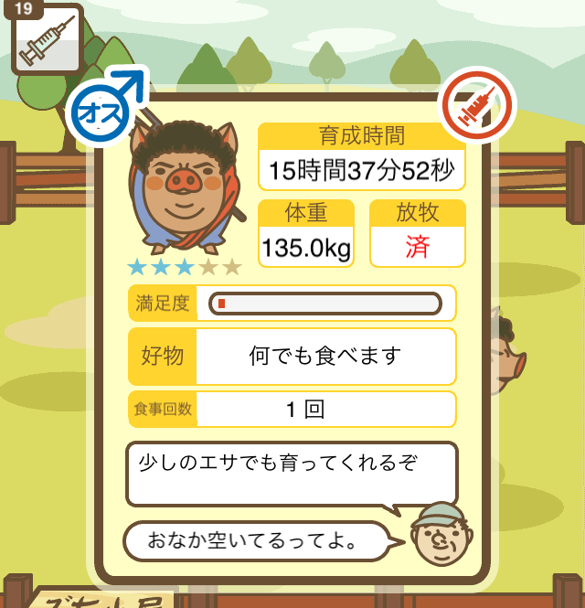 スクショないですが、放牧済、放牧場成豚、エサ3回では成功してます。(00:01成豚) -- 名無し[Ea6iFKq0LBo] 2025/11/07 (金) 21:15:25