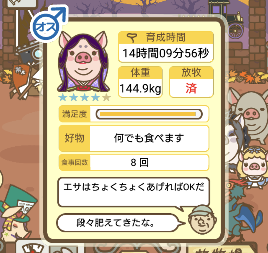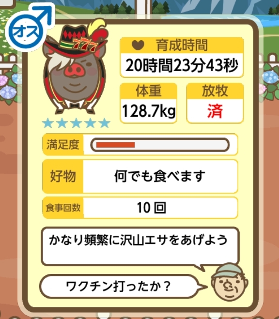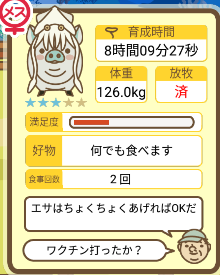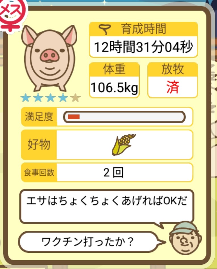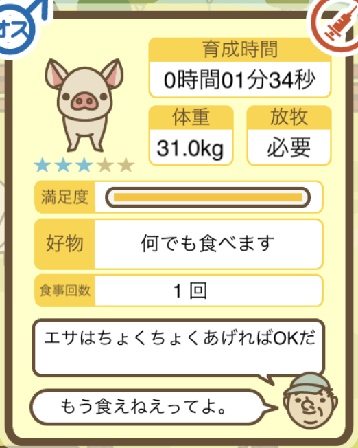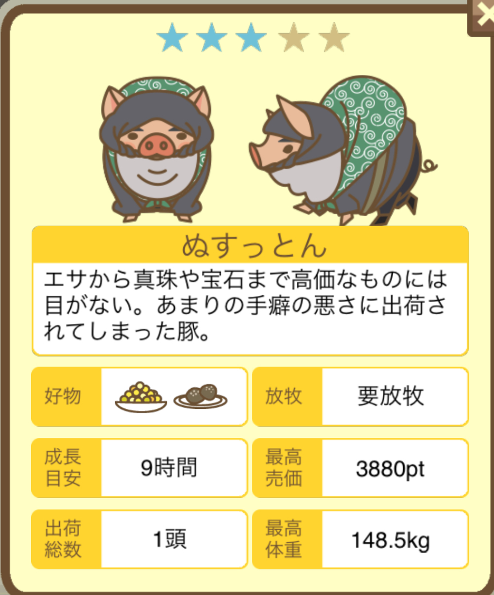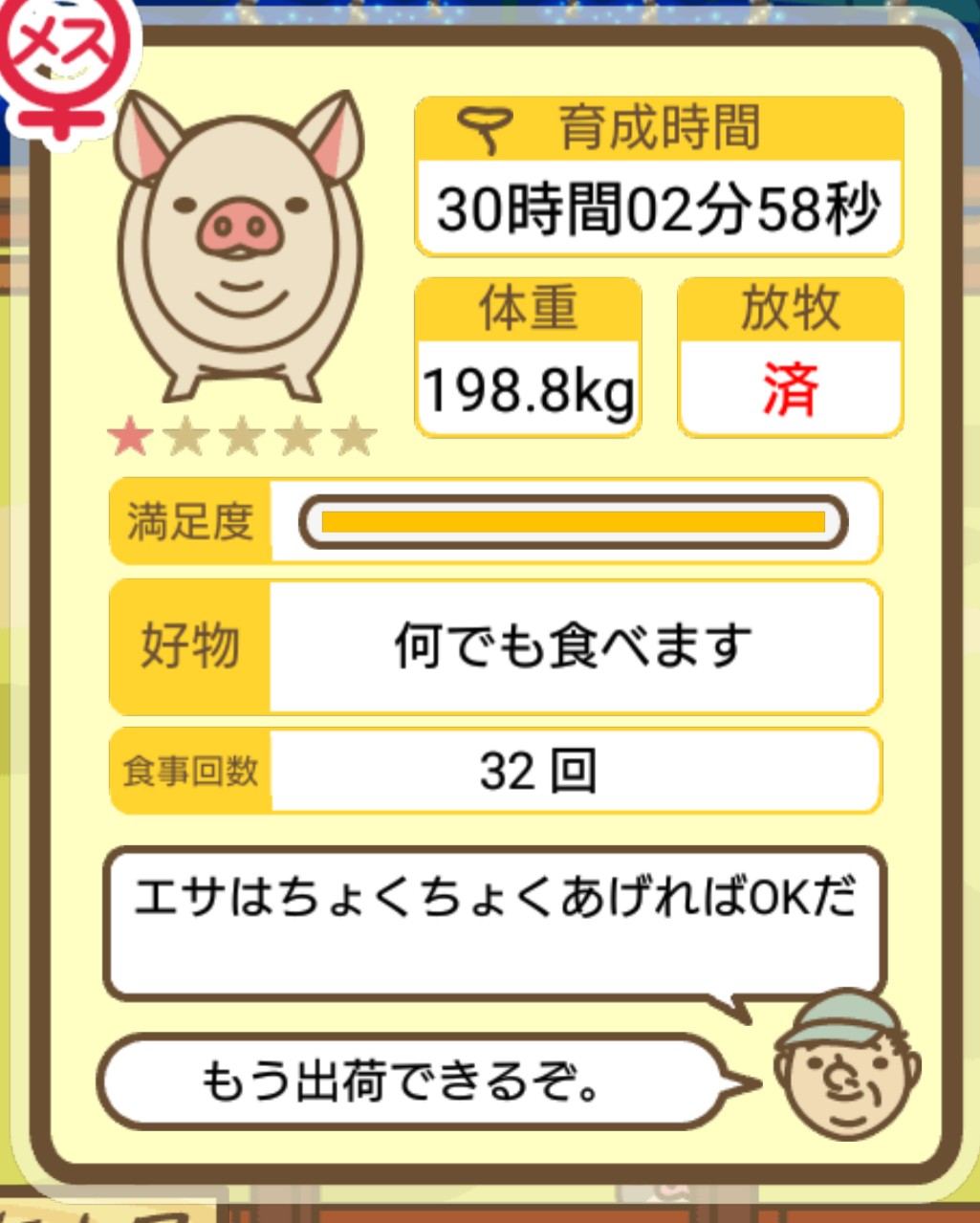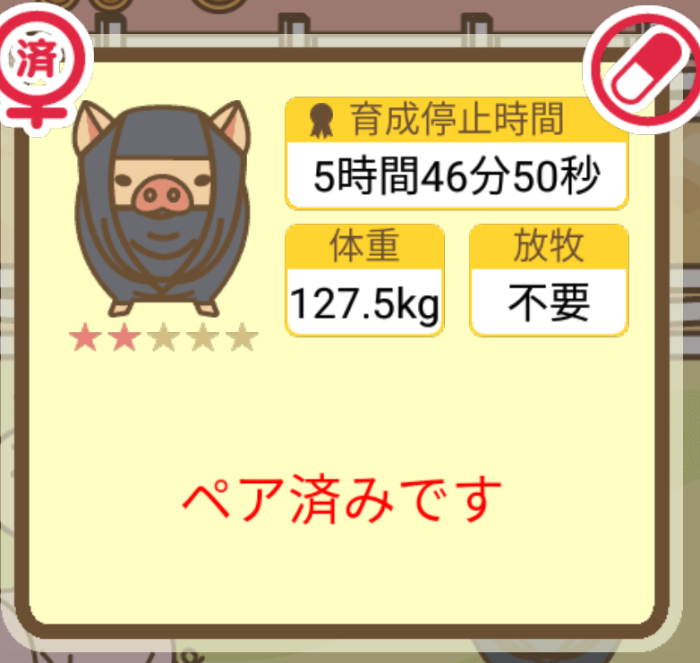 スクショないですが、放牧済、放牧場成豚、エサ3回では成功してます。(00:01成豚) -- 名無し[Ea6iFKq0LBo] 2025/11/07 (金) 21:15:25