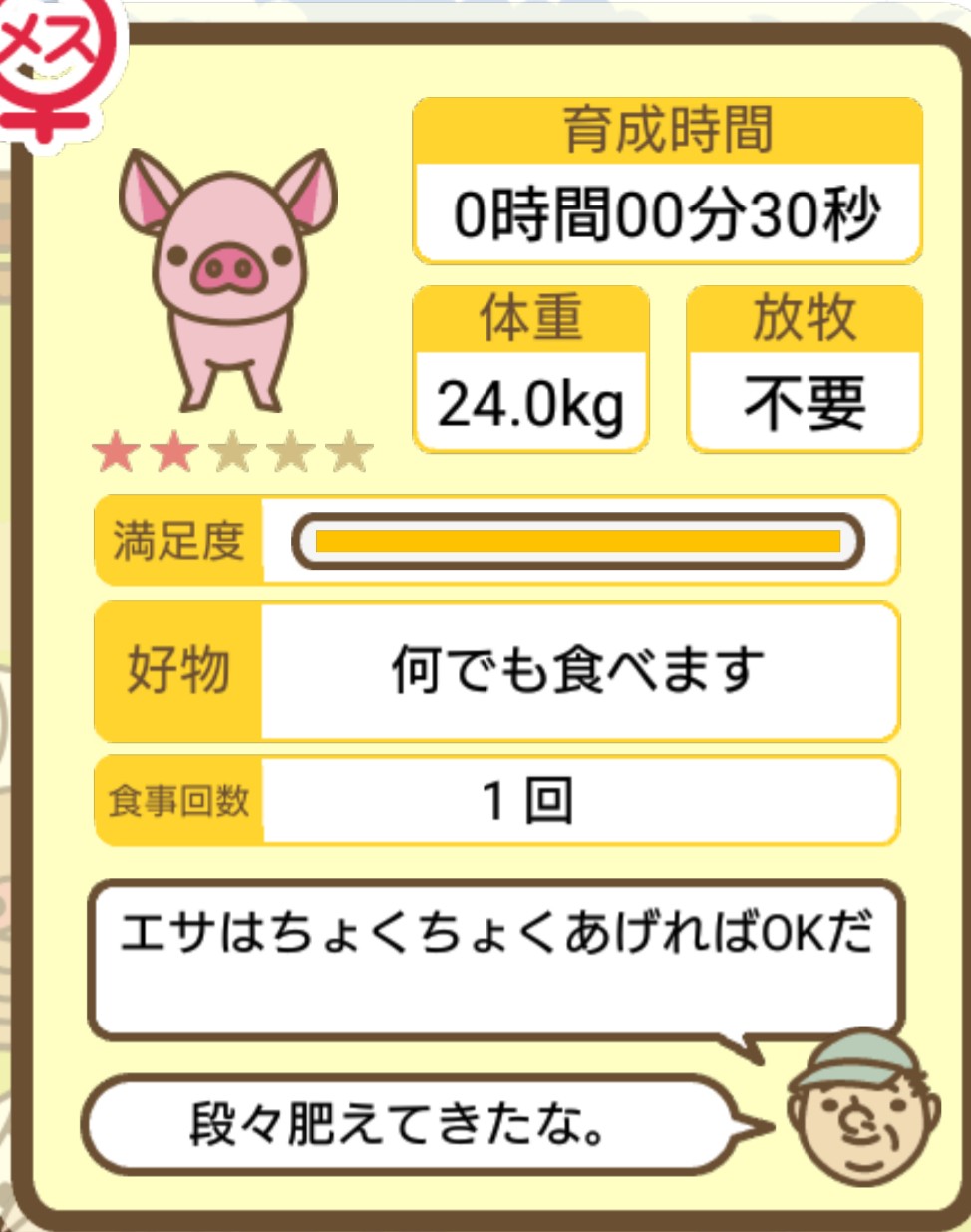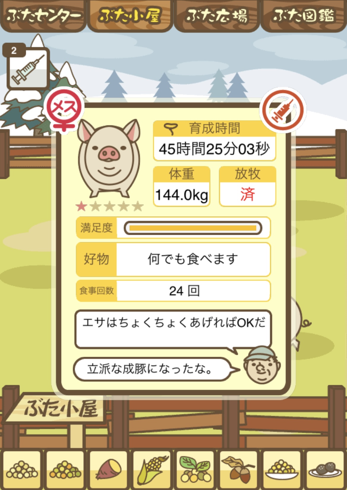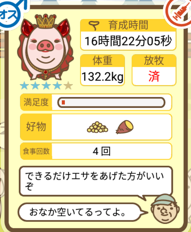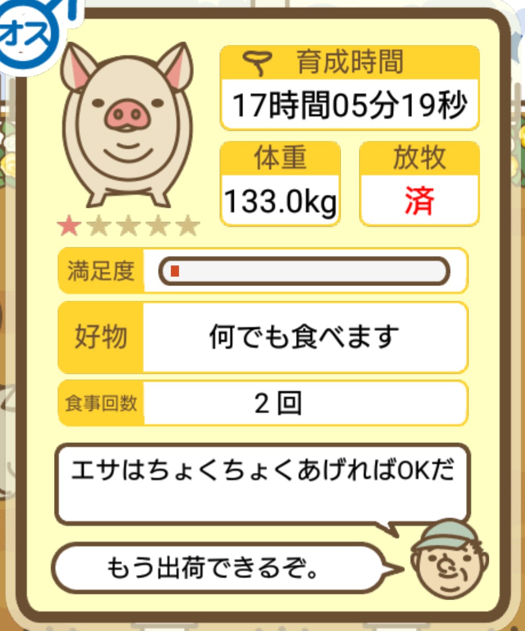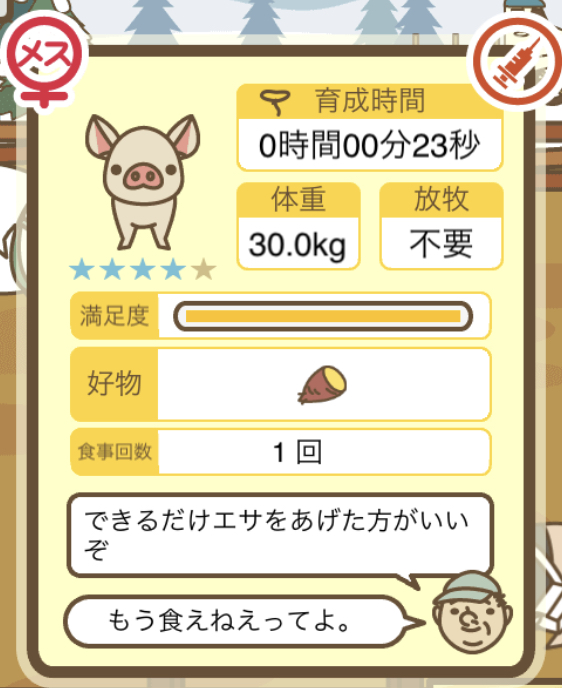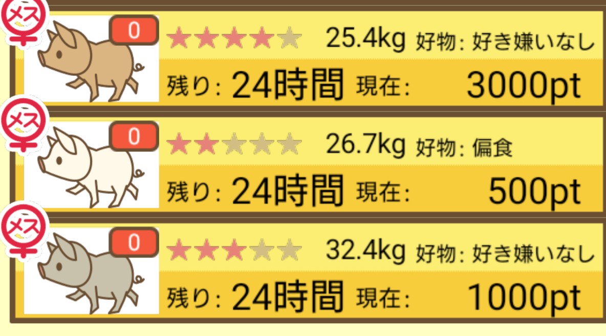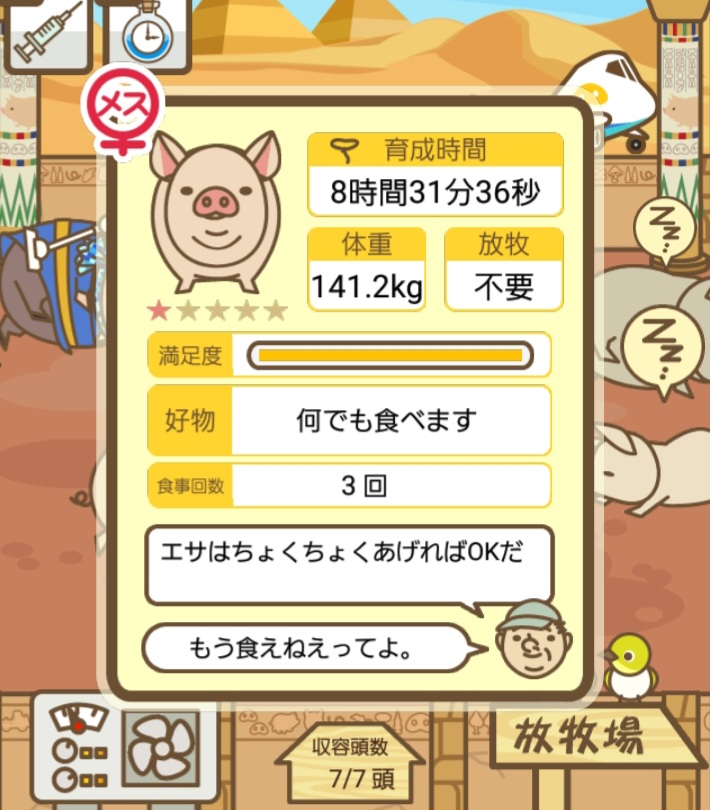 スクショないですが、放牧済、放牧場成豚、エサ3回では成功してます。(00:01成豚) -- 名無し[Ea6iFKq0LBo] 2025/11/07 (金) 21:15:25