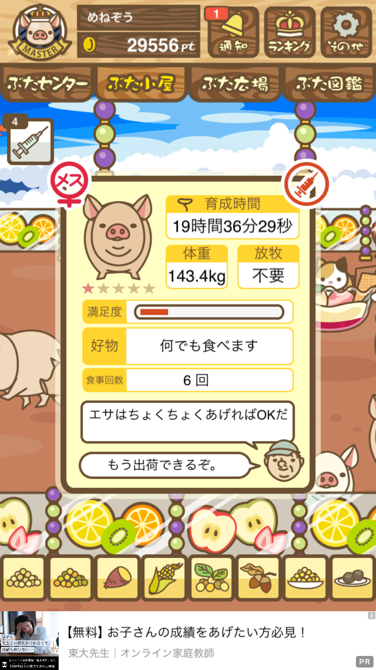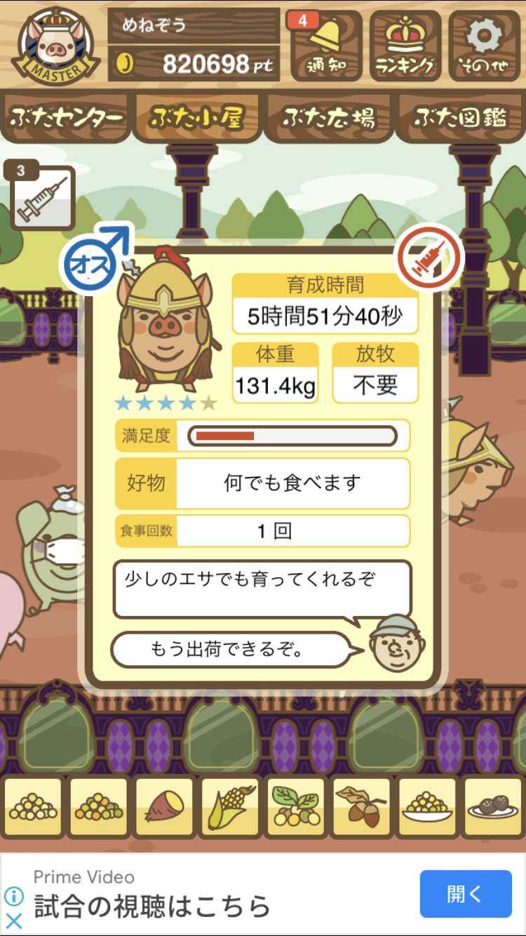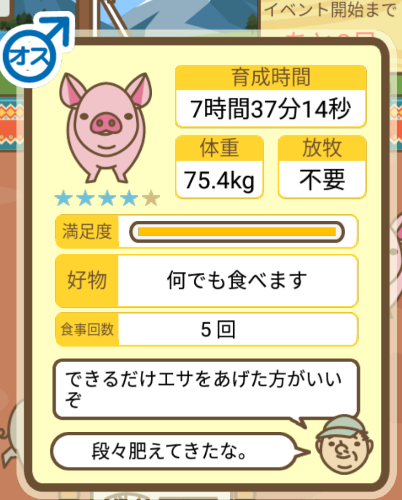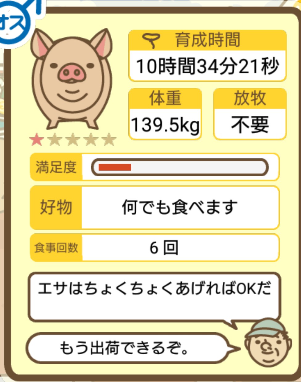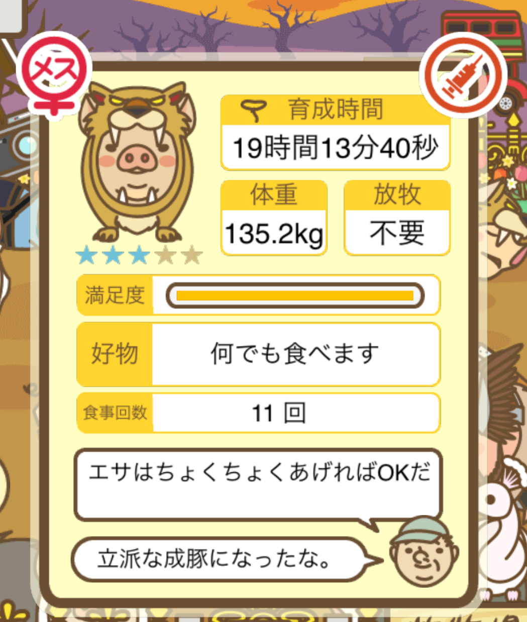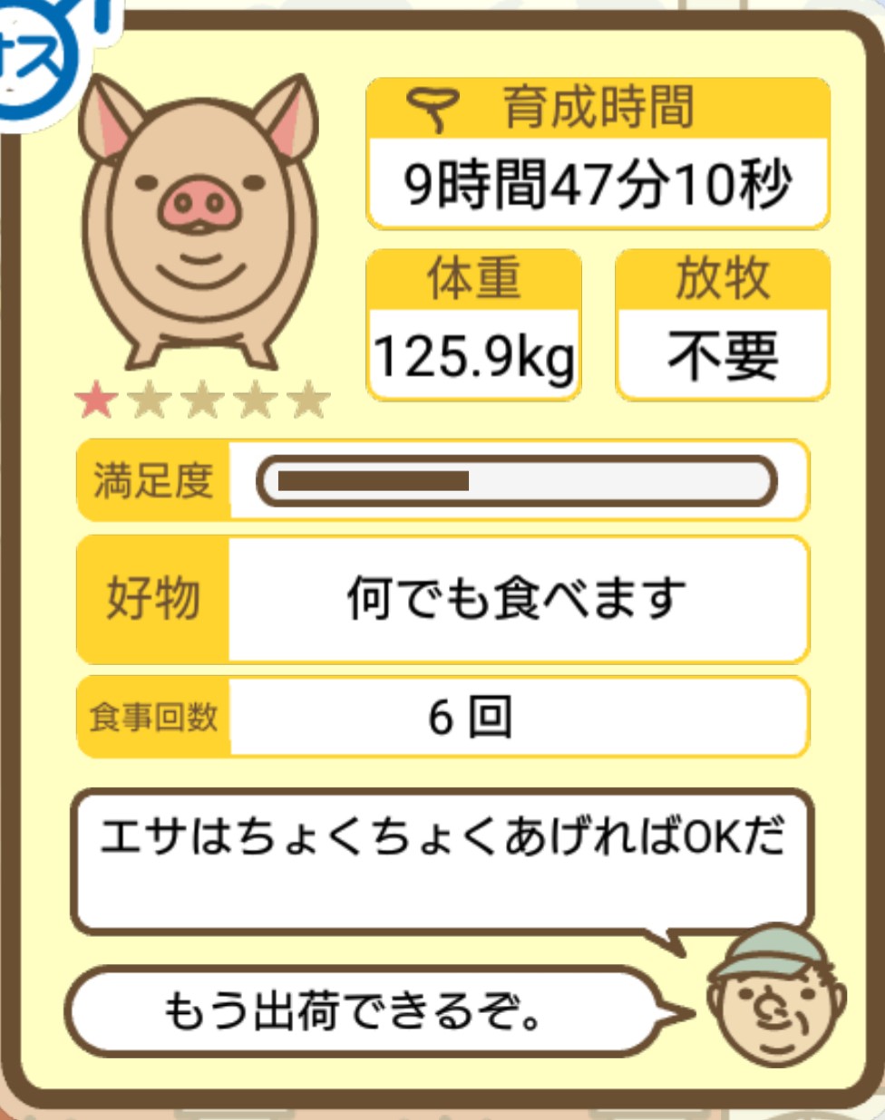 スクショないですが、放牧済、放牧場成豚、エサ3回では成功してます。(00:01成豚) -- 名無し[Ea6iFKq0LBo] 2025/11/07 (金) 21:15:25