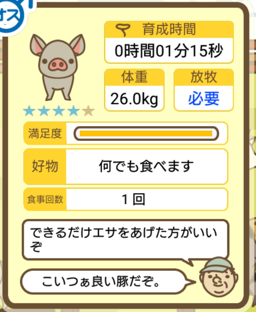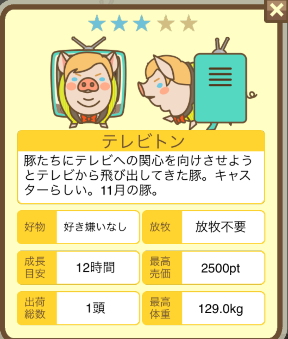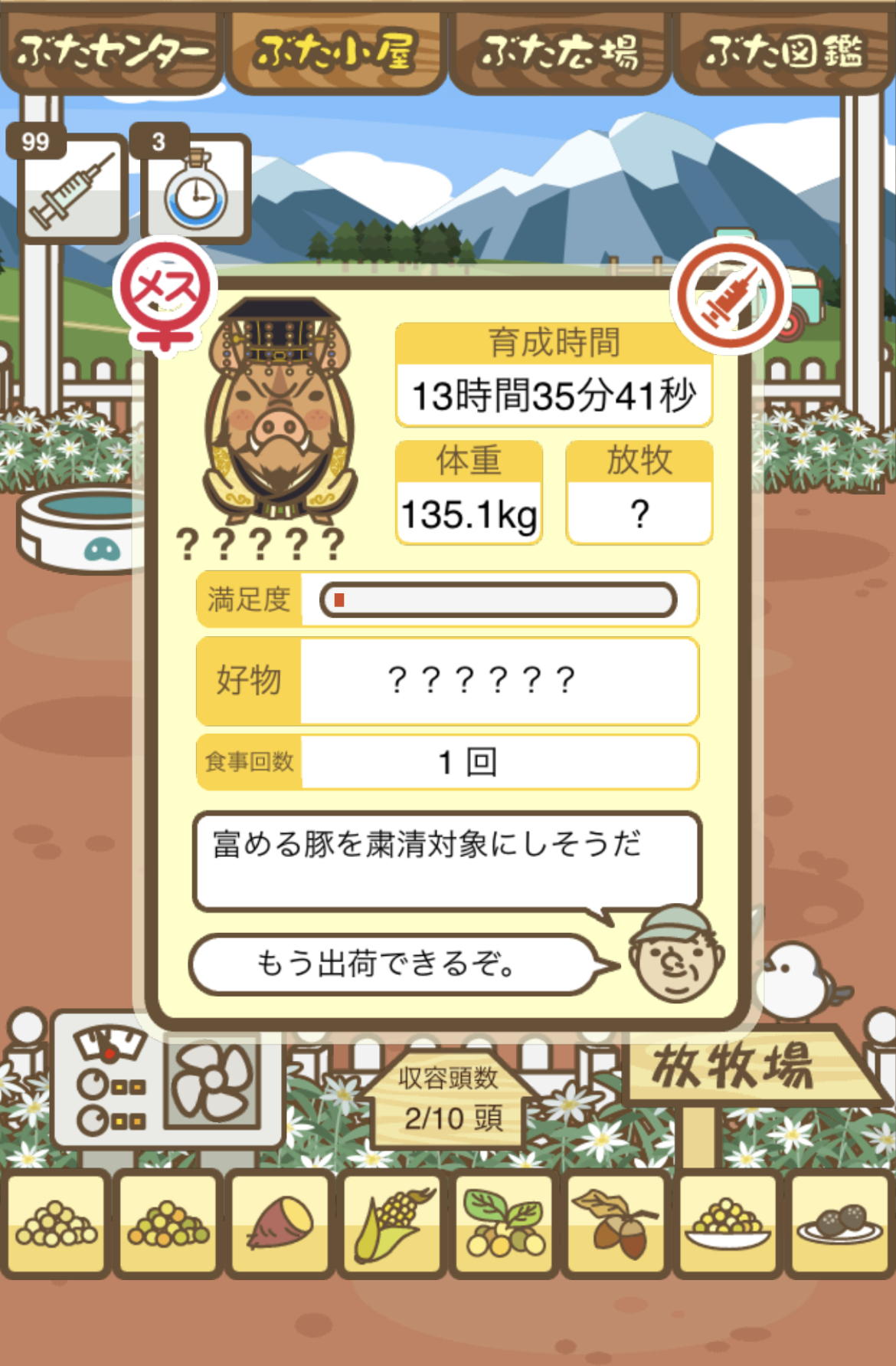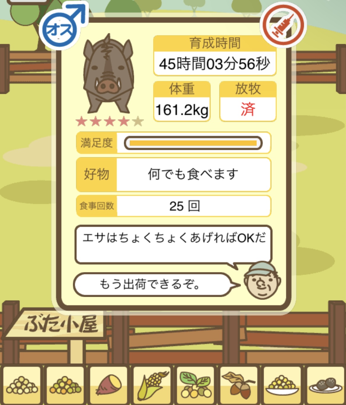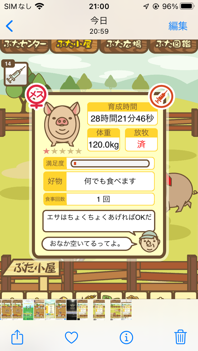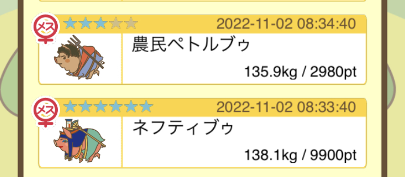 スクショないですが、放牧済、放牧場成豚、エサ3回では成功してます。(00:01成豚) -- 名無し[Ea6iFKq0LBo] 2025/11/07 (金) 21:15:25