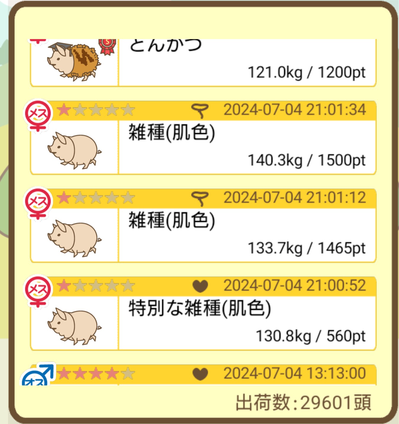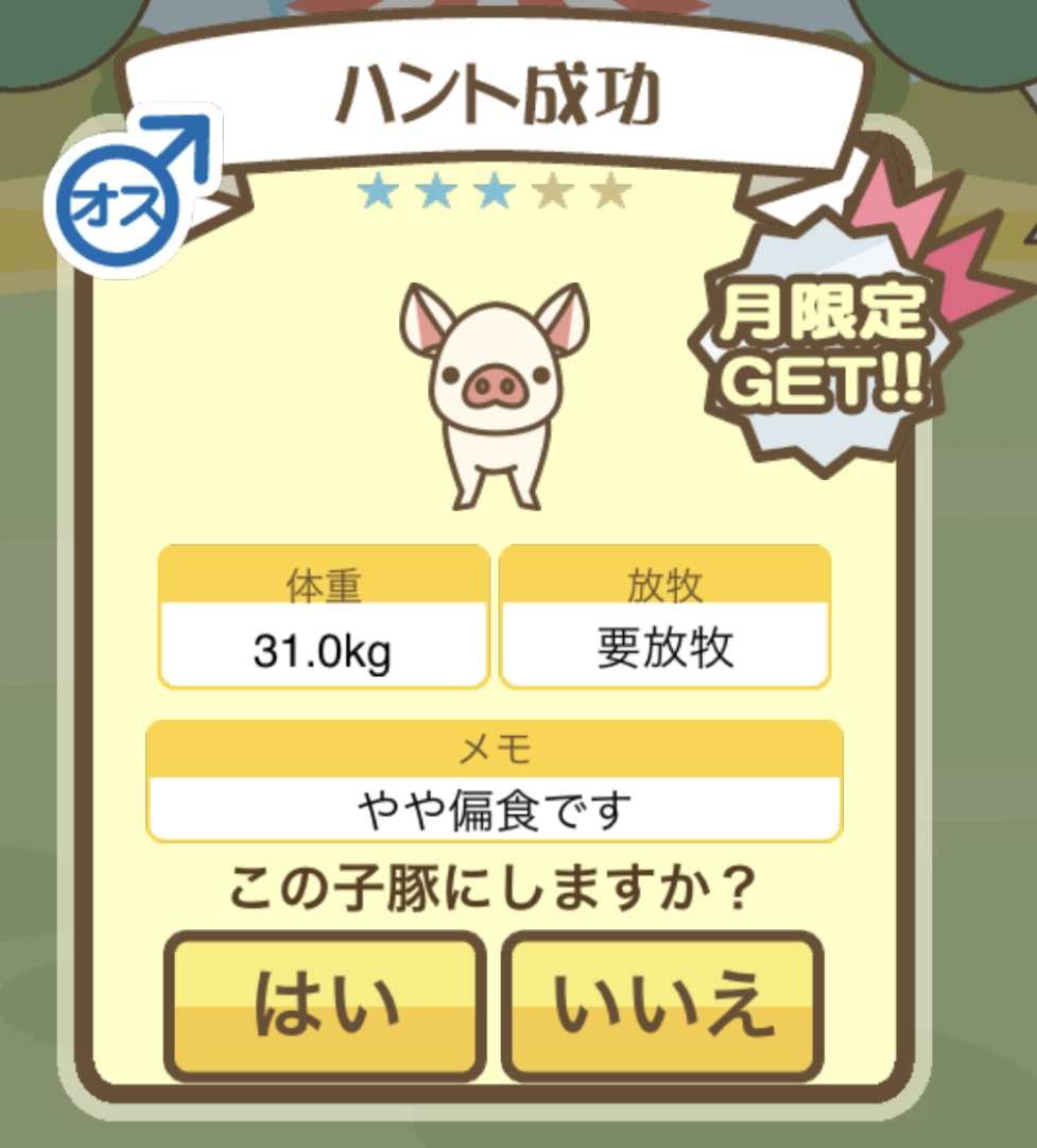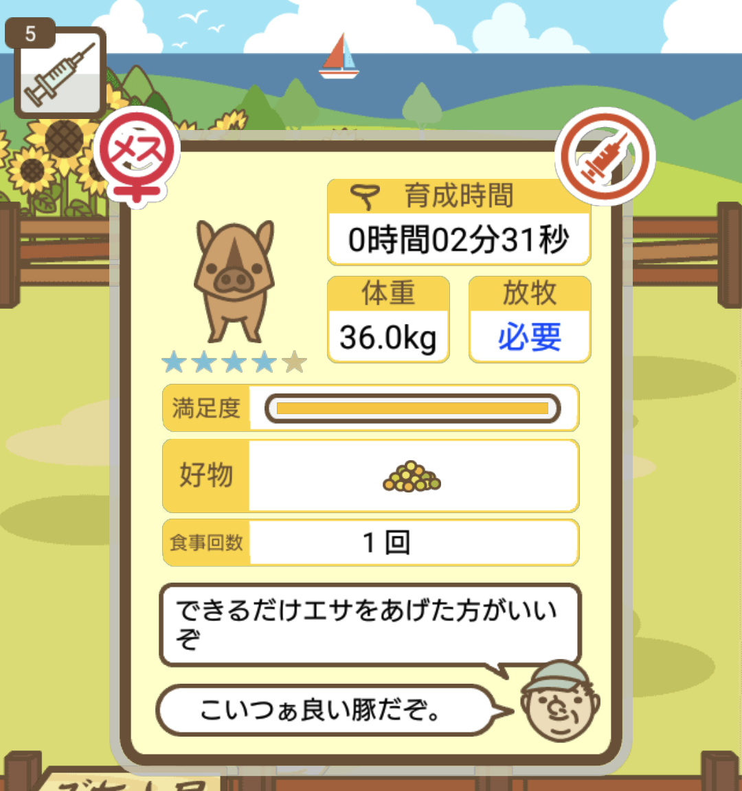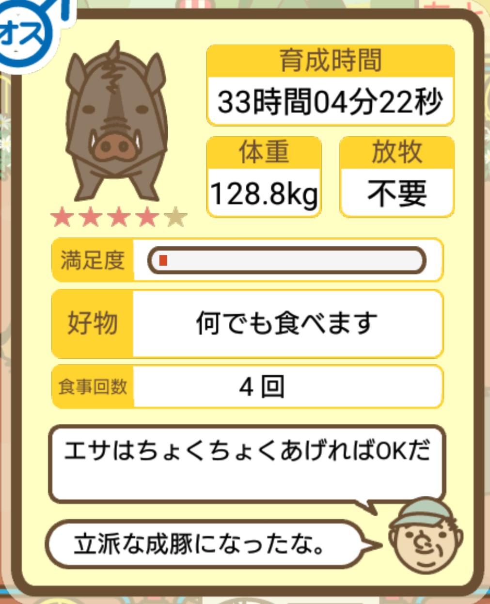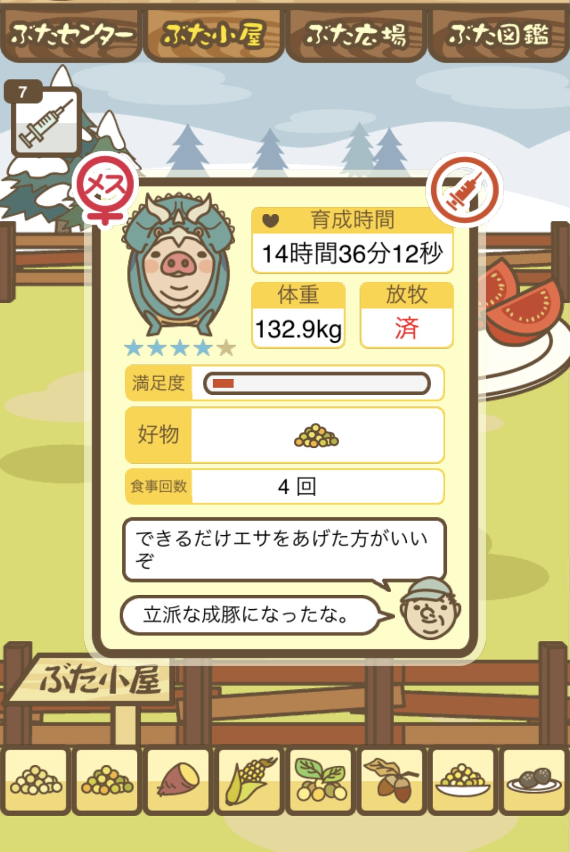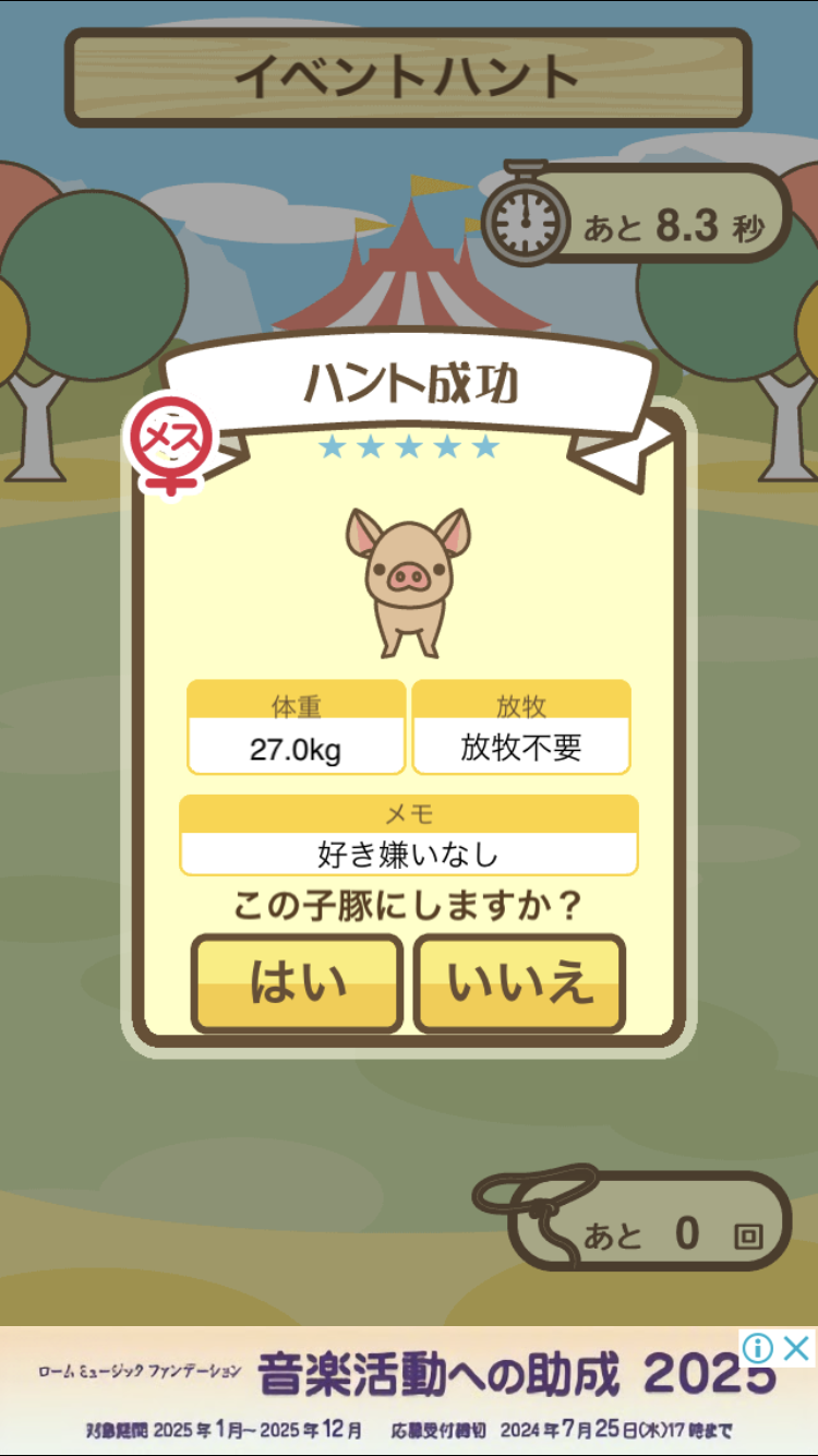 スクショないですが、放牧済、放牧場成豚、エサ3回では成功してます。(00:01成豚) -- 名無し[Ea6iFKq0LBo] 2025/11/07 (金) 21:15:25