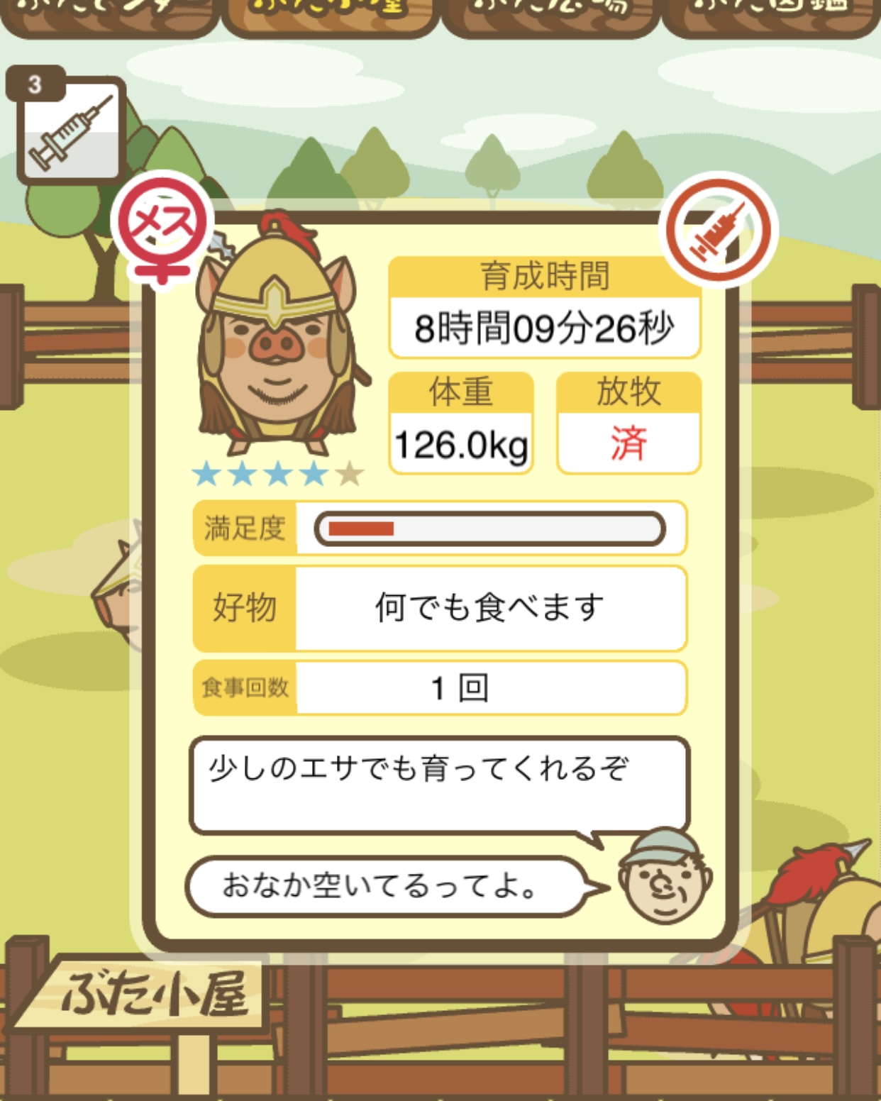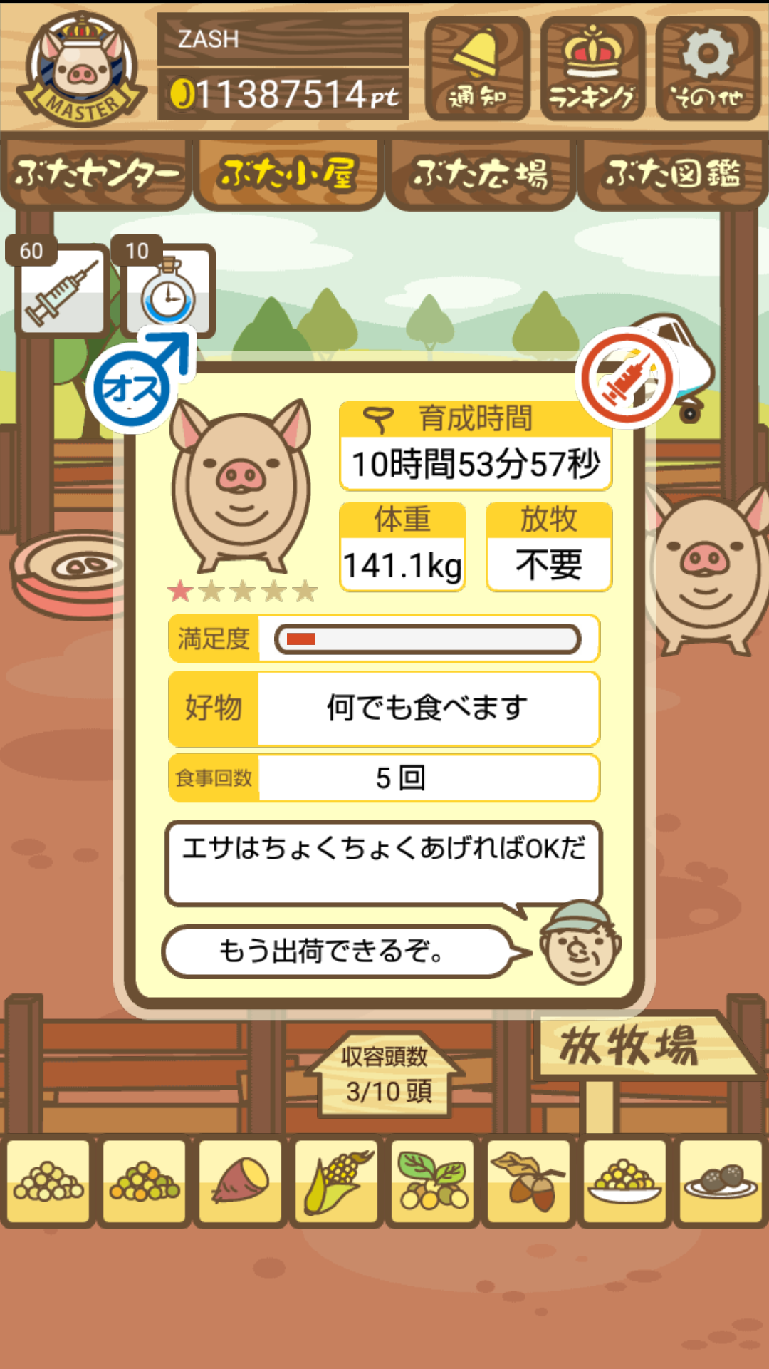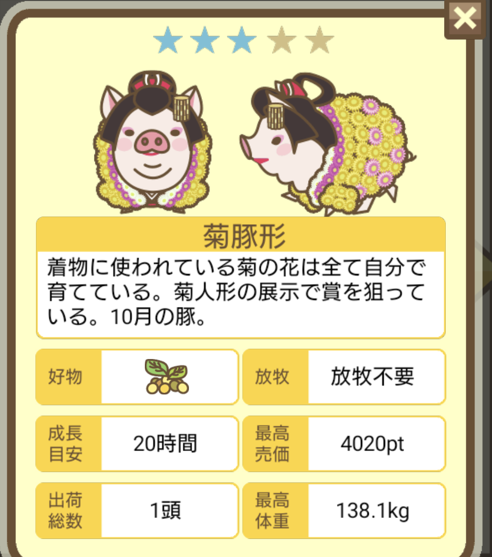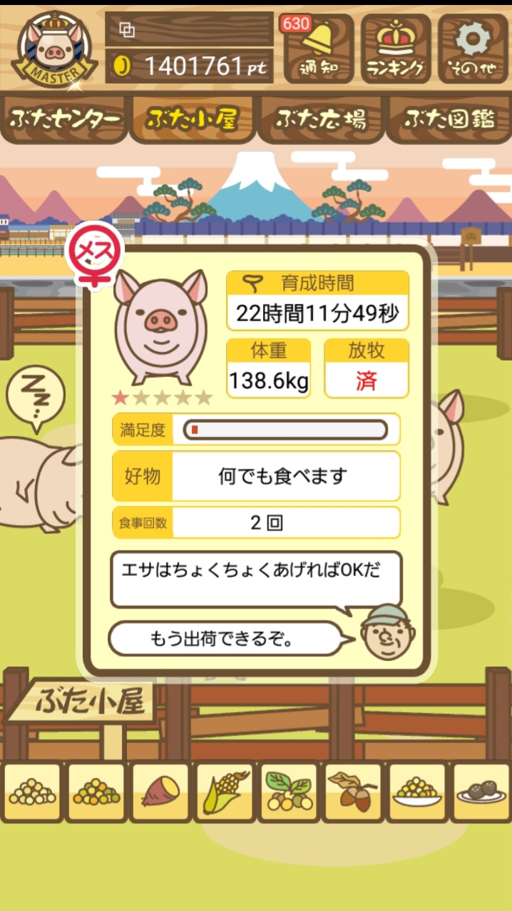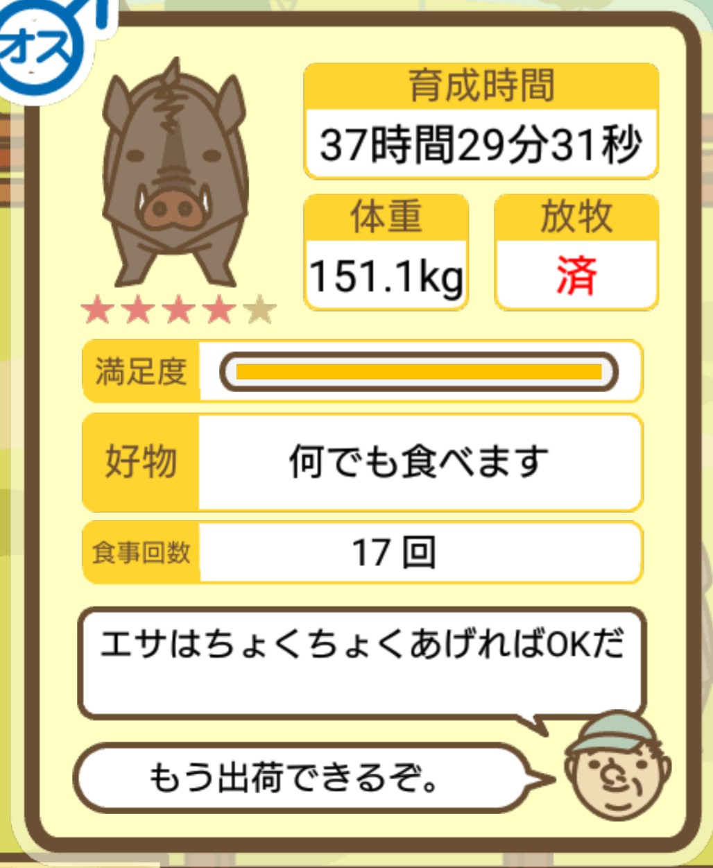 スクショないですが、放牧済、放牧場成豚、エサ3回では成功してます。(00:01成豚) -- 名無し[Ea6iFKq0LBo] 2025/11/07 (金) 21:15:25