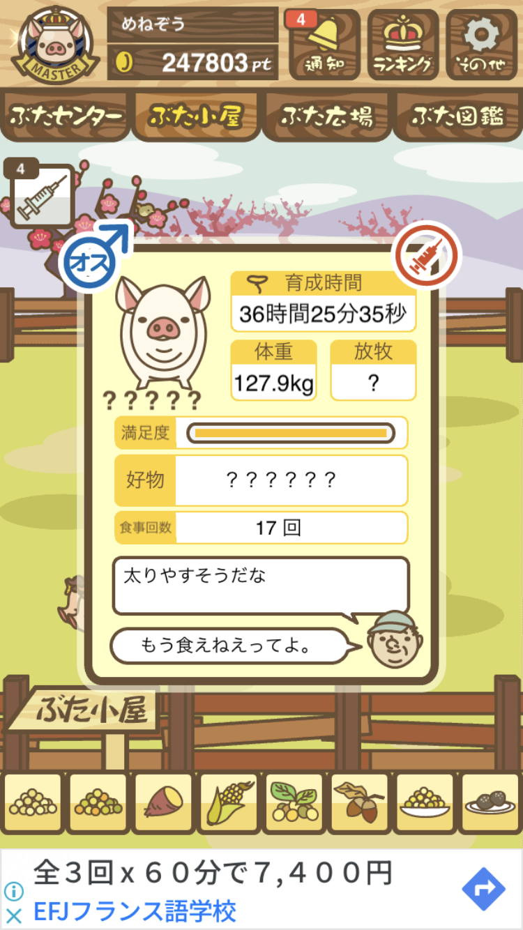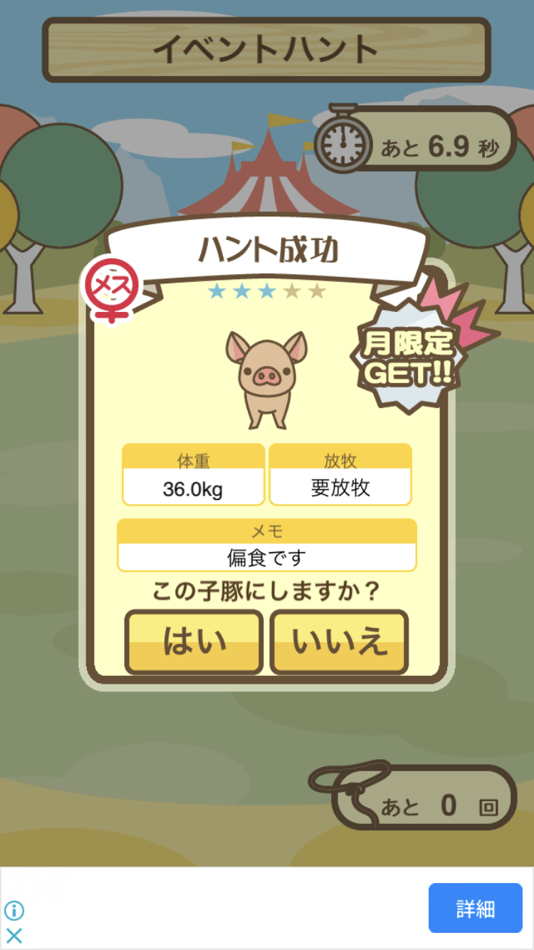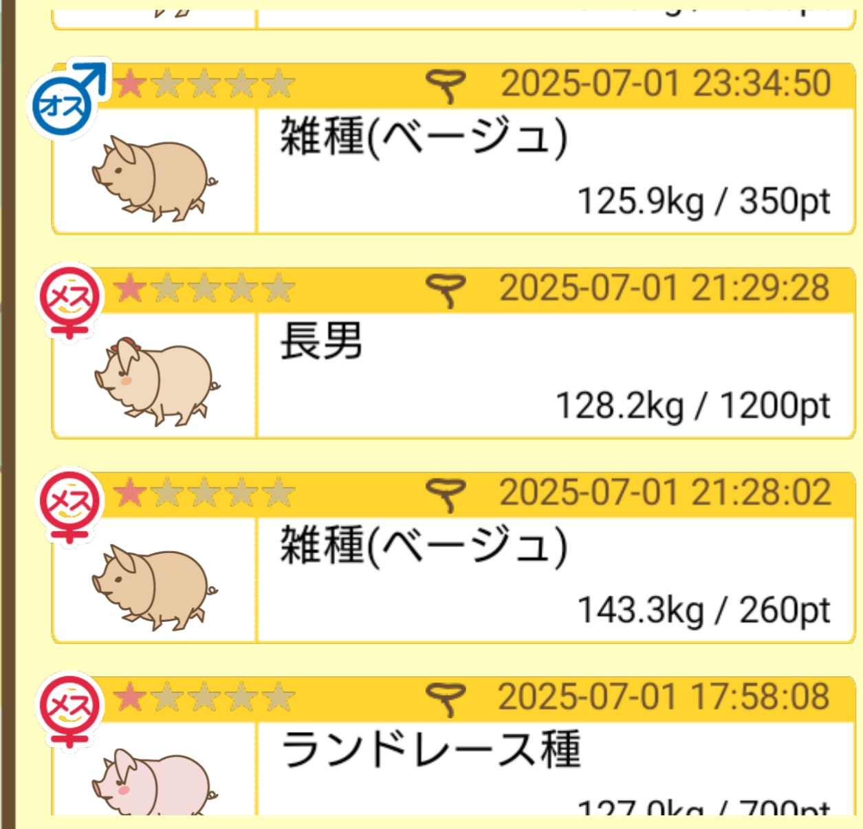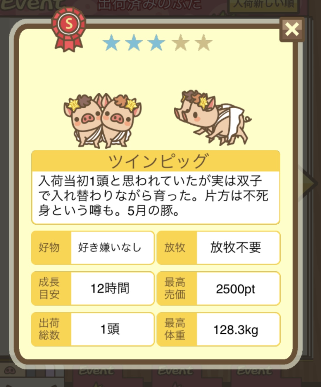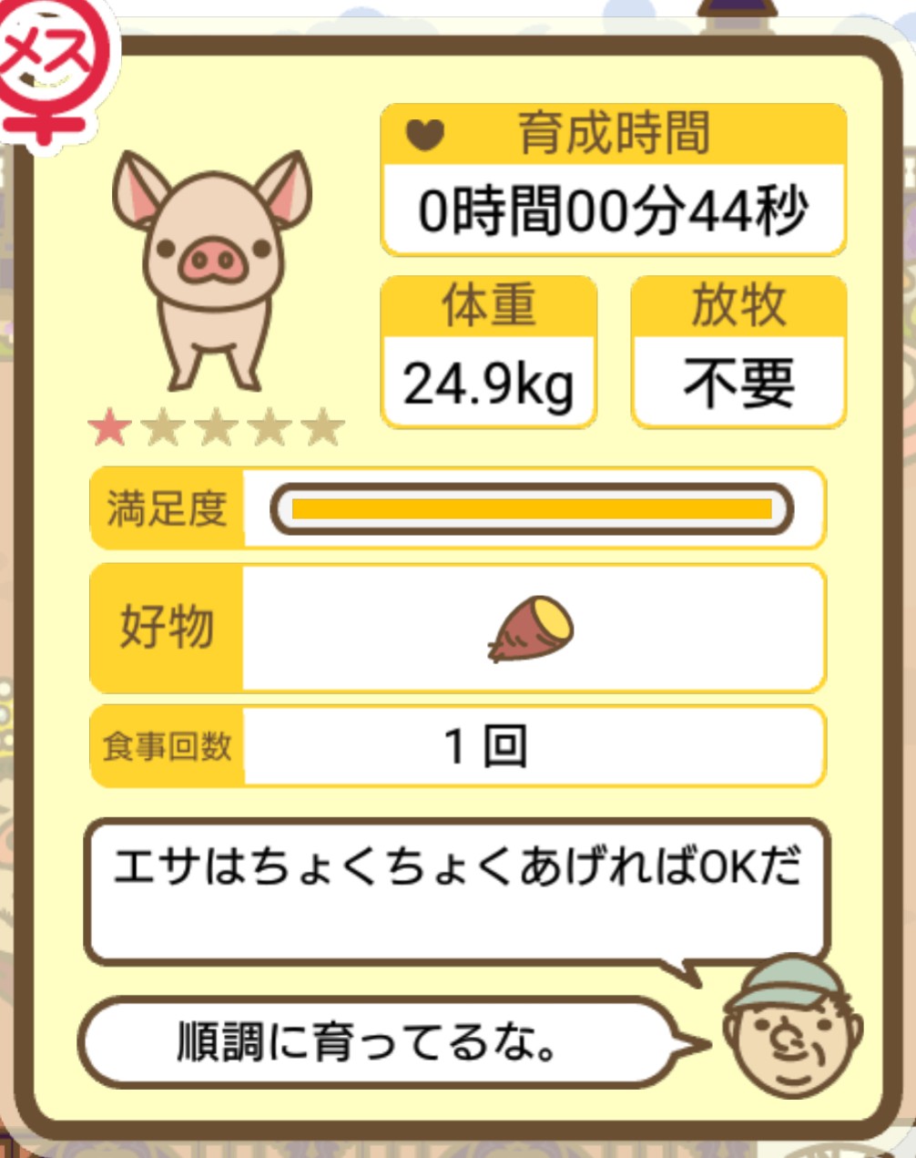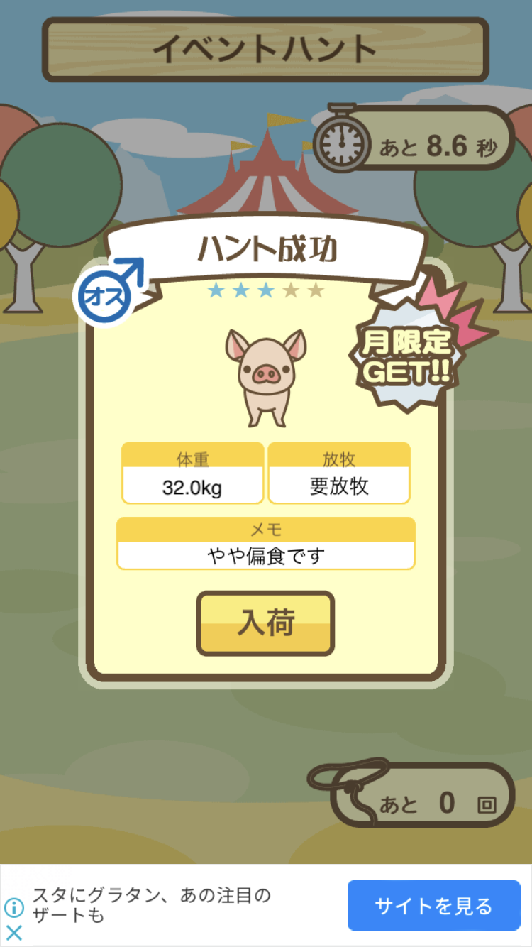 スクショないですが、放牧済、放牧場成豚、エサ3回では成功してます。(00:01成豚) -- 名無し[Ea6iFKq0LBo] 2025/11/07 (金) 21:15:25