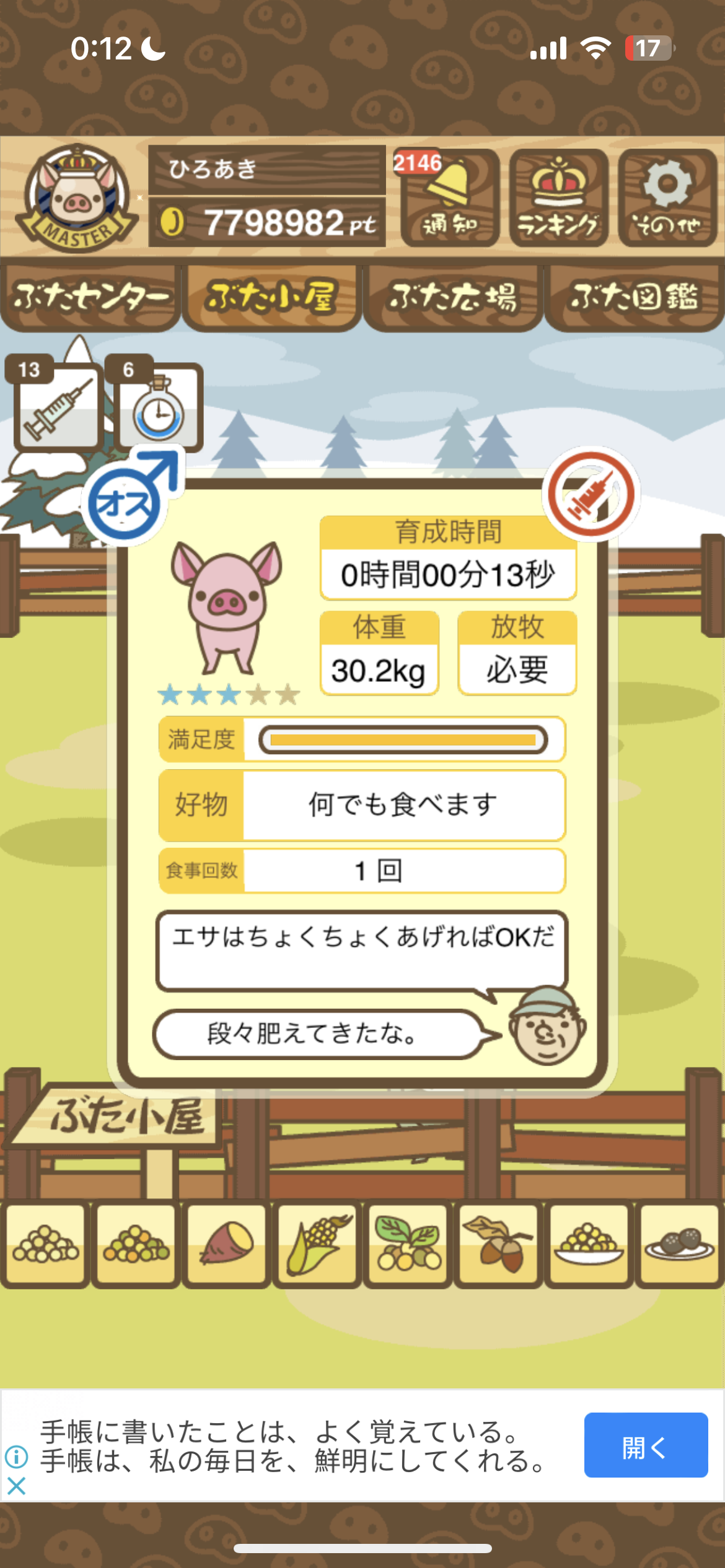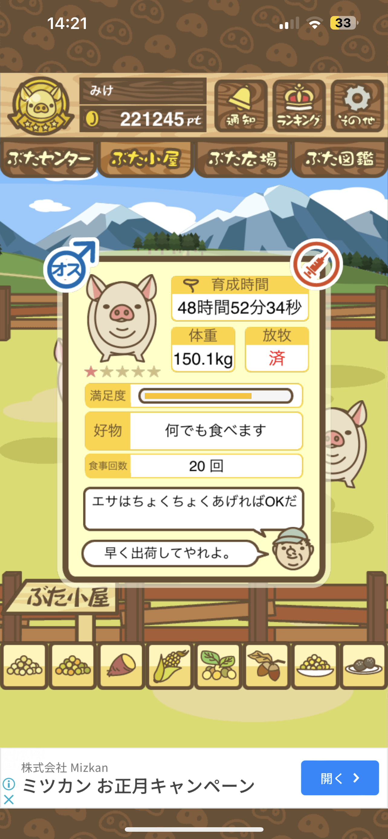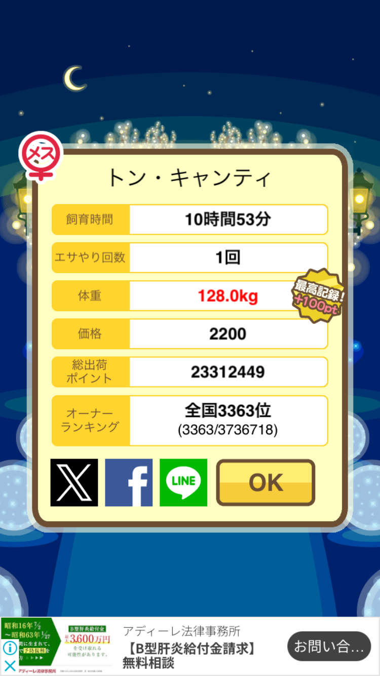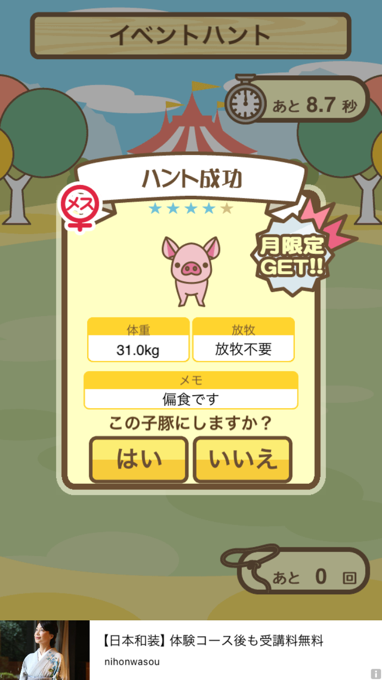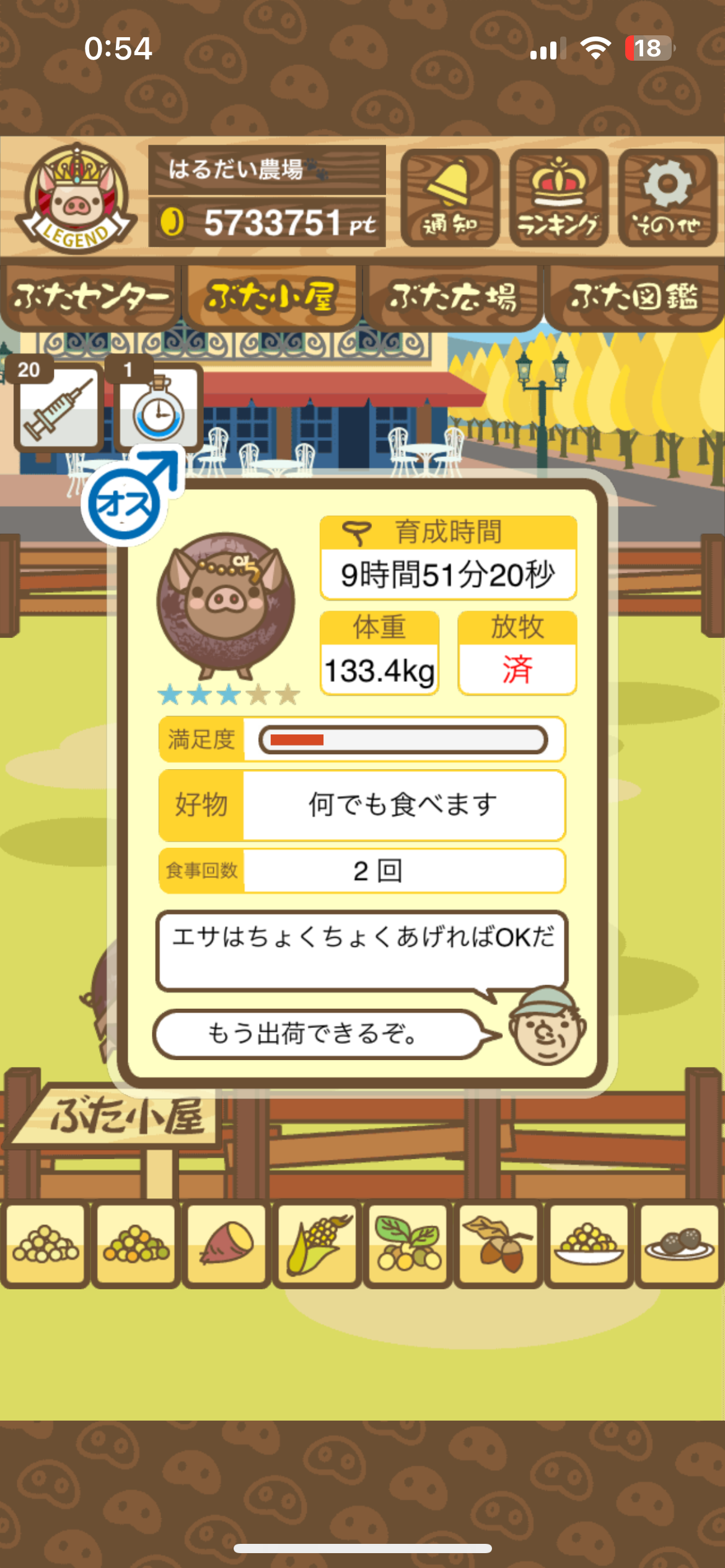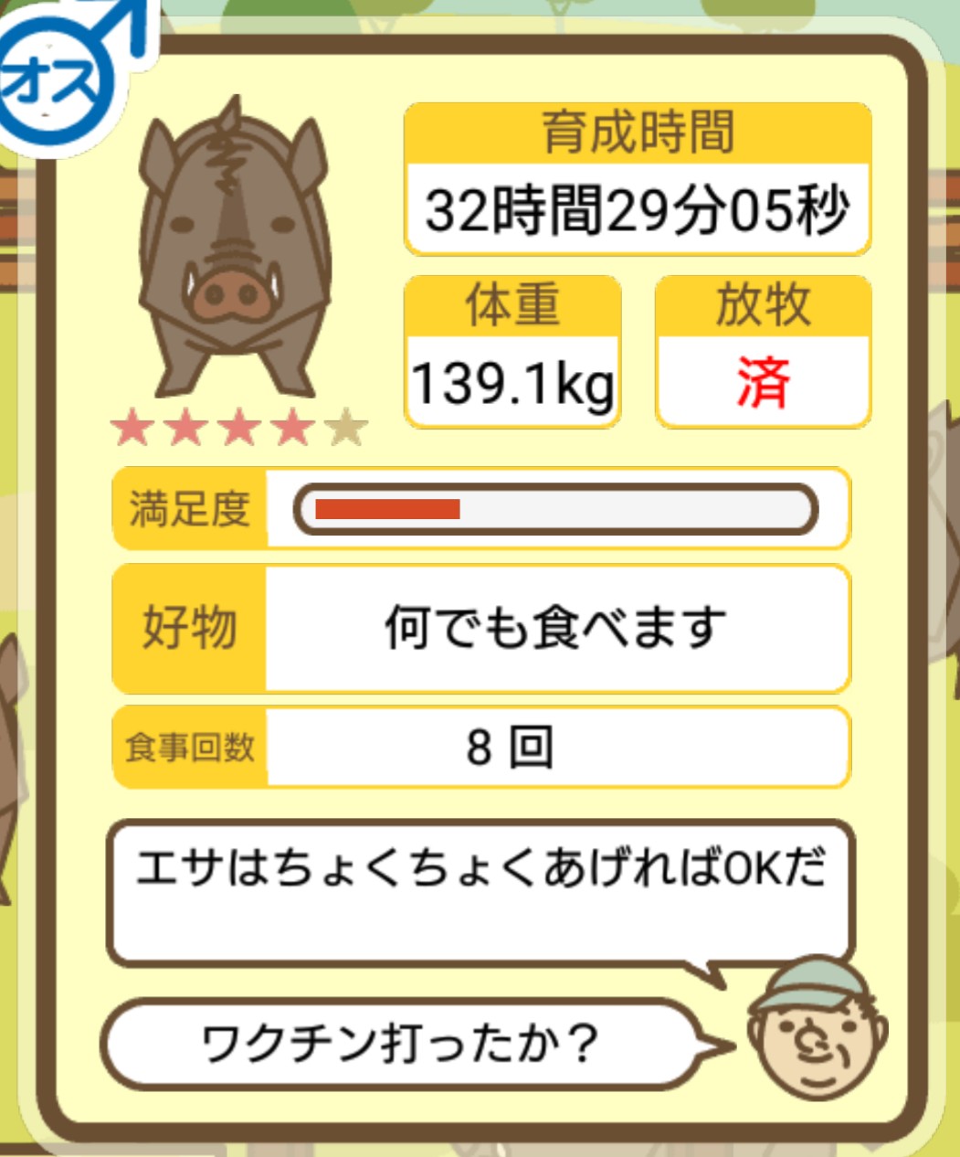 スクショないですが、放牧済、放牧場成豚、エサ3回では成功してます。(00:01成豚) -- 名無し[Ea6iFKq0LBo] 2025/11/07 (金) 21:15:25