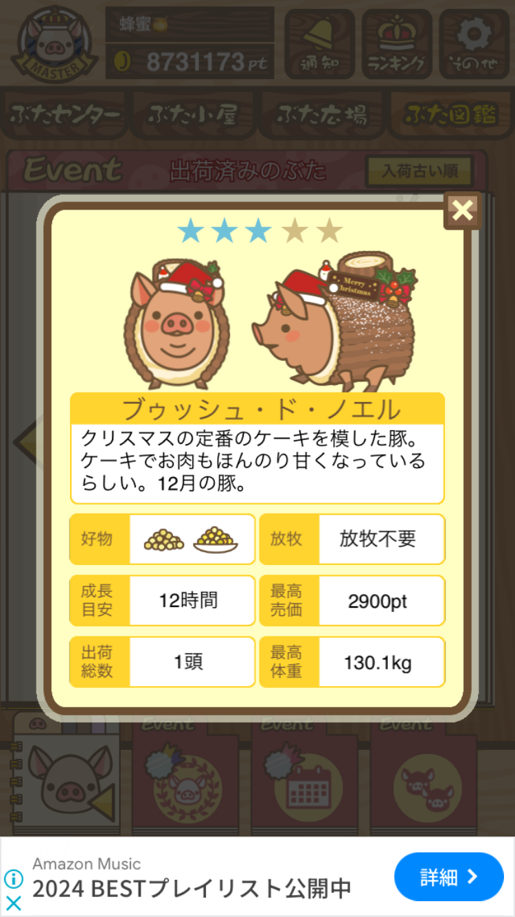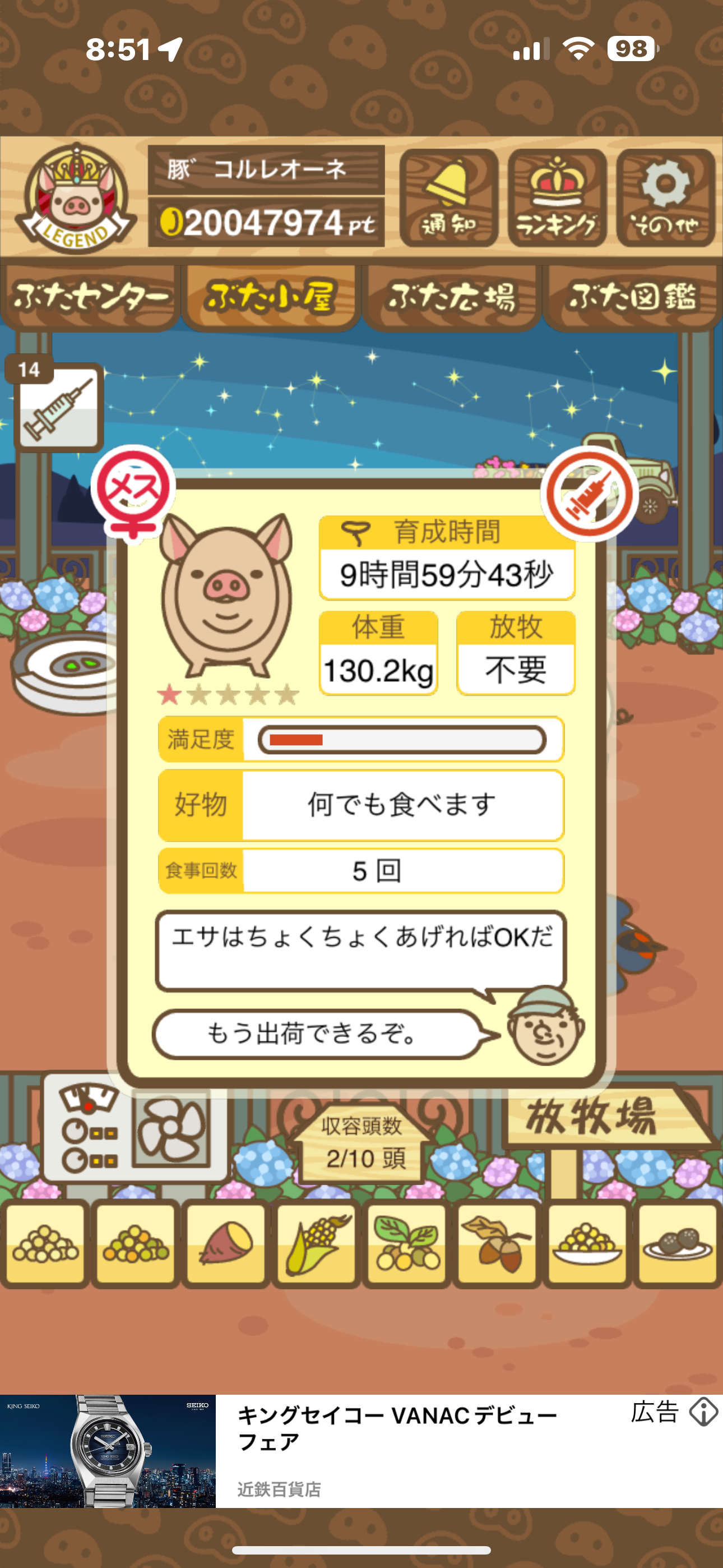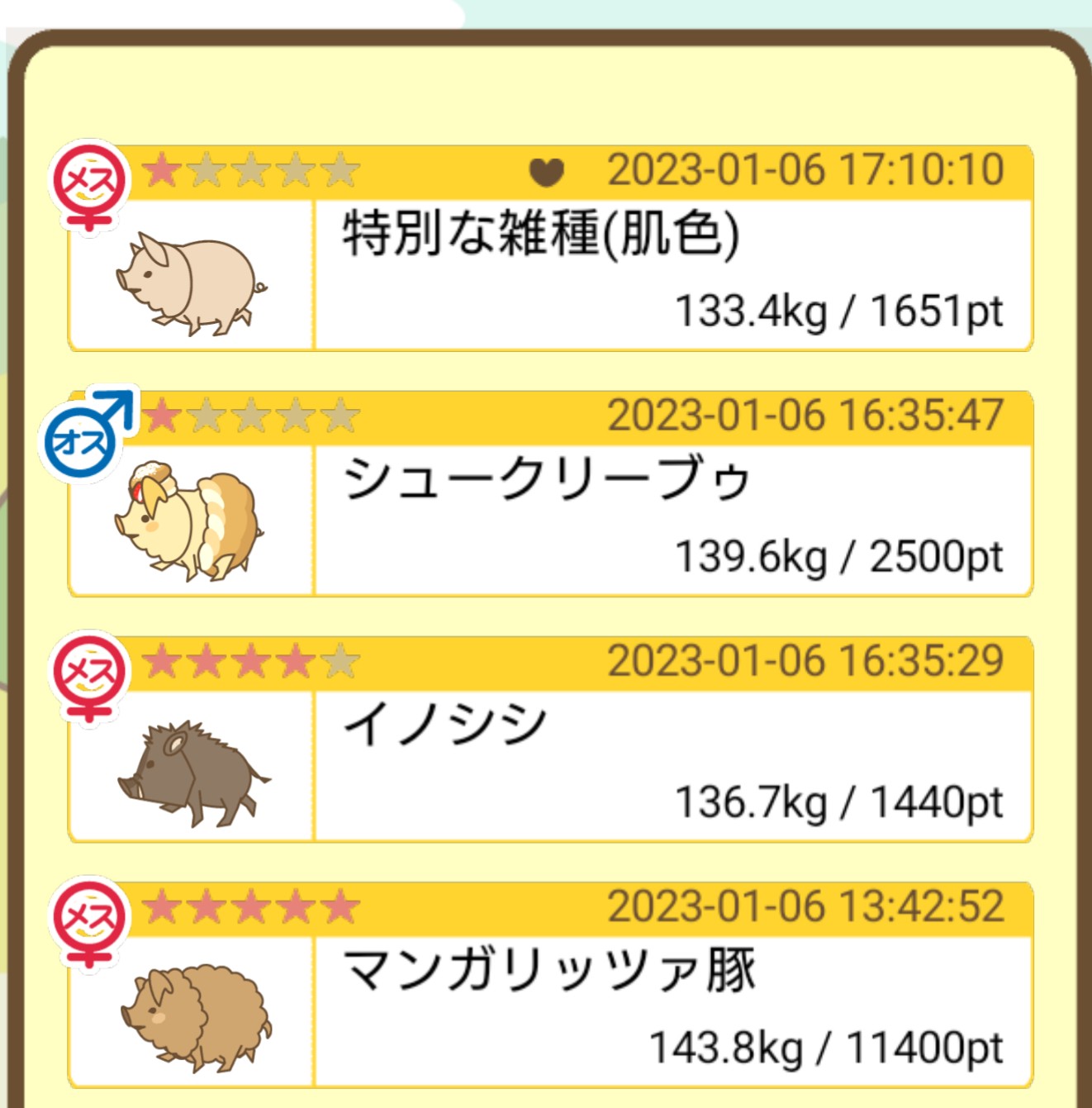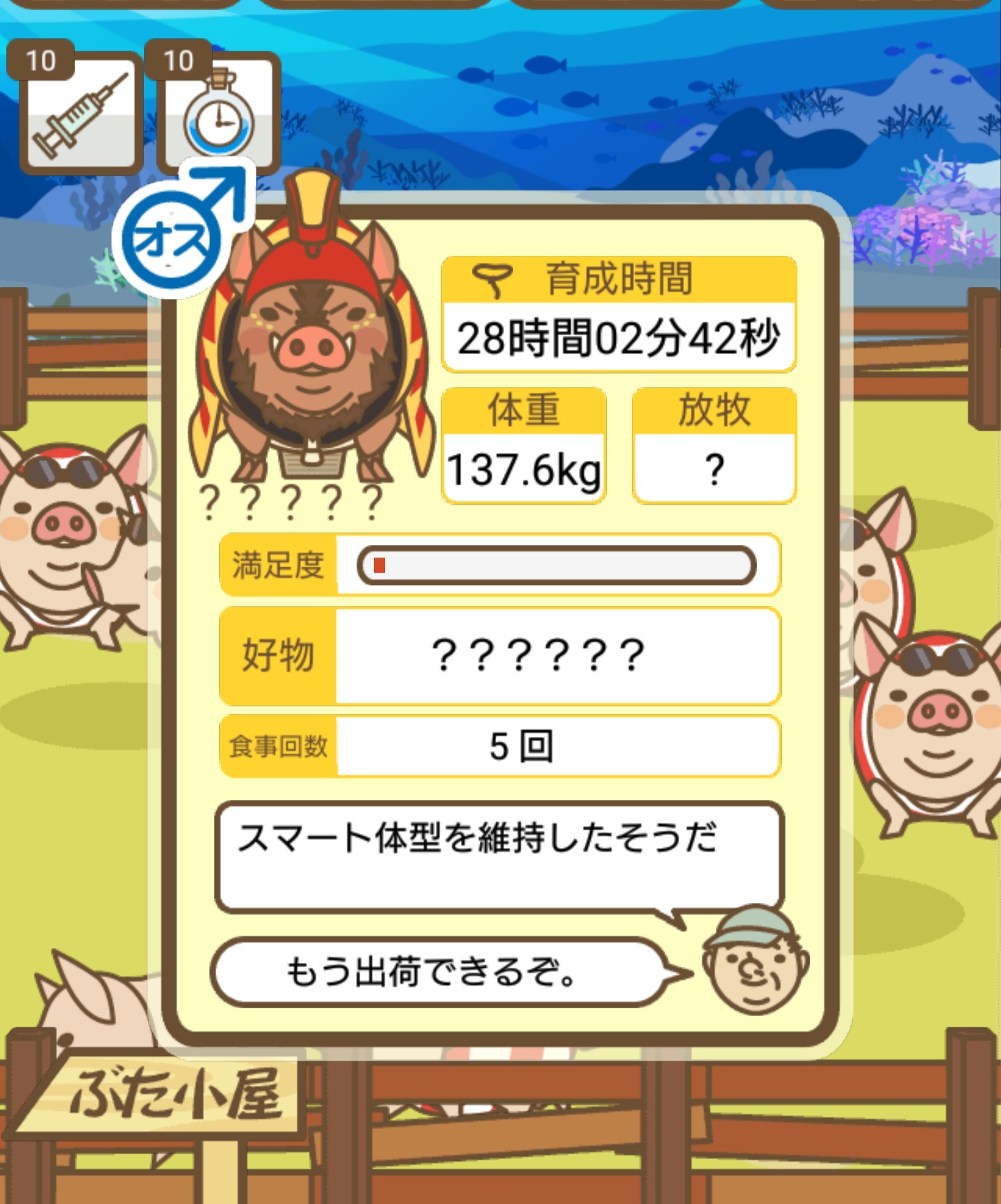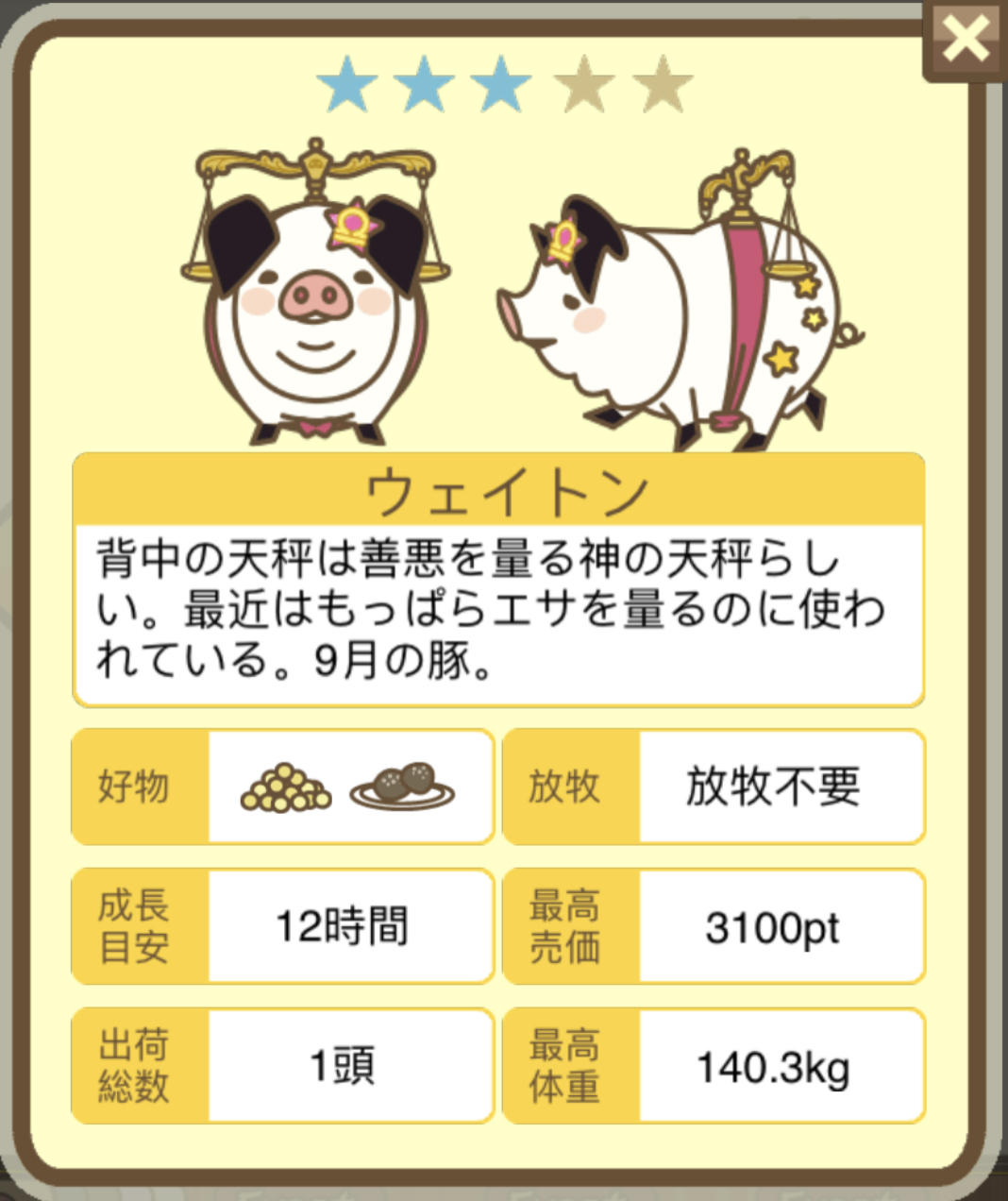 スクショないですが、放牧済、放牧場成豚、エサ3回では成功してます。(00:01成豚) -- 名無し[Ea6iFKq0LBo] 2025/11/07 (金) 21:15:25
