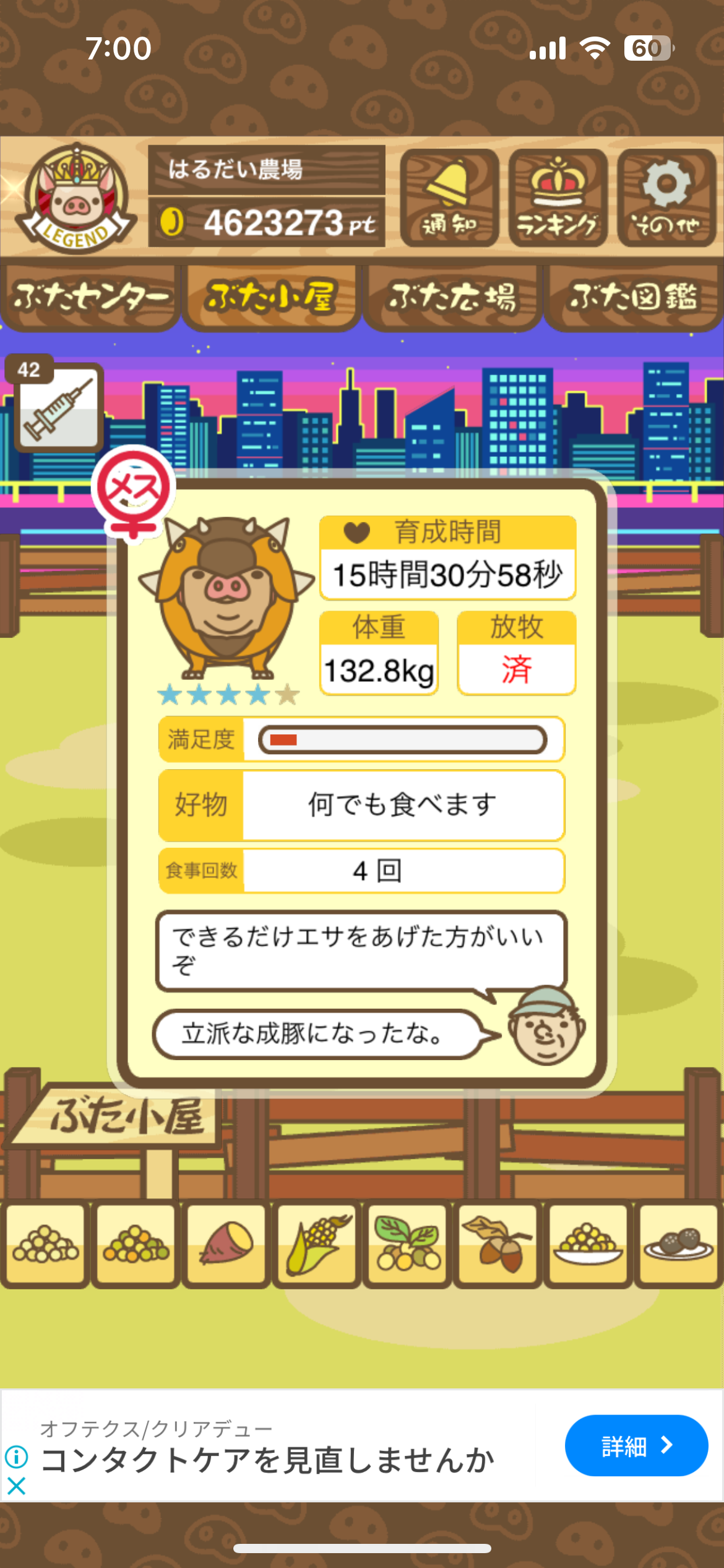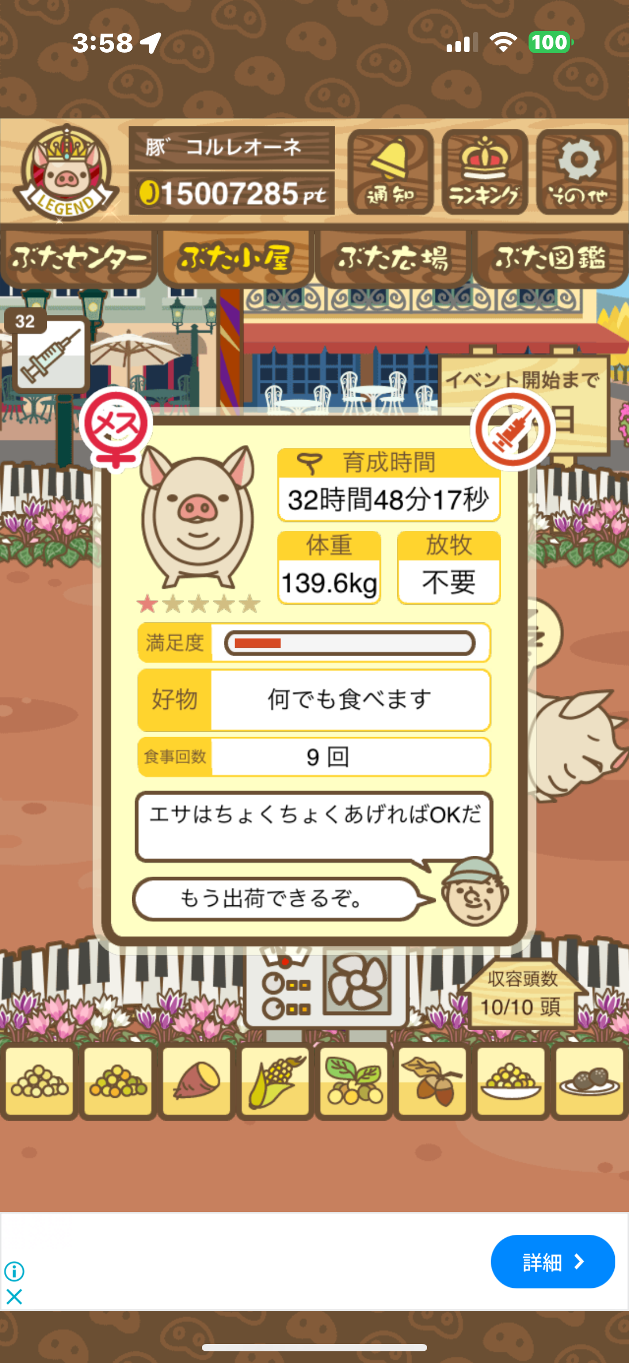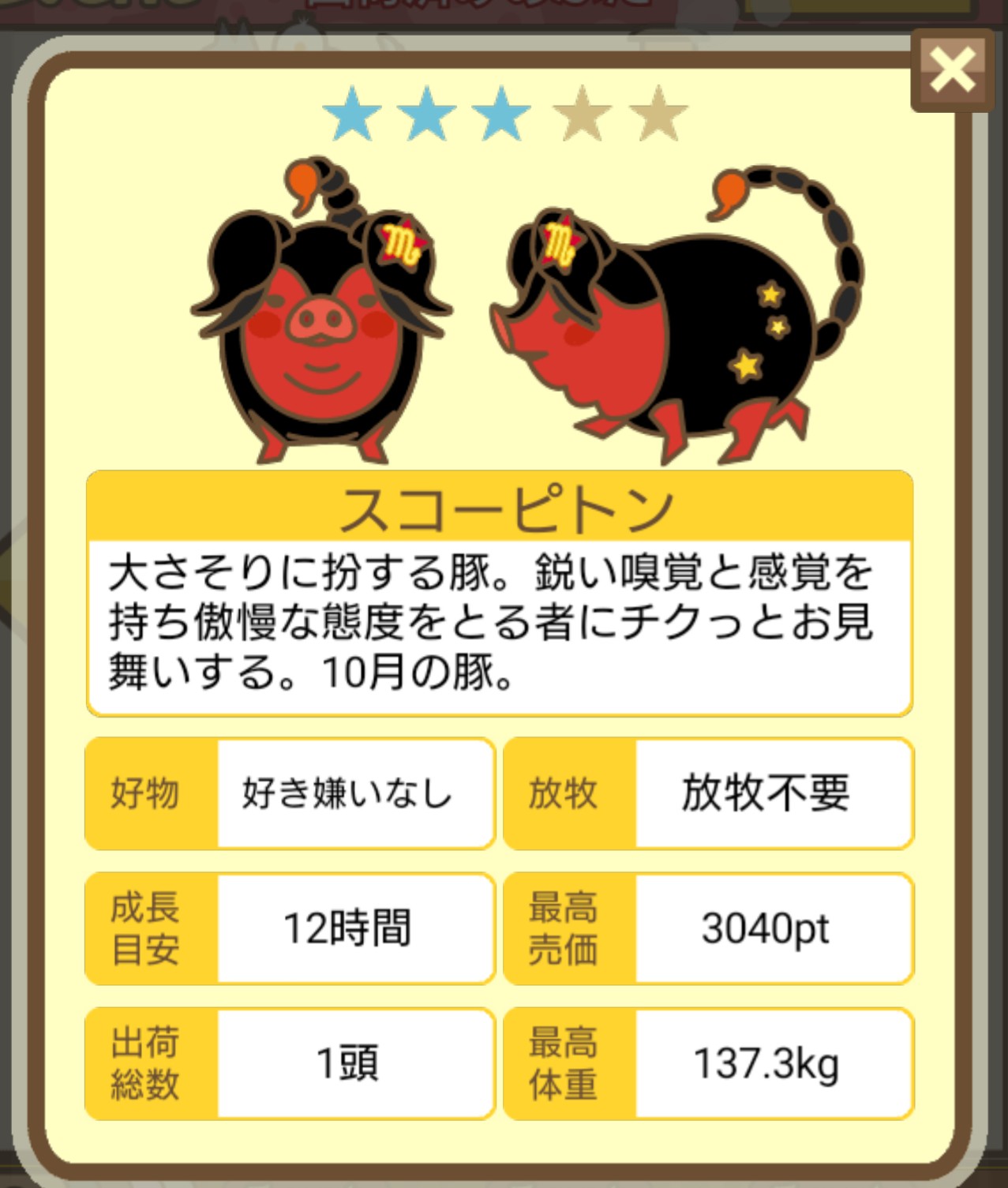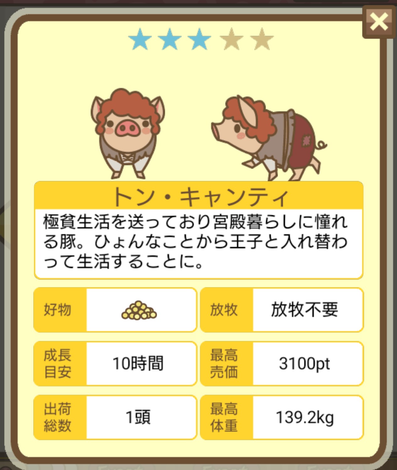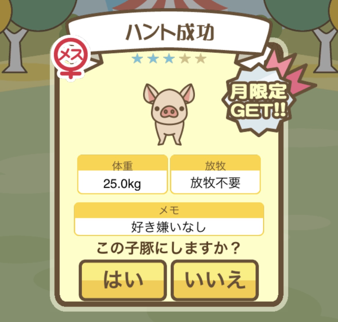 スクショないですが、放牧済、放牧場成豚、エサ3回では成功してます。(00:01成豚) -- 名無し[Ea6iFKq0LBo] 2025/11/07 (金) 21:15:25