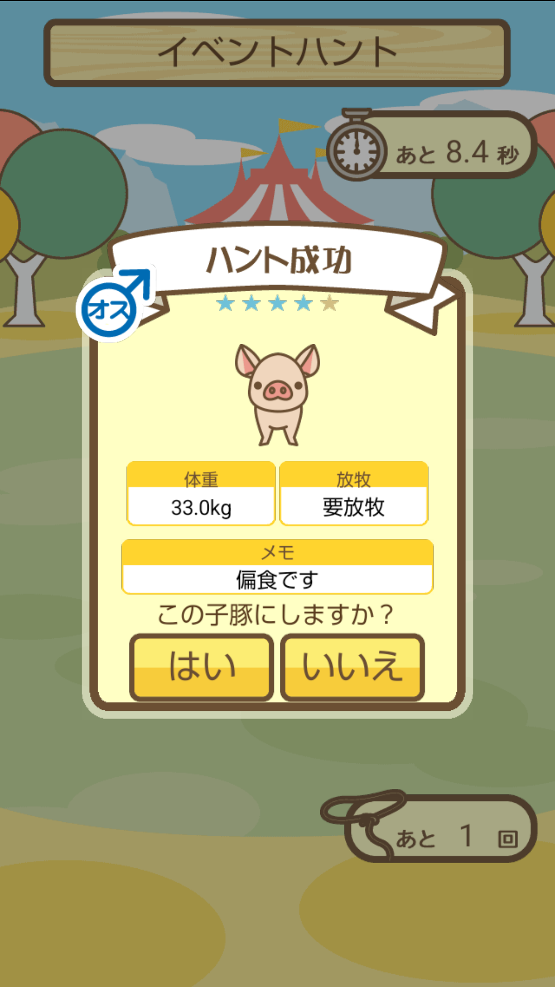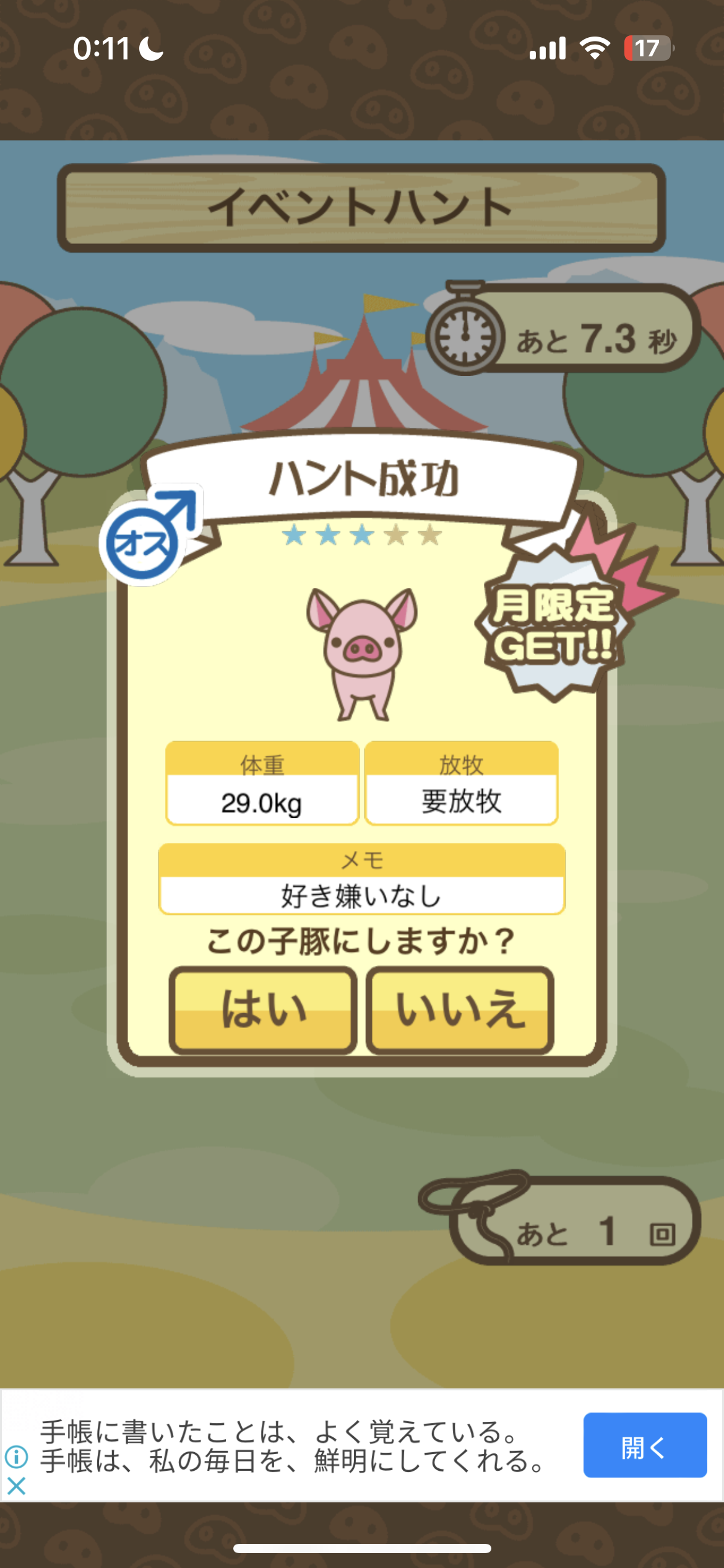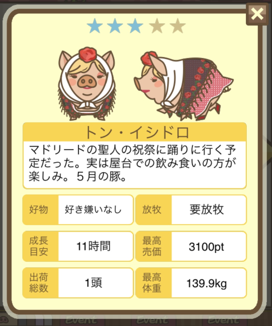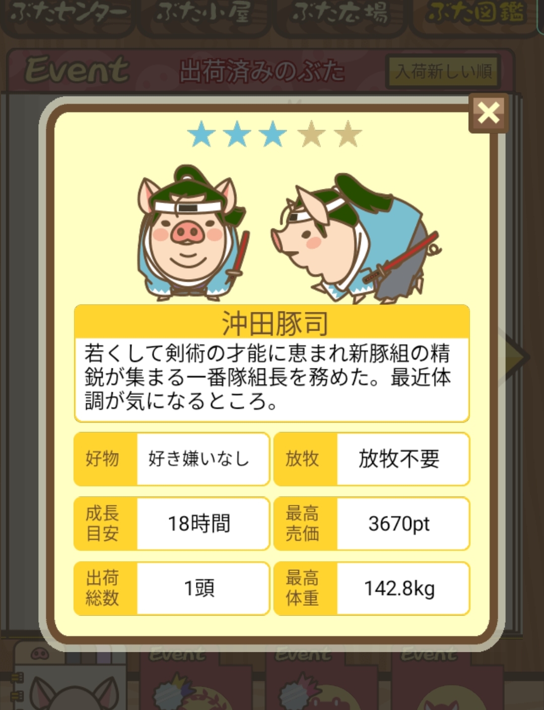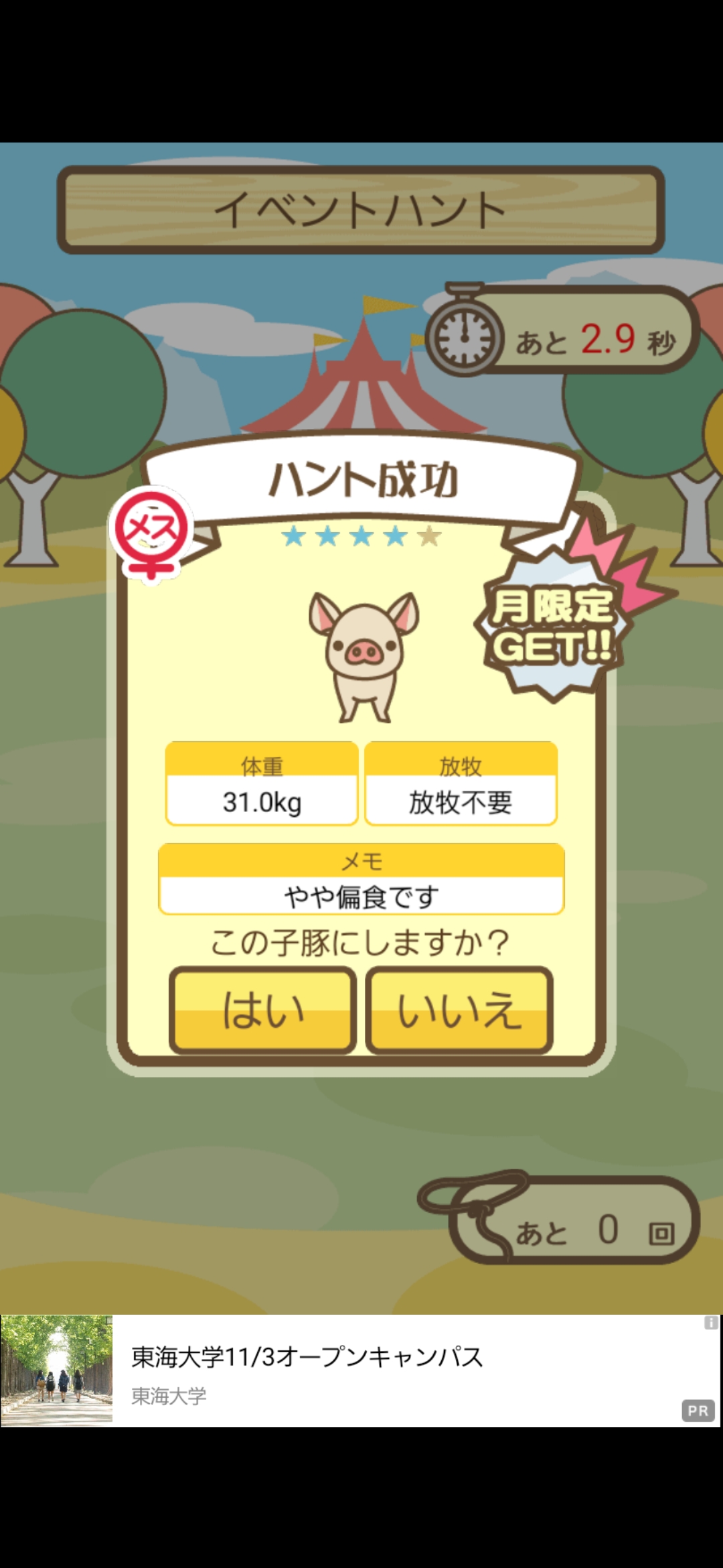 スクショないですが、放牧済、放牧場成豚、エサ3回では成功してます。(00:01成豚) -- 名無し[Ea6iFKq0LBo] 2025/11/07 (金) 21:15:25