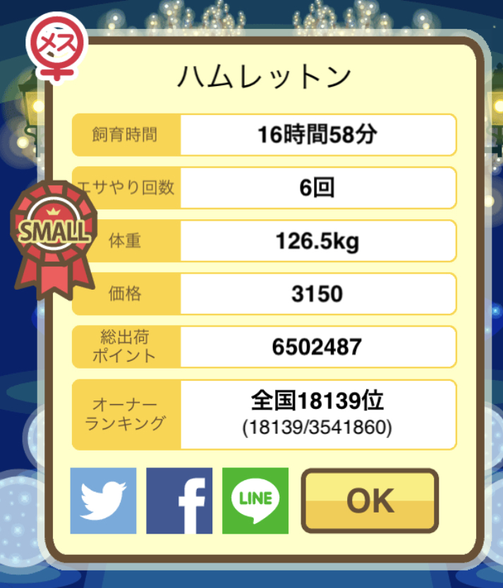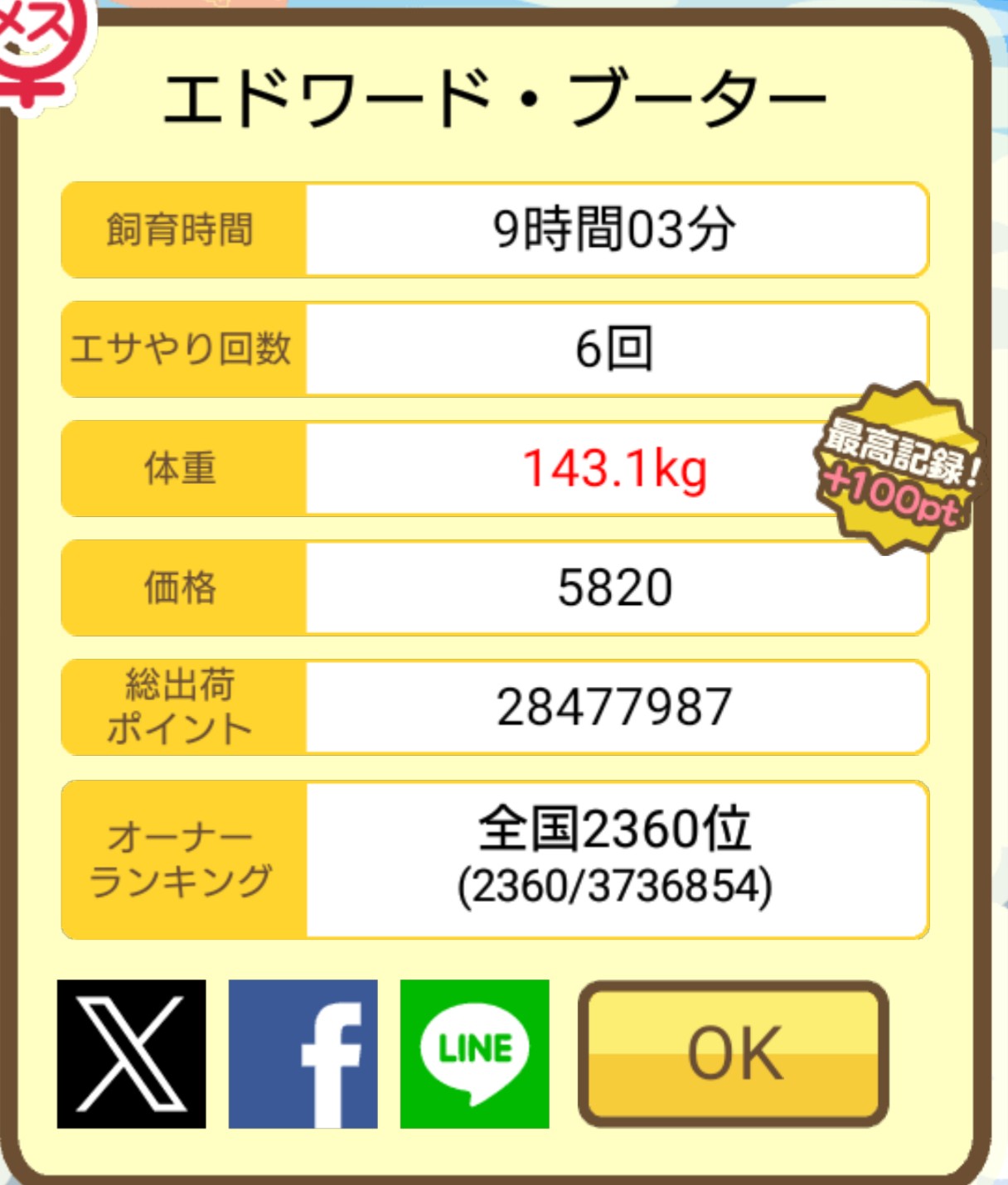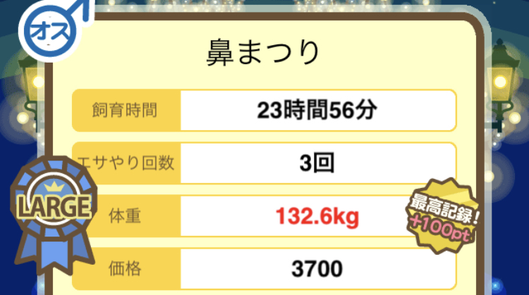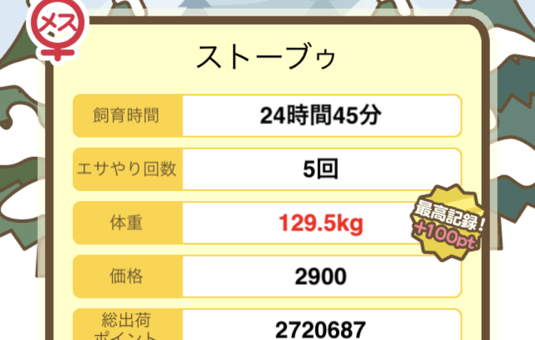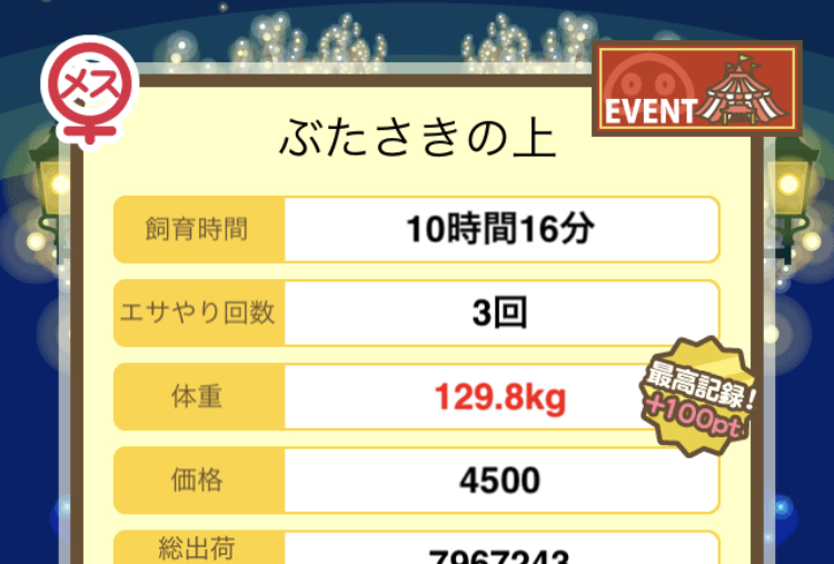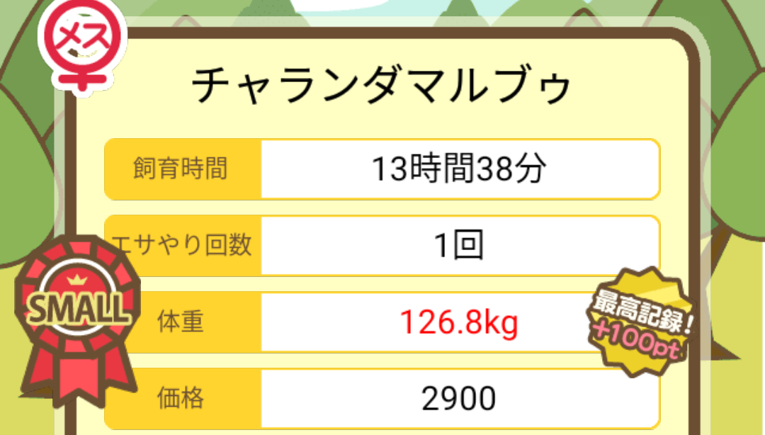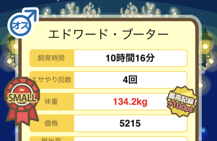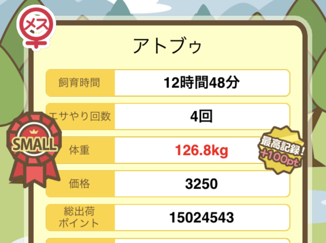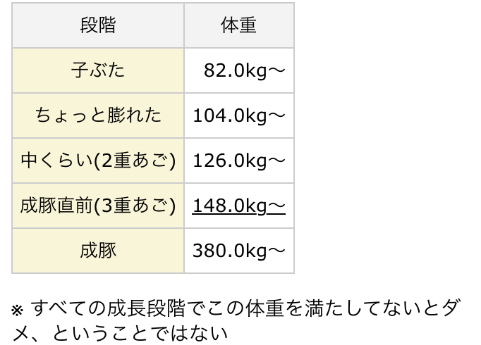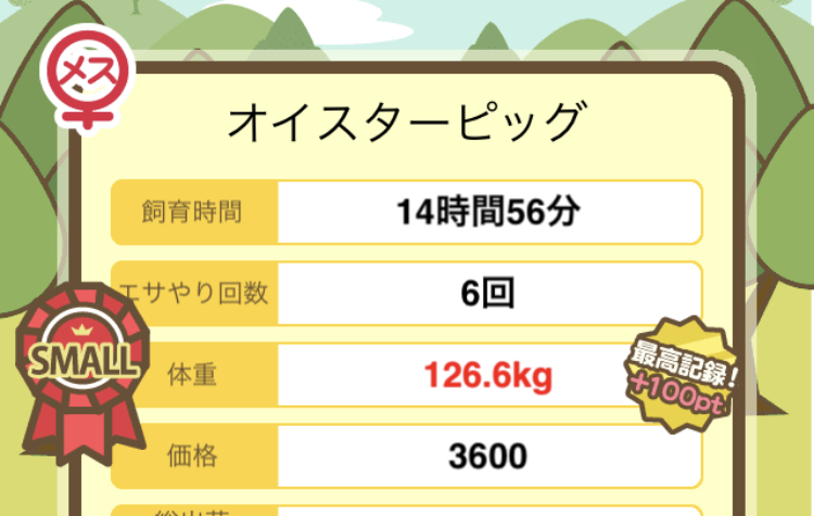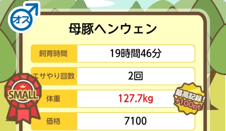 成豚後、1回だけエサをあげて126.1キロでスモールバッジつきました。 -- じまこ[kBeNBUXJ0RA] 2022/09/02 (金) 18:43:57