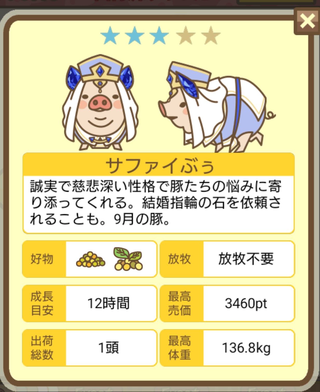 今度はしっかり放牧場に隔離して、成豚確認したため、ベージュの要放牧で好き嫌いなしはこの子かなと思われます。 -- ぶたぶー[ewz/8AhVVo.] 2025/11/03 (月) 01:13:48